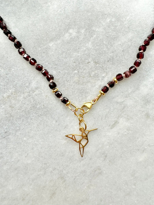 Hand Knotted Garnet Necklace / Hummingbird Charm