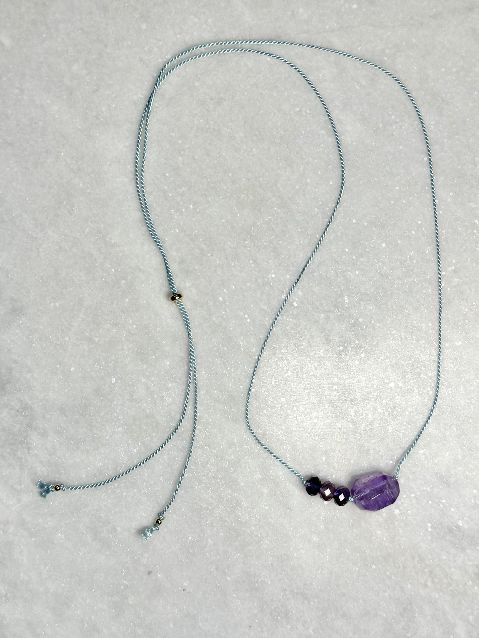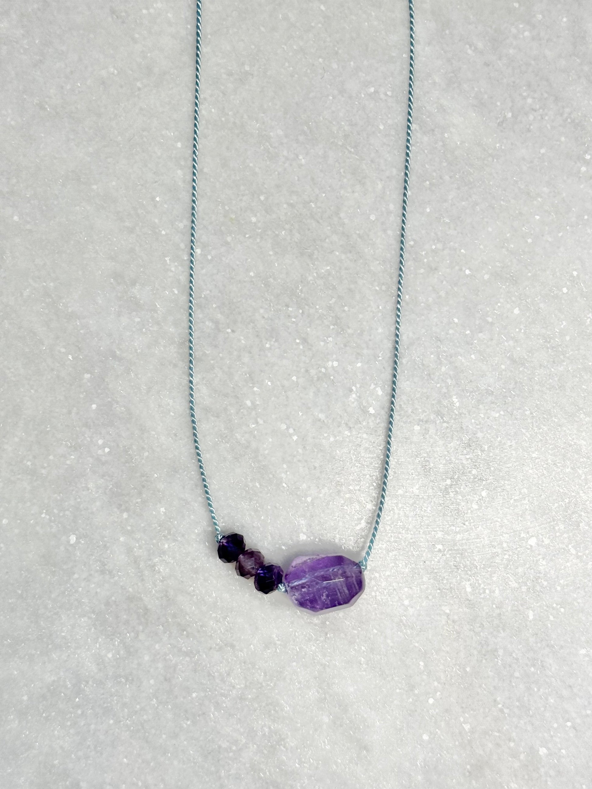 This pendant necklace features carefully selected amethyst, symbolising clarity, calm, and spiritual growth for February.