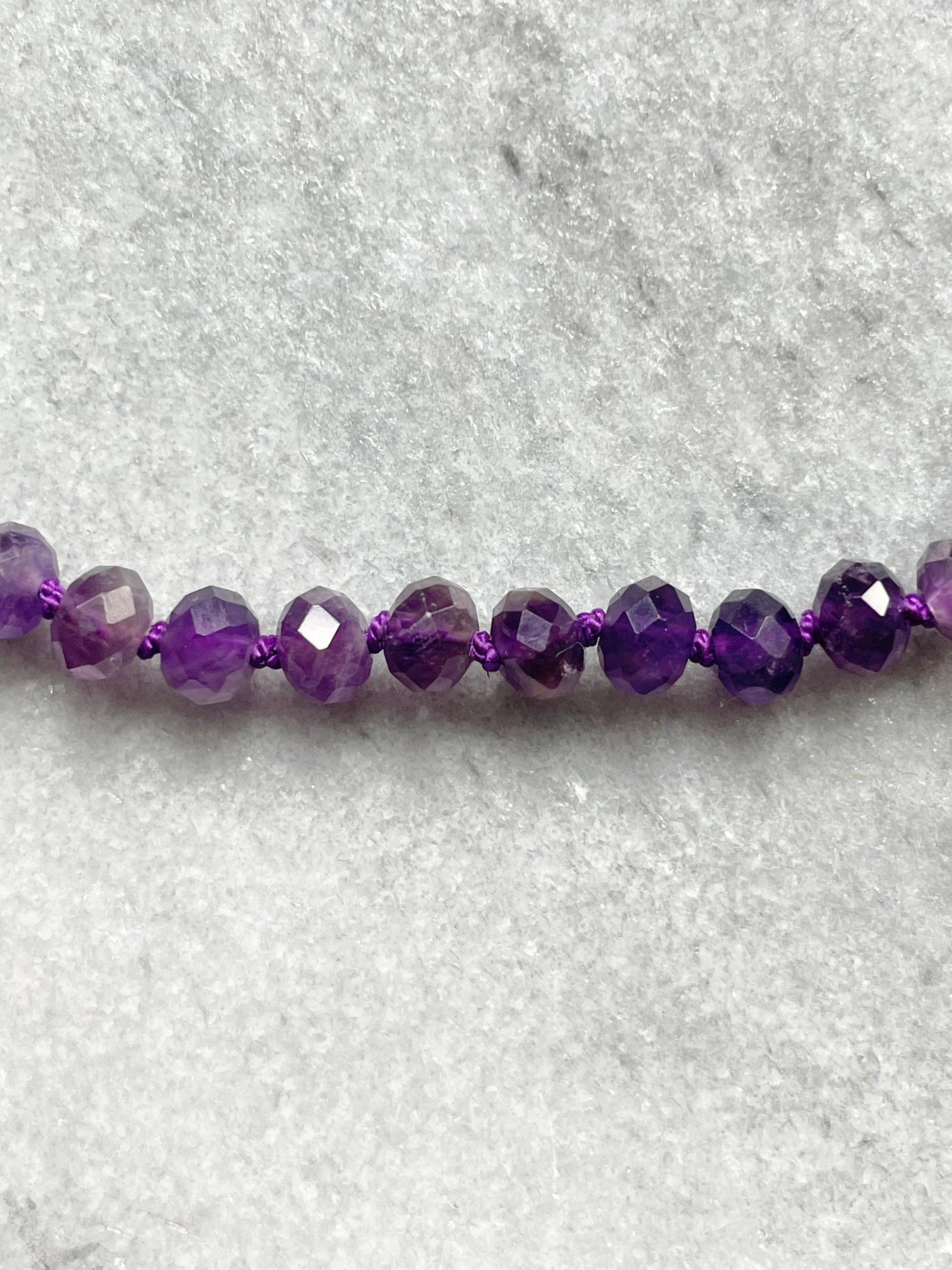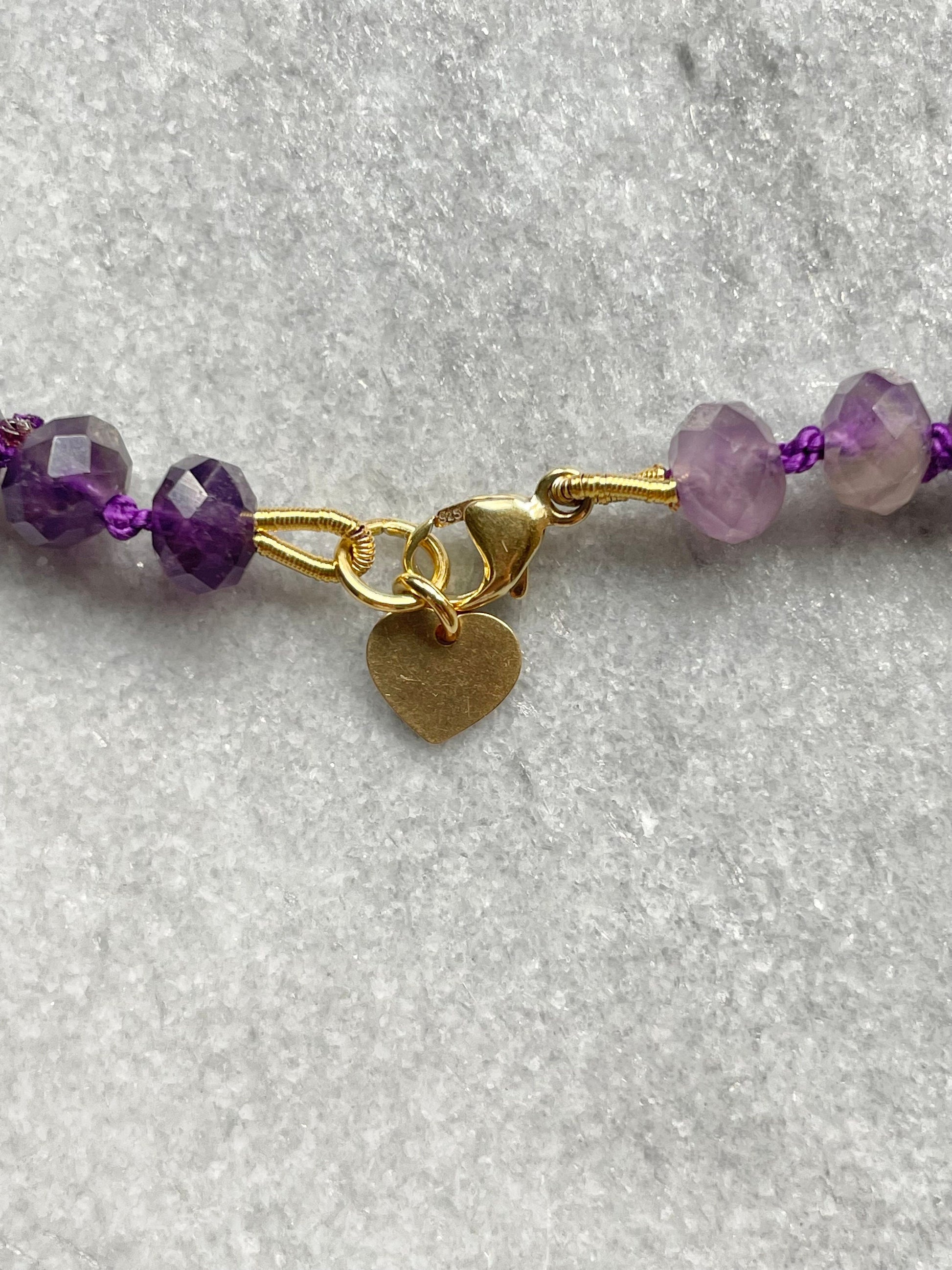 Améthyste facettée nouée à la main sur un fil de soie violet et dotée d'un fermoir mousqueton en vermeil doré et d'une petite breloque cœur.