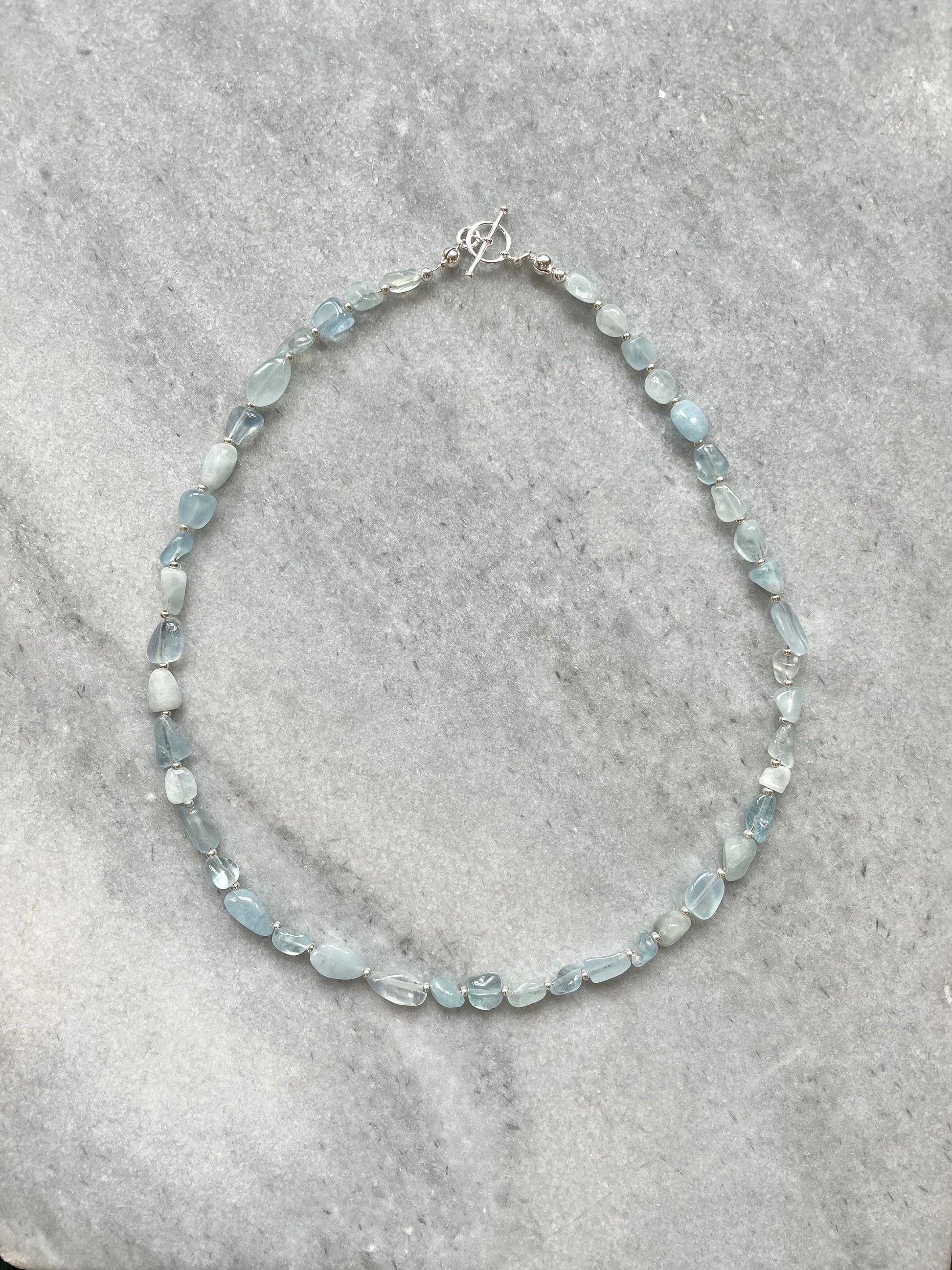 Ce collier a été composé de pépites d'aigue-marine et de perles de rocaille Miyuki en argent finies avec un fermoir à bascule en argent sterling.