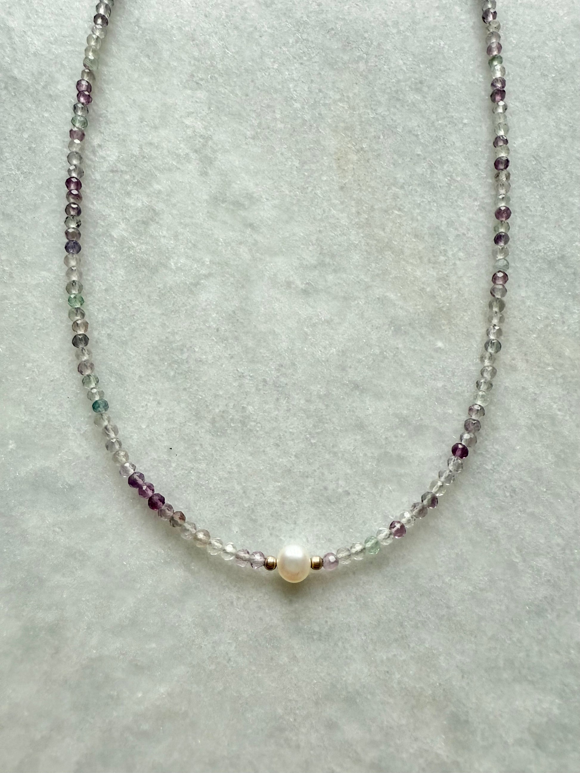 This delicate necklace is made with fluorite beads and a tiny freshwater pearl, finished with a sterling silver clasp.