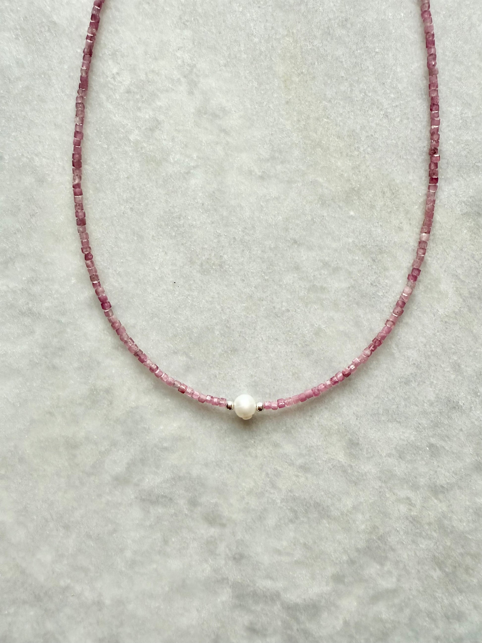 This dainty necklace is made with pink Tourmaline cubes and a tiny freshwater pearl, finished with a sterling silver clasp.