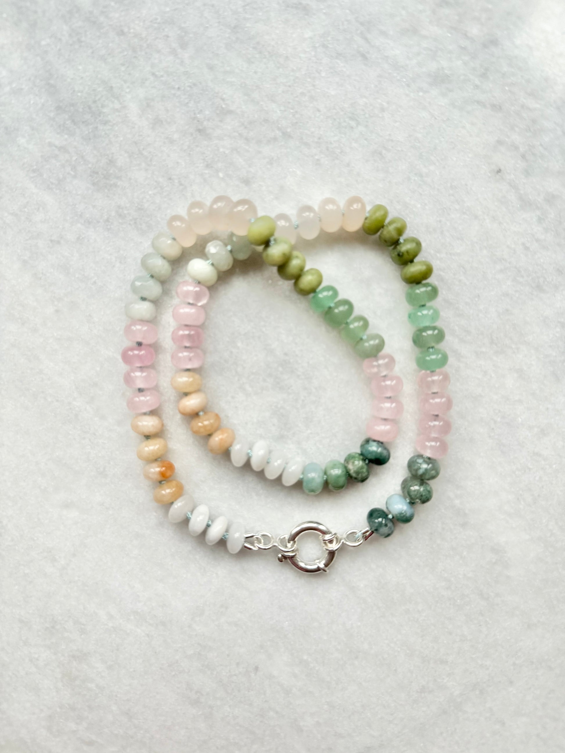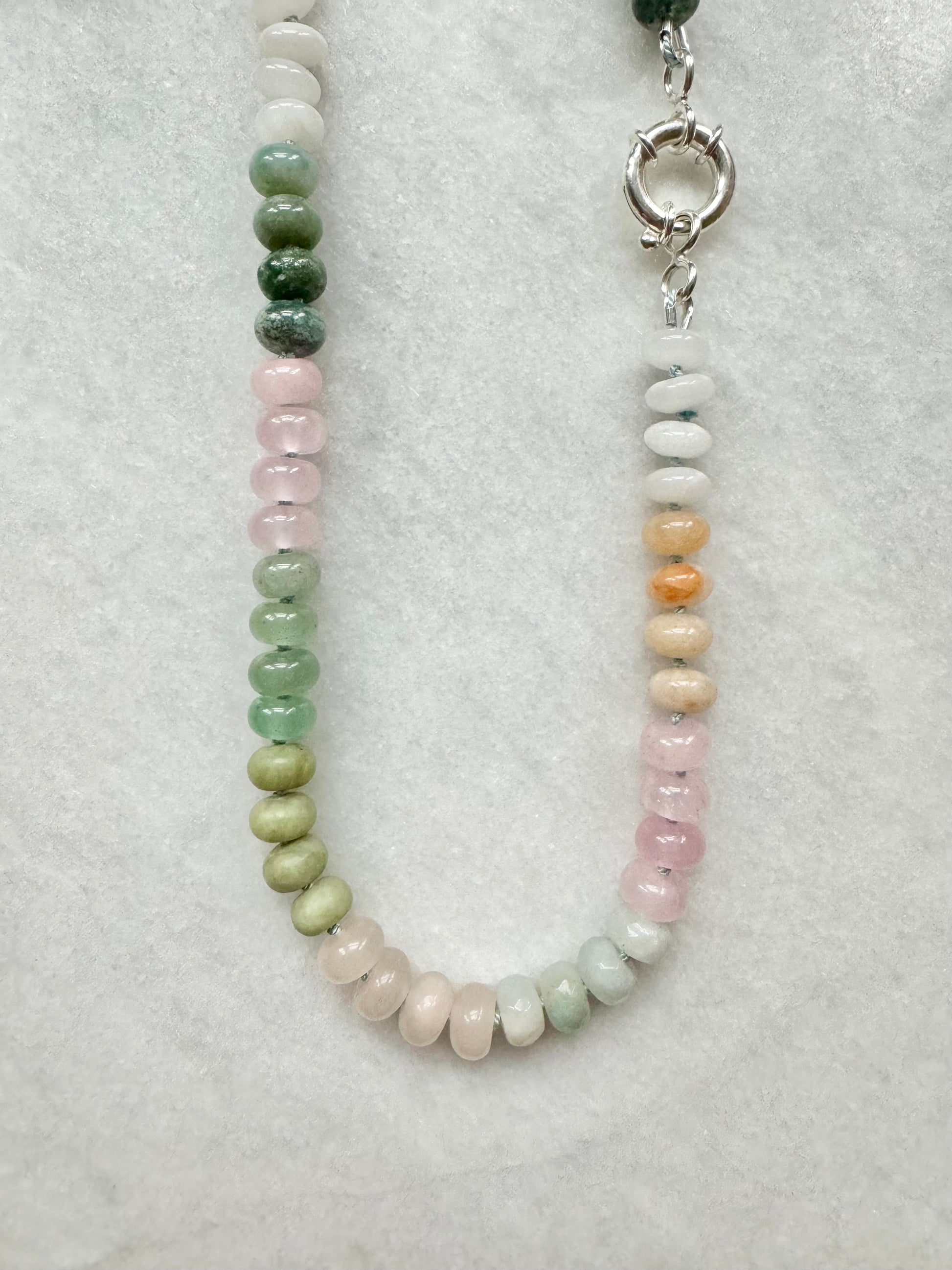Introducing our Candy Gems Necklace, a harmonious blend of stones such as Rose Quartz, Pink, Orange and Green Aventurine, Amazonite, Moss Agate, Green Opal & White Jade.