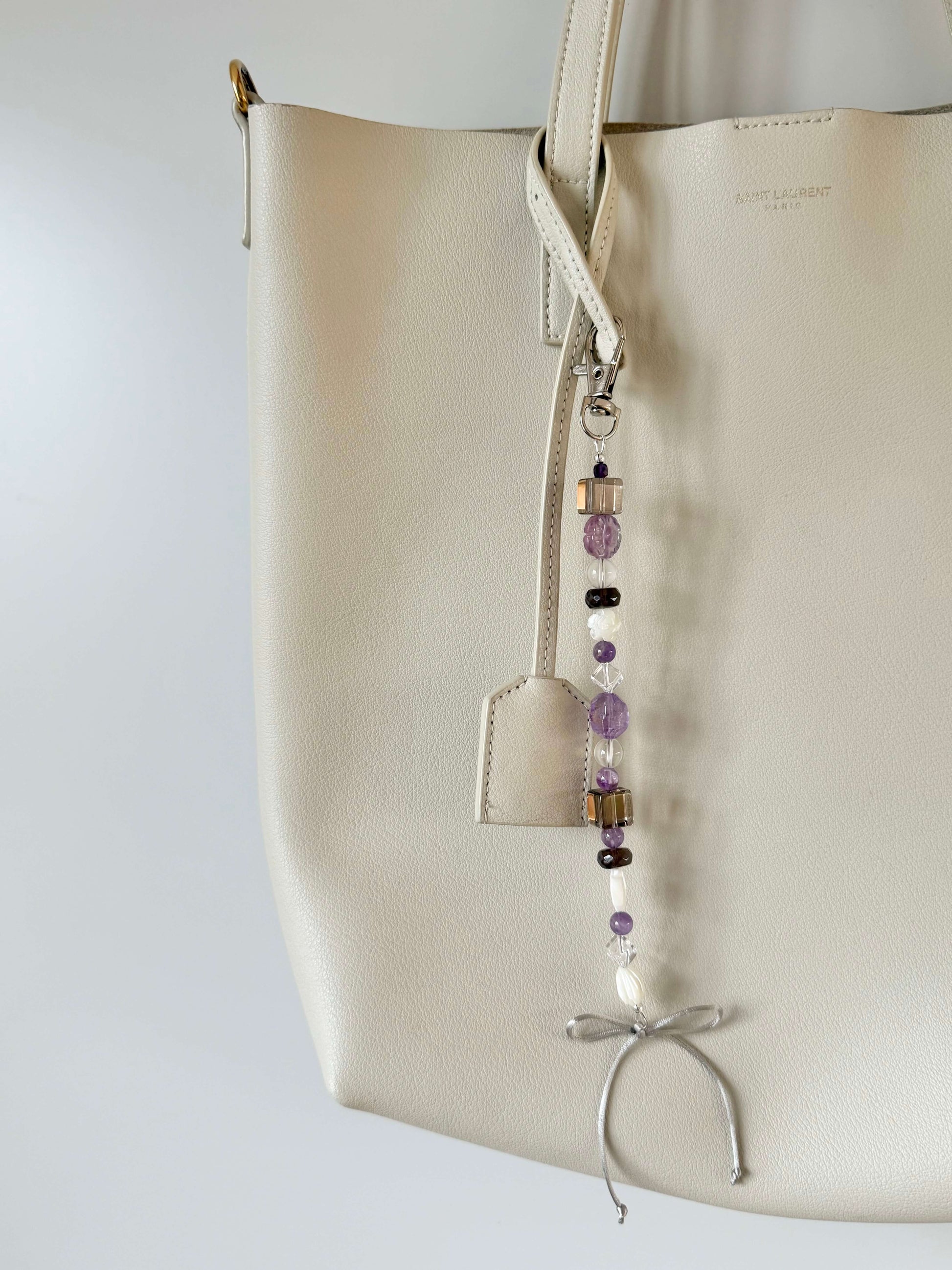 Elegant and richly coloured, the Iris Bag Charm combines amethyst, fluorite, smoky quartz, clear quartz and mother of pearl for a beautifully balanced and luxurious look.