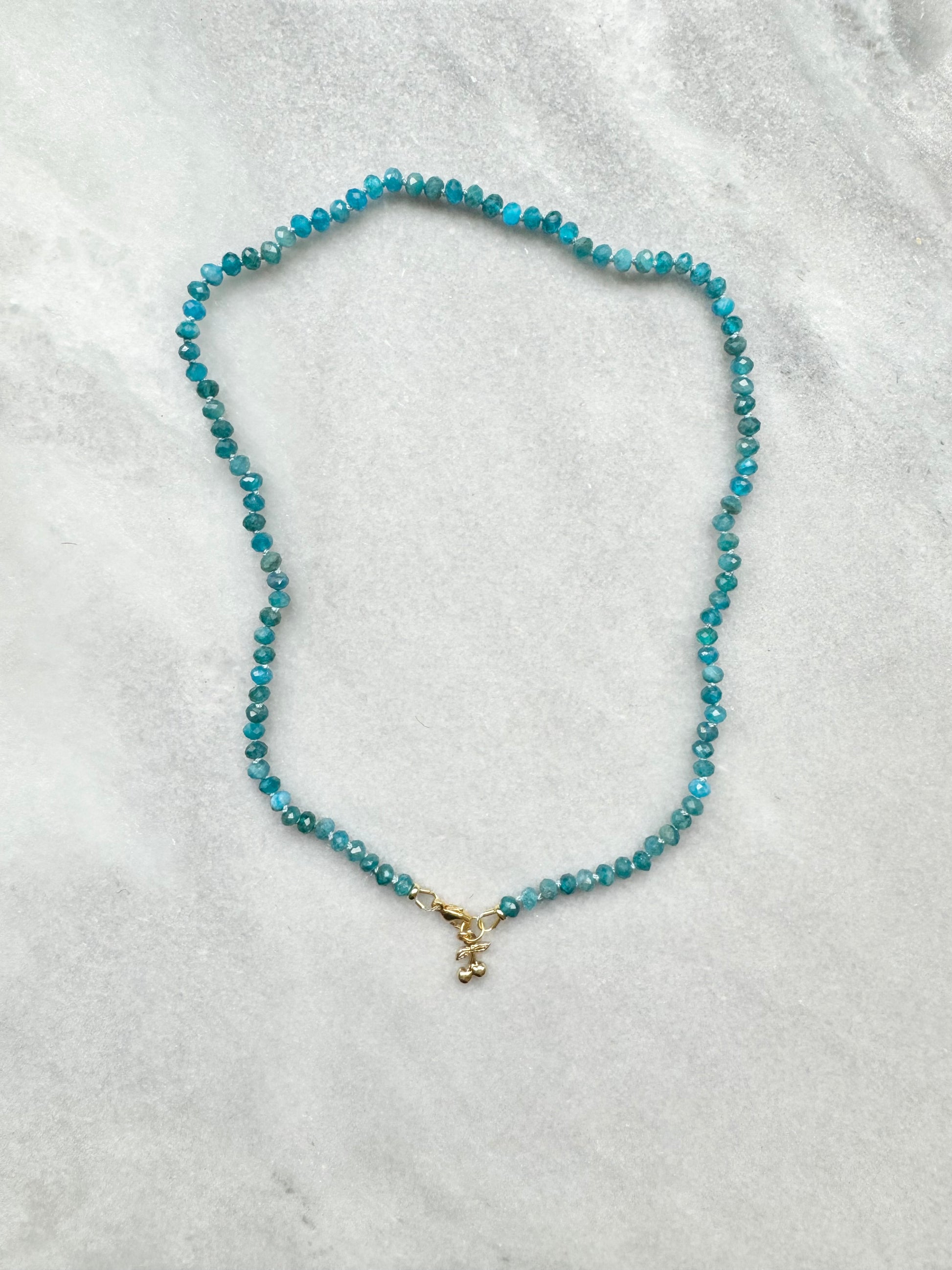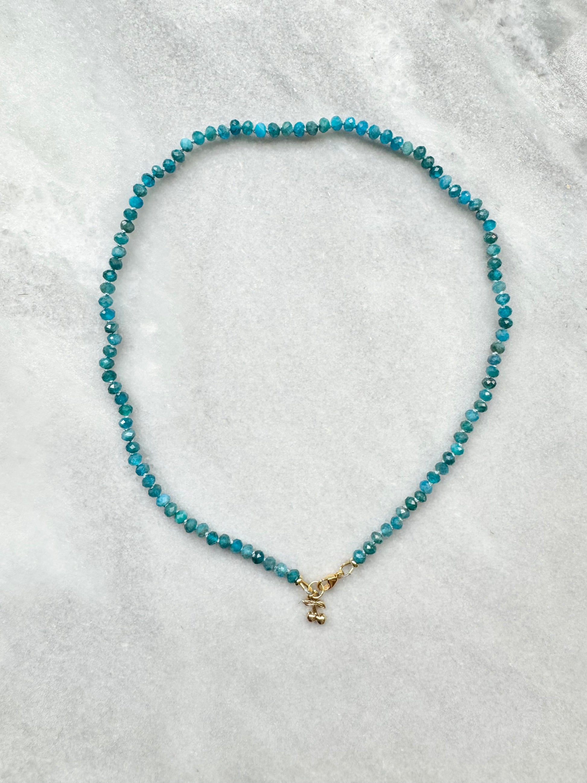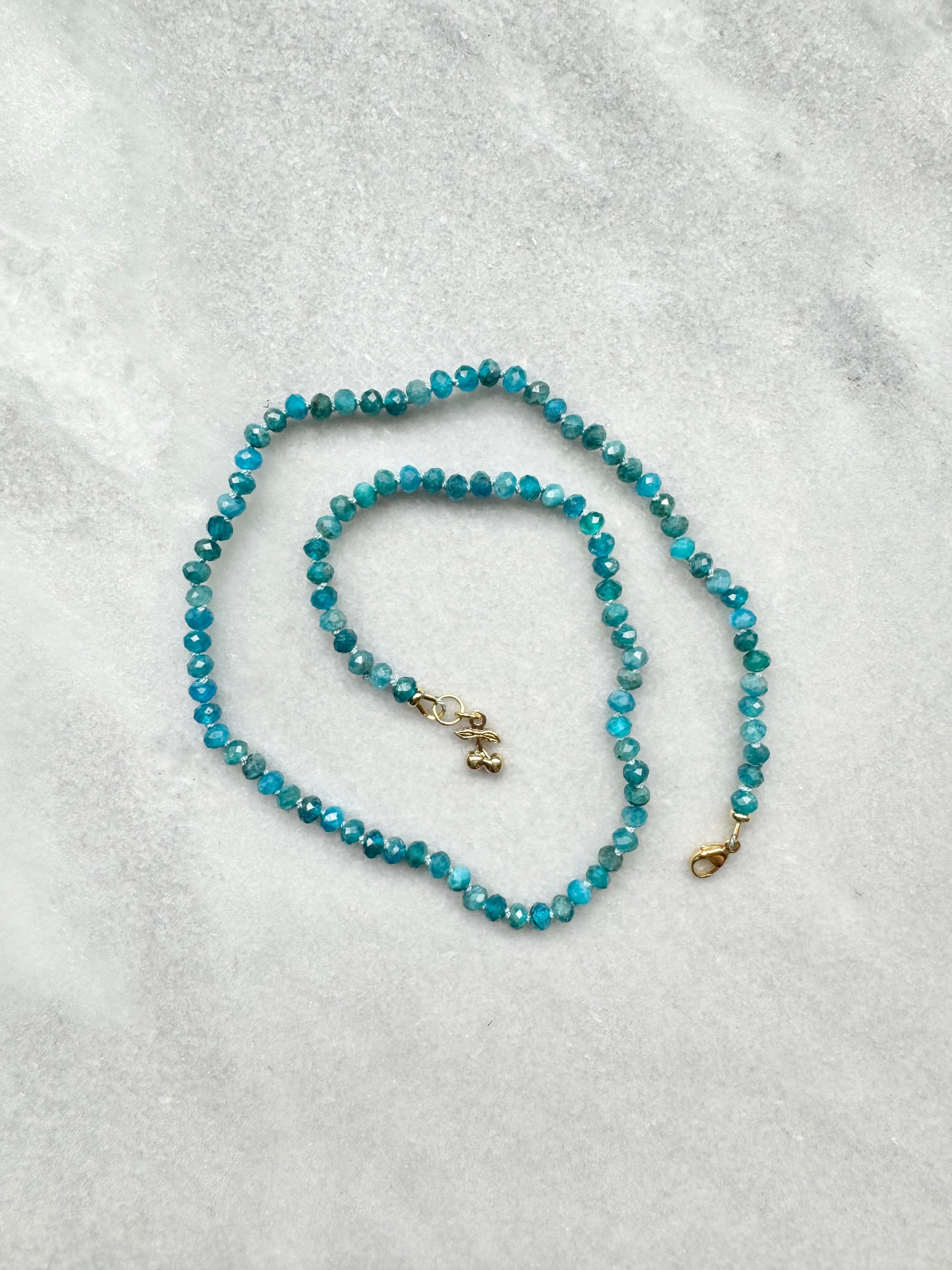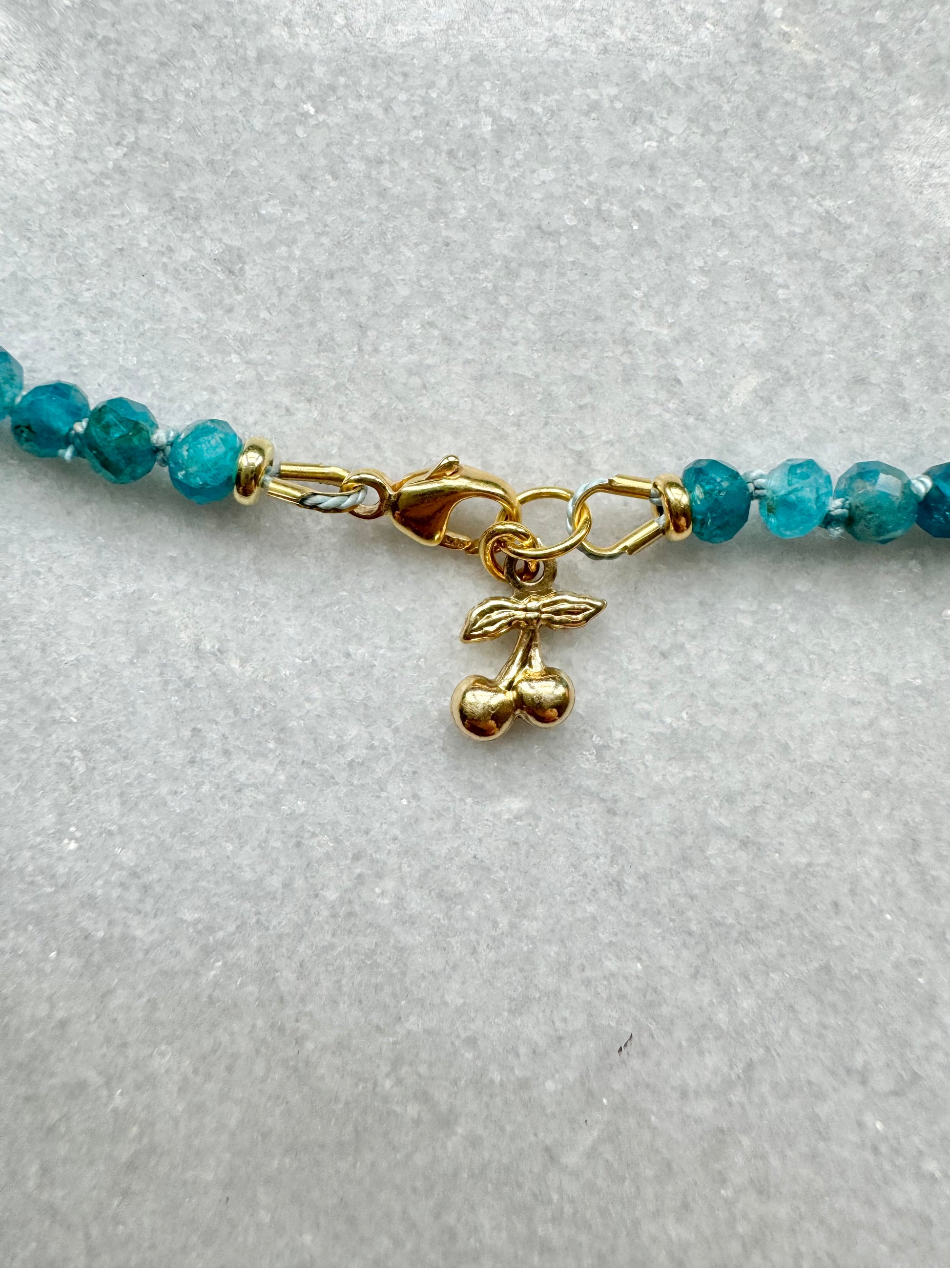 These Apatite rondelles have been hand knotted and finished with a gold vermeil clasp and a tiny cherry charm.