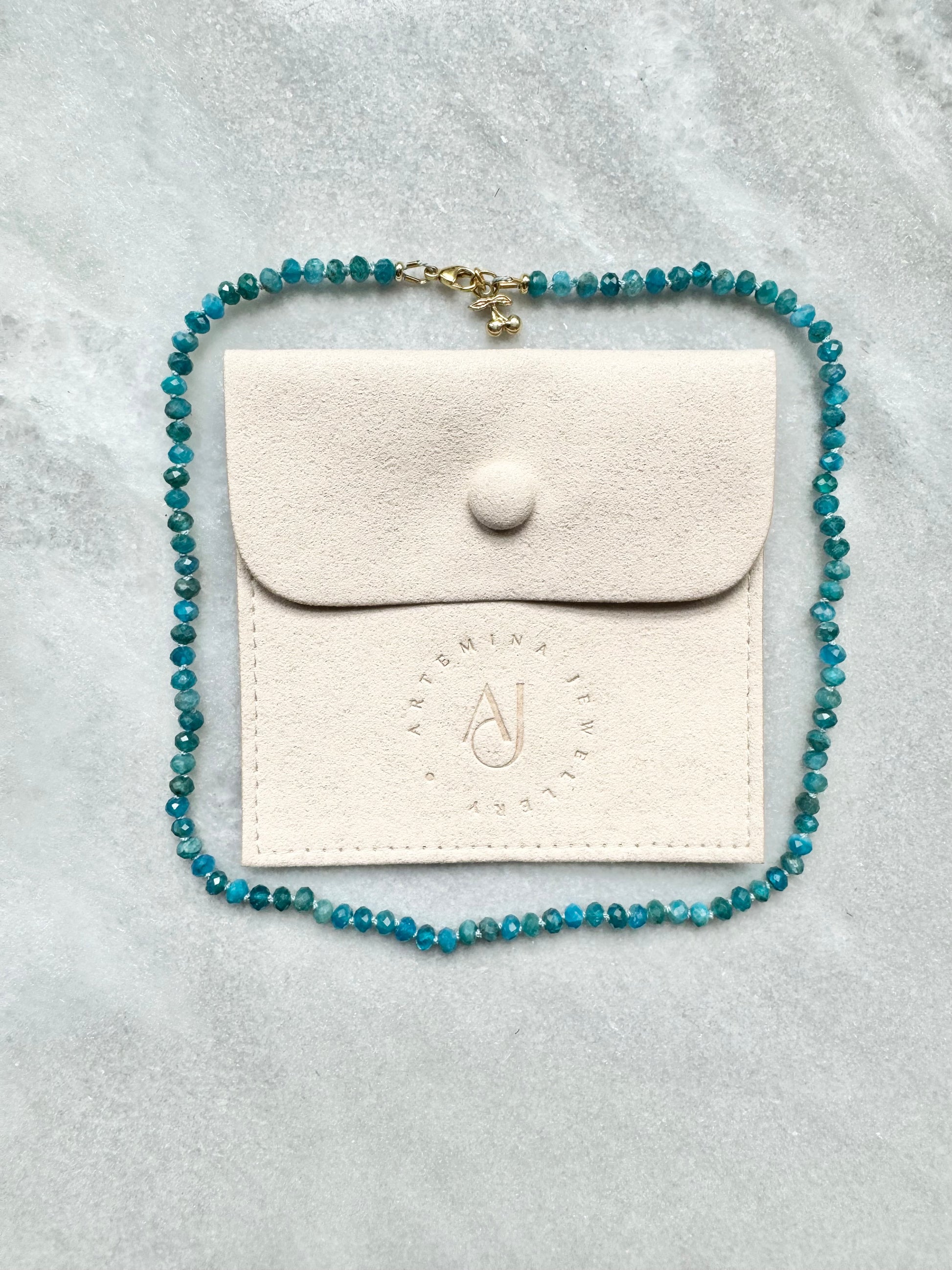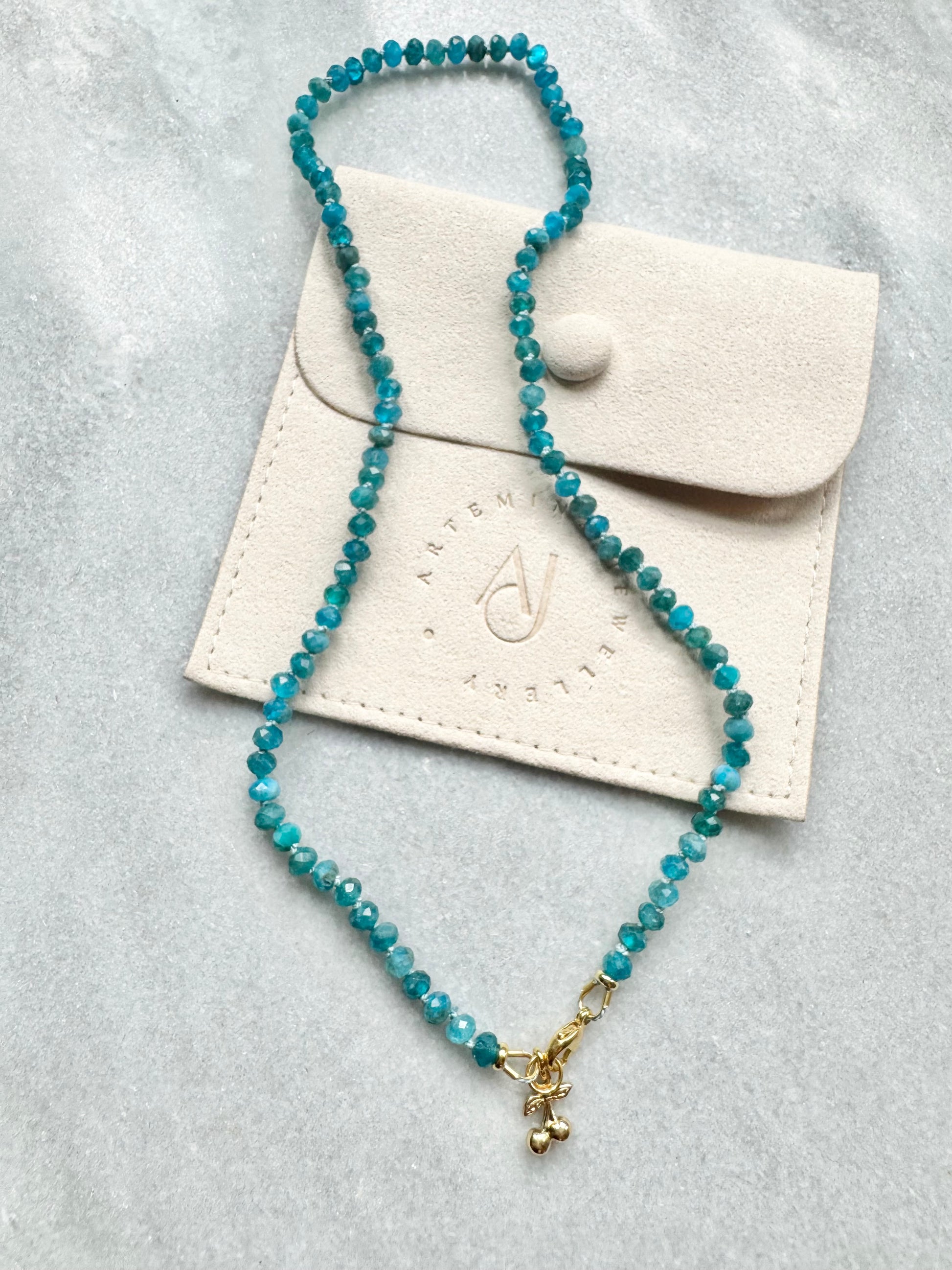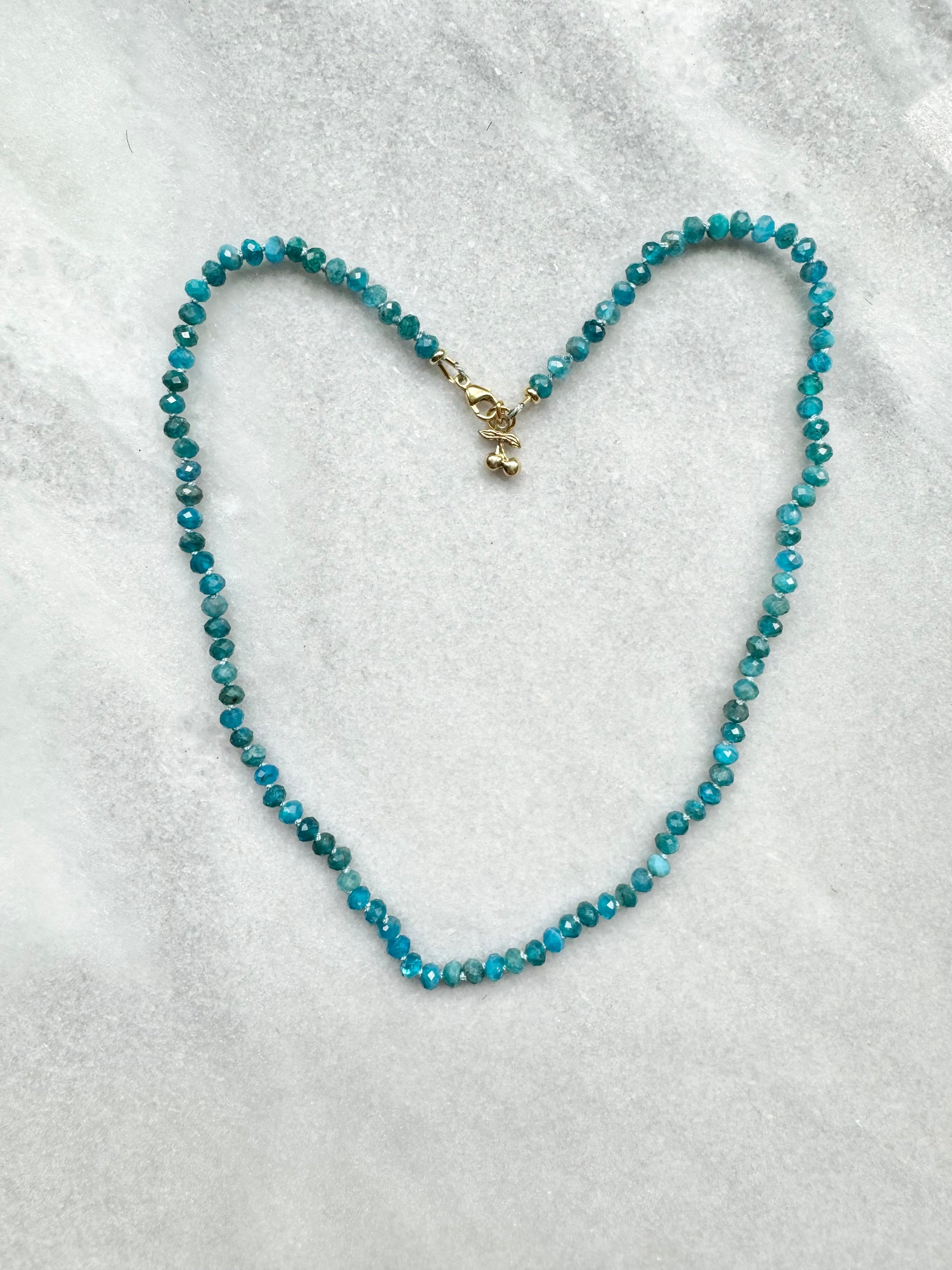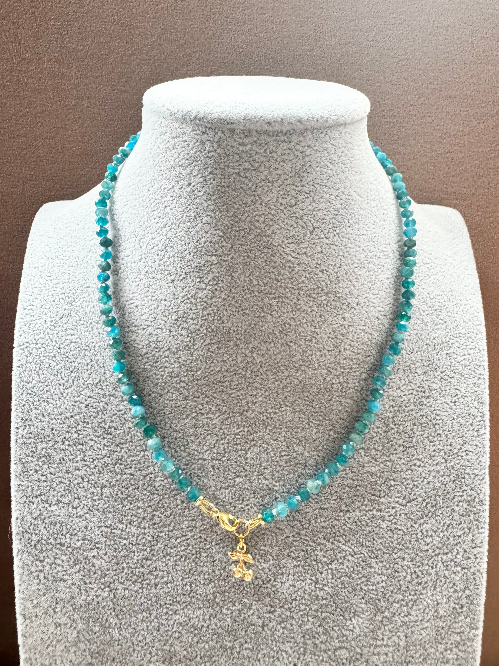 These Apatite rondelles have been hand knotted and finished with a gold vermeil clasp and a tiny cherry charm.