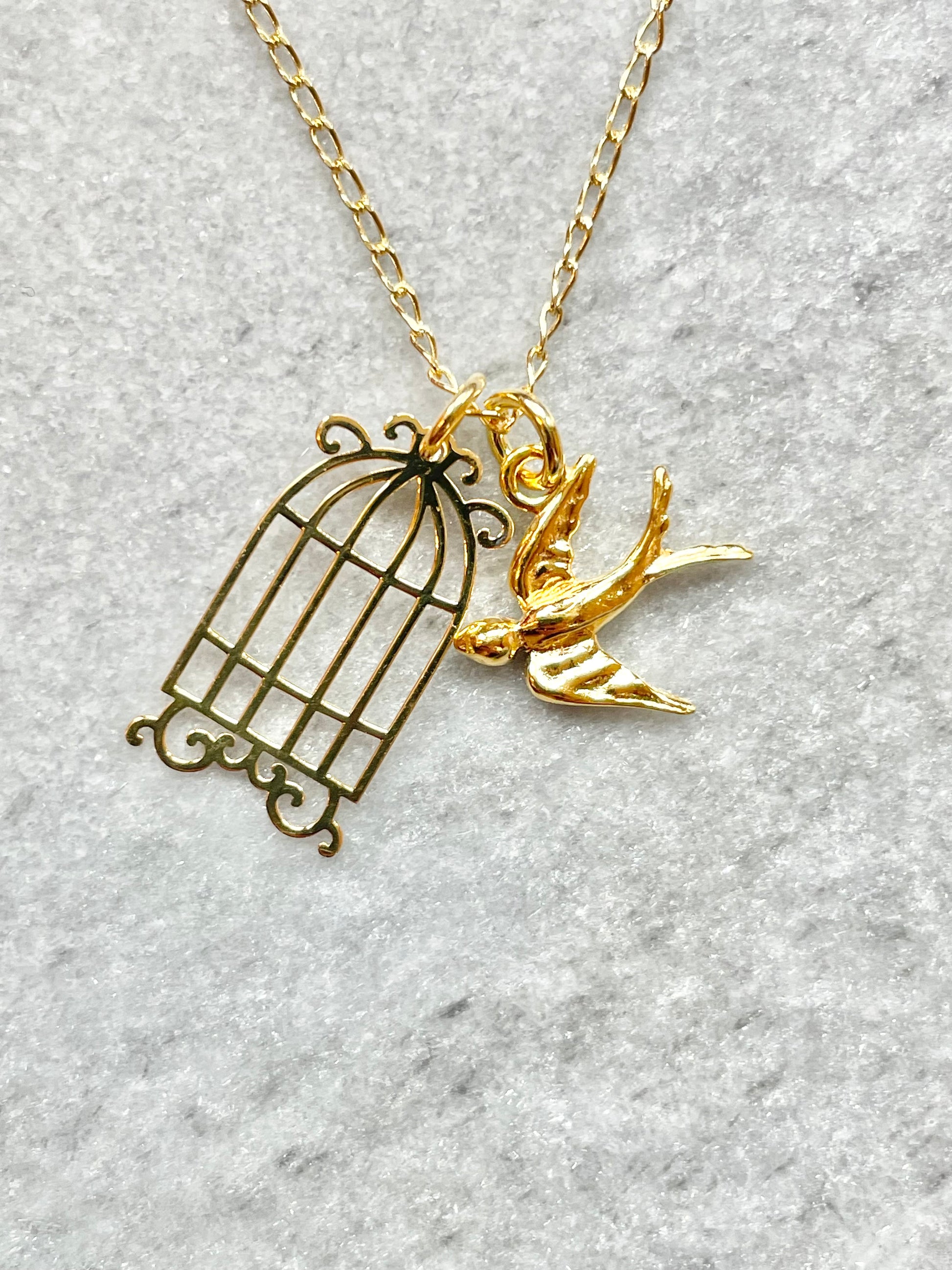 Embrace the beauty of symbolism with our Bird & Cage Necklace. Featuring a delicately finished swallow and cage charm, this necklace represents freedom, dreams and new beginnings.