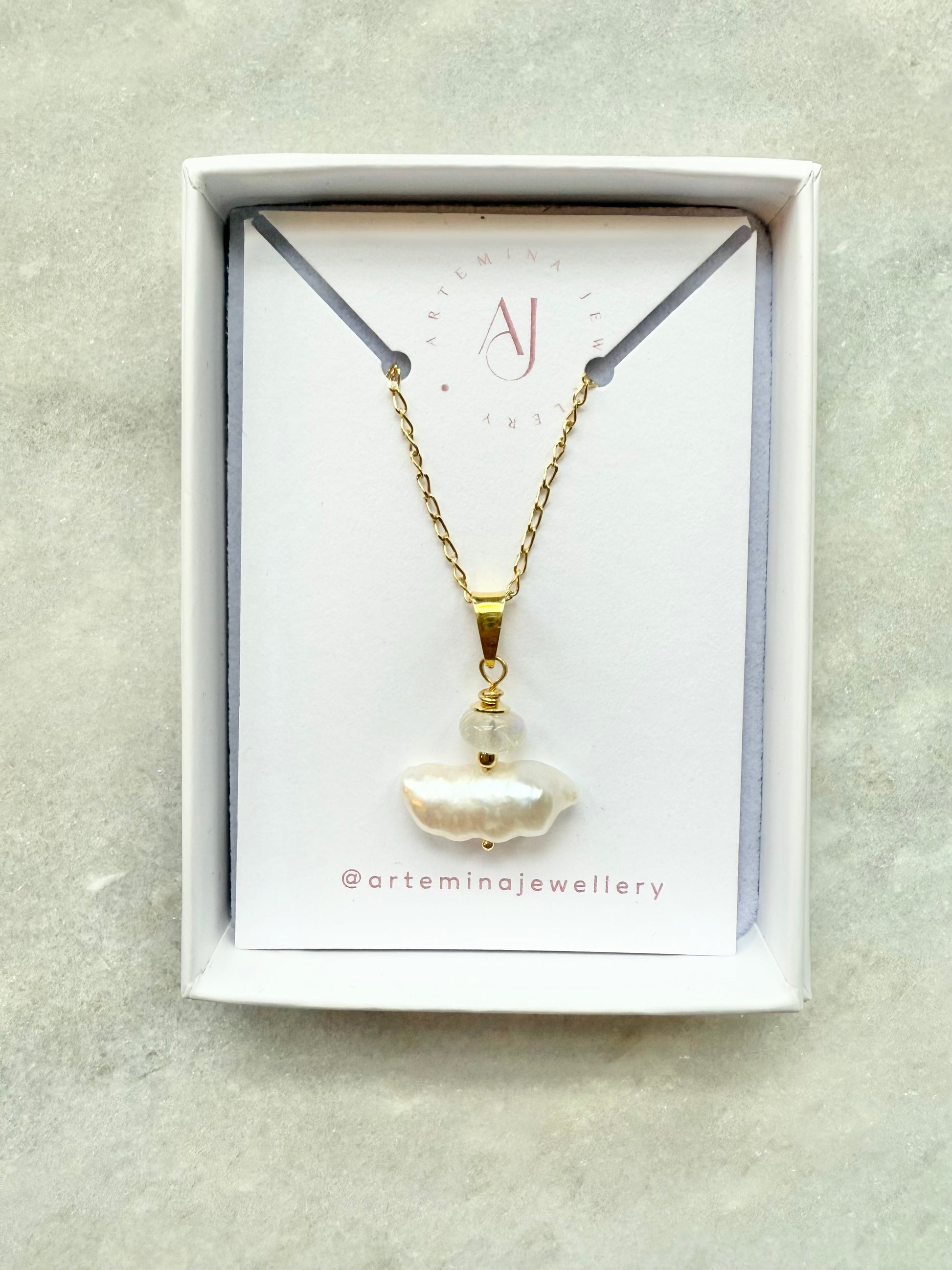 Biwa pearl & moonstone pendant on a gold vermeil curb chain.