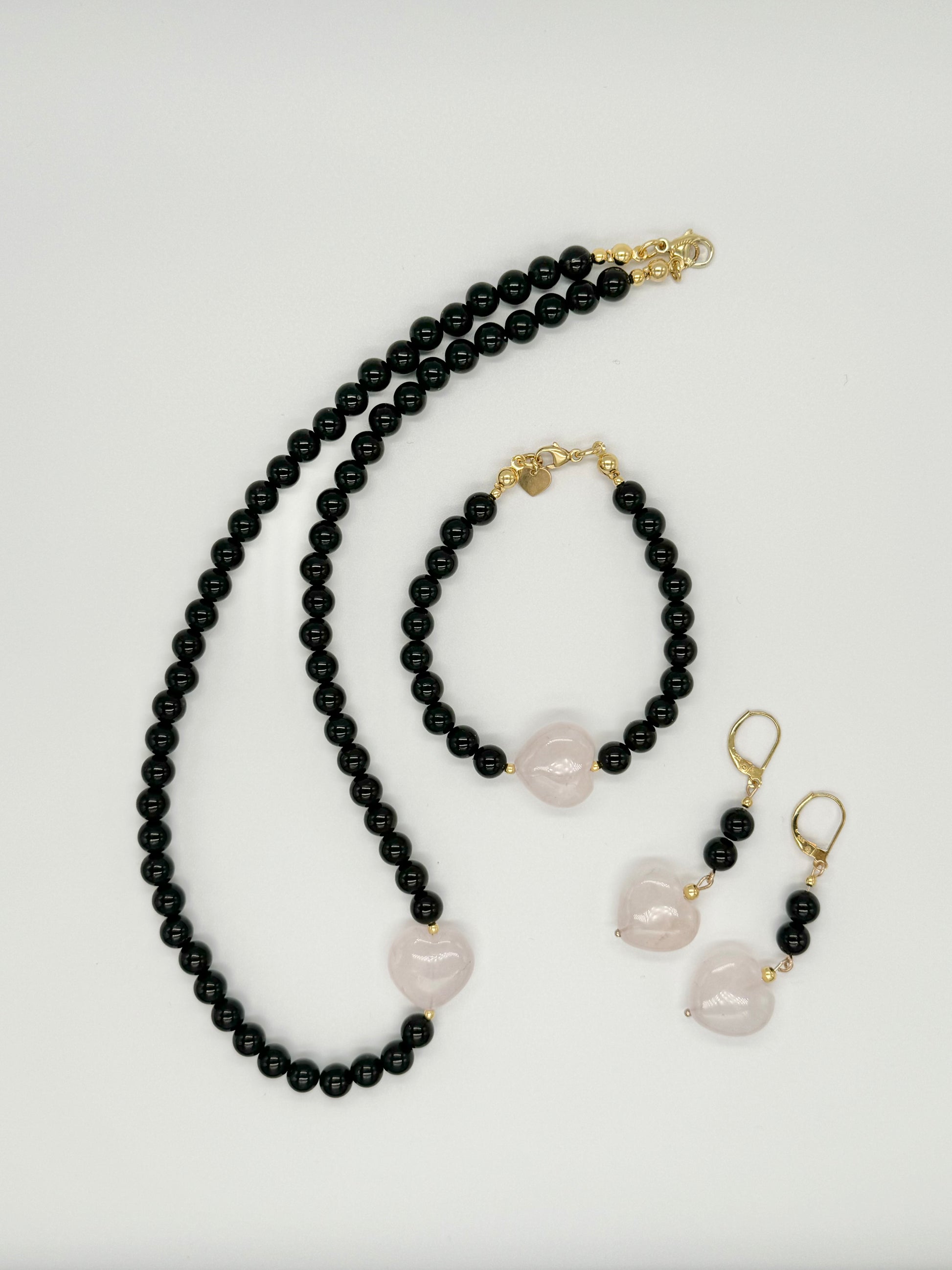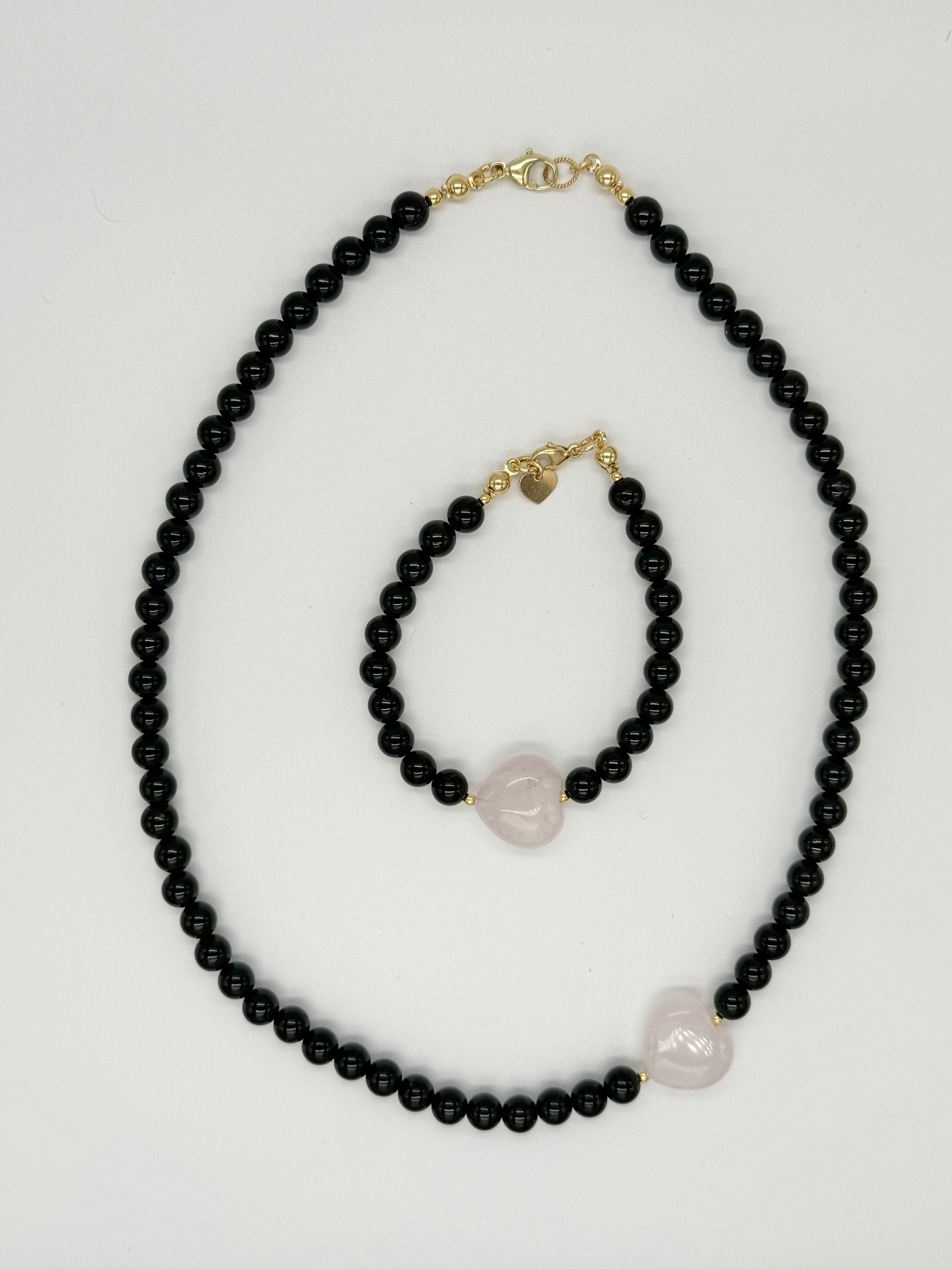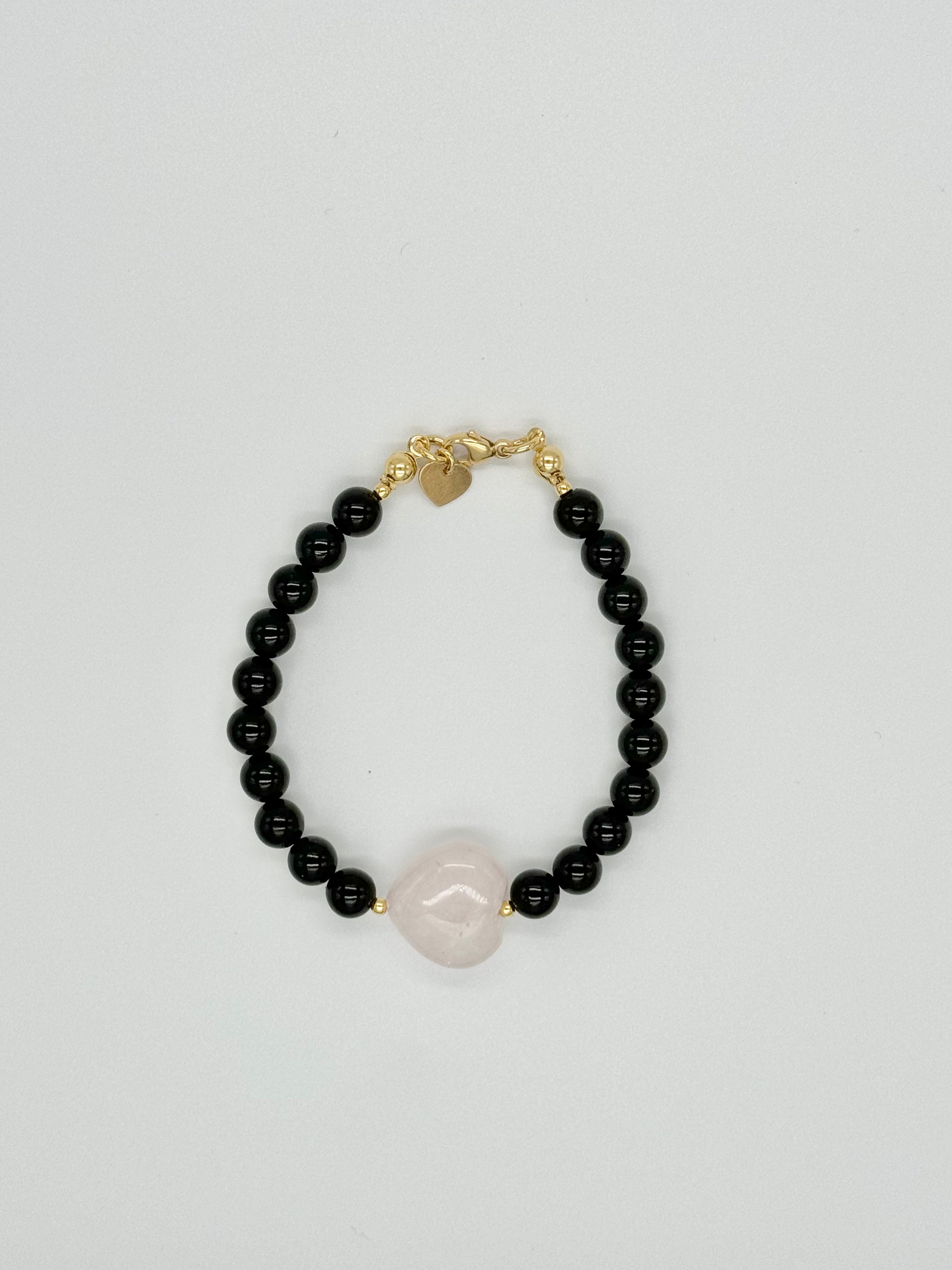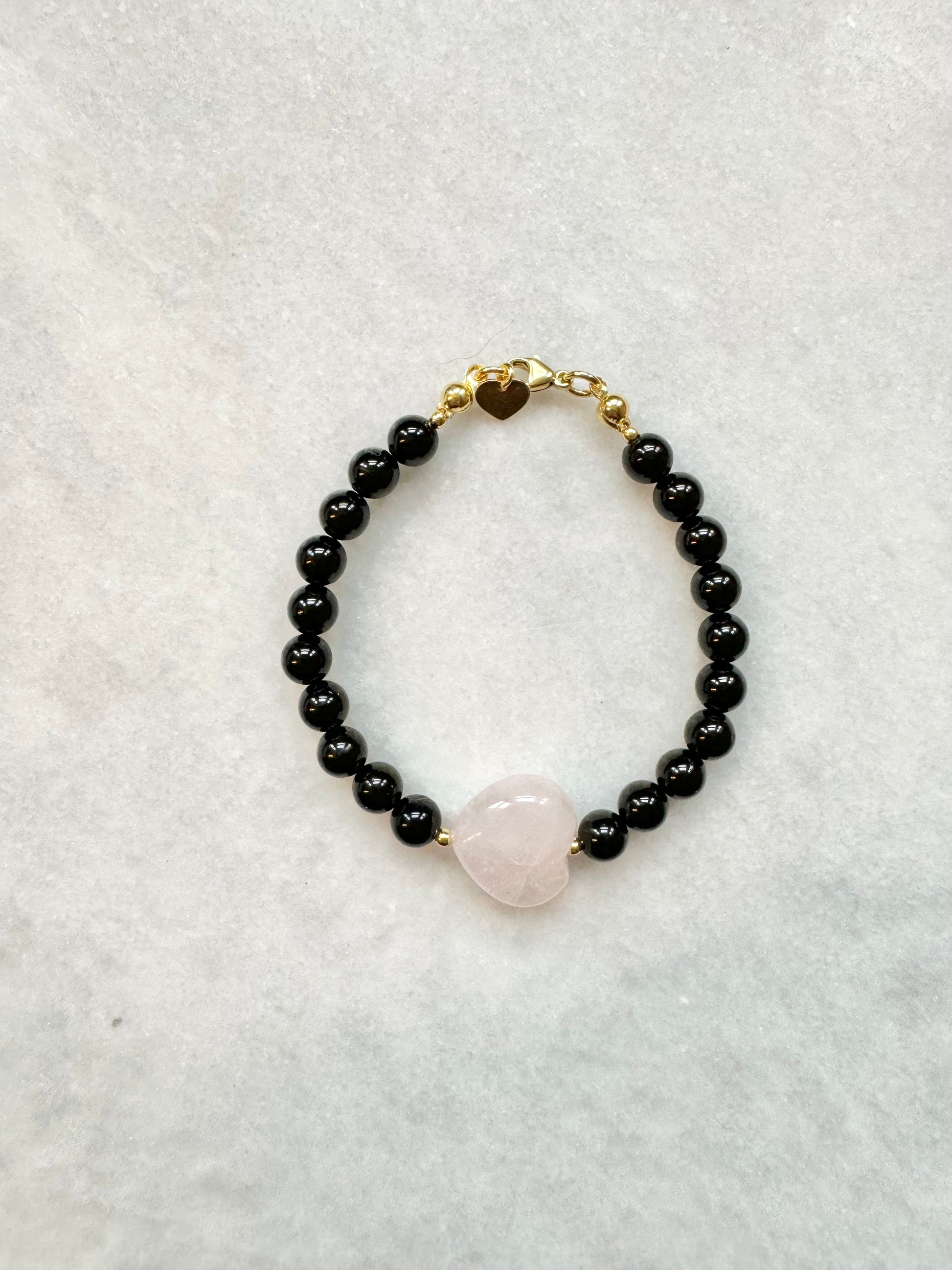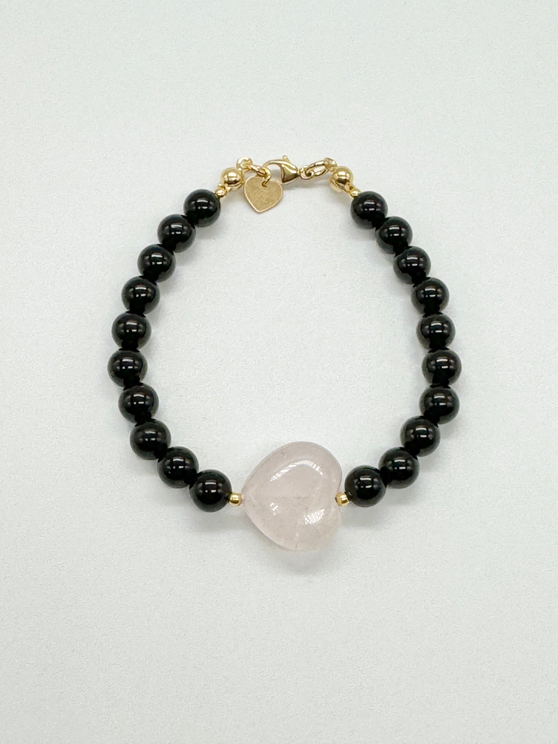Black Tourmaline beaded bracelet with Rose Quartz heart and gold vermeil lobster clasp.