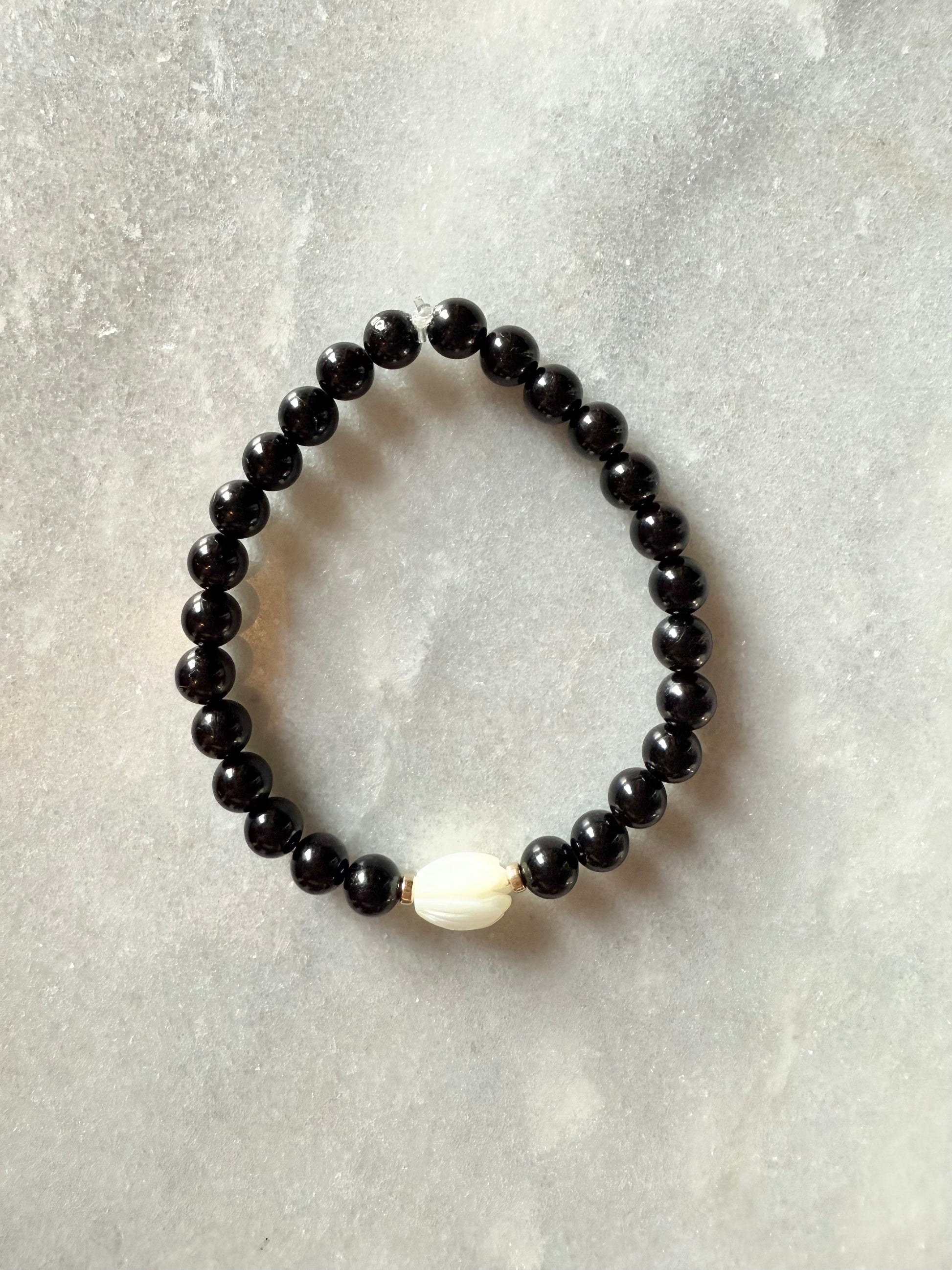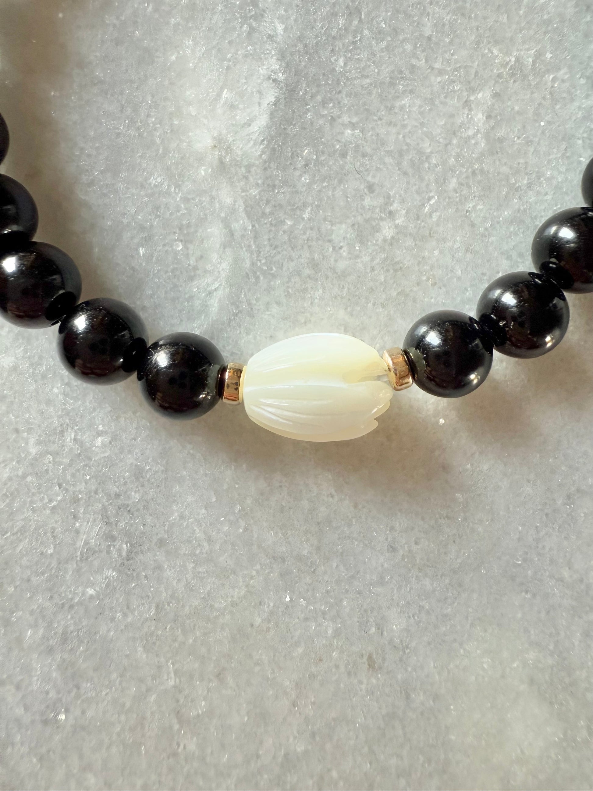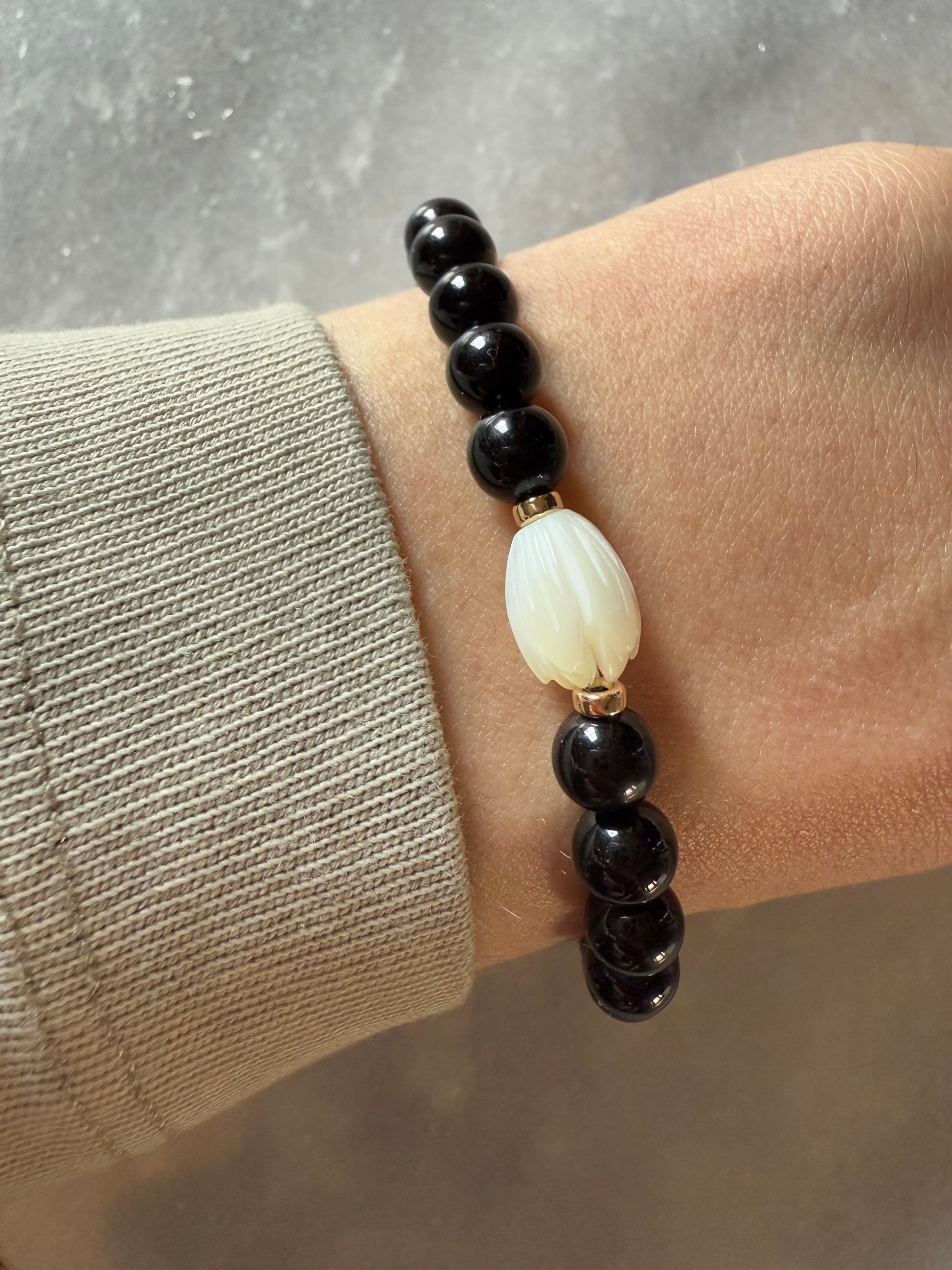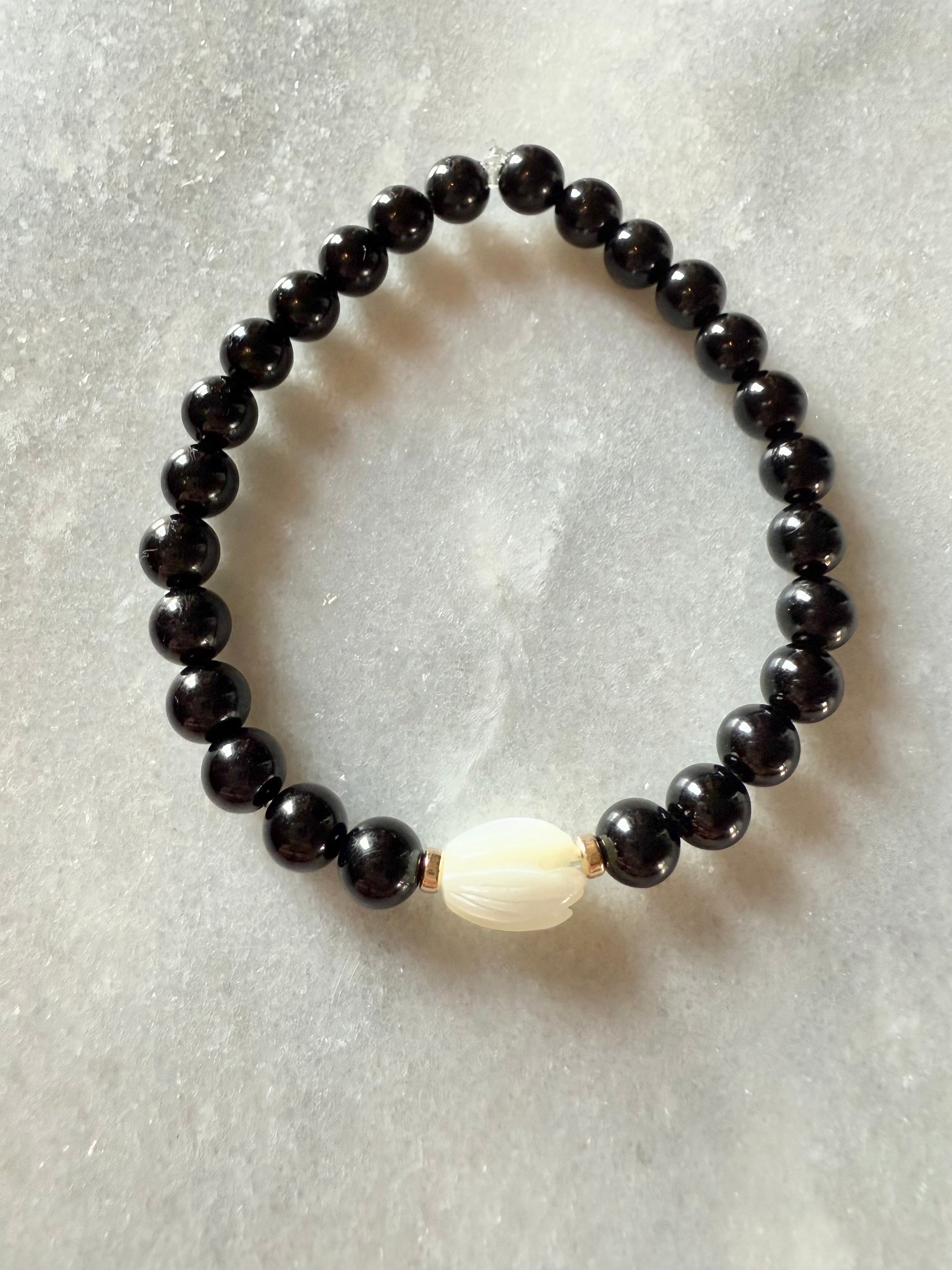 Black Tourmaline elastic bracelet with mother of pearl tulip and gold filled accents.