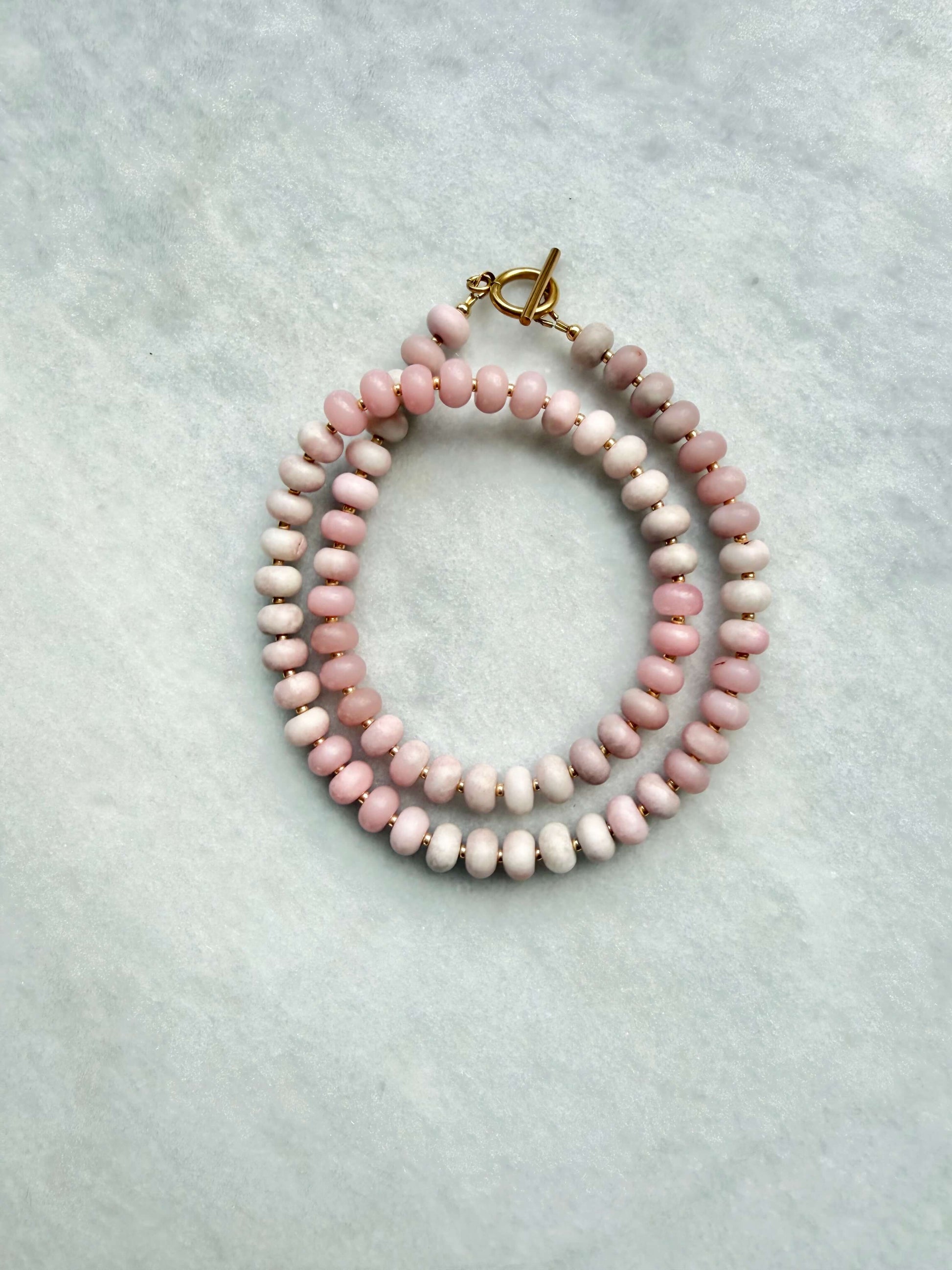 This necklace features Pink Opal rondelles, accented with delicate Japanese Miyuki seed beads for a subtle contrast in texture and tone. Finished with a gold-plated stainless steel toggle clasp, it’s both elegant and easy to wear.