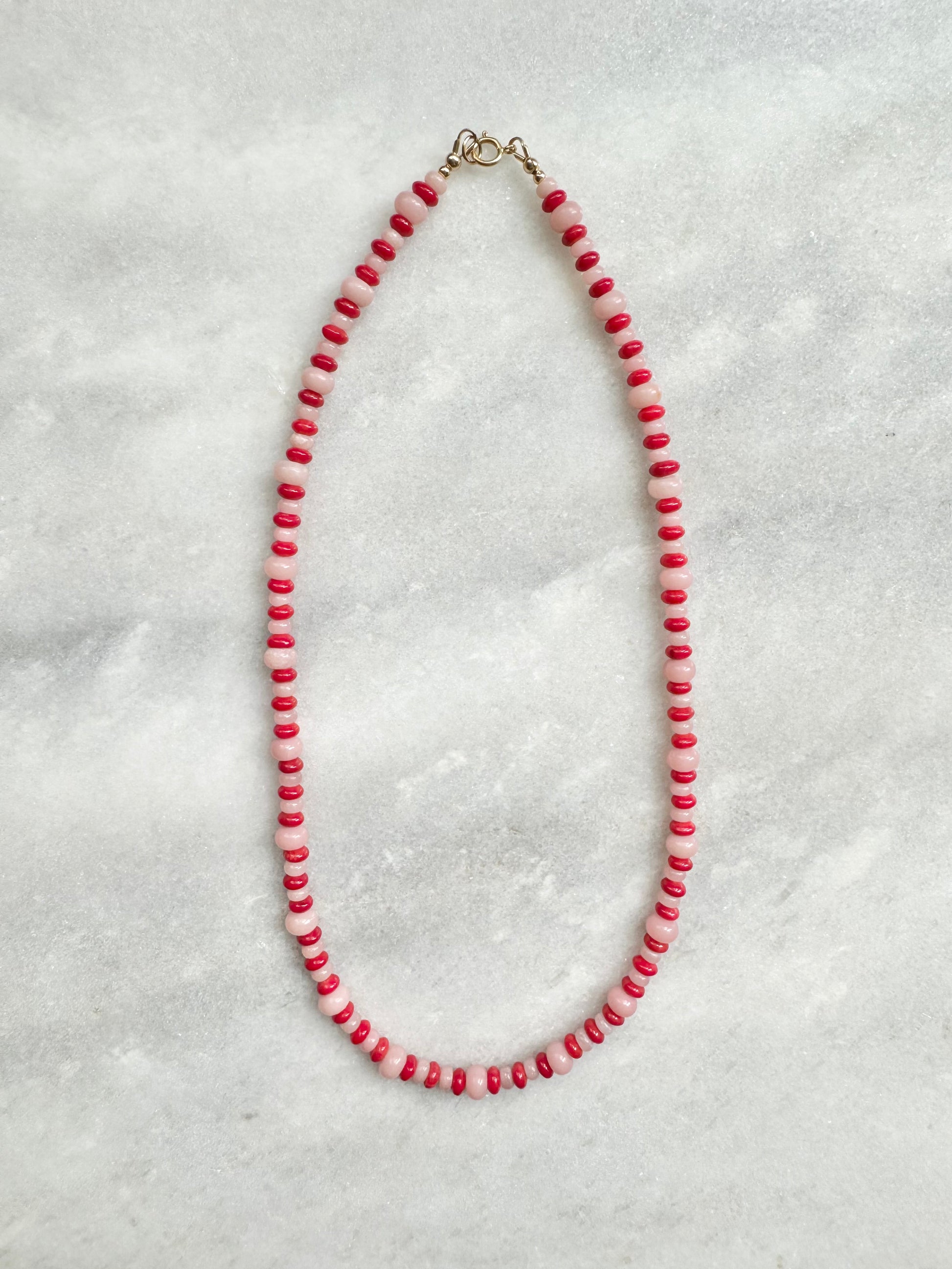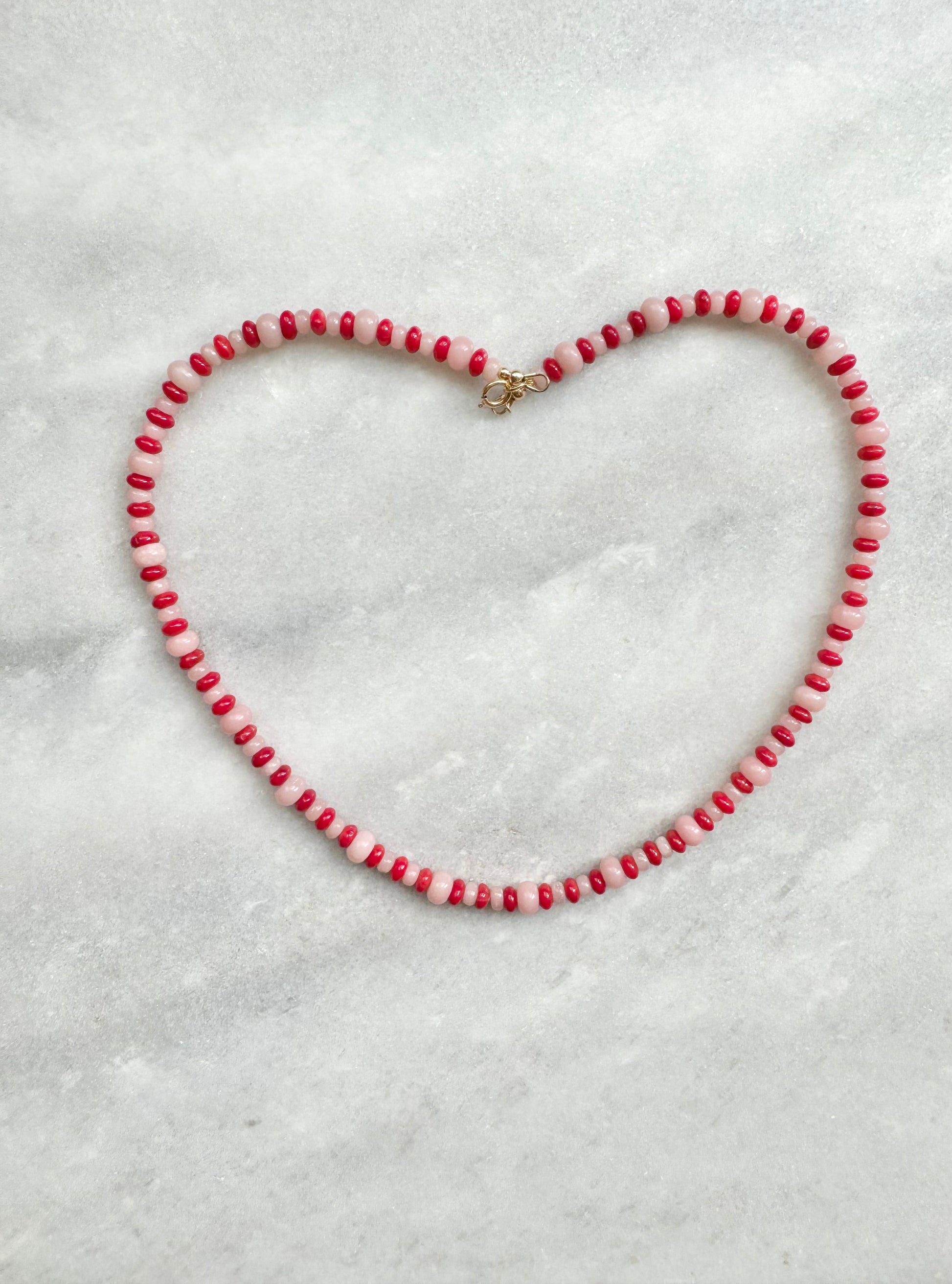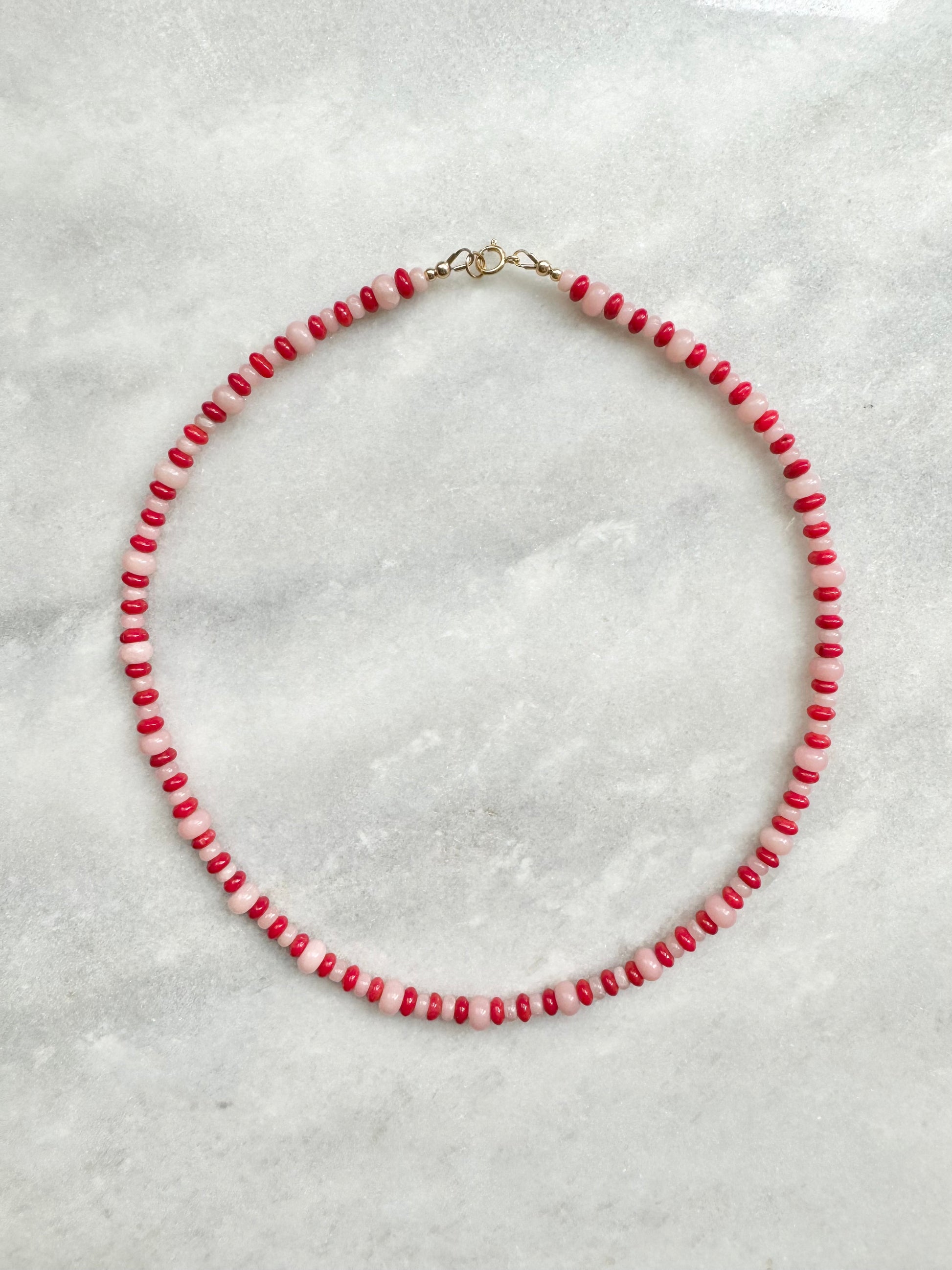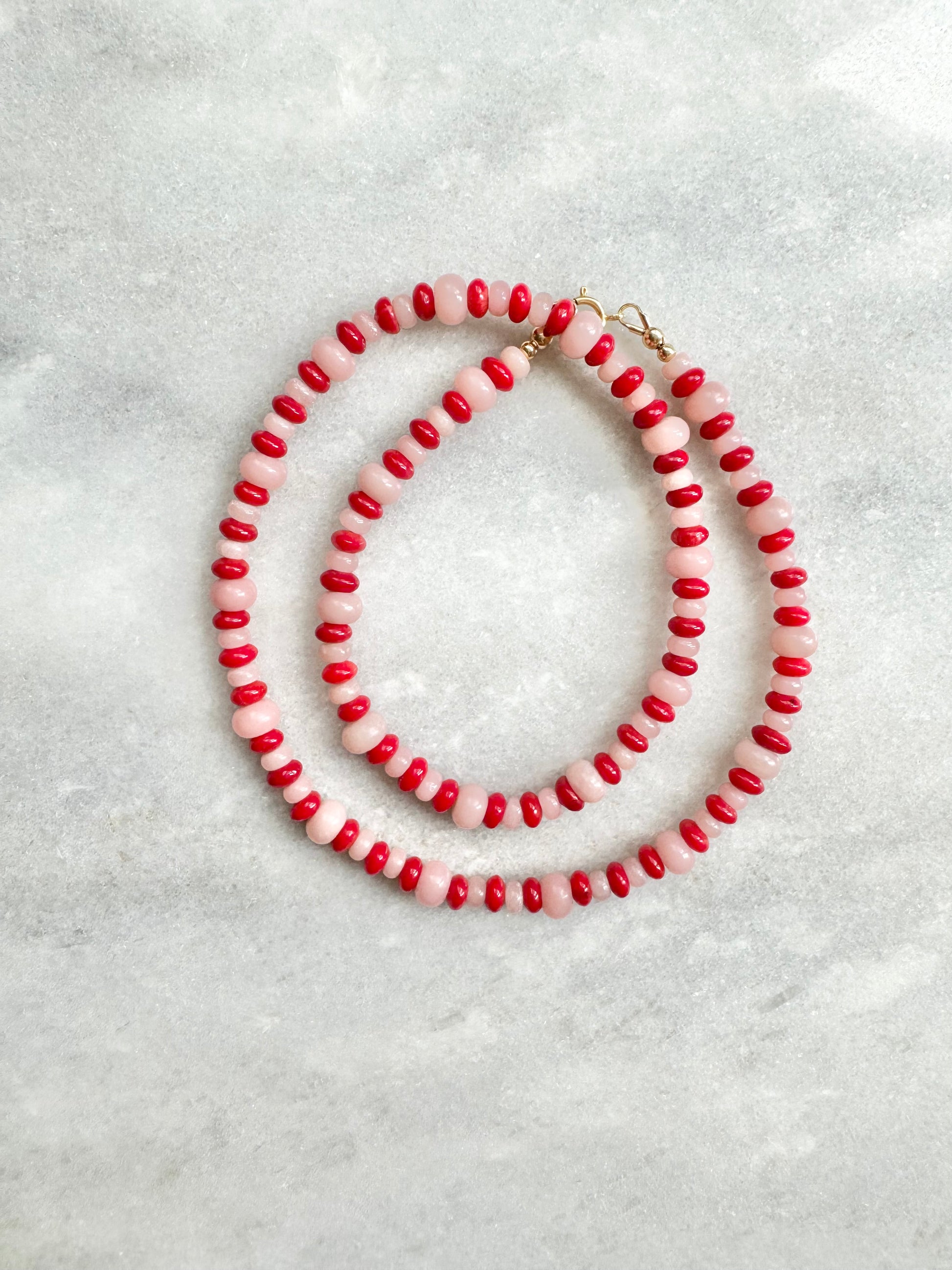 The Coral Bloom Necklace combines the delicate hues of Pink Opal and Red Coral rondelle beads with a gold-filled clasp.