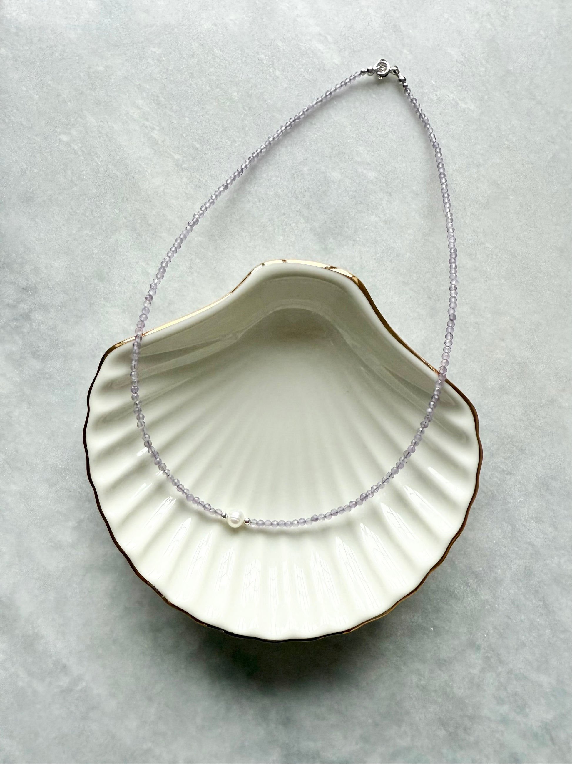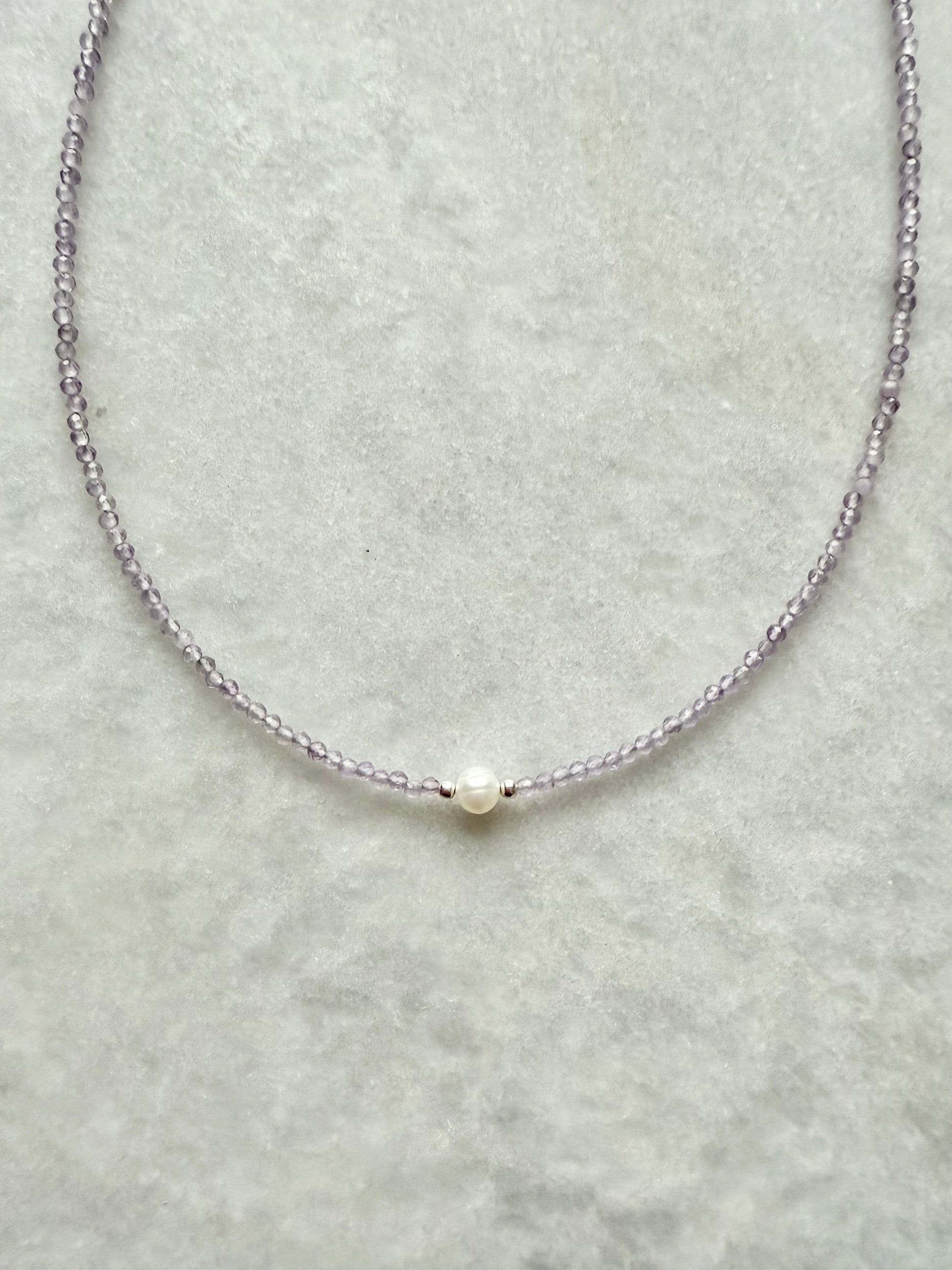 This dainty necklace is made with Amethyst faceted beads and a tiny freshwater pearl, finished with a sterling silver clasp.