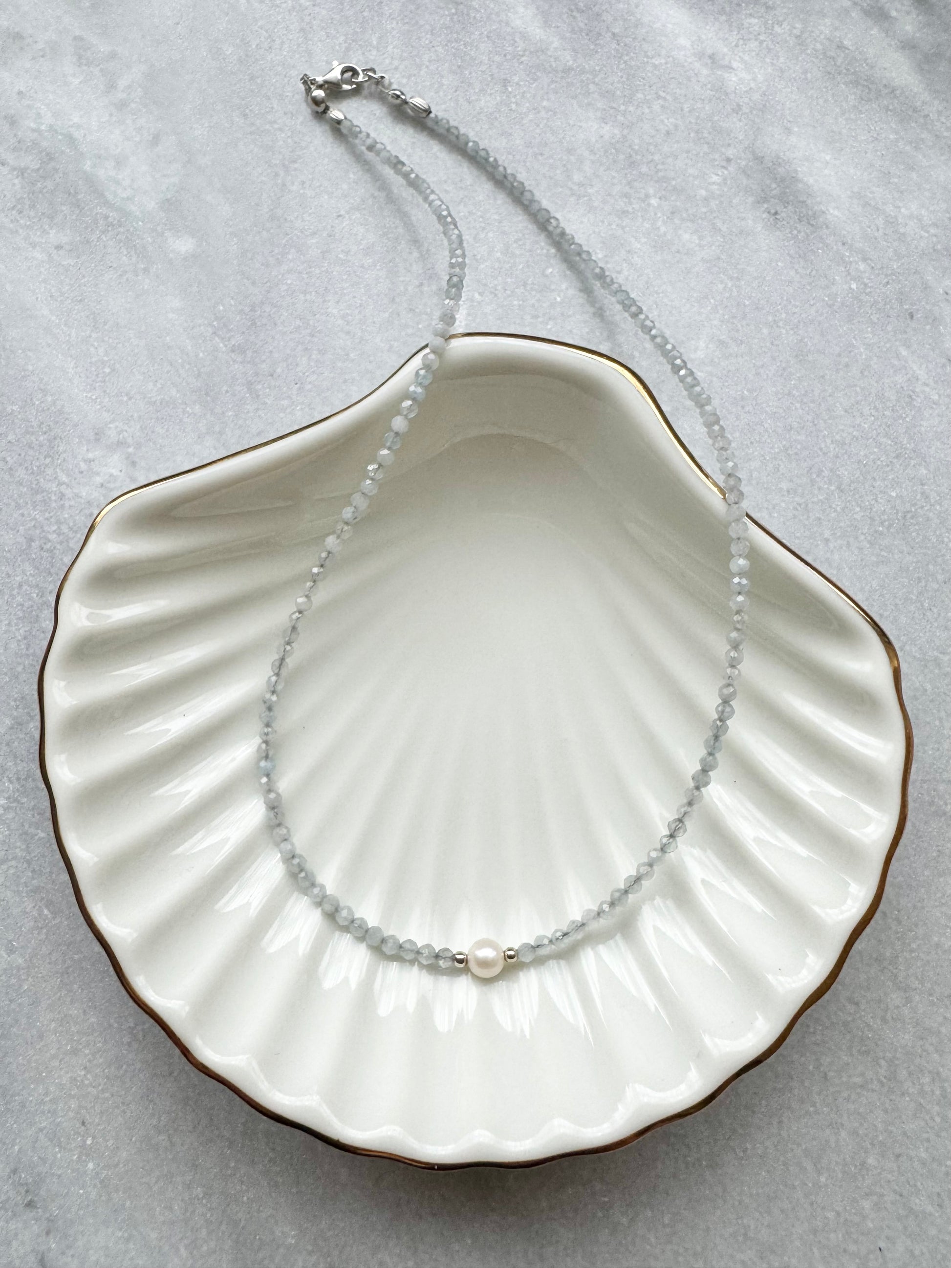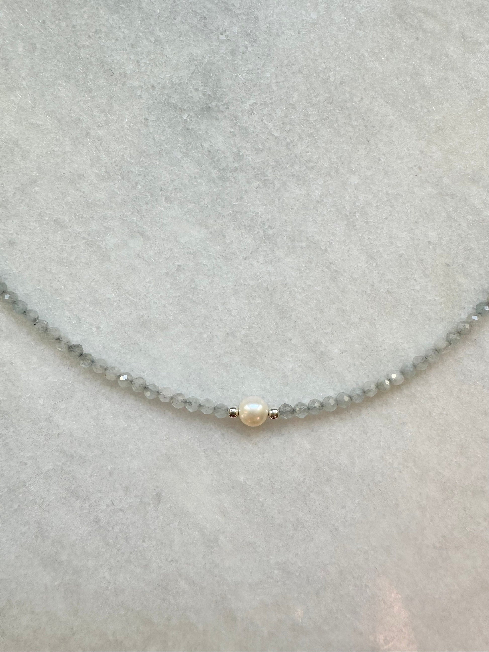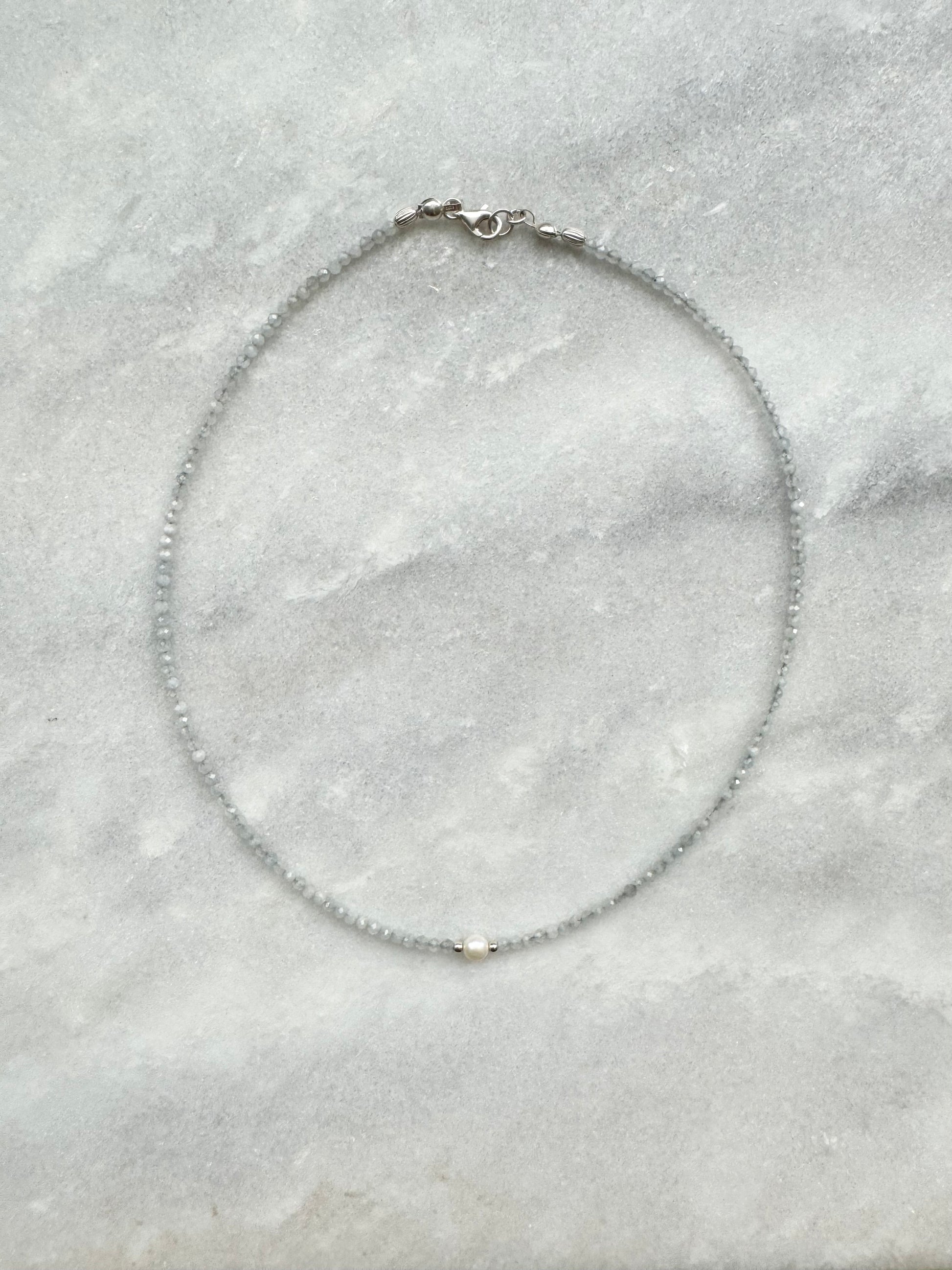 This necklace has been made of faceted aquamarine beads and a tiny freshwater pearl bead finished with a sterling silver lobster clasp