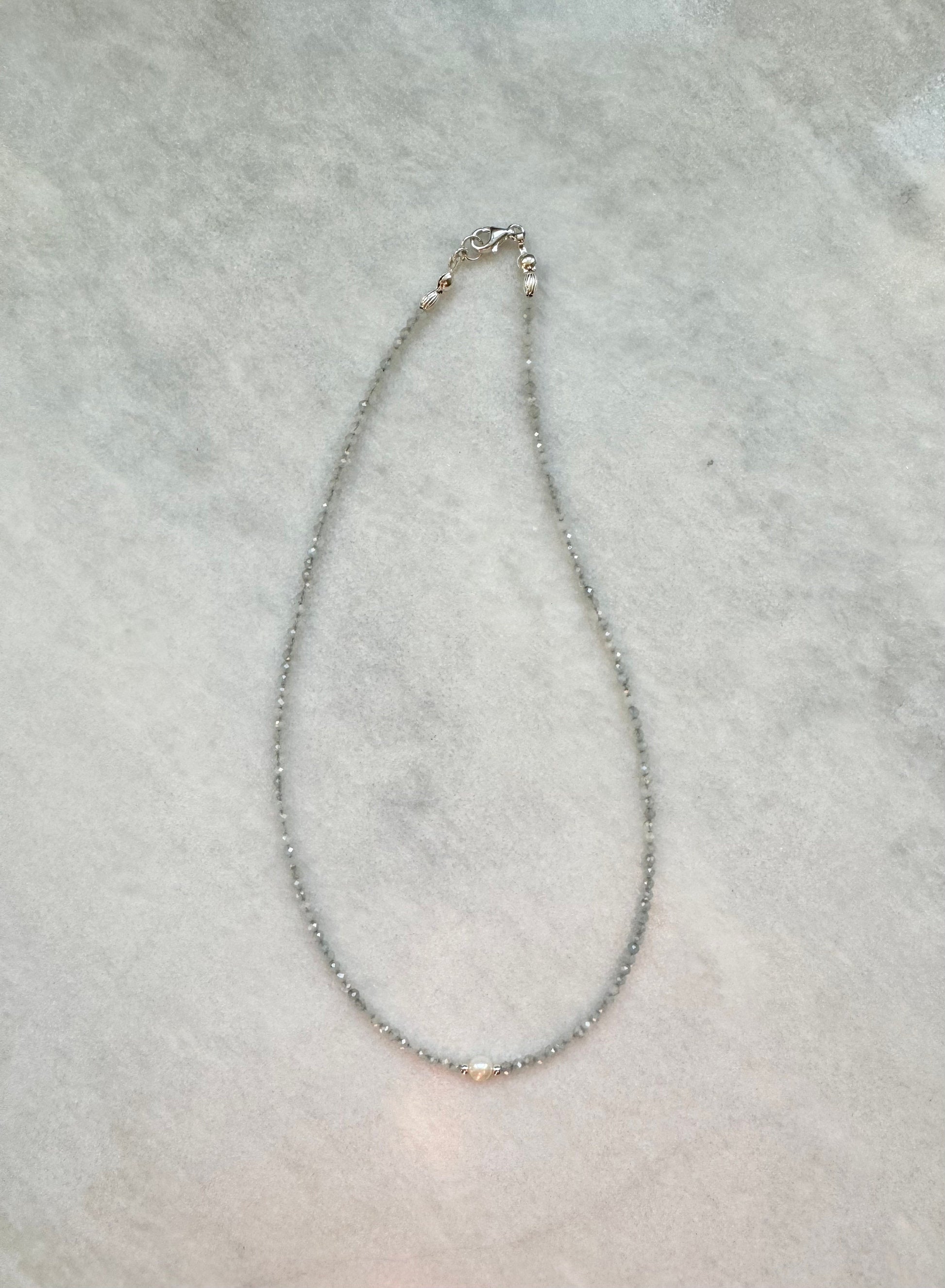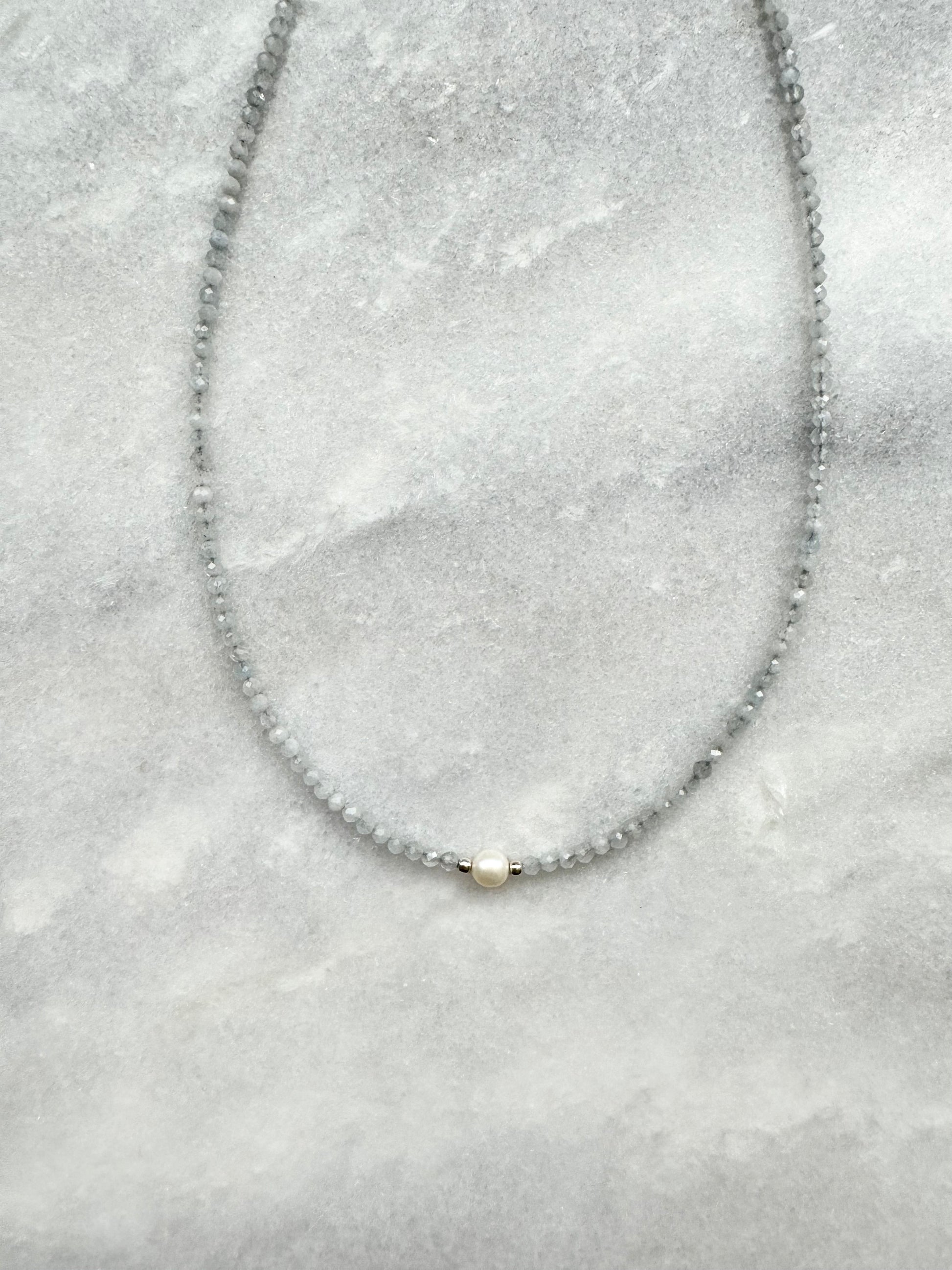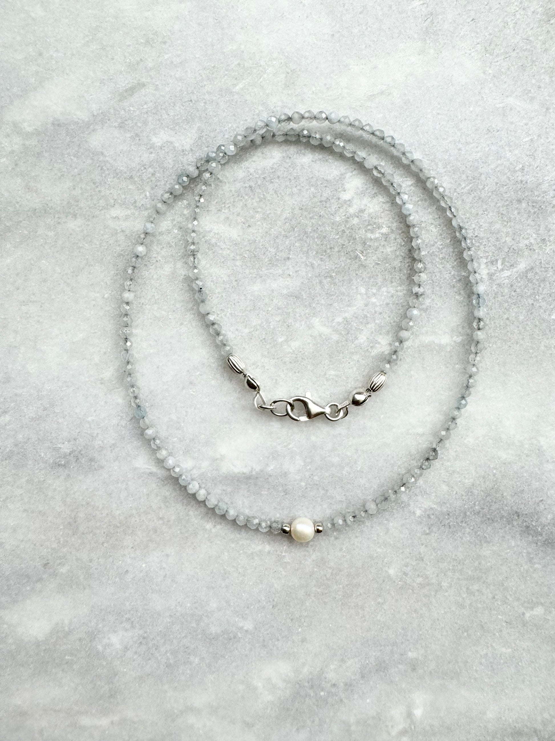This necklace has been made of faceted aquamarine beads and a tiny freshwater pearl bead finished with a sterling silver lobster clasp