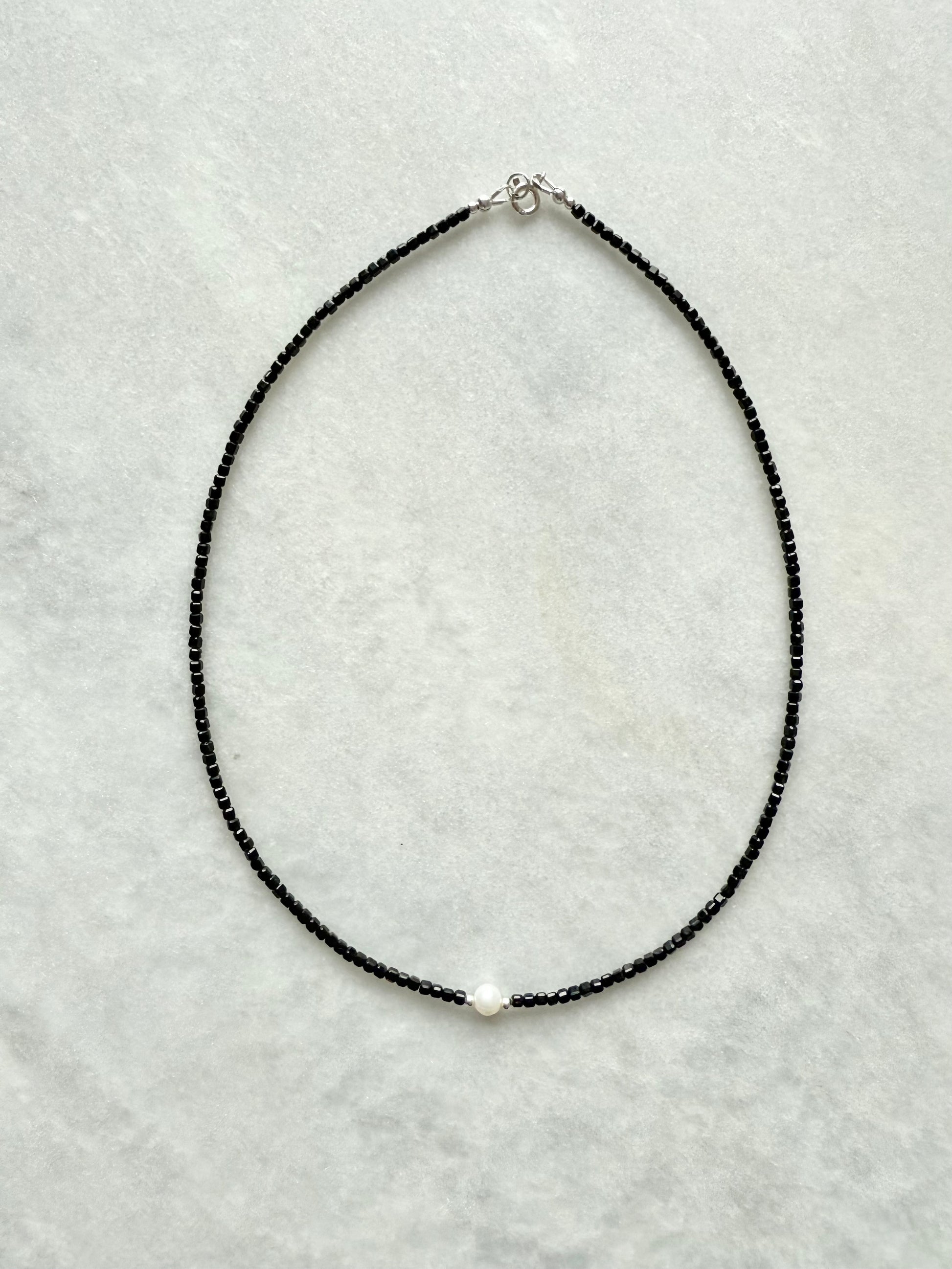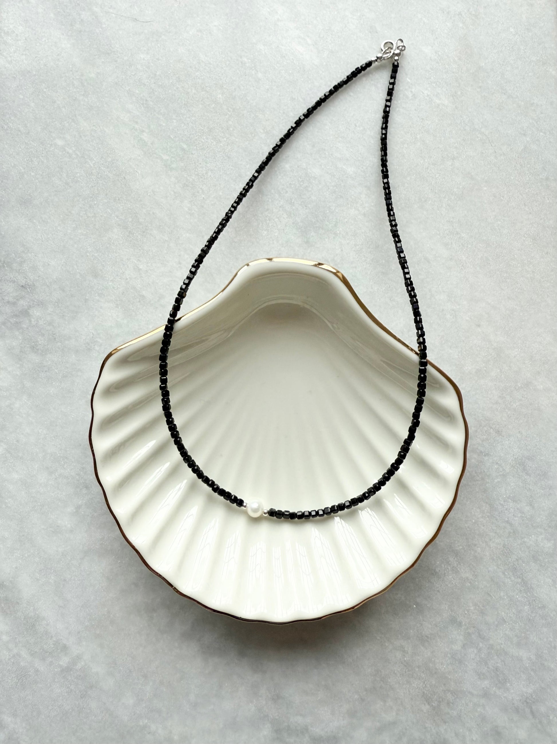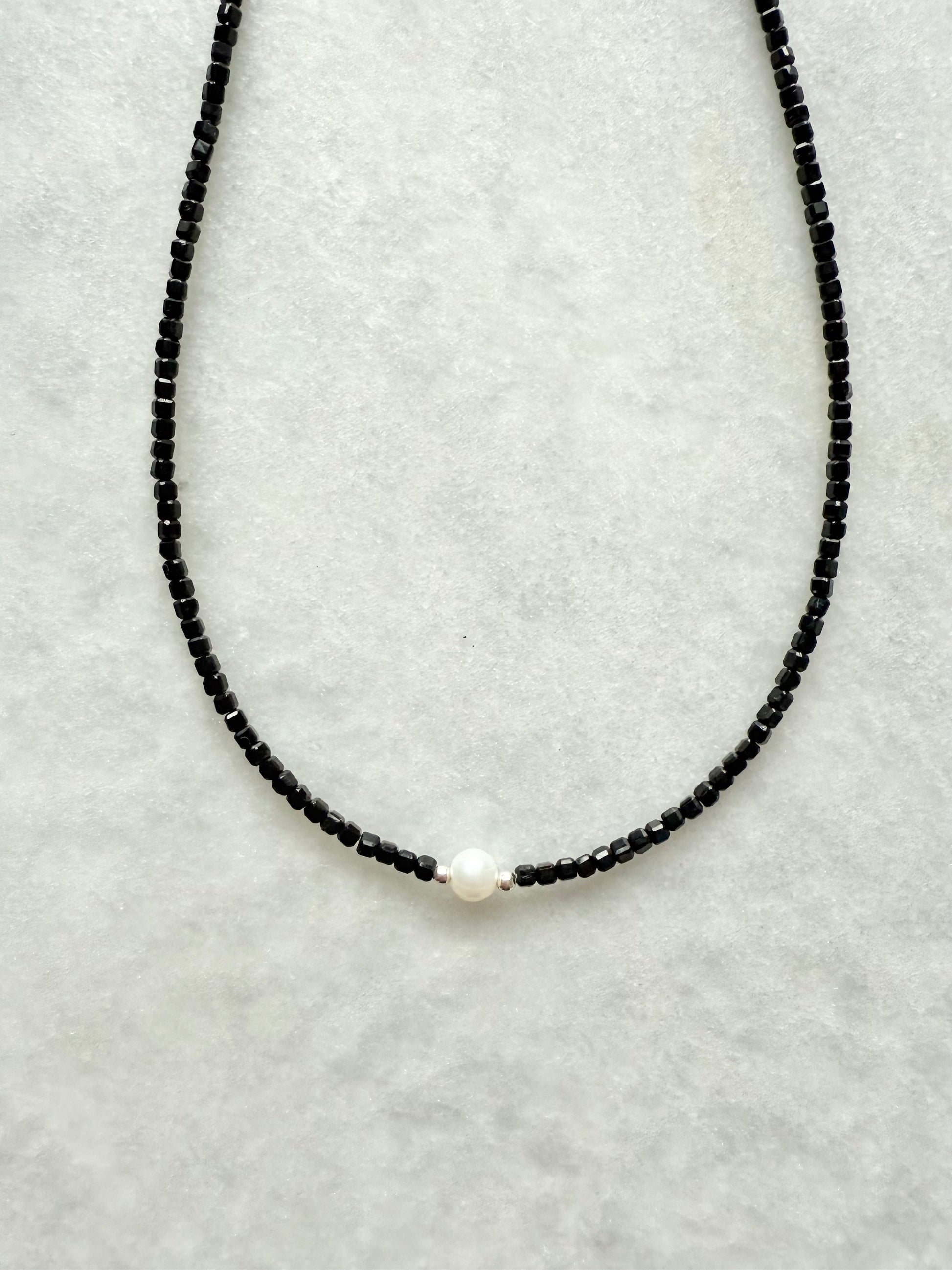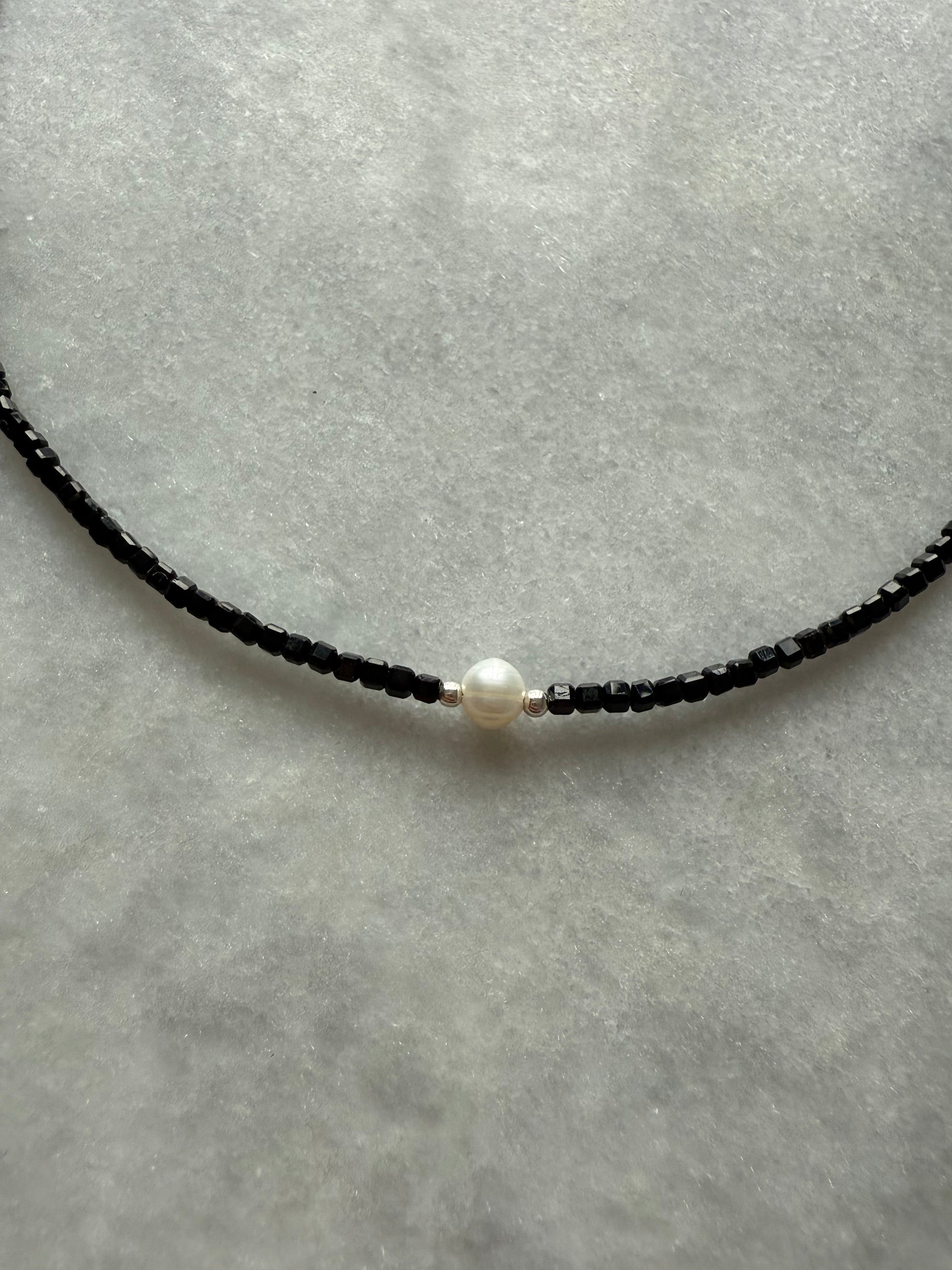 This dainty necklace is made with black Tourmaline cubes and a tiny freshwater pearl, finished with a sterling silver clasp.