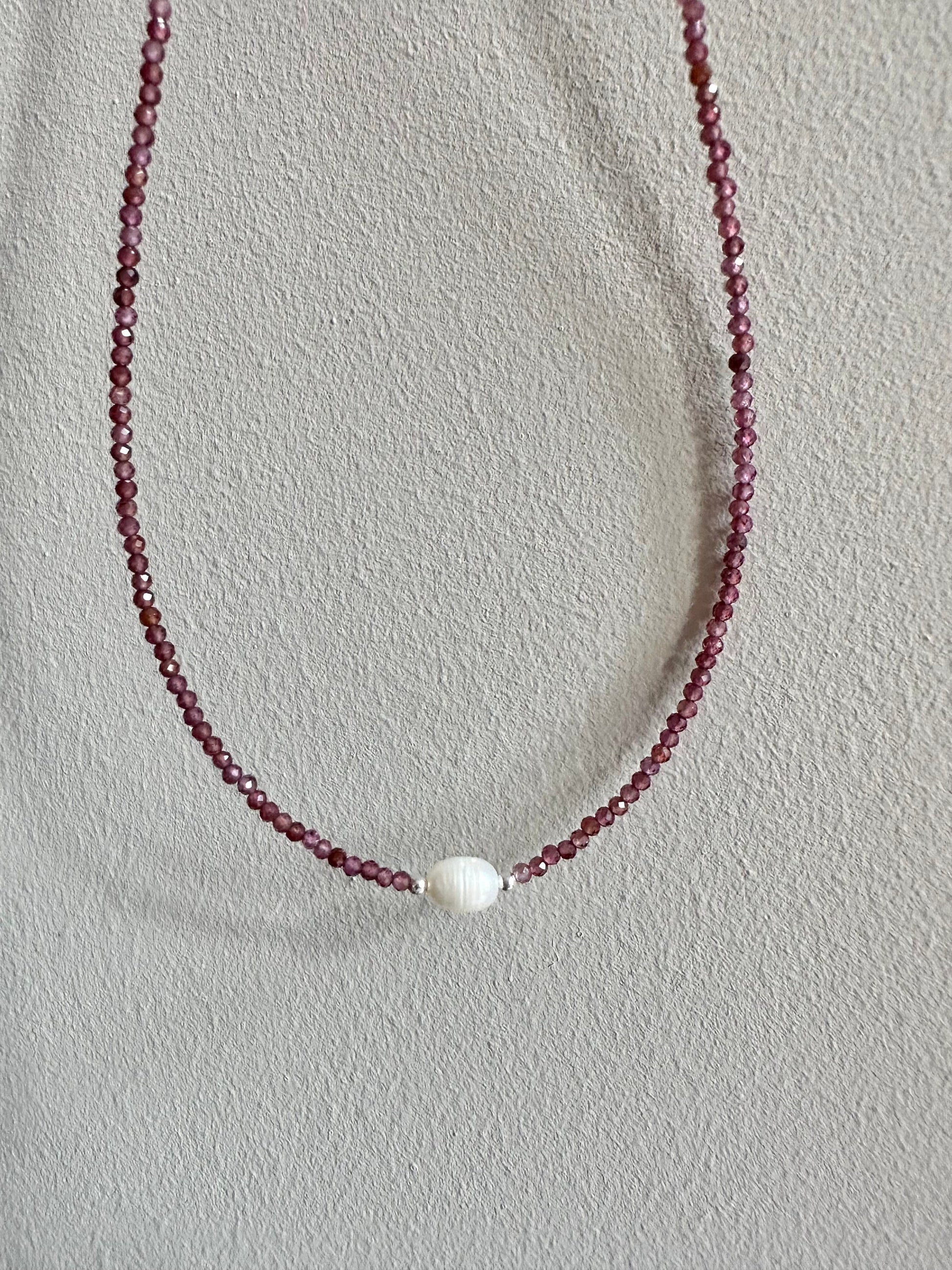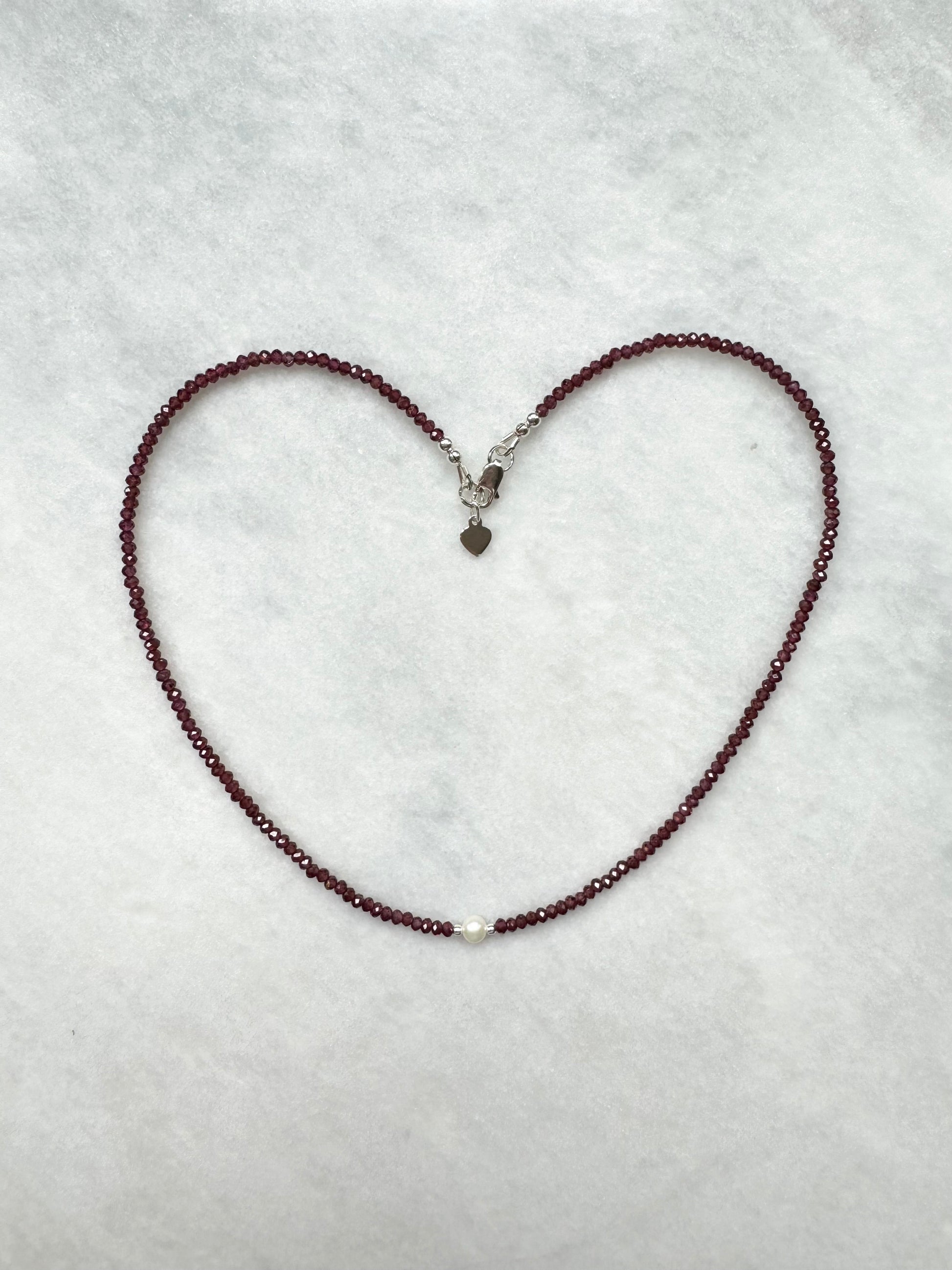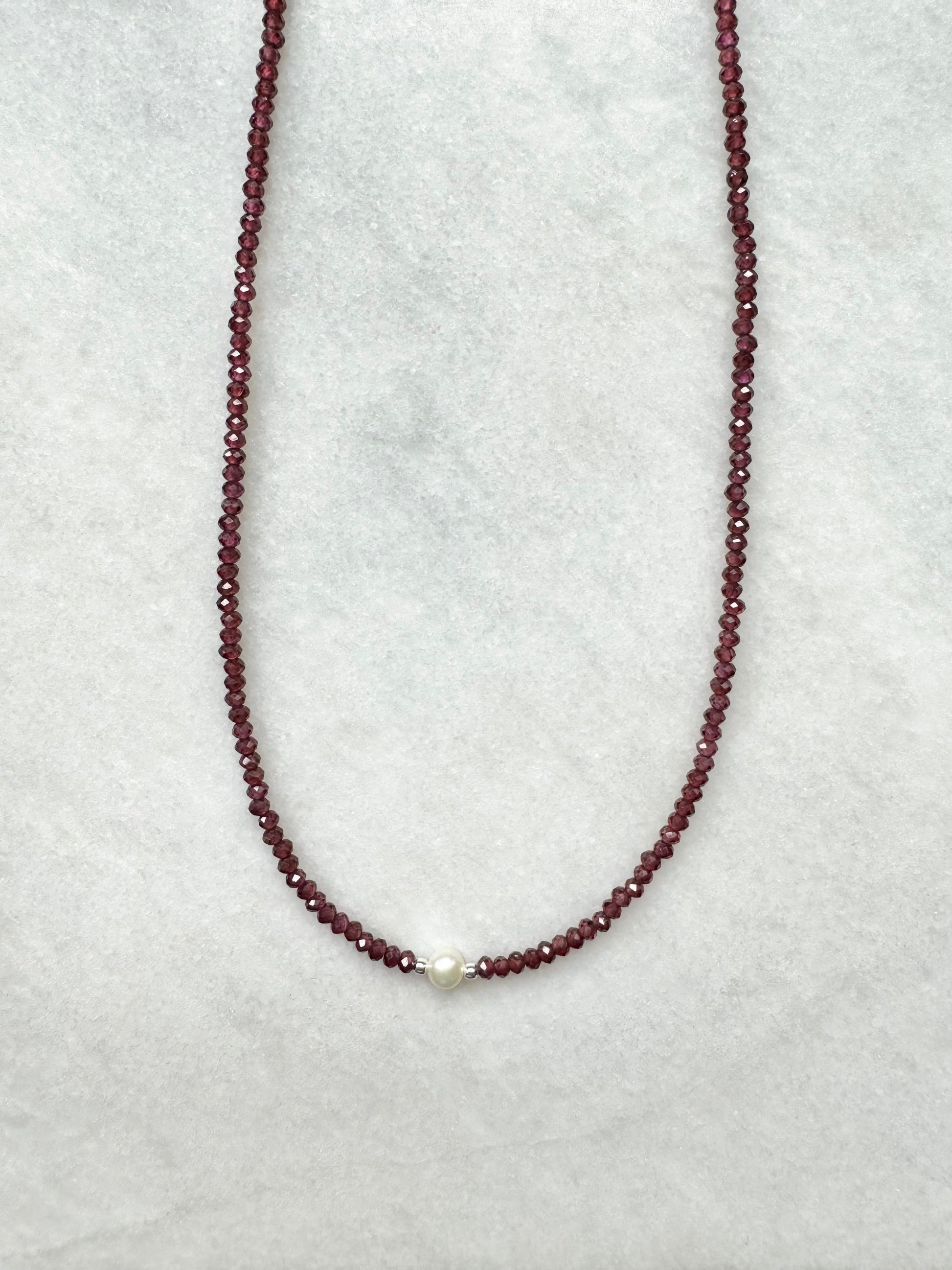 This necklace has been made with faceted garnet beads and a tiny freshwater pearl, finished with a sterling silver lobster clasp