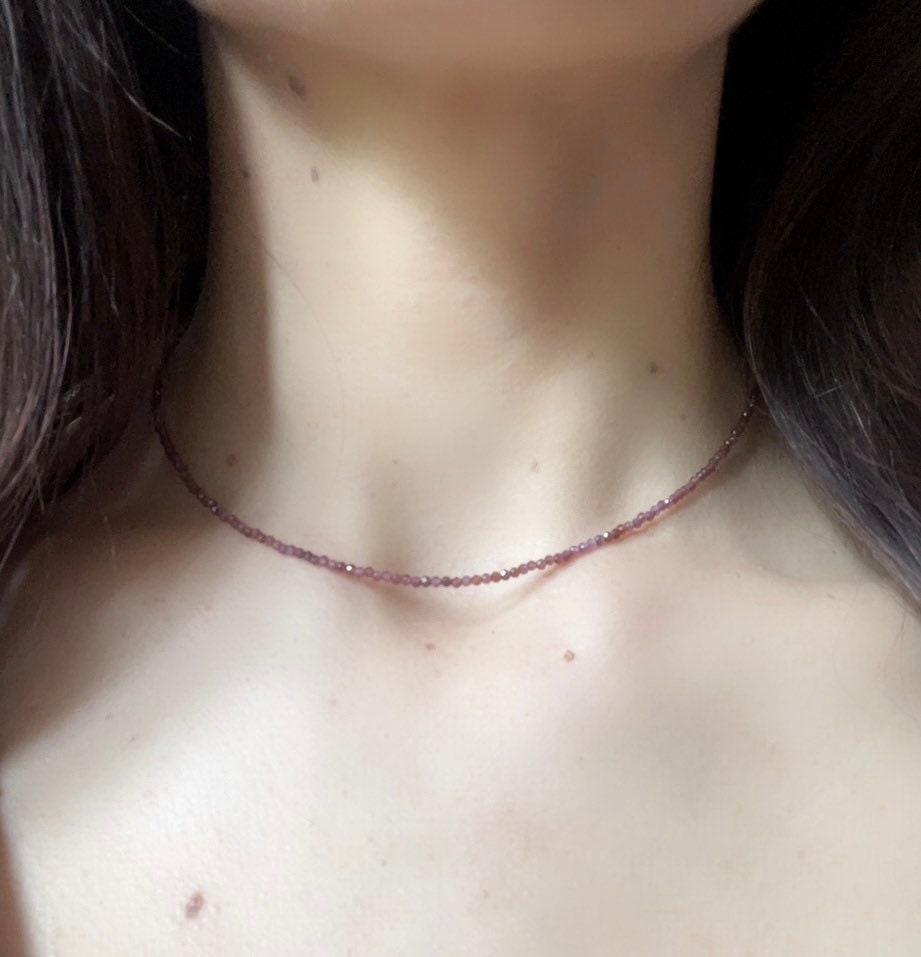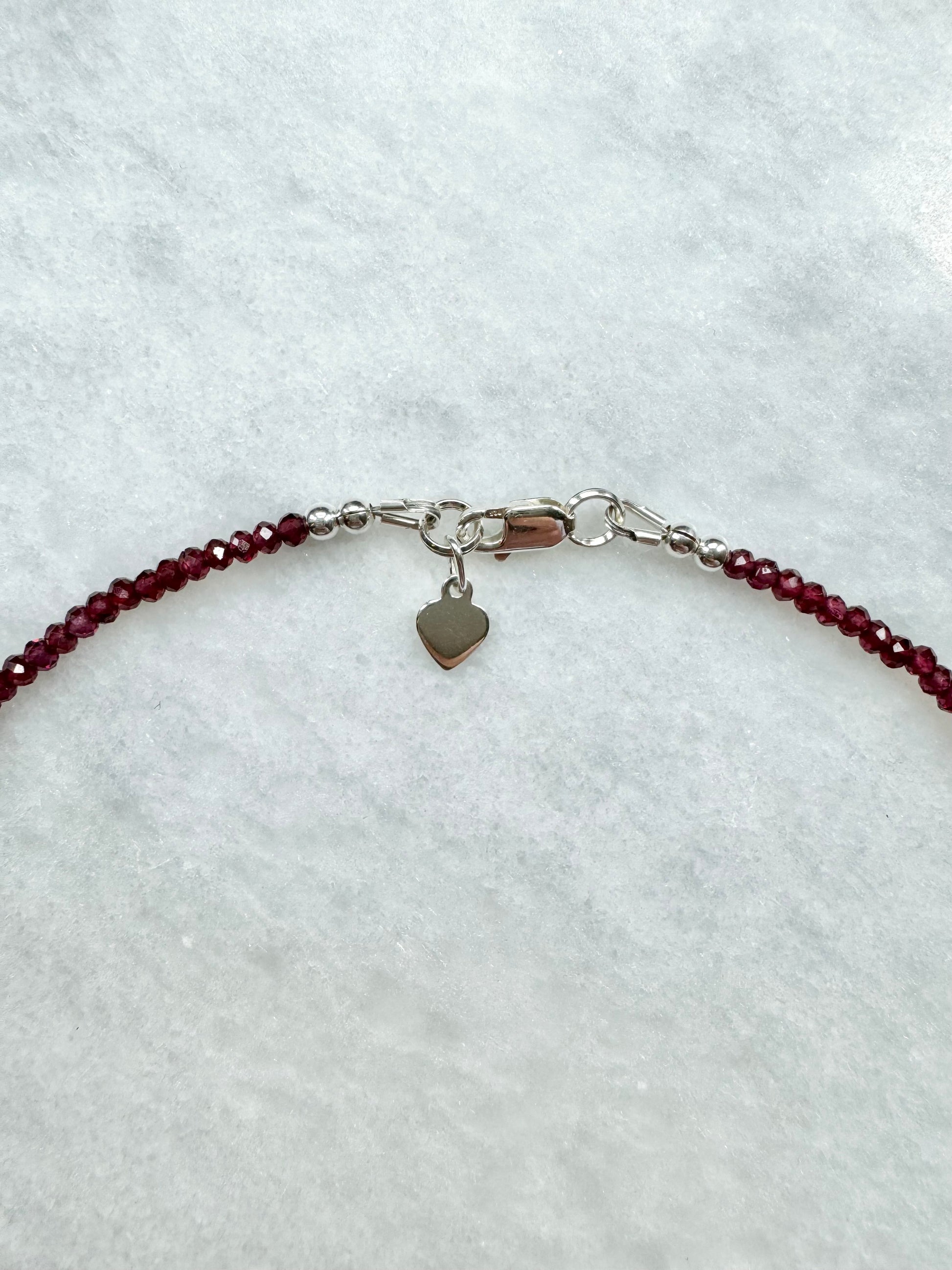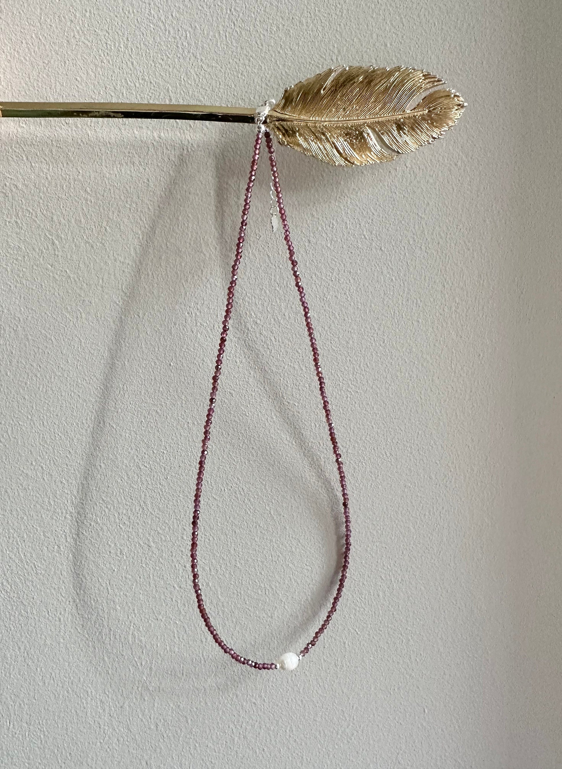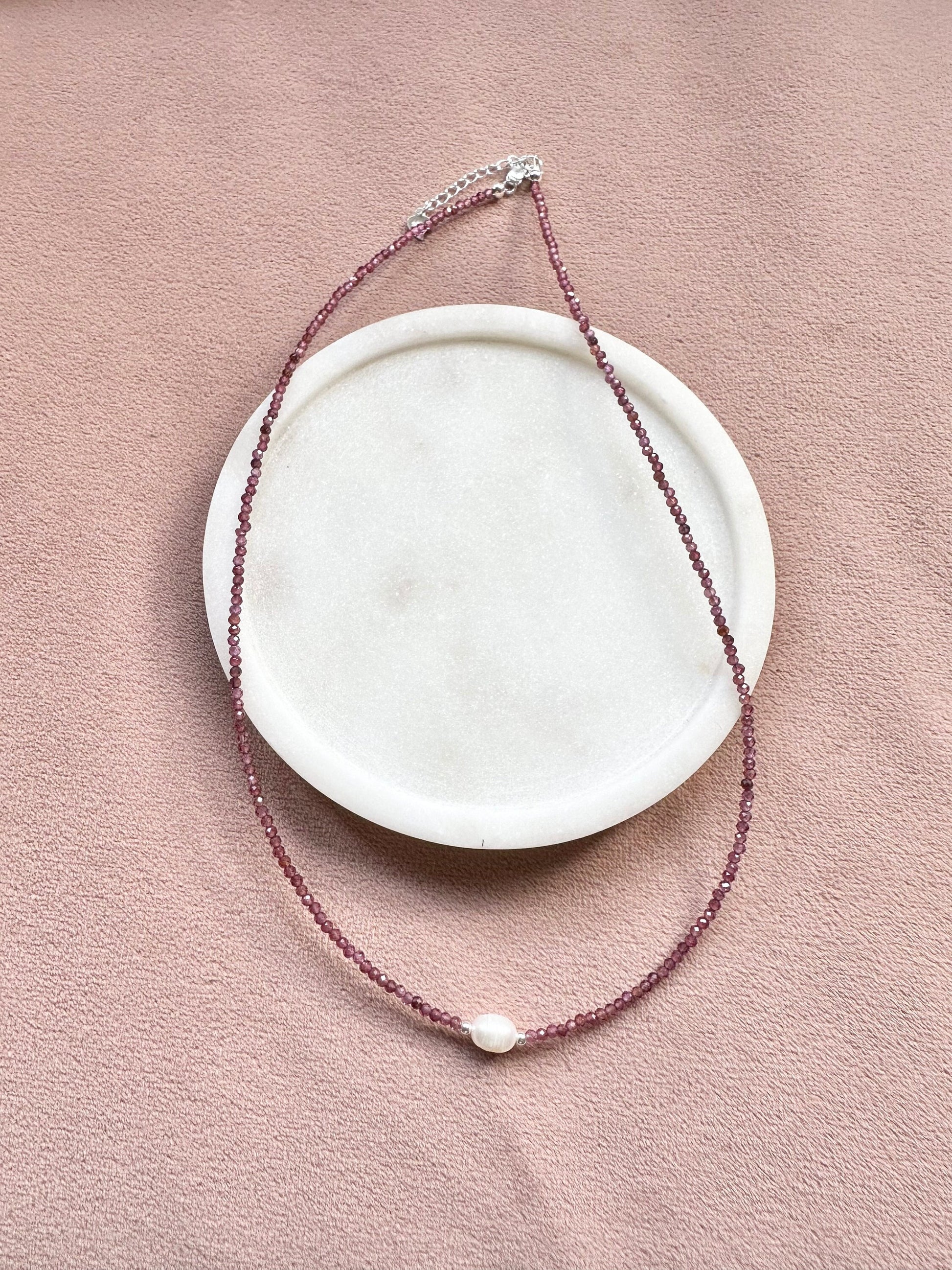 This necklace has been made with faceted garnet beads and a tiny freshwater pearl, finished with a sterling silver lobster clasp