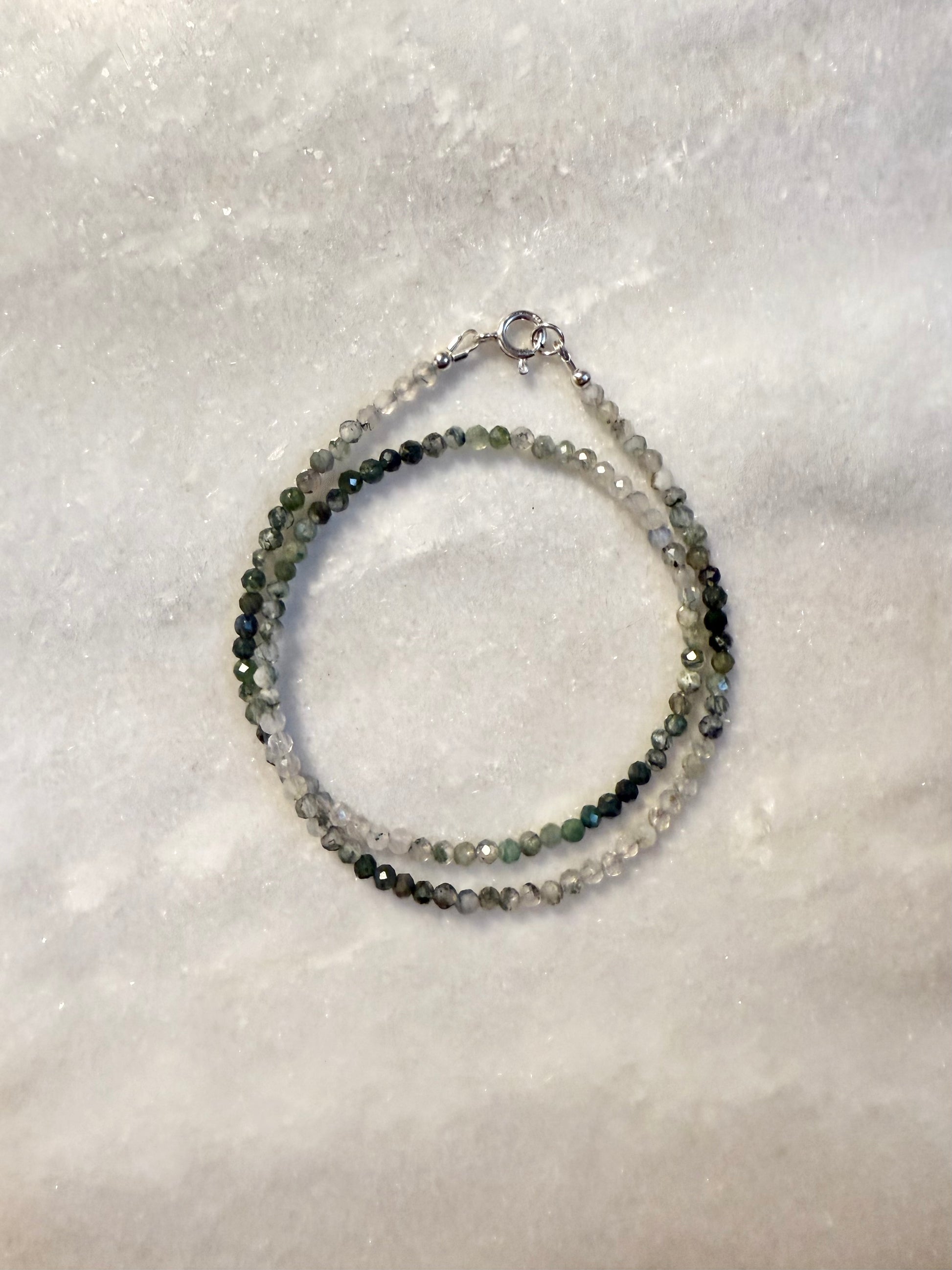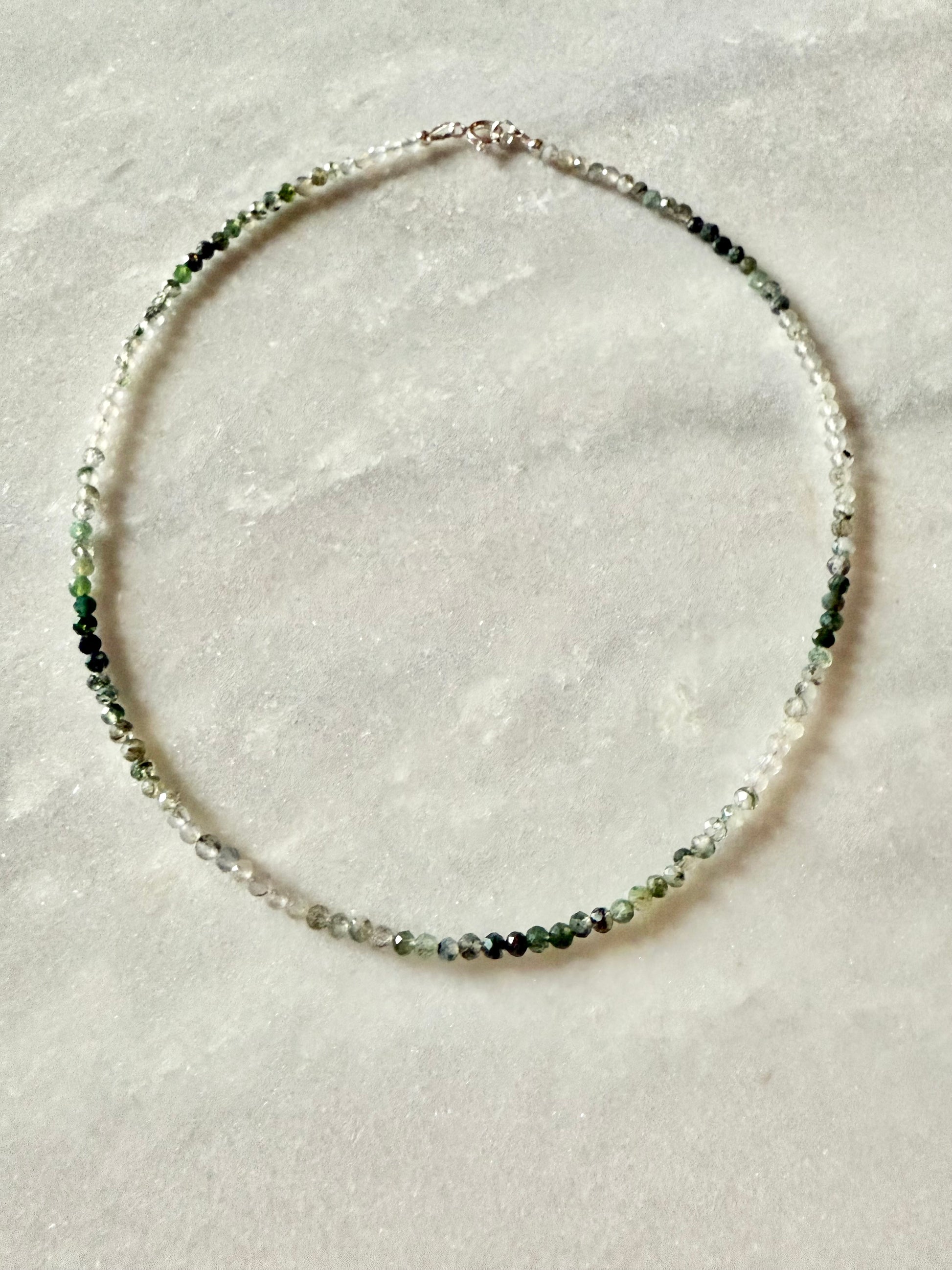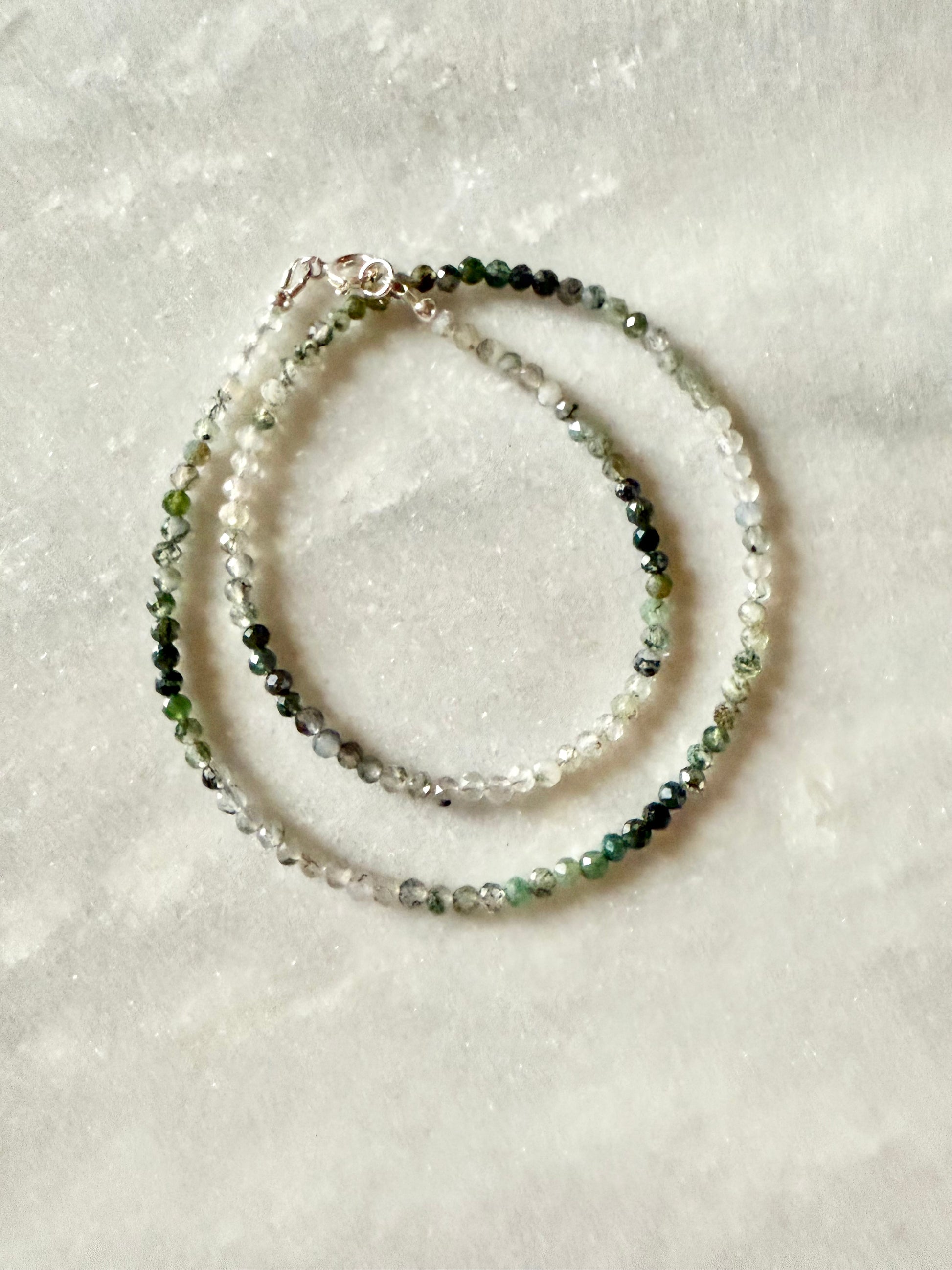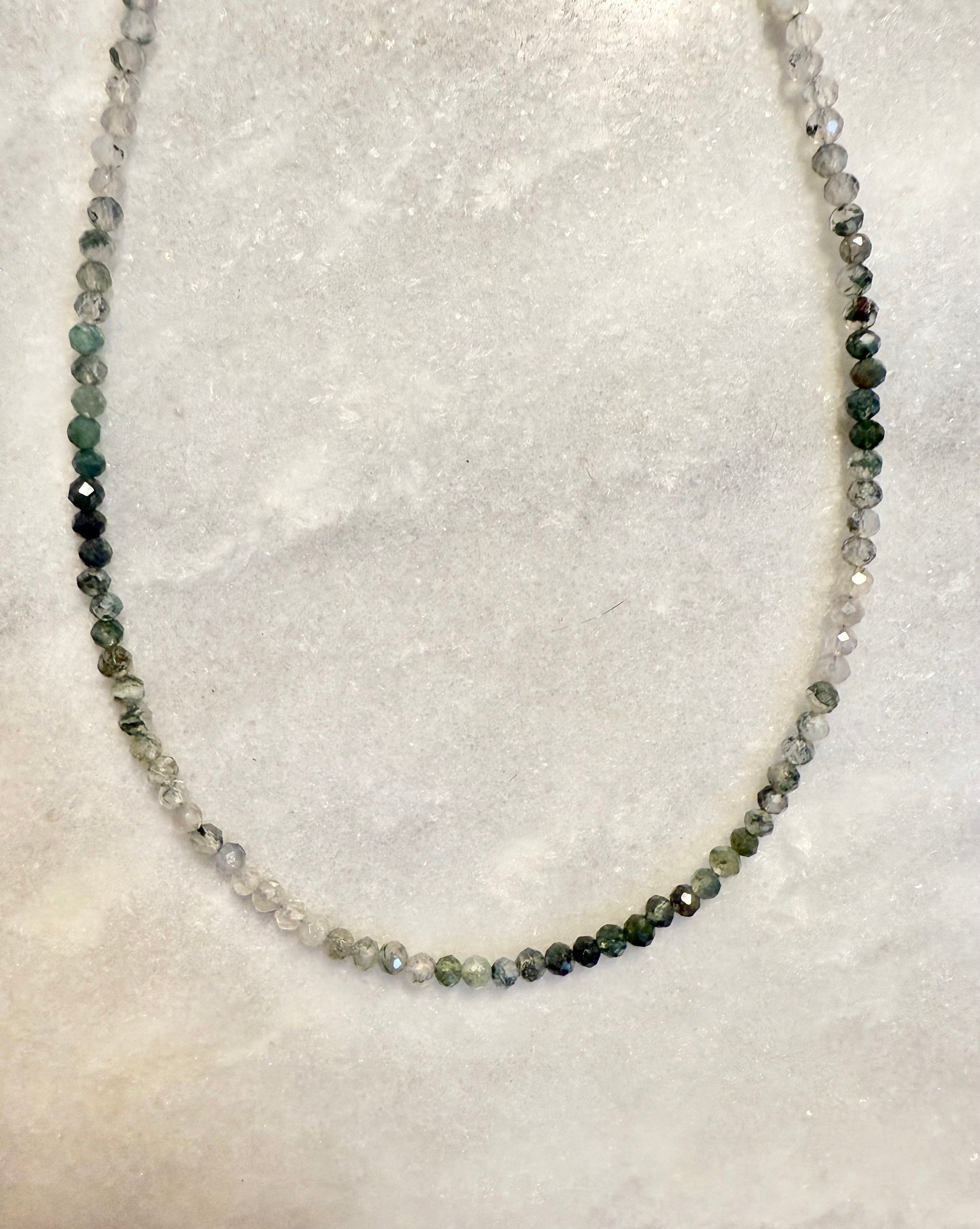 This necklace is made of faceted moss agate beads and finished with a sterling silver lobster clasp.