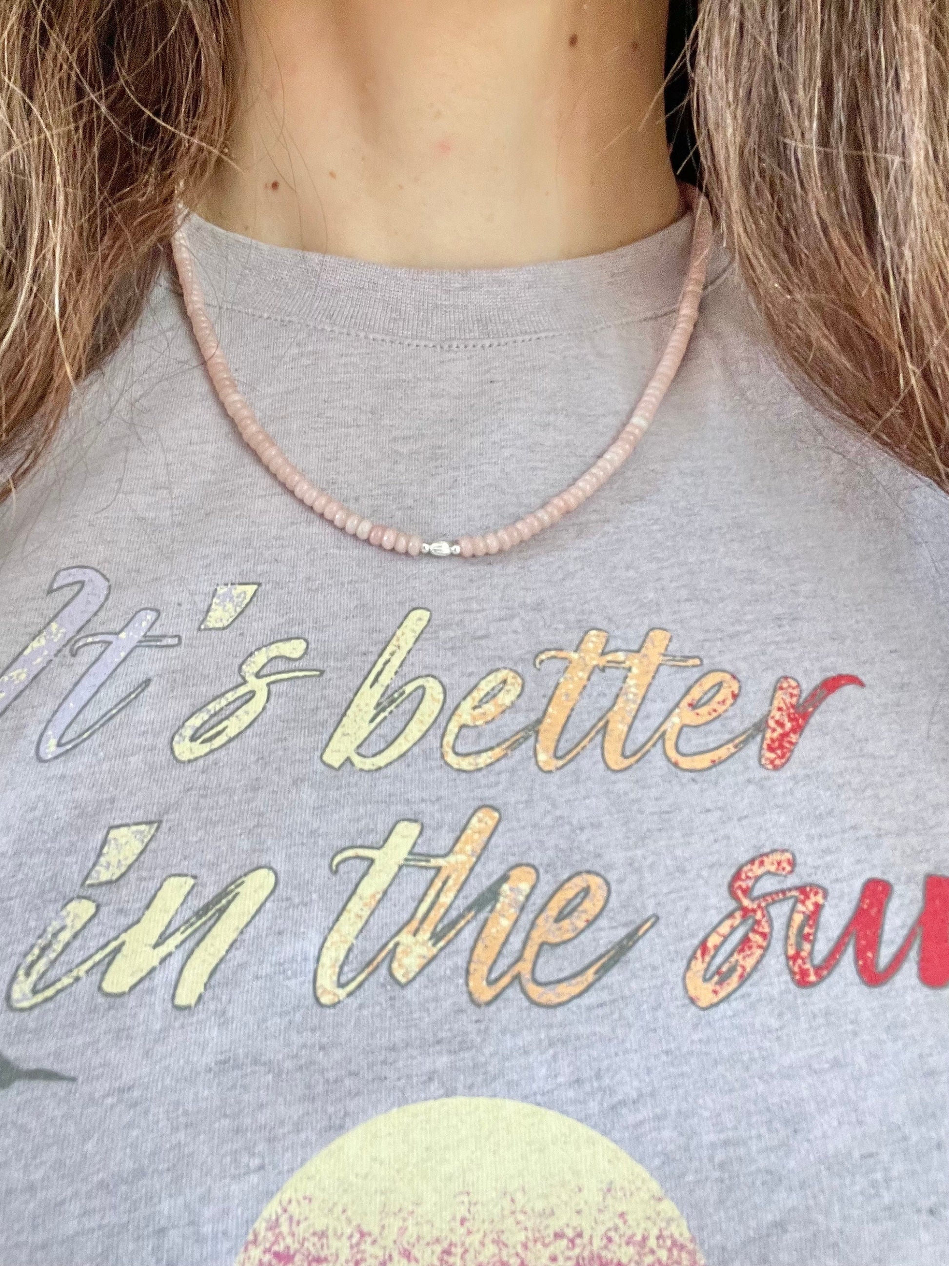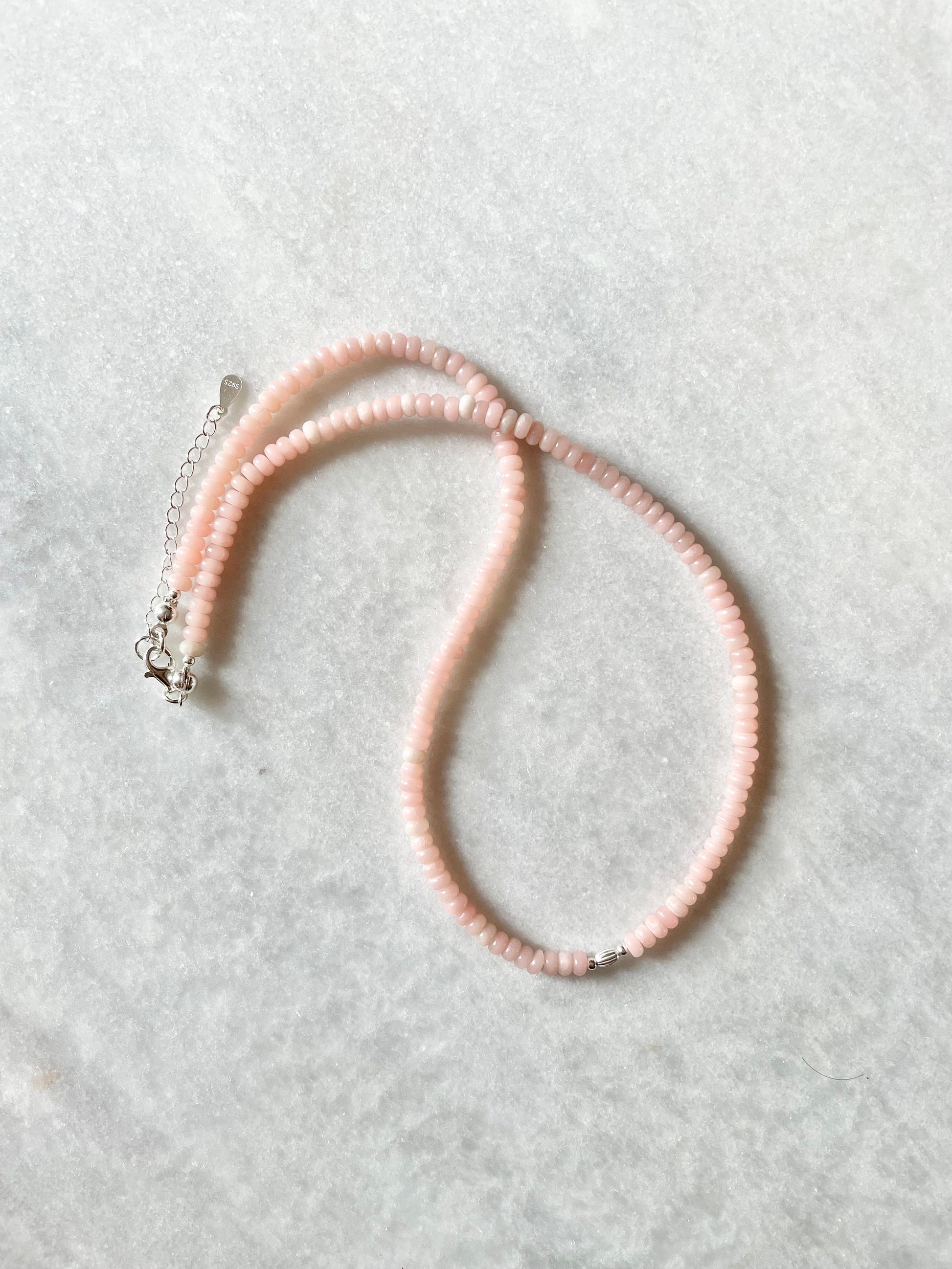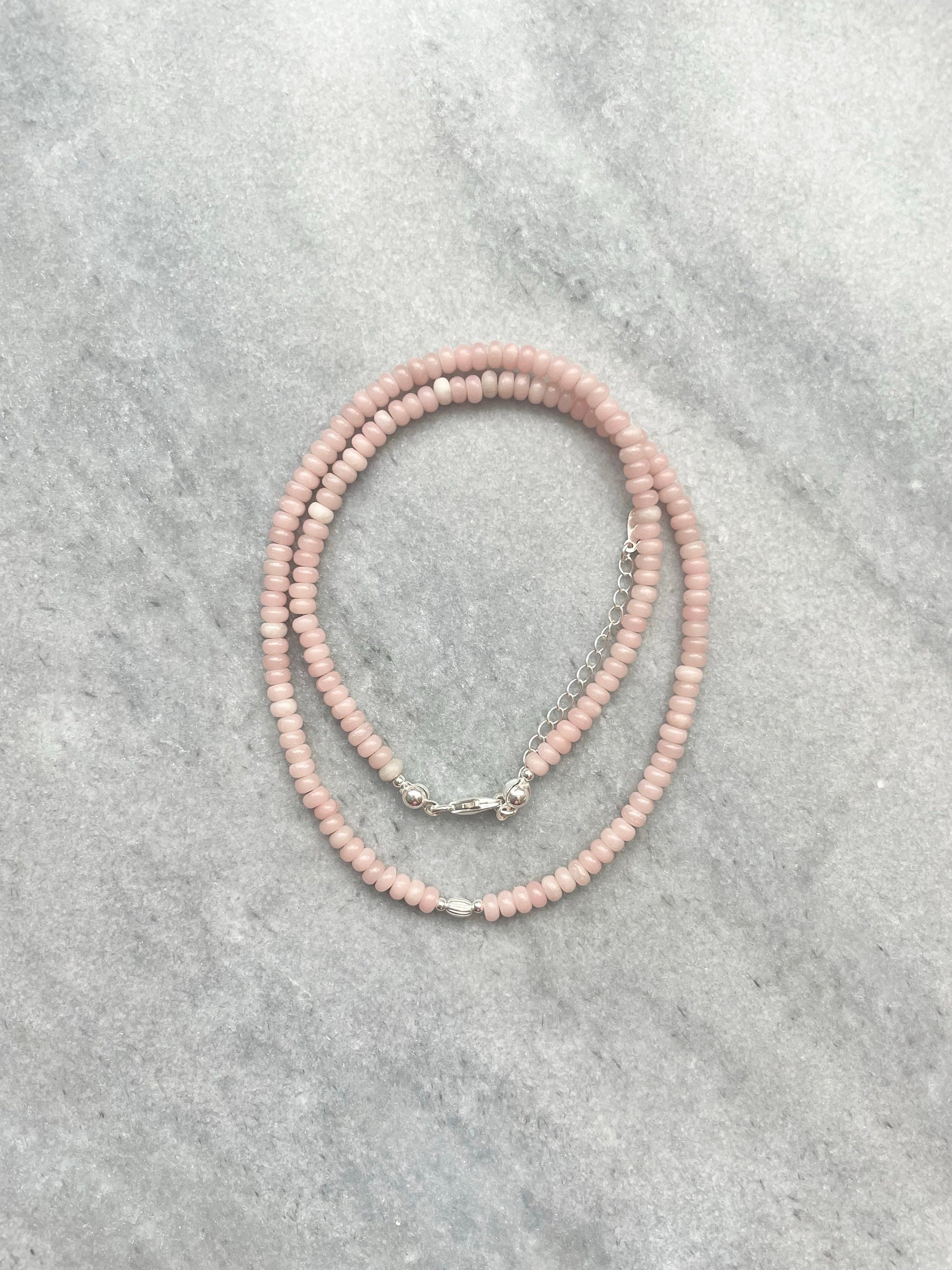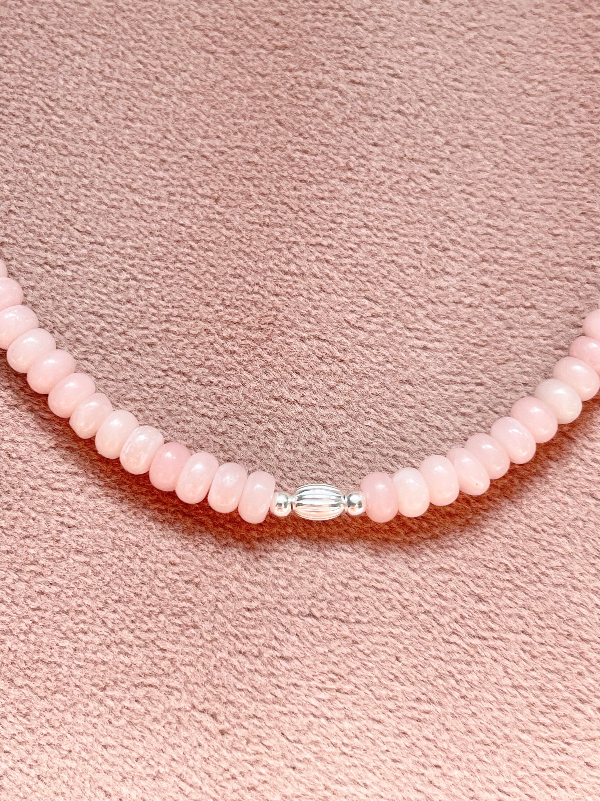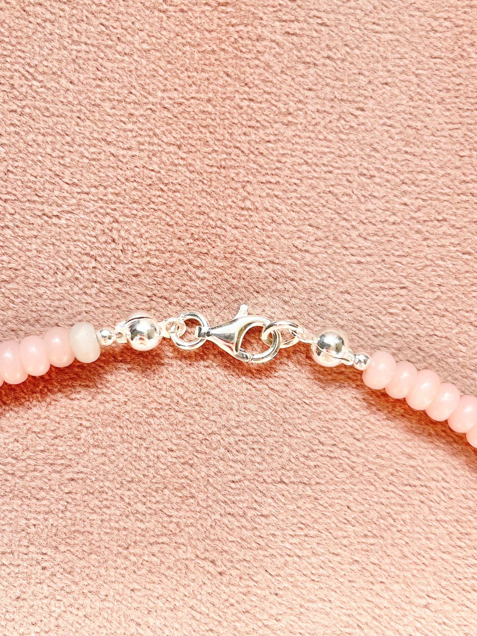 This necklace has been made of pink opal rondelles and finished with a sterling silver tiny oval charm and lobster clasp.