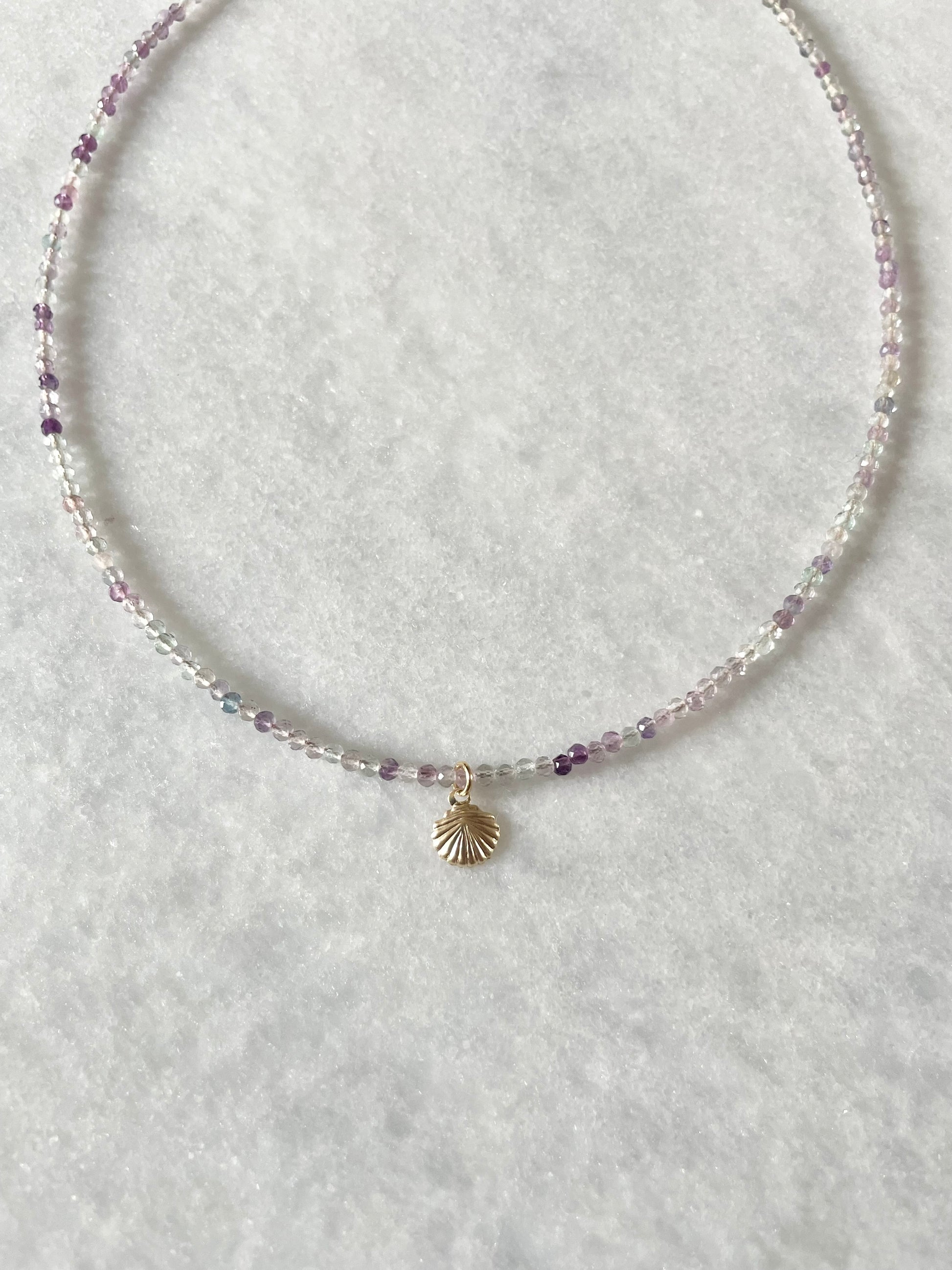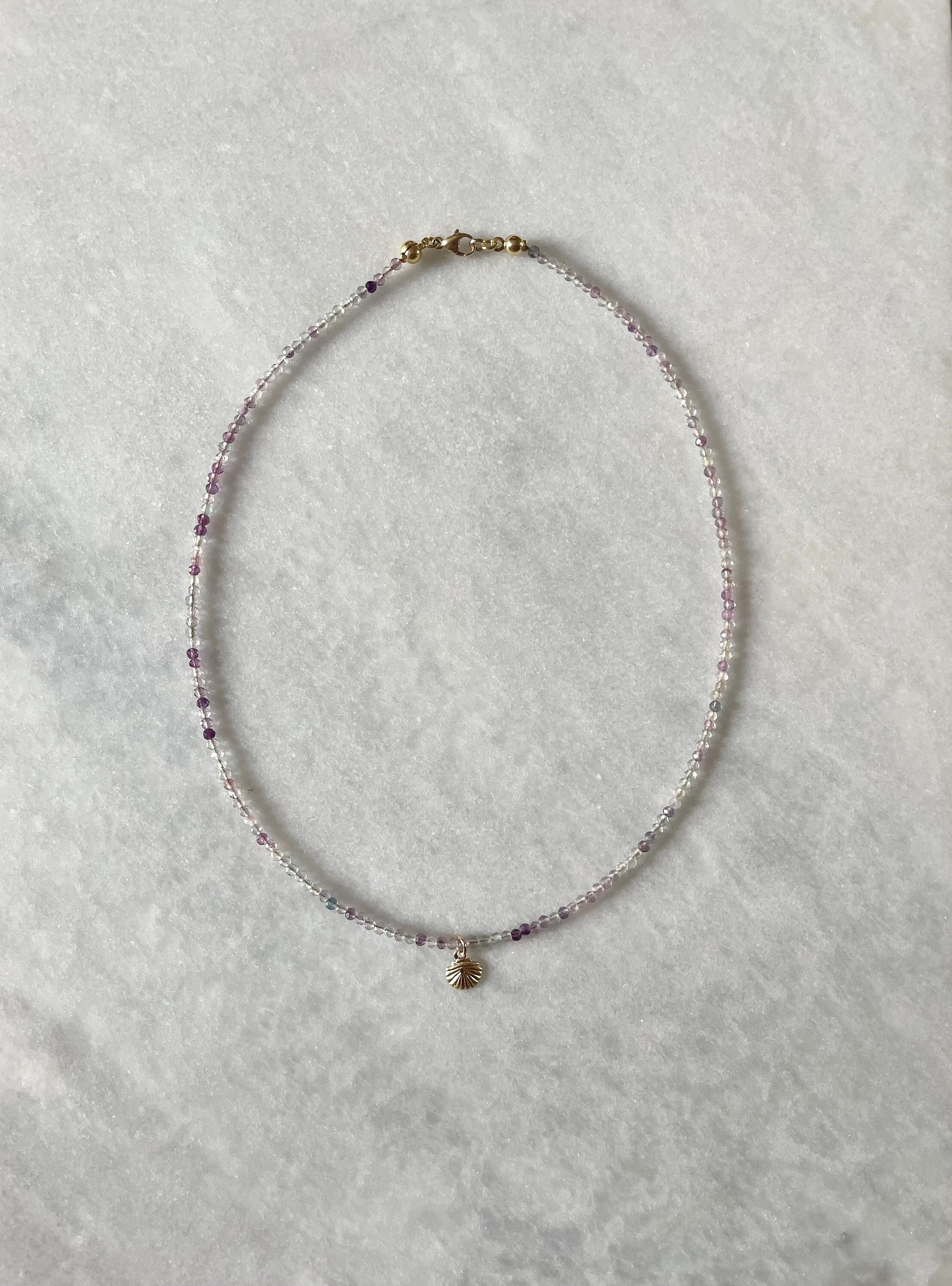 This delicate necklace is made with faceted fluorite beads and finished with a tiny gold filled shell pendant.