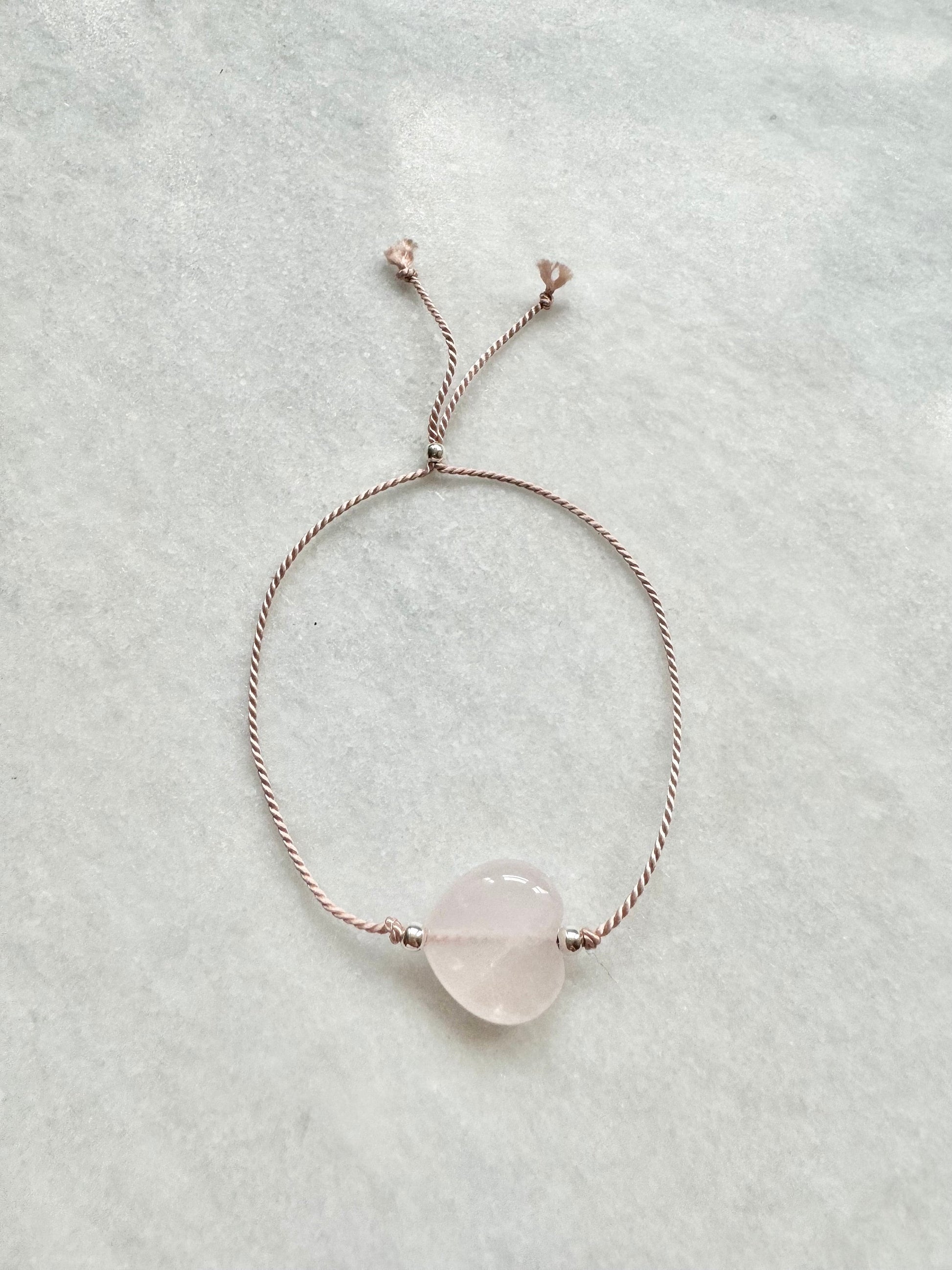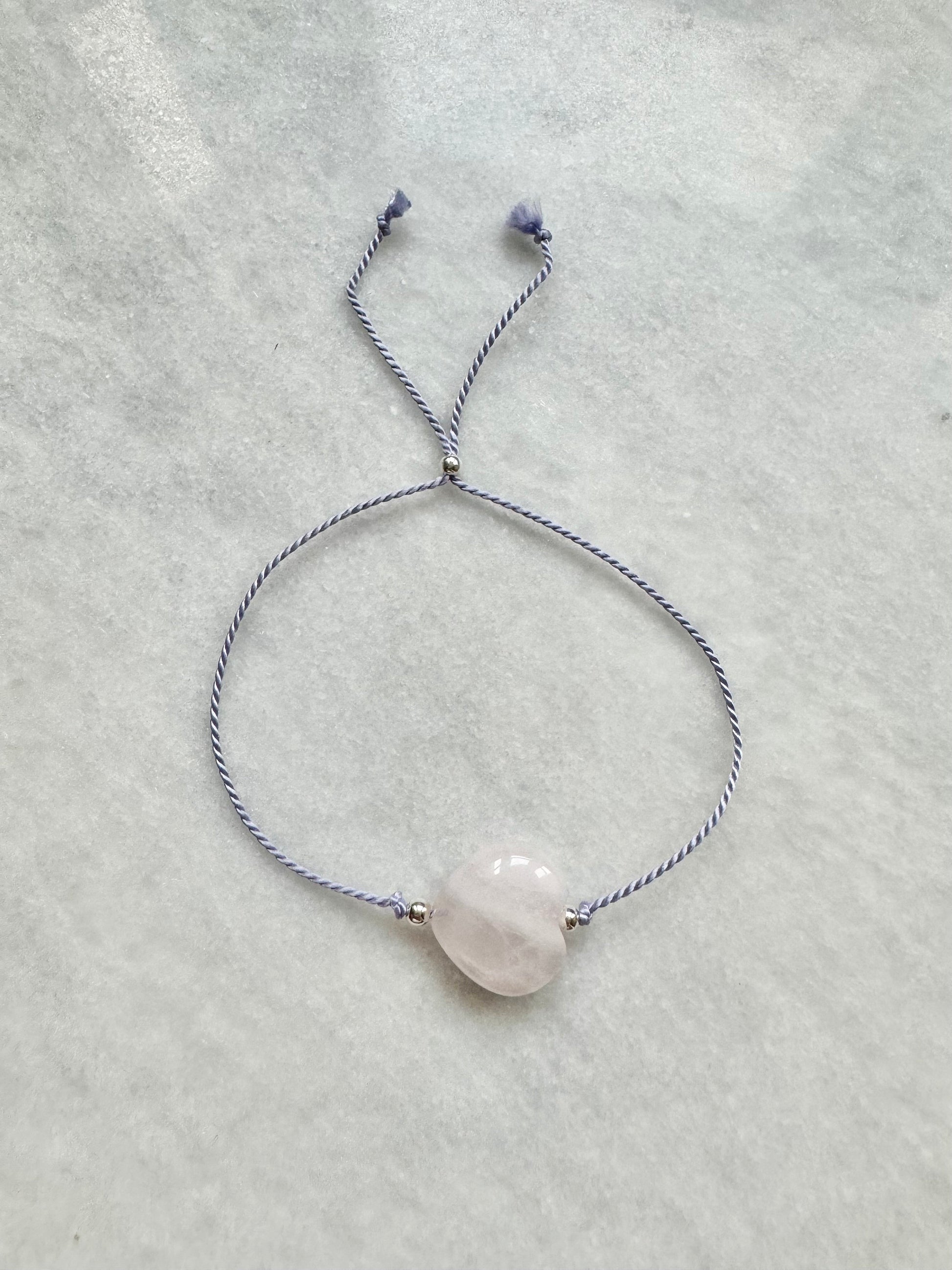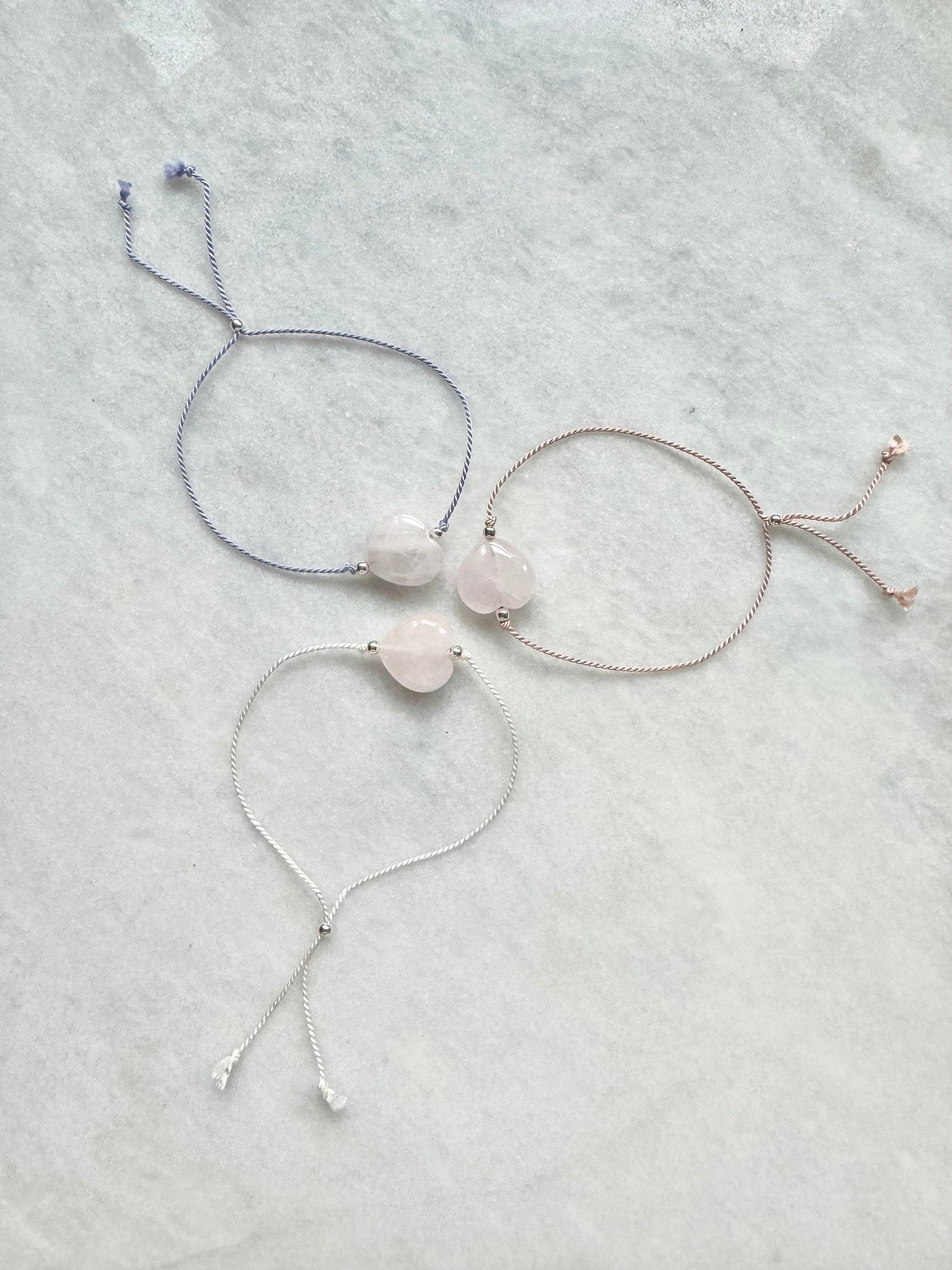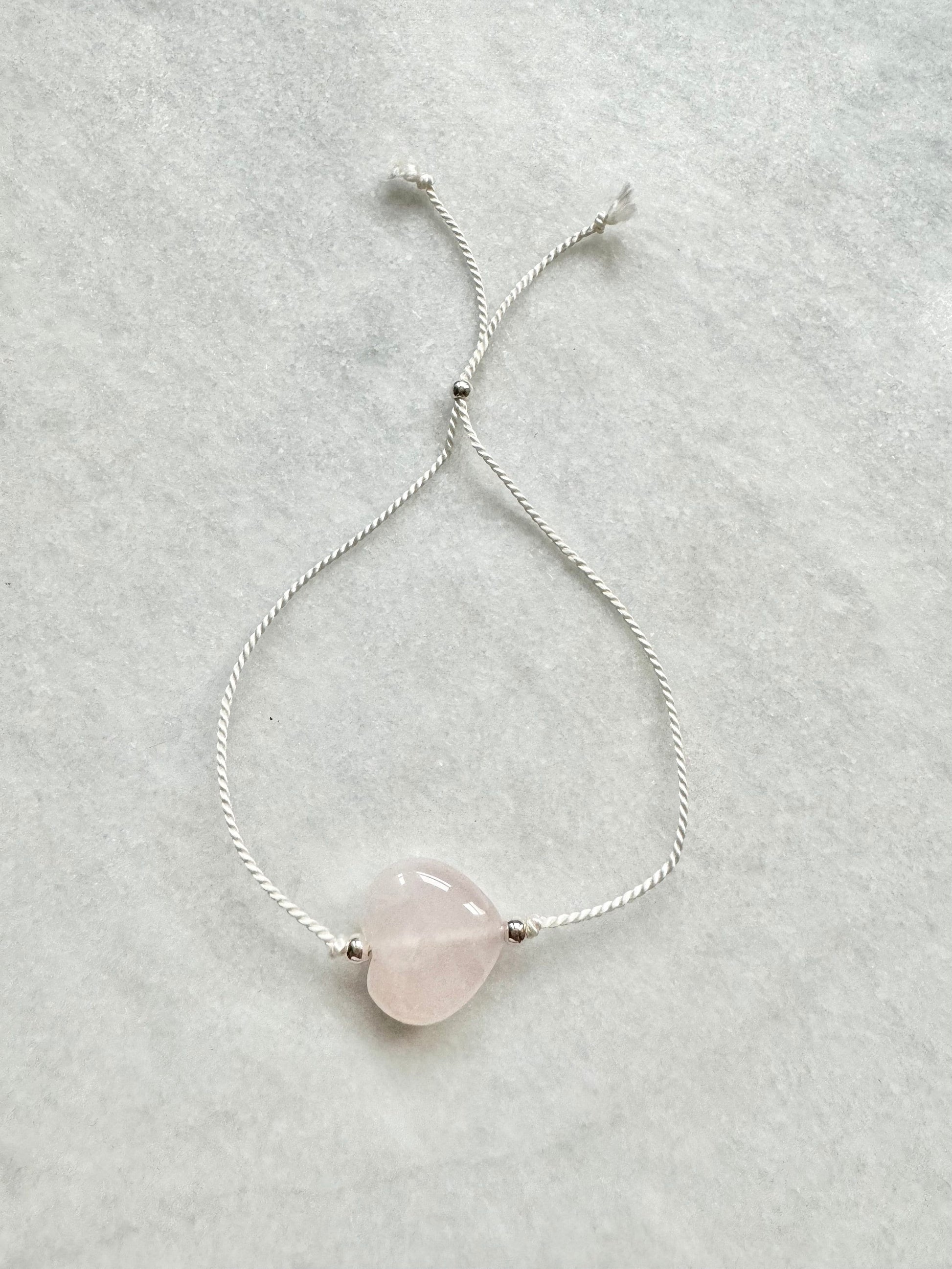 Adjustable silk thread bracelet with a rose quartz heart and sterling silver finish.