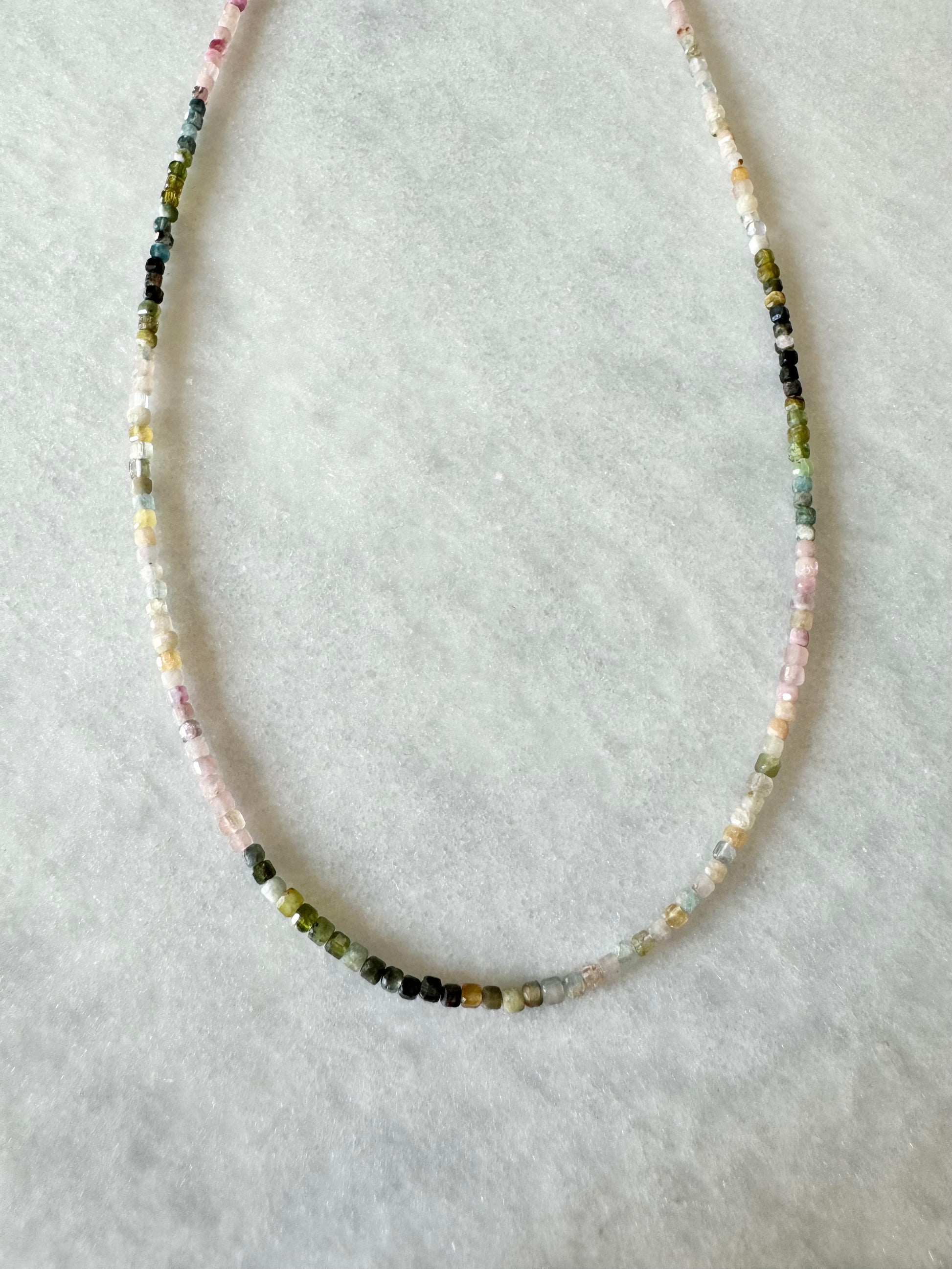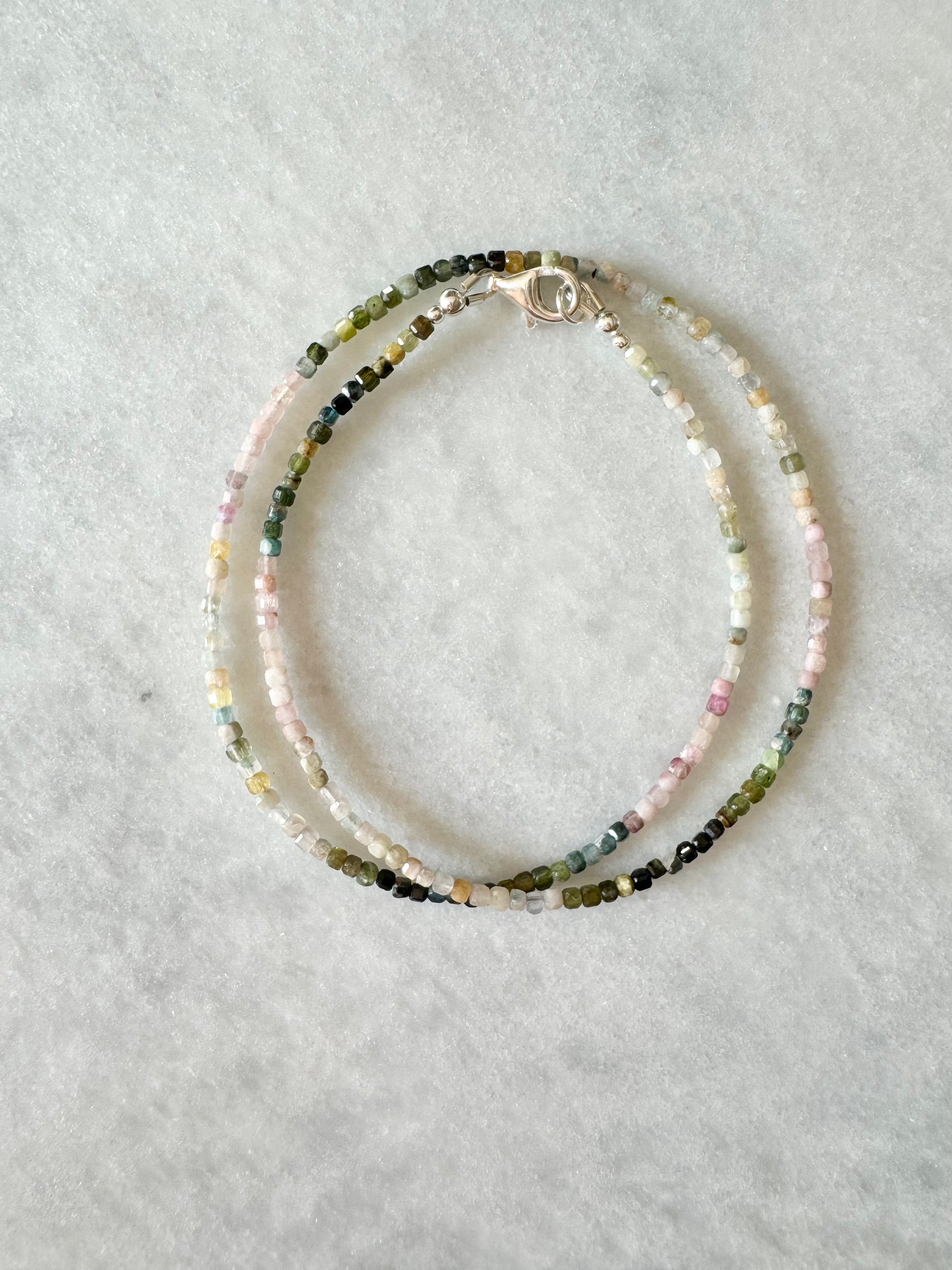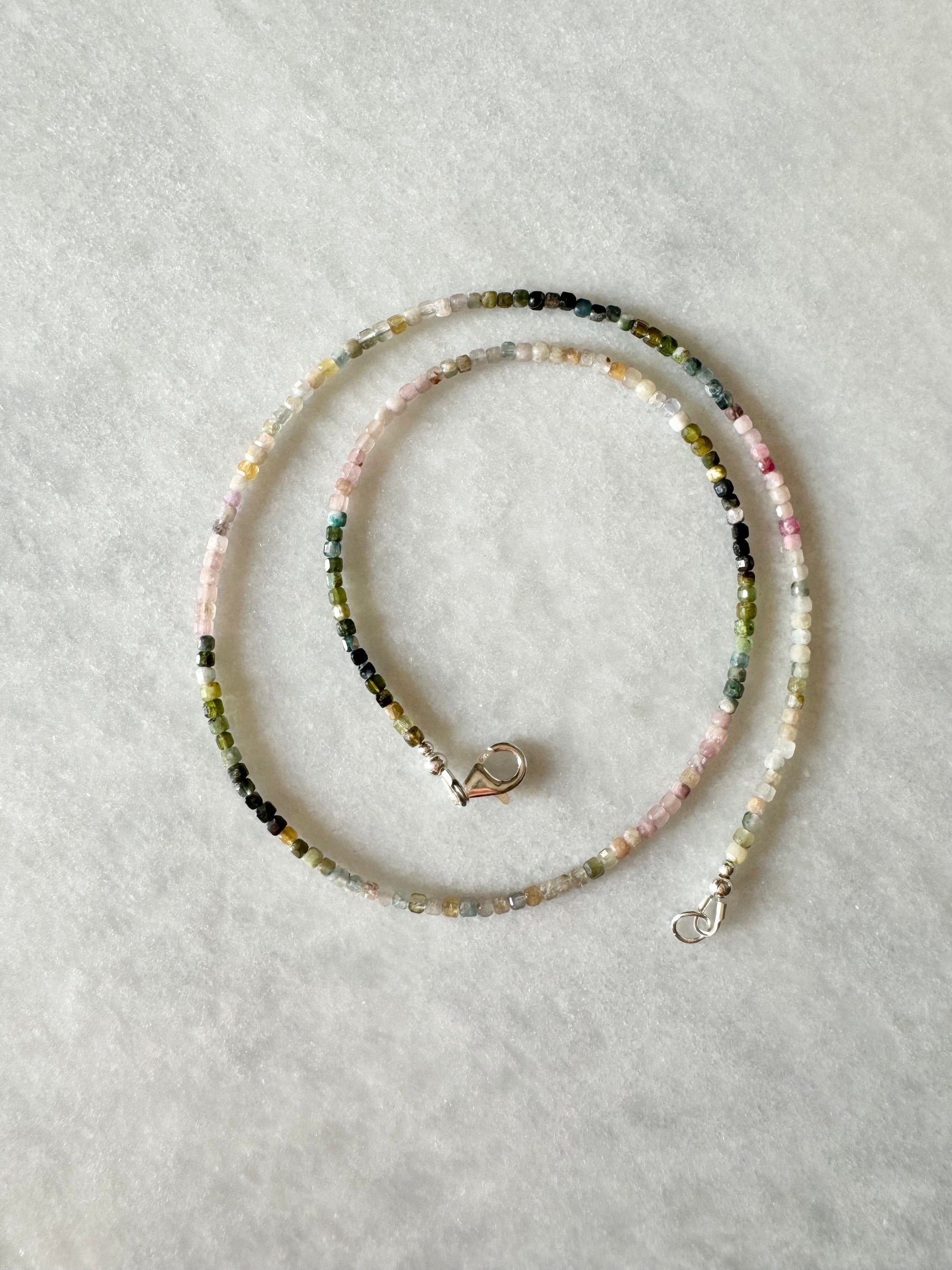 This dainty necklace is made with colourful tourmaline cubes, finished with a sterling silver lobster clasp.