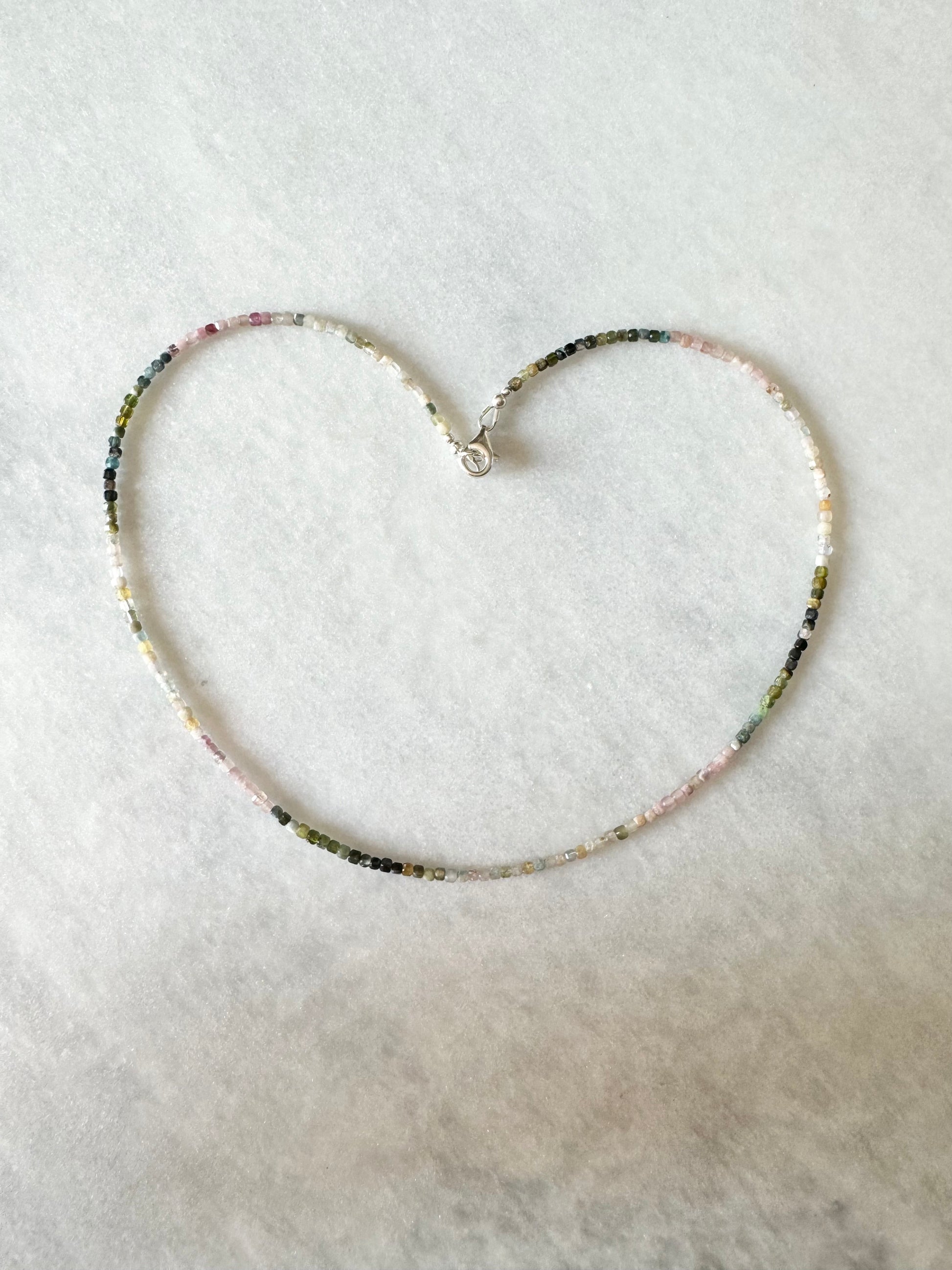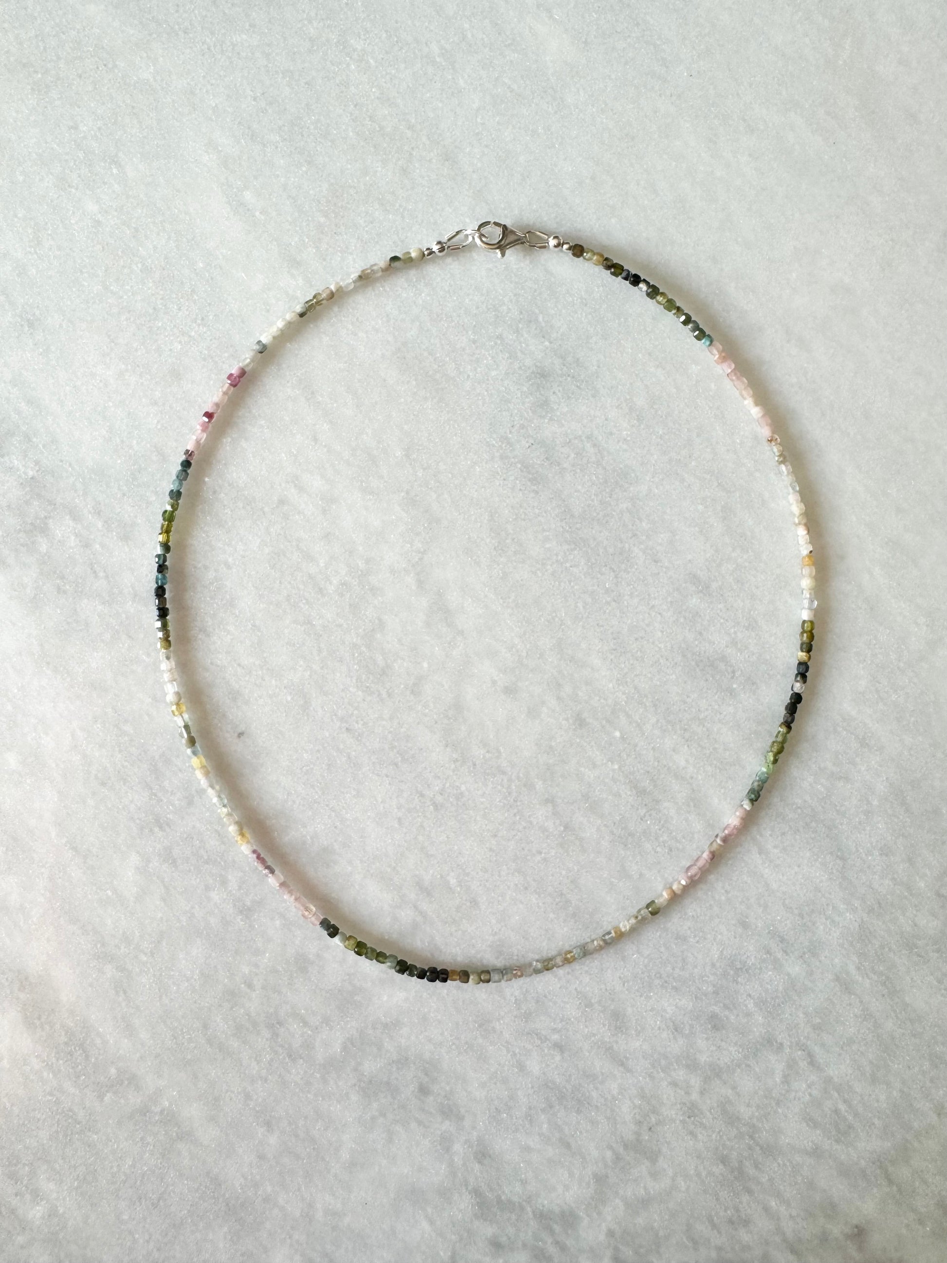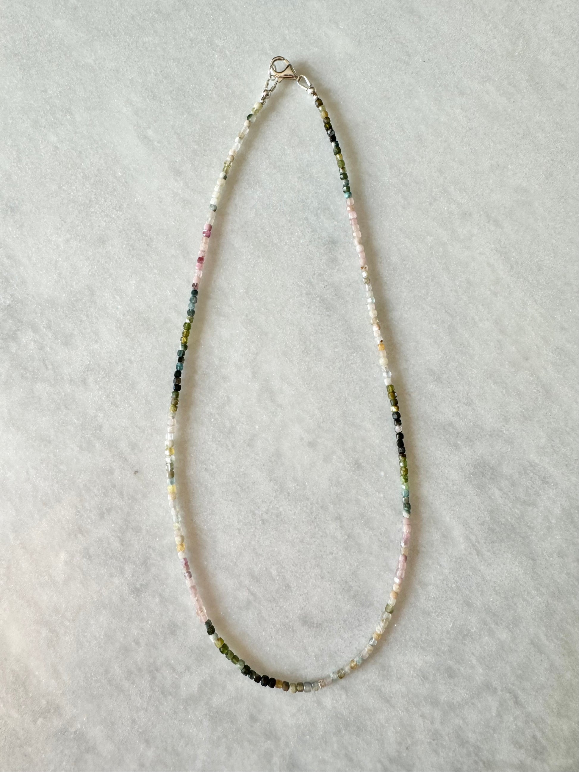 This dainty necklace is made with colourful tourmaline cubes, finished with a sterling silver lobster clasp.
