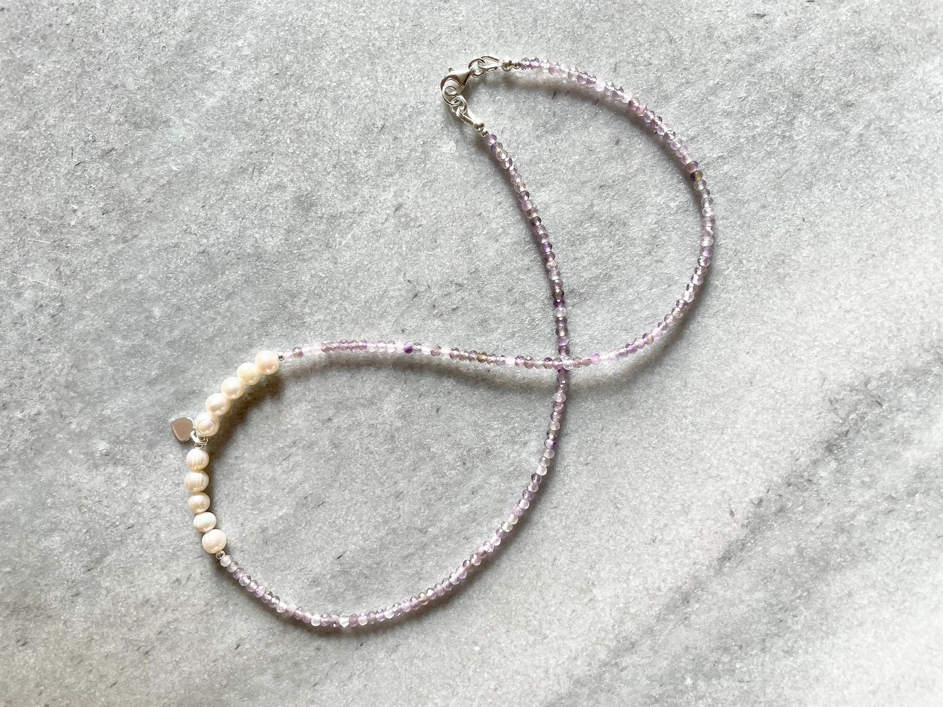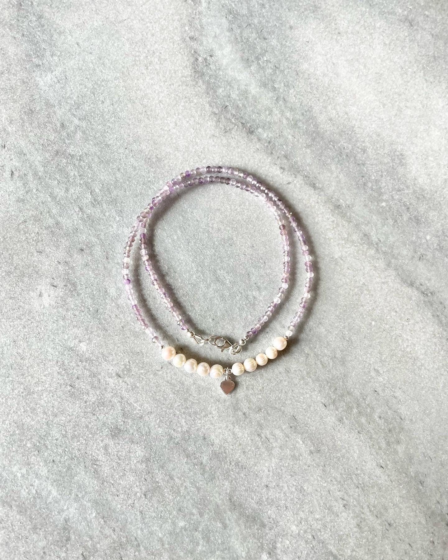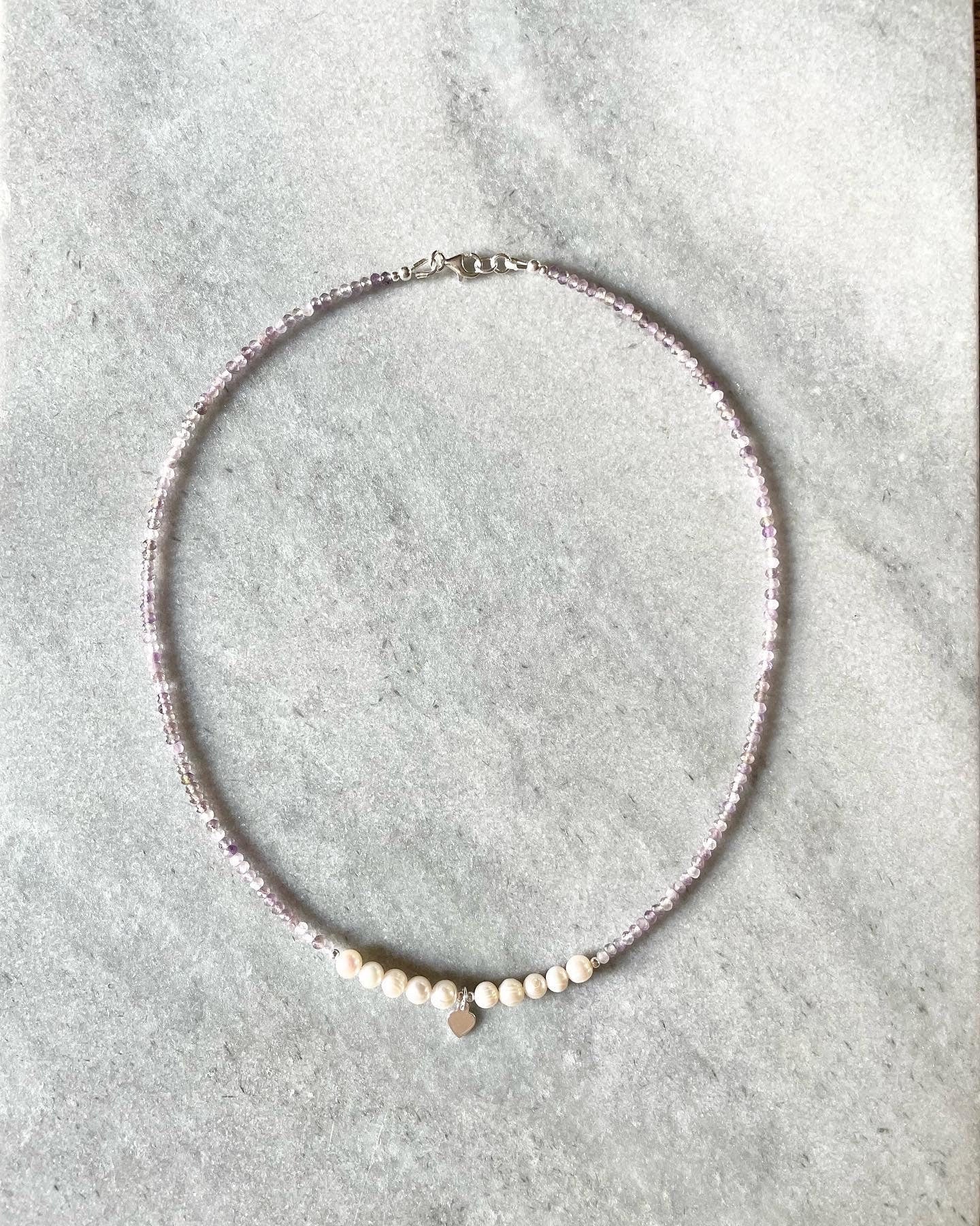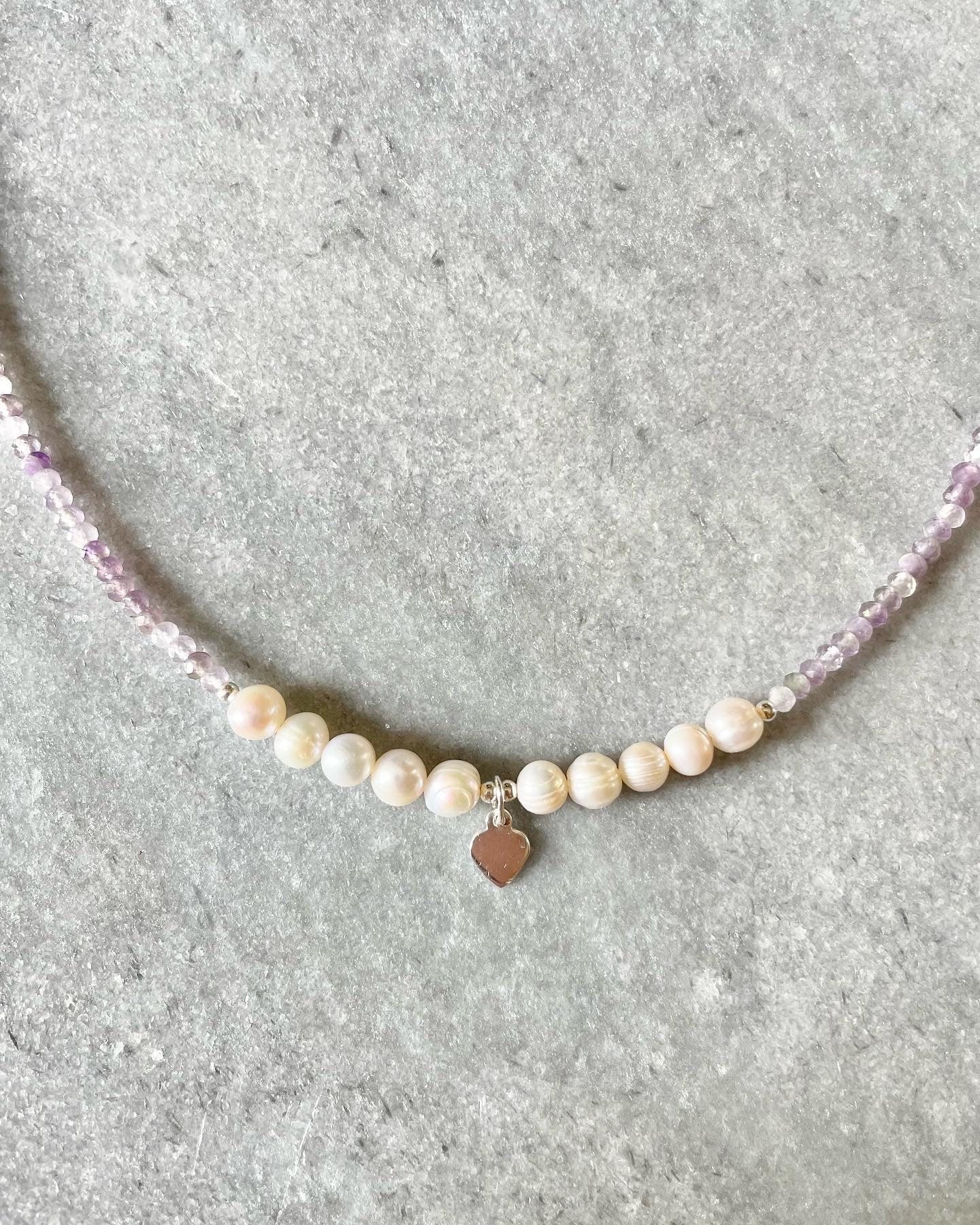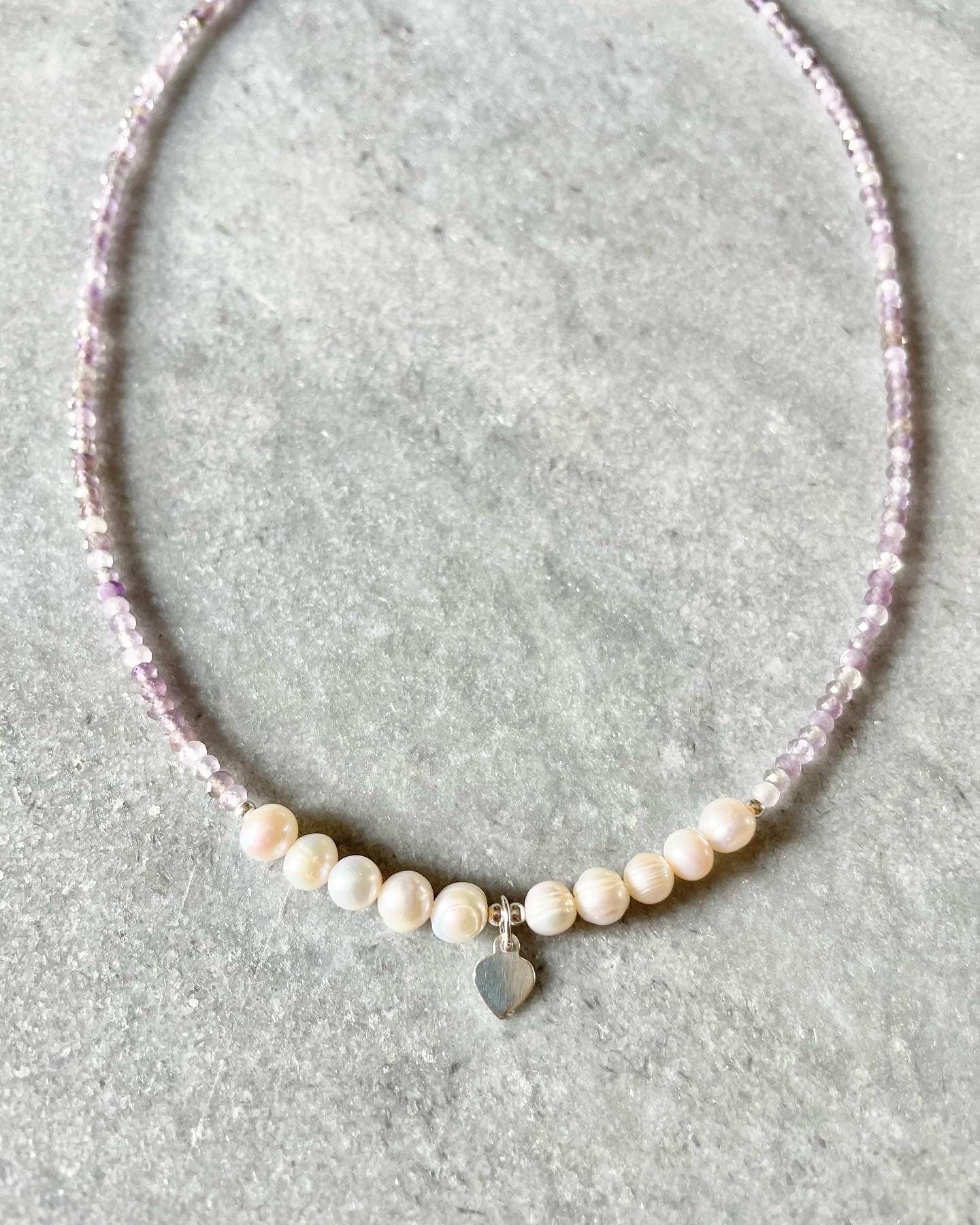 This necklace has been made with faceted amethyst and freshwater pearl beads finished with a sterling silver heart charm