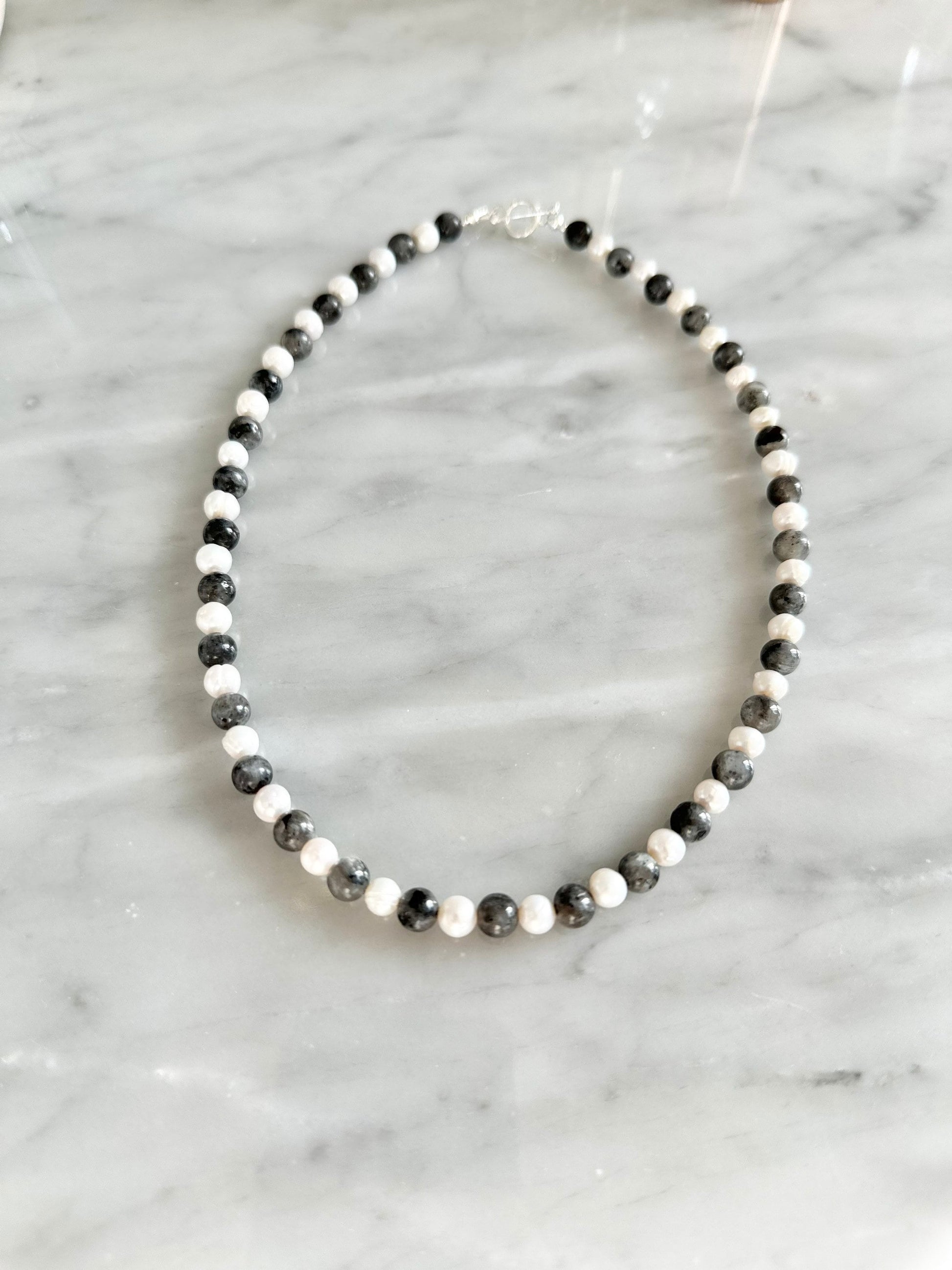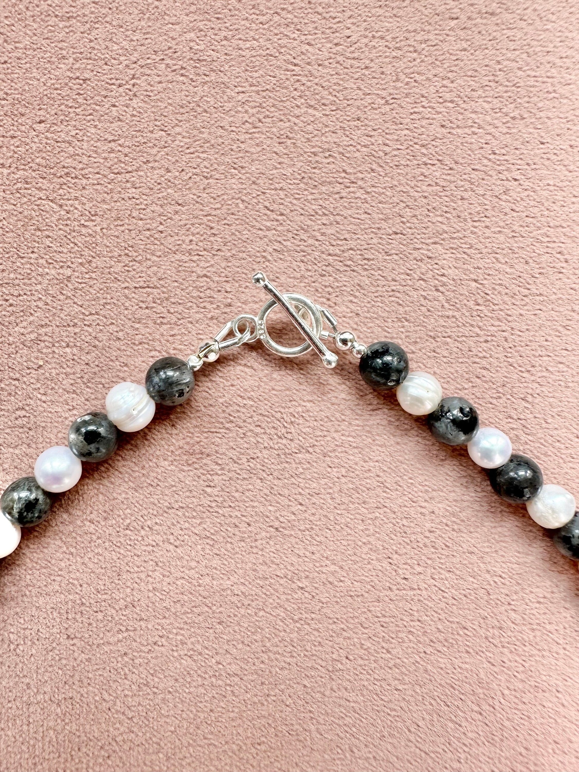 This necklace is made with freshwater pearl and larvikite beads, finished with a sterling silver toggle clasp.