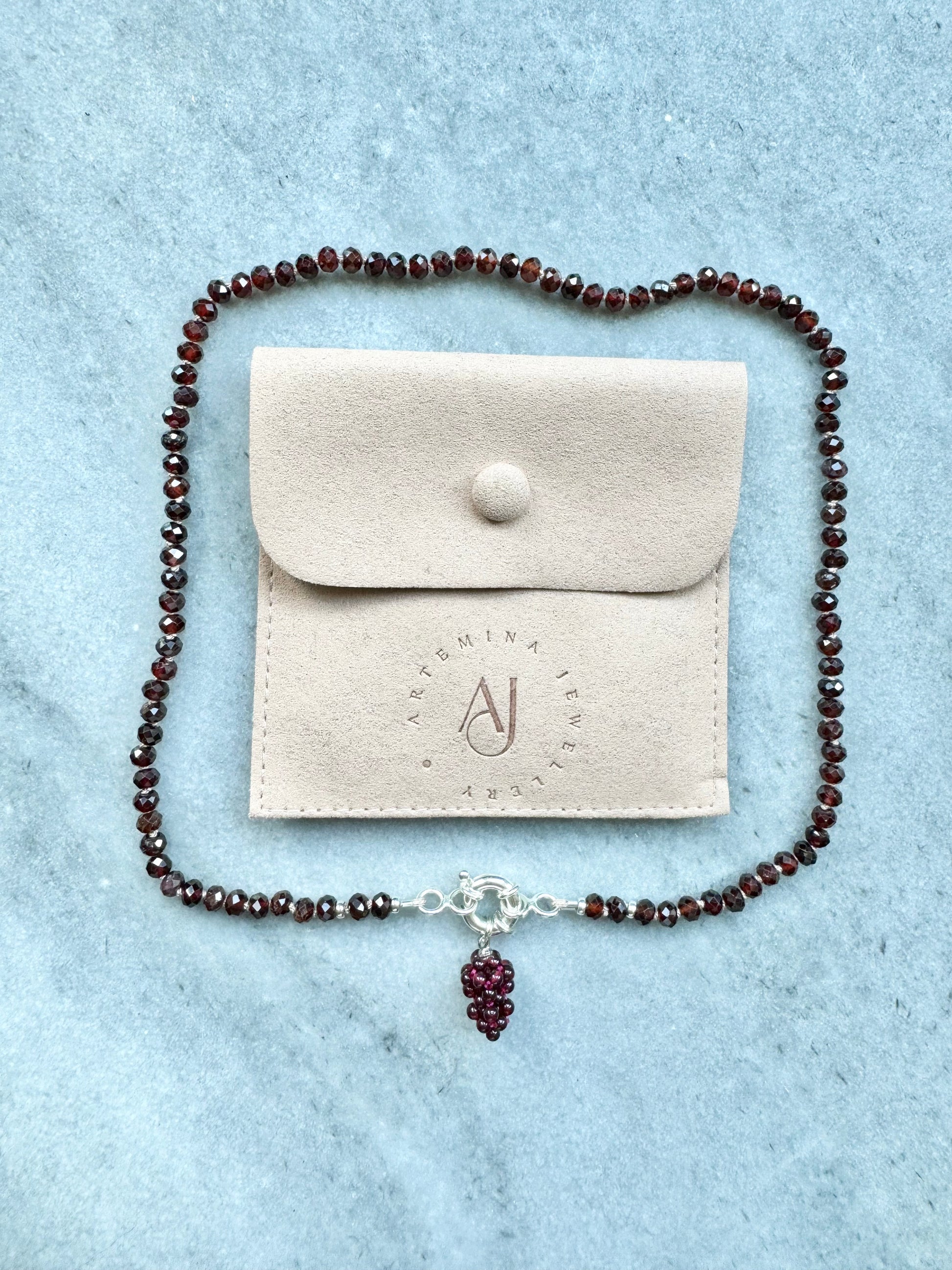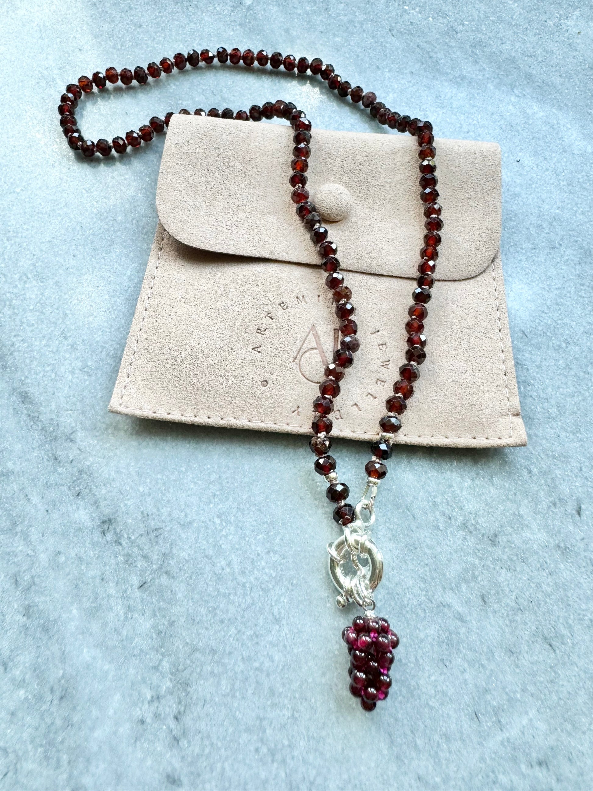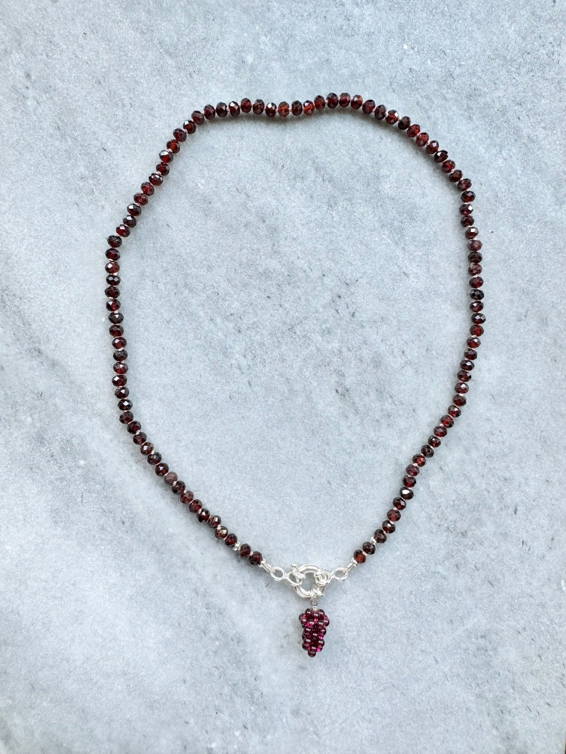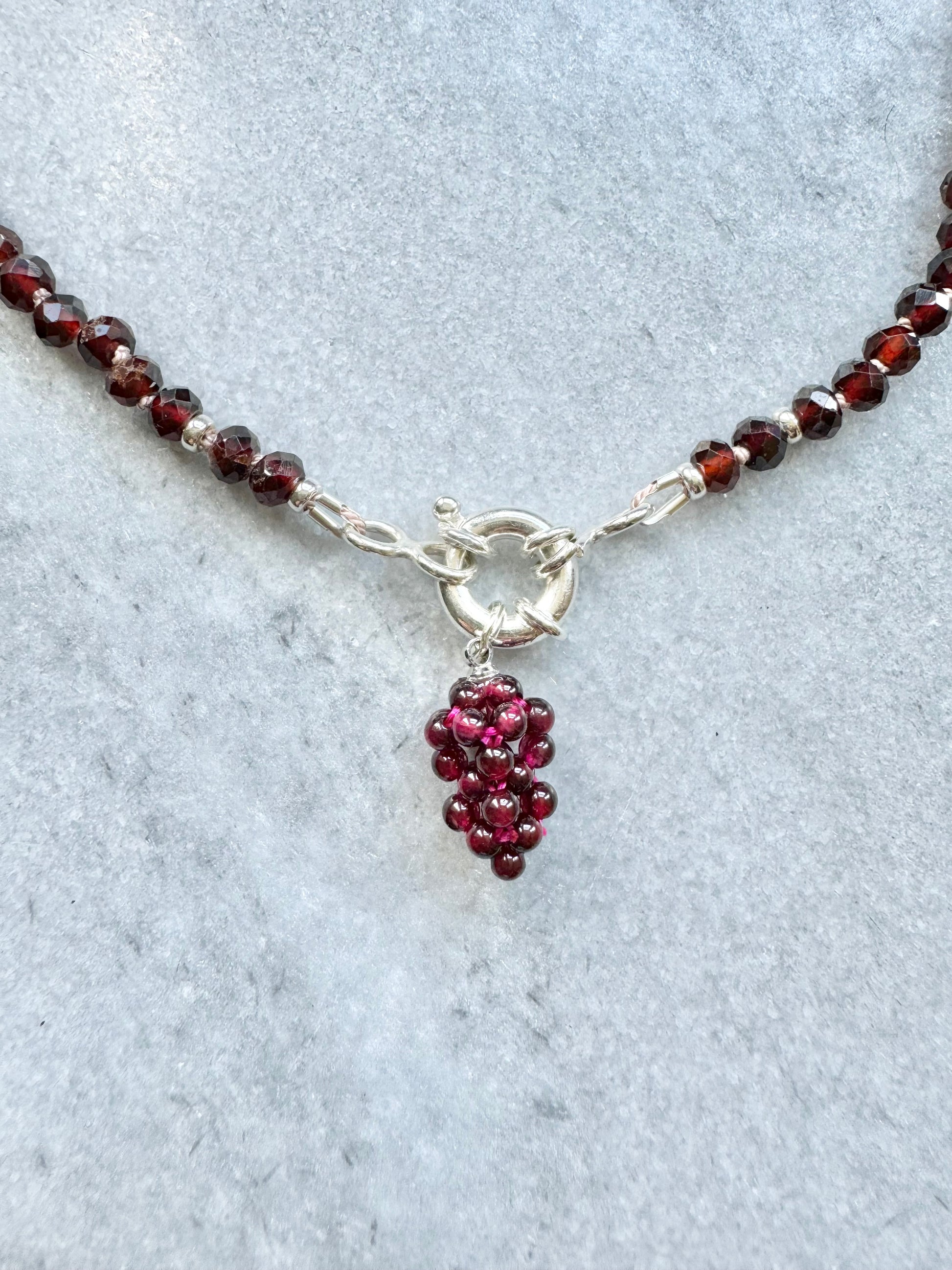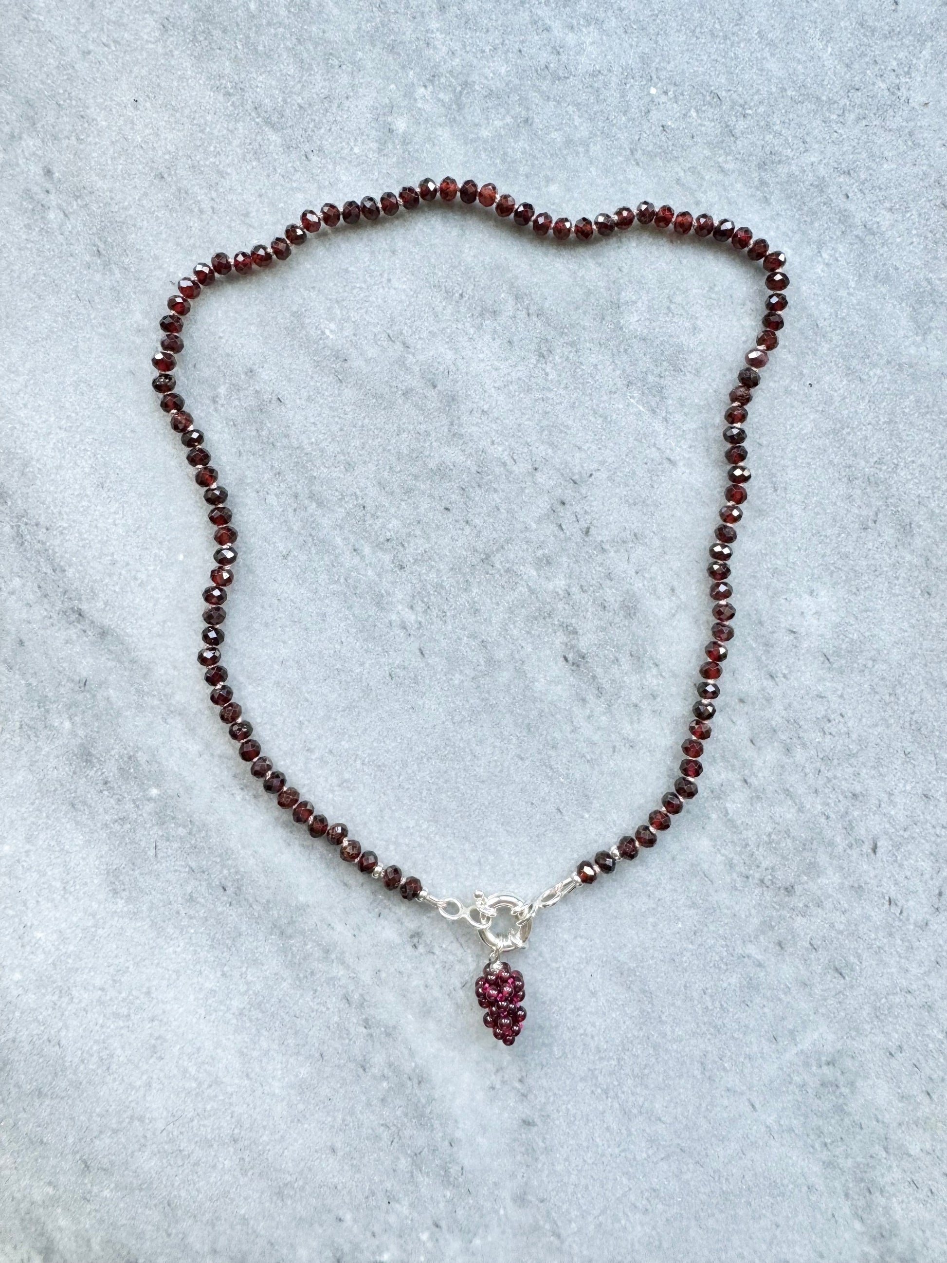 This necklace features garnet rondelles, hand-knotted on light pink silk, and is finished with a sterling silver clasp and a garnet grape pendant.