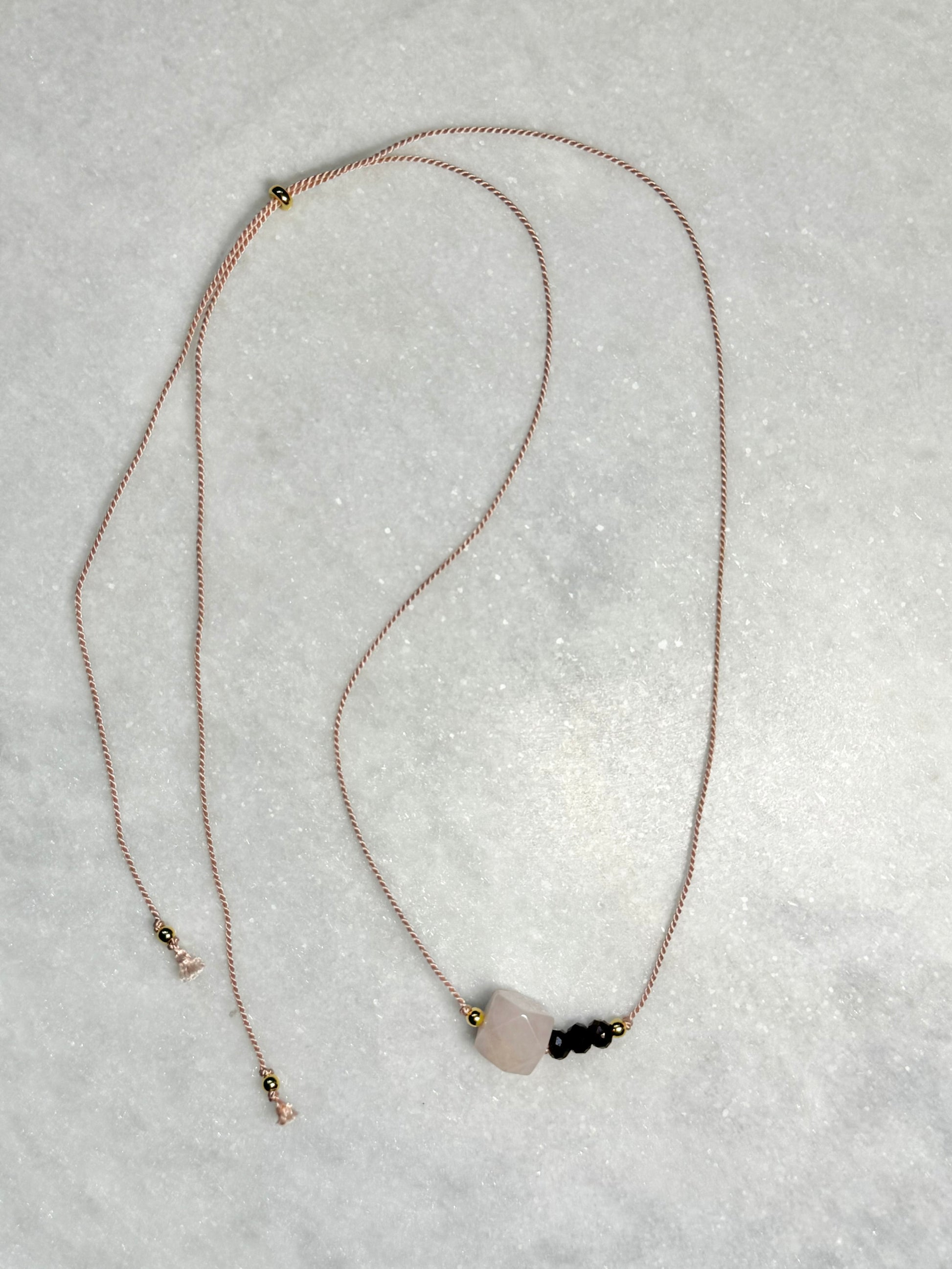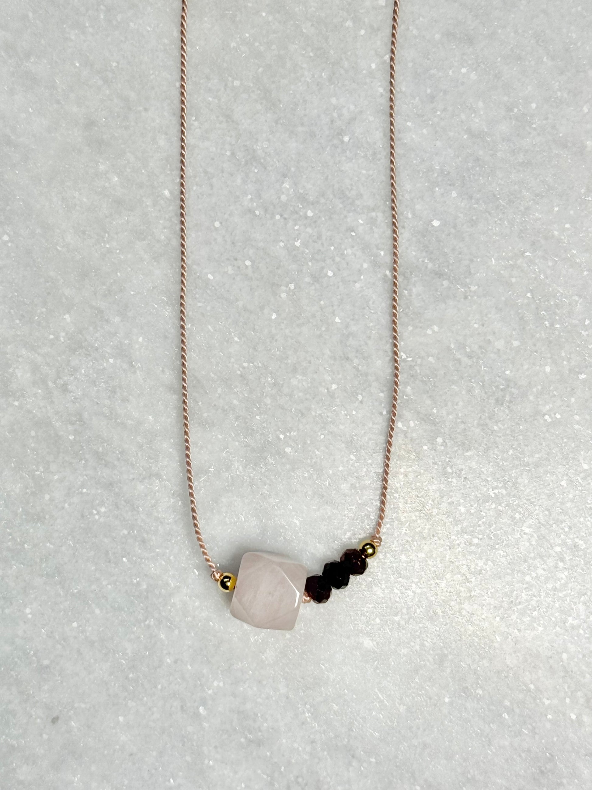This pendant necklace features carefully selected rose quartz and garnet, symbolising love, passion, and protection for the month of January.