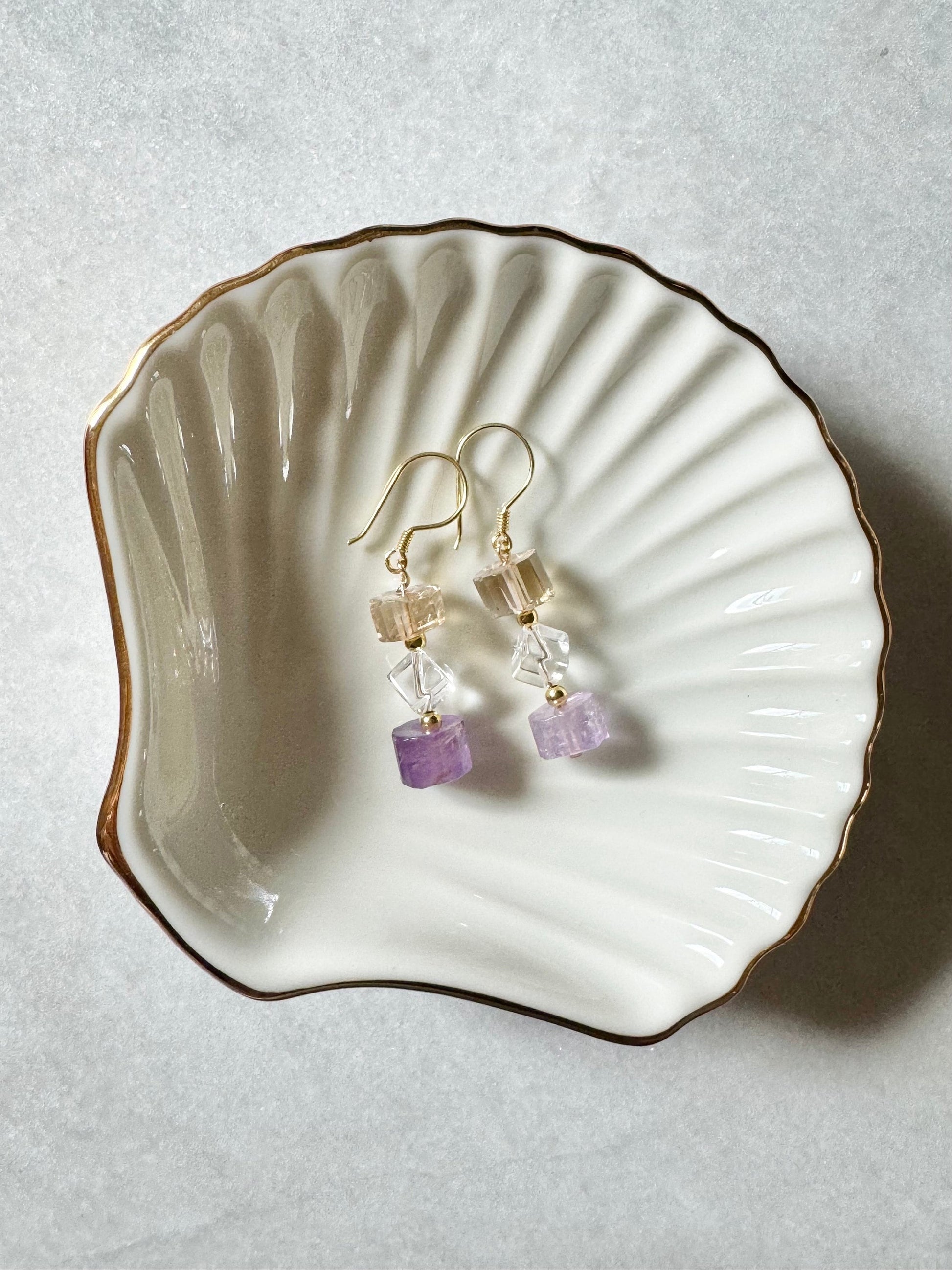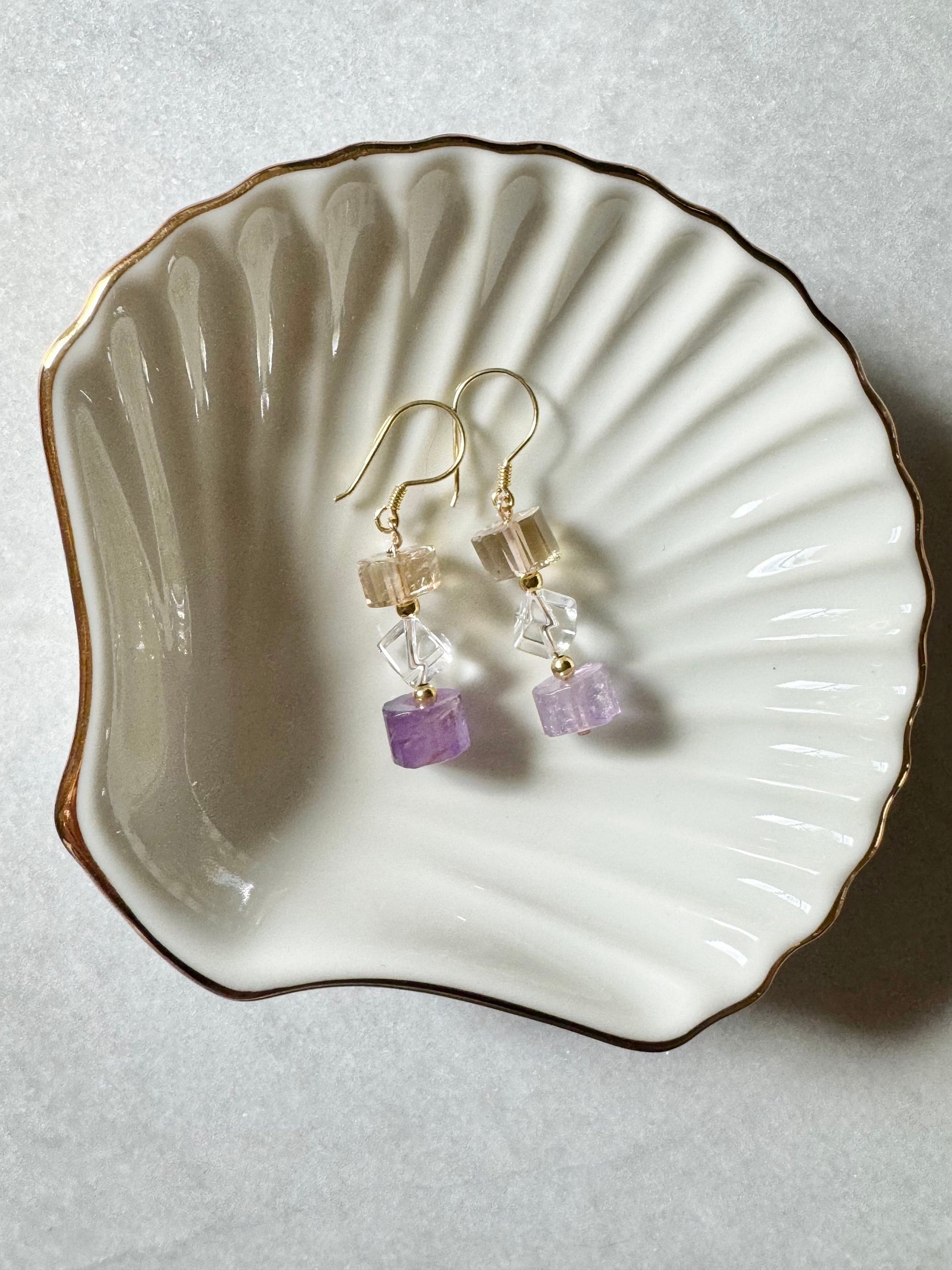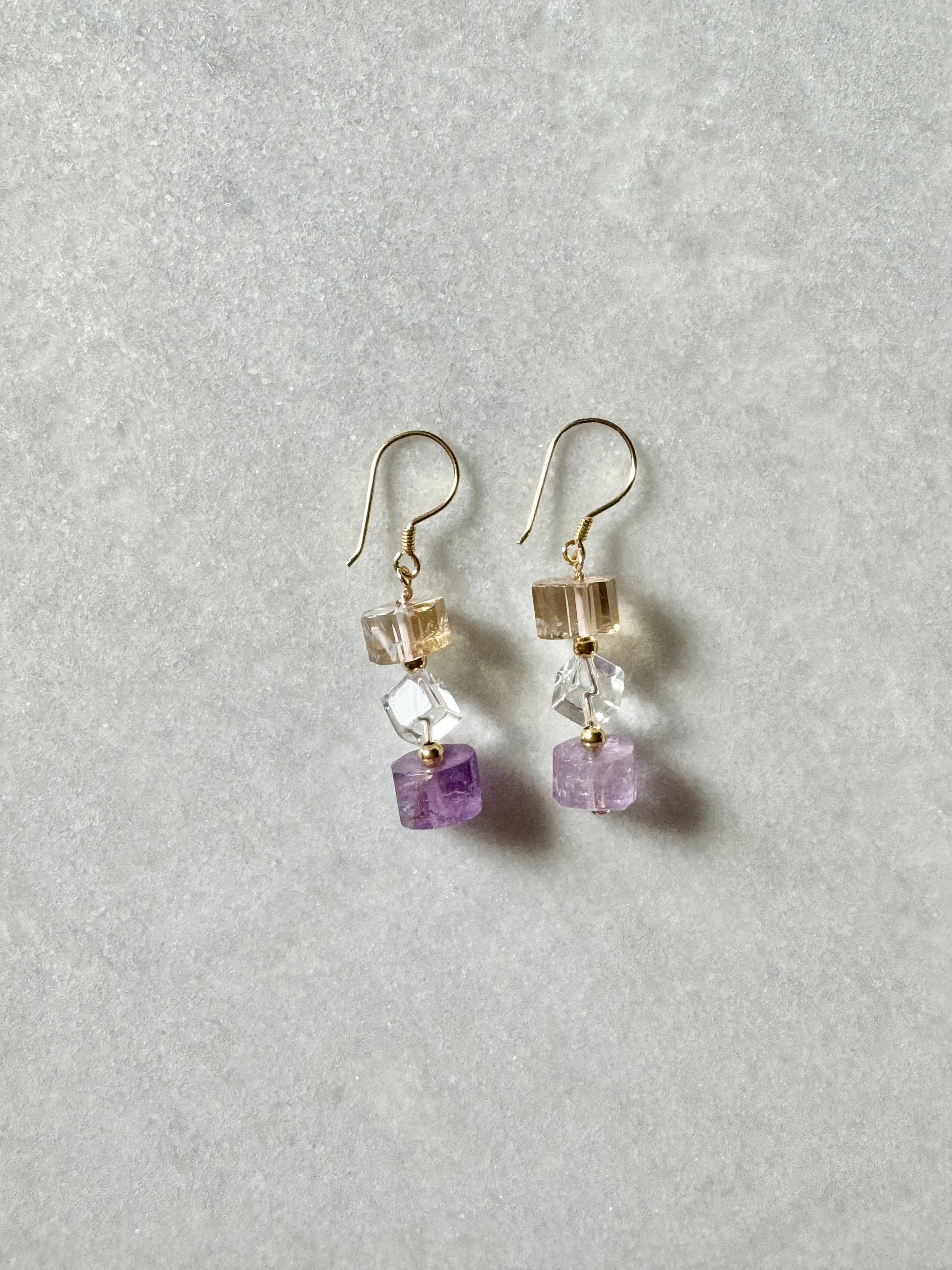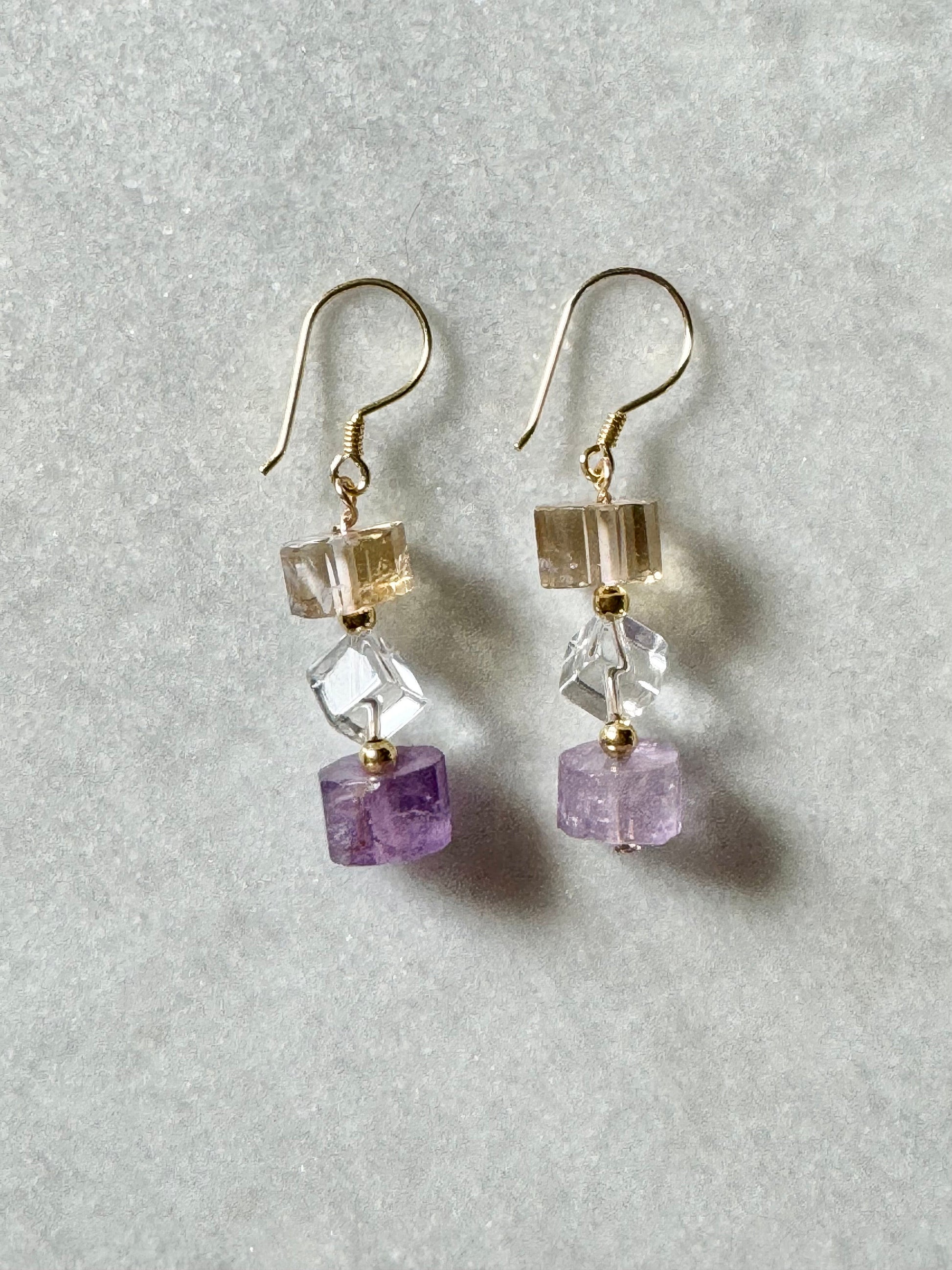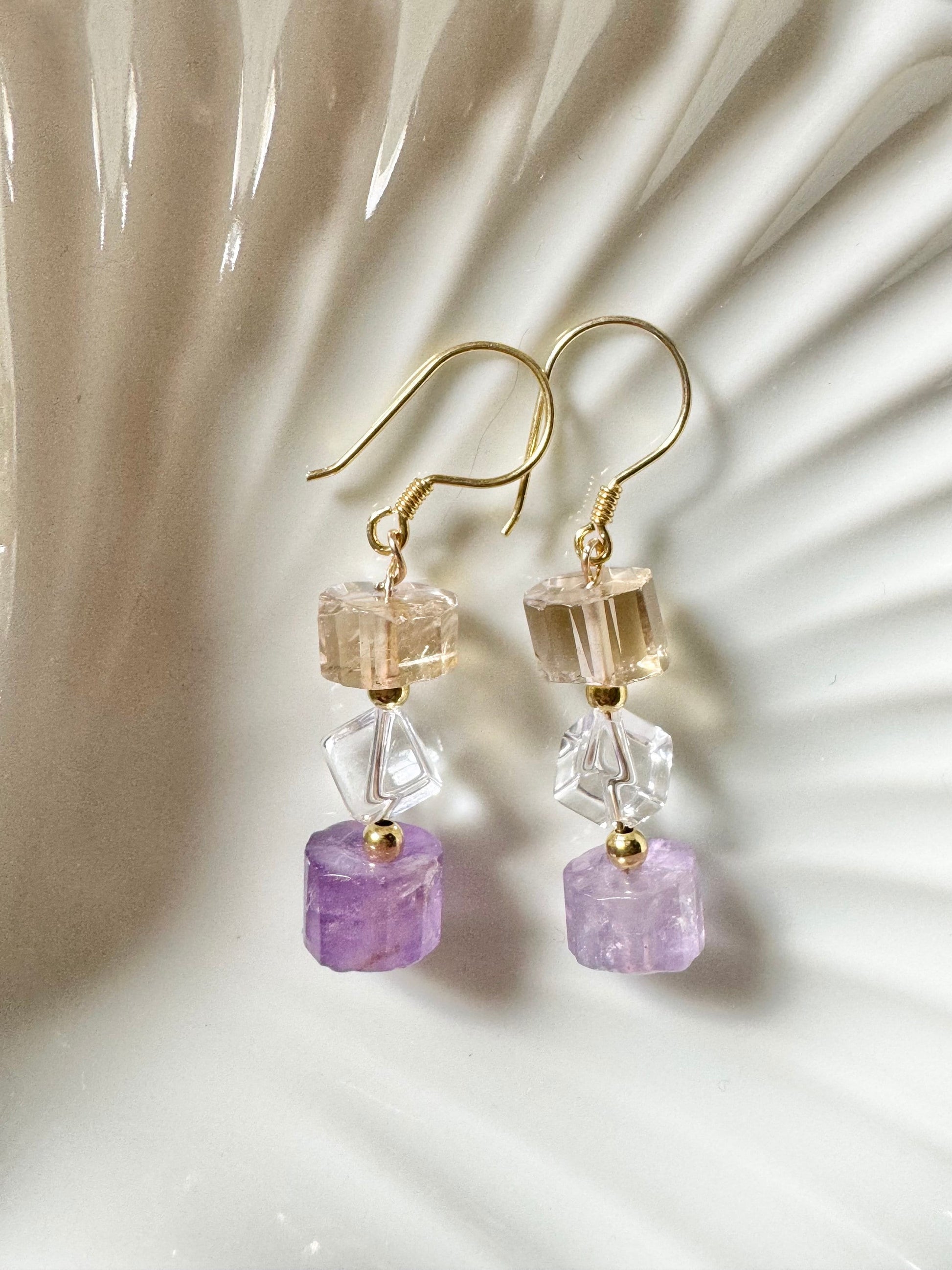 Ametrine & Rock Crystal geometric drop earrings on gold vermeil hooks.