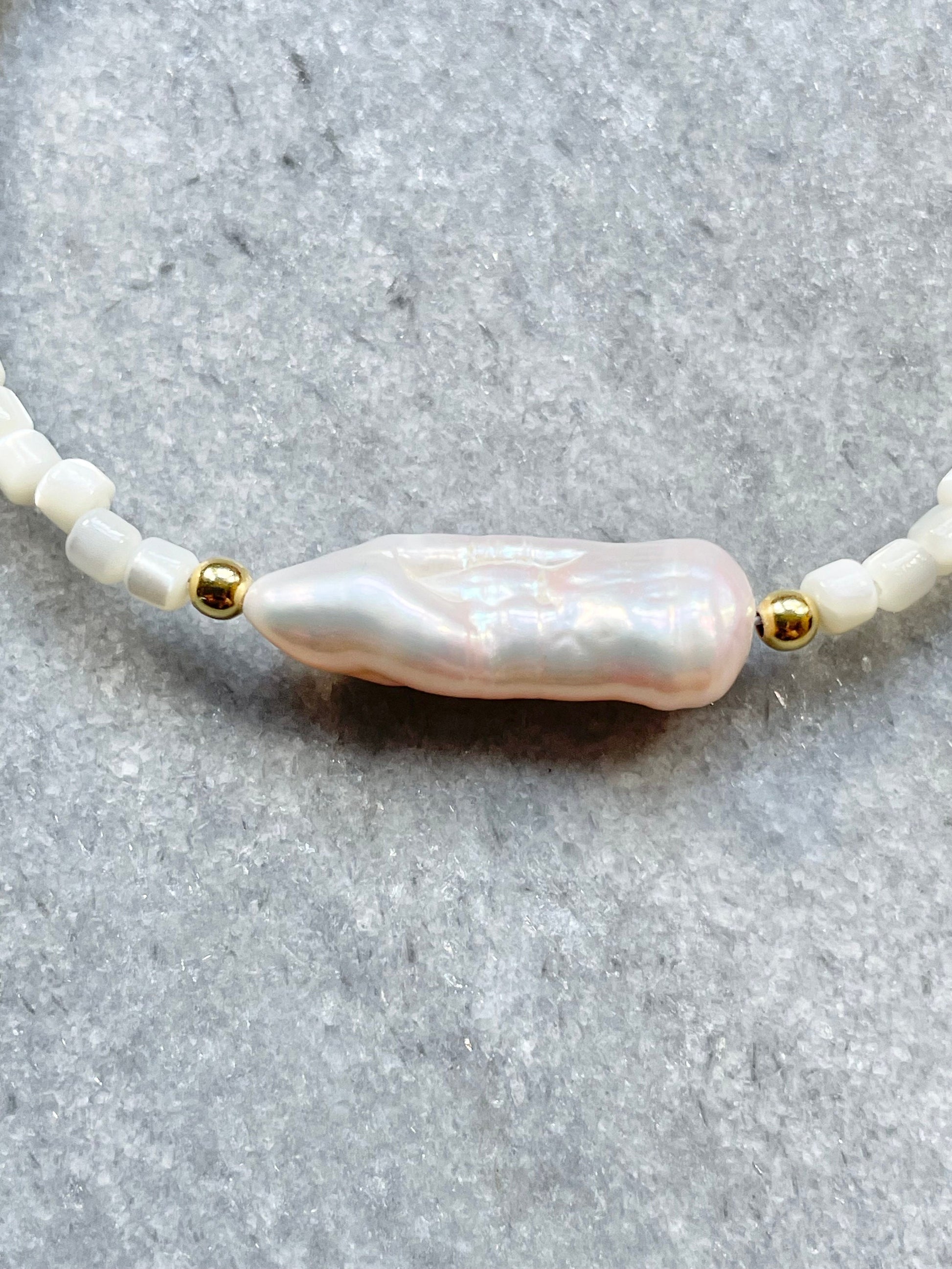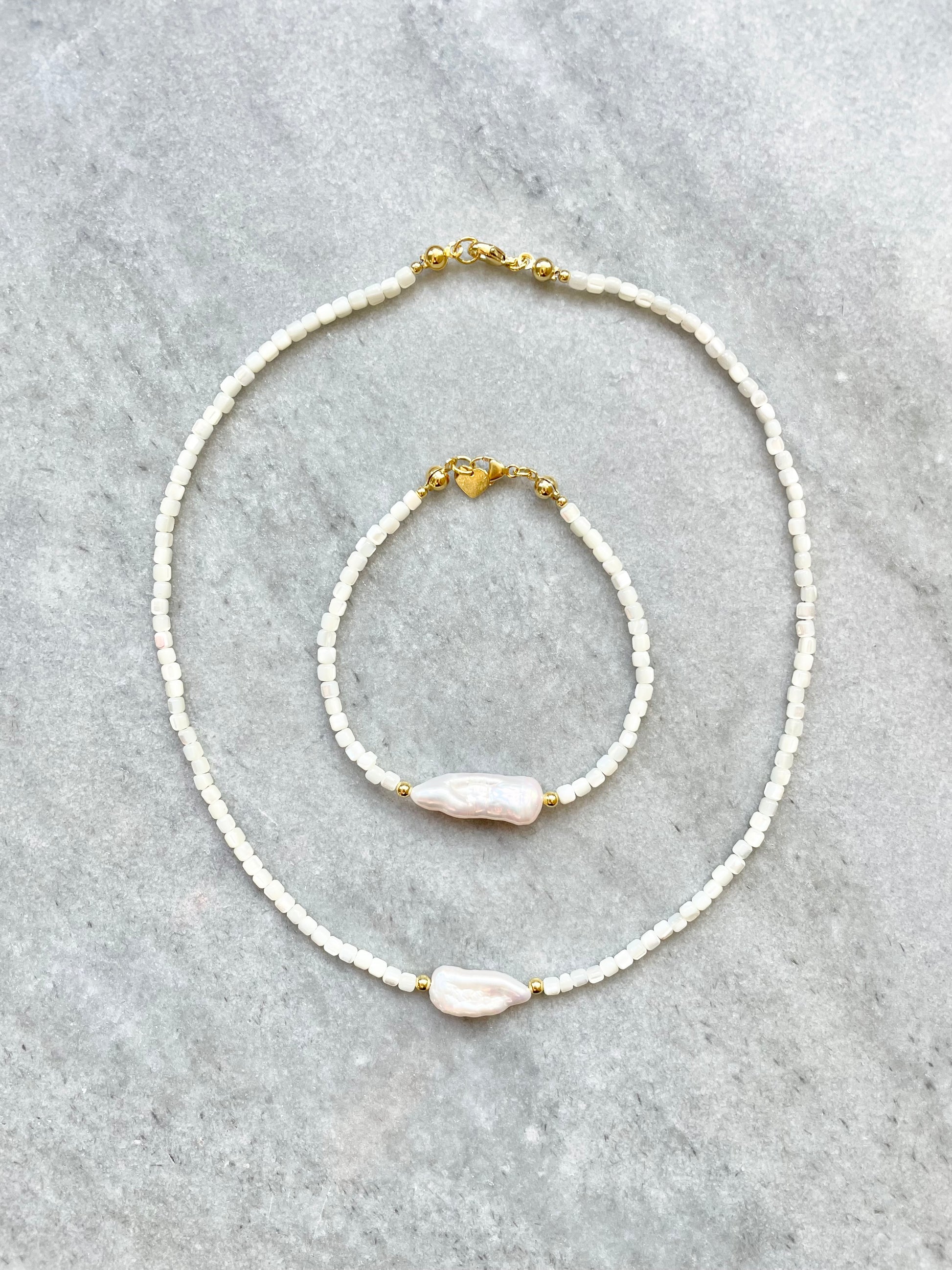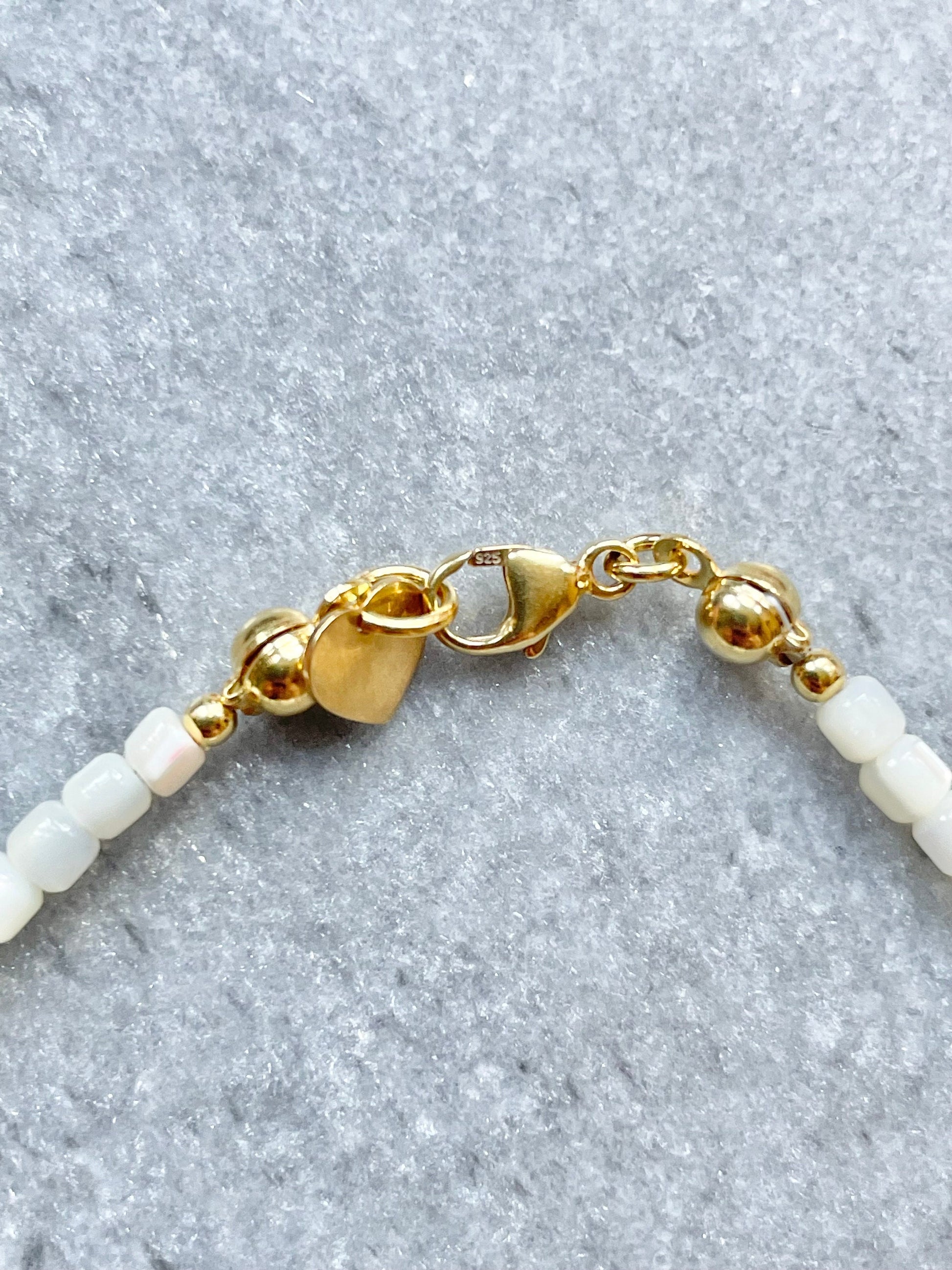 This delicate bracelet has been made with biwa pearl and mother of pearl beads finished with a gold vermeil lobster clasp with a tiny heart charm