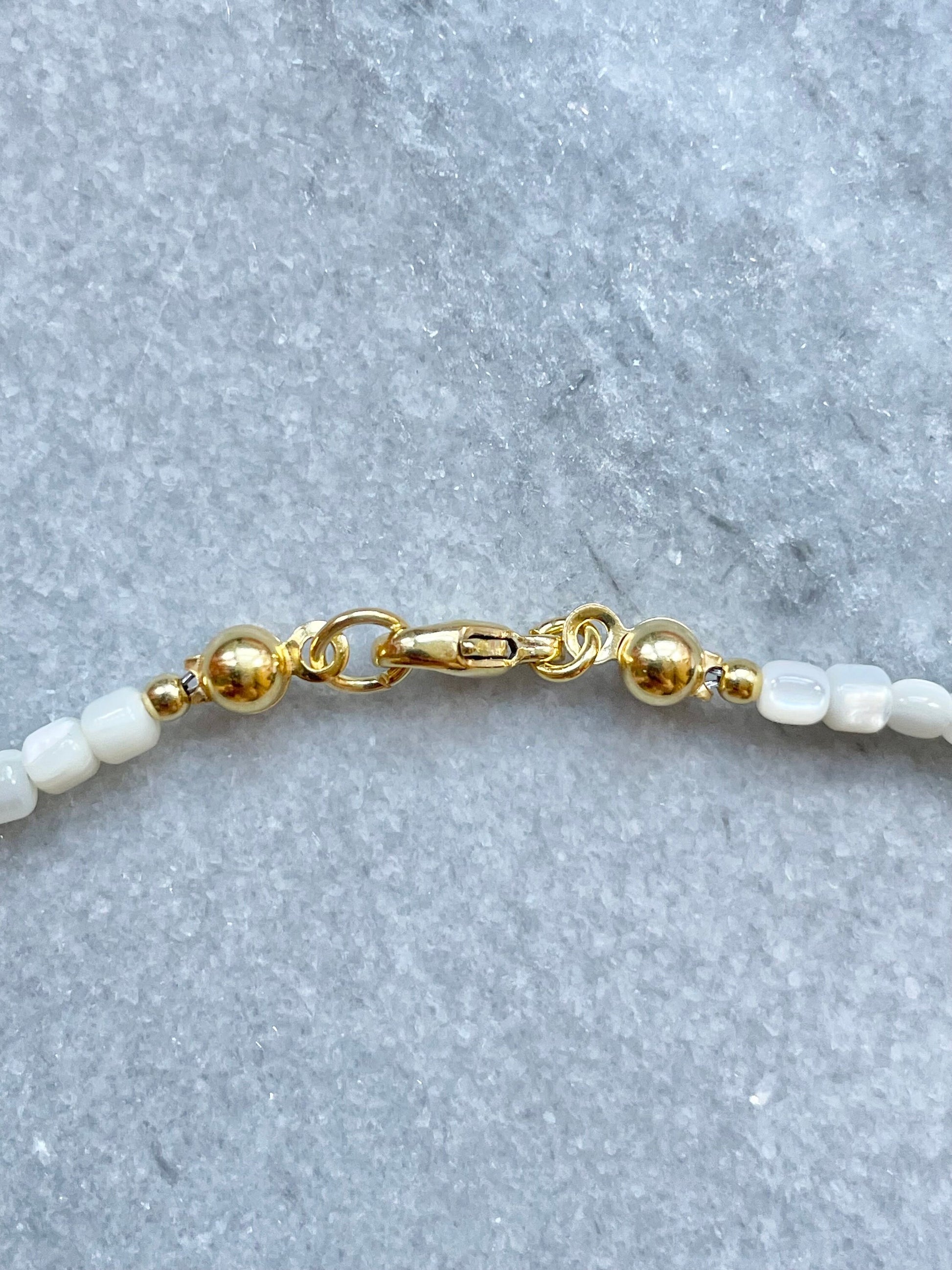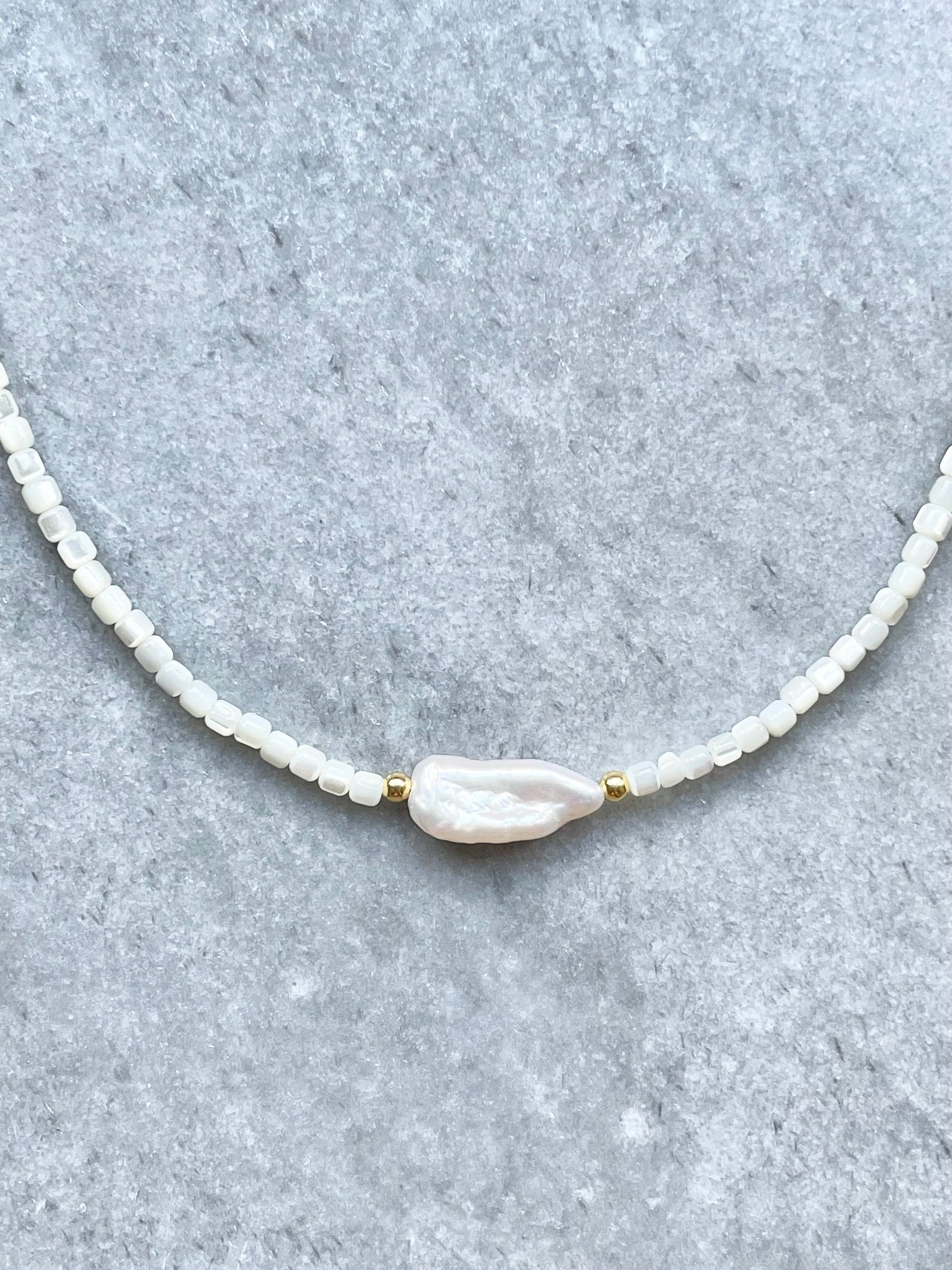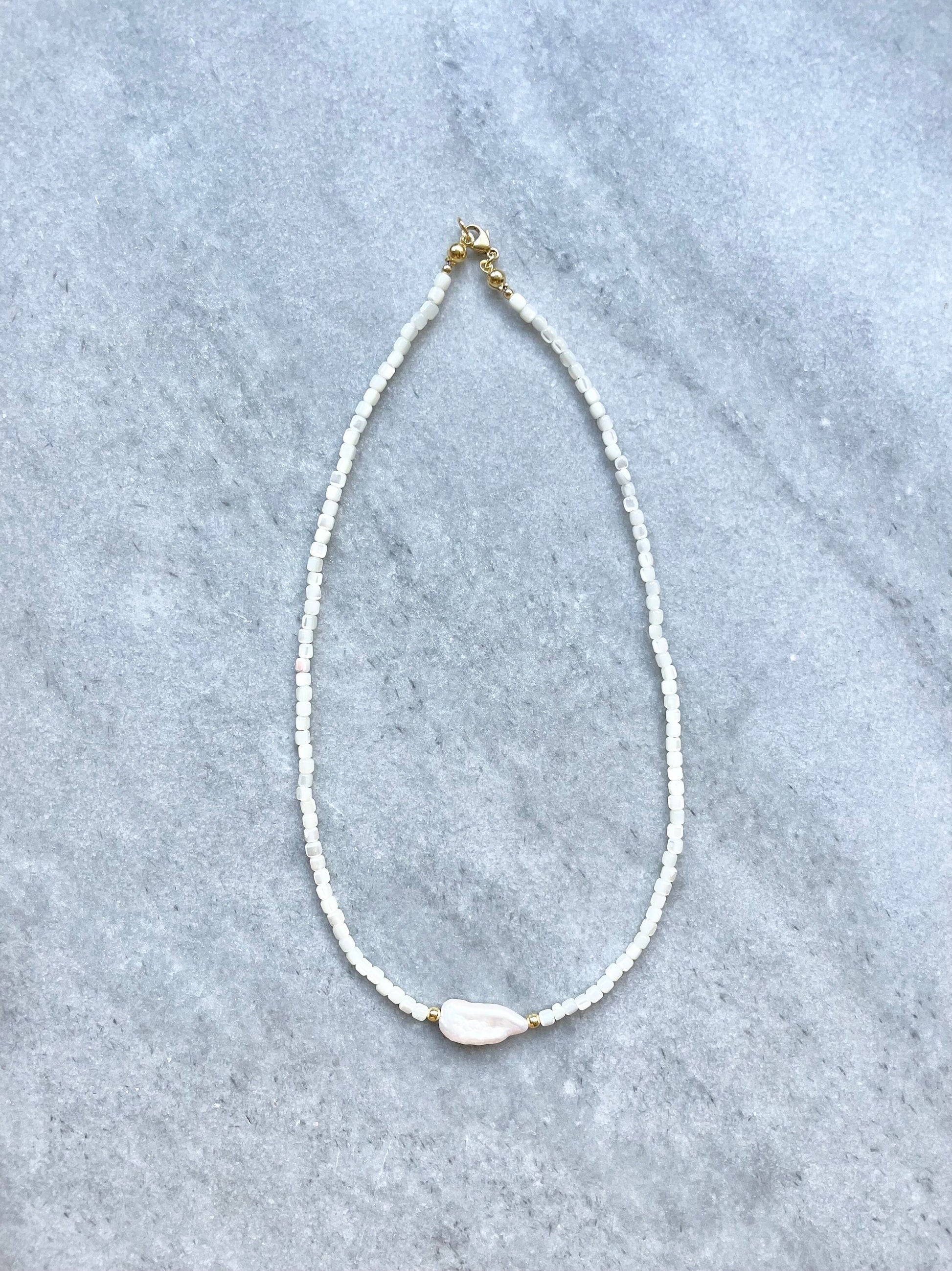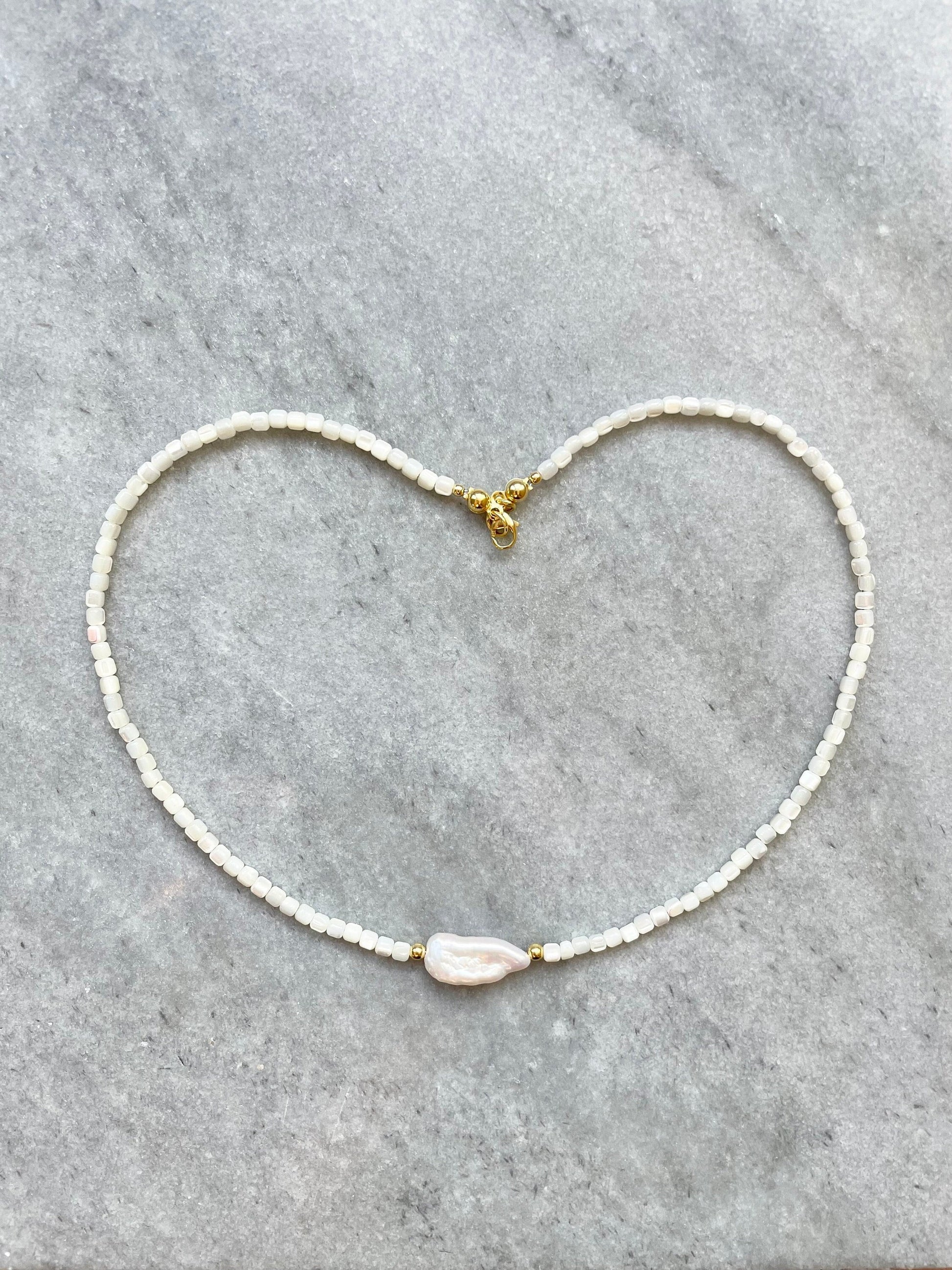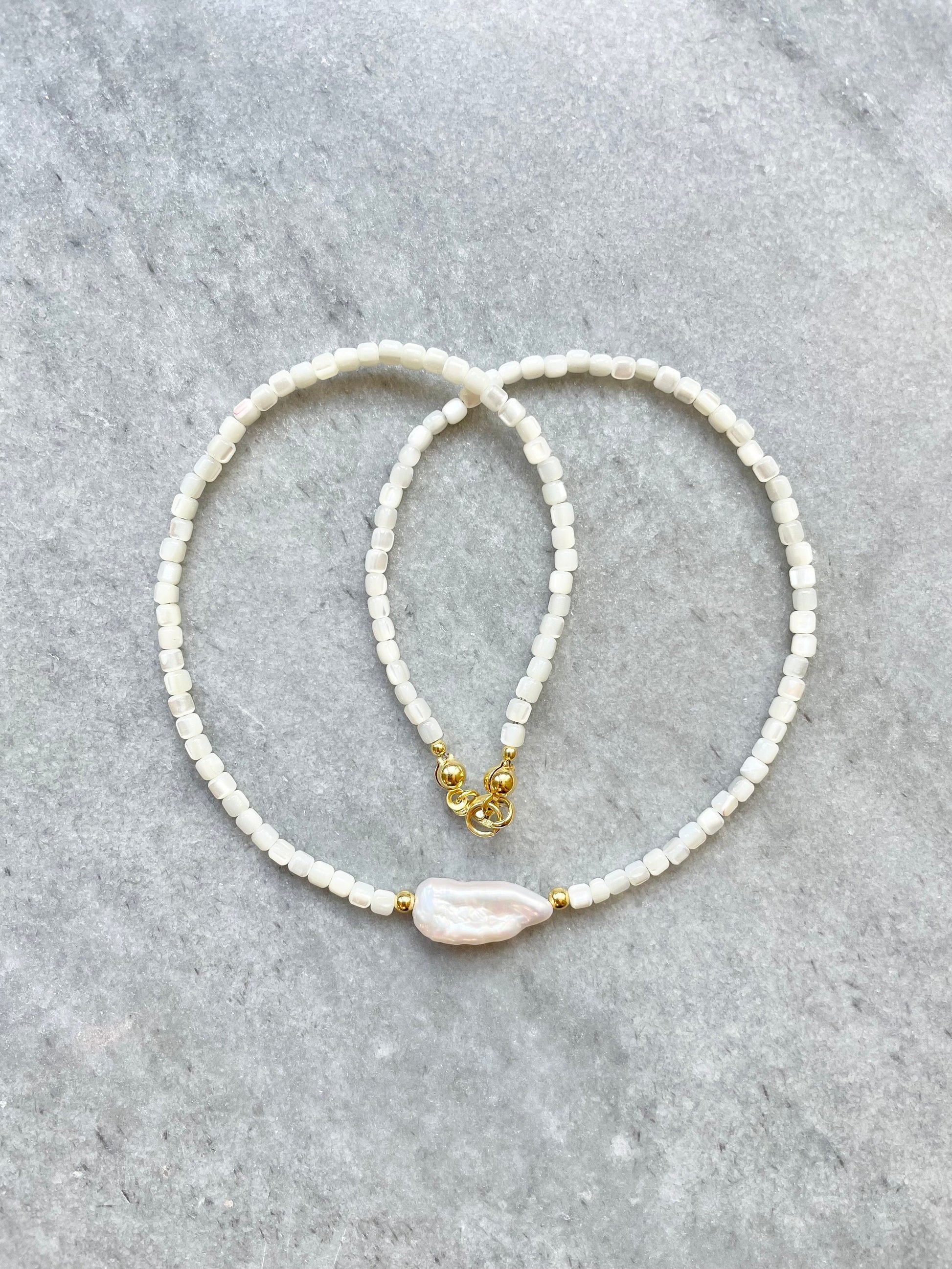 This delicate necklace has been made with biwa pearl and mother of pearl beads, finished with a gold vermeil lobster clasp.