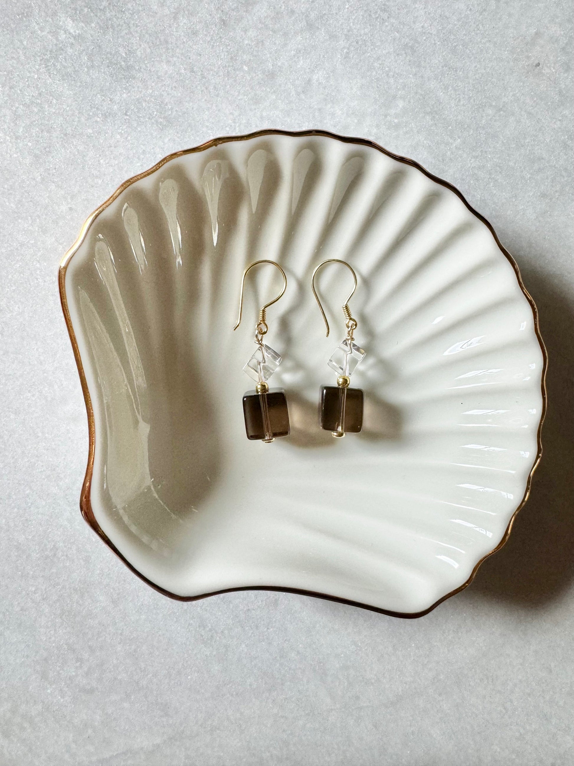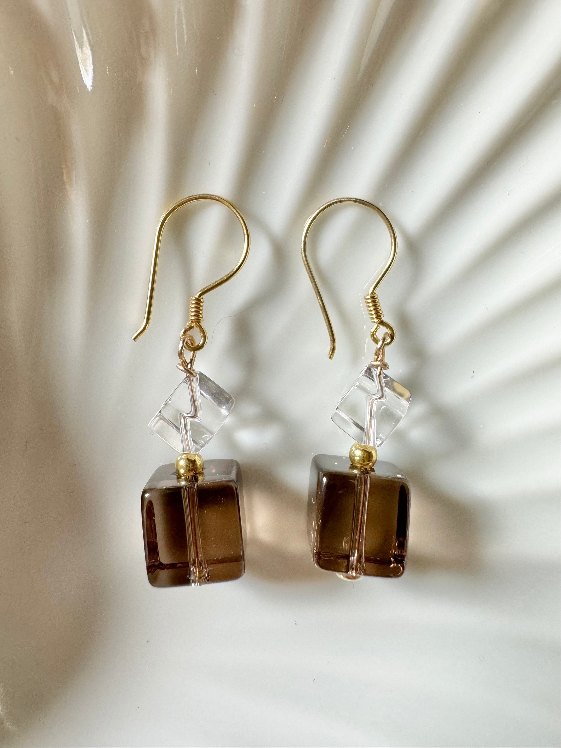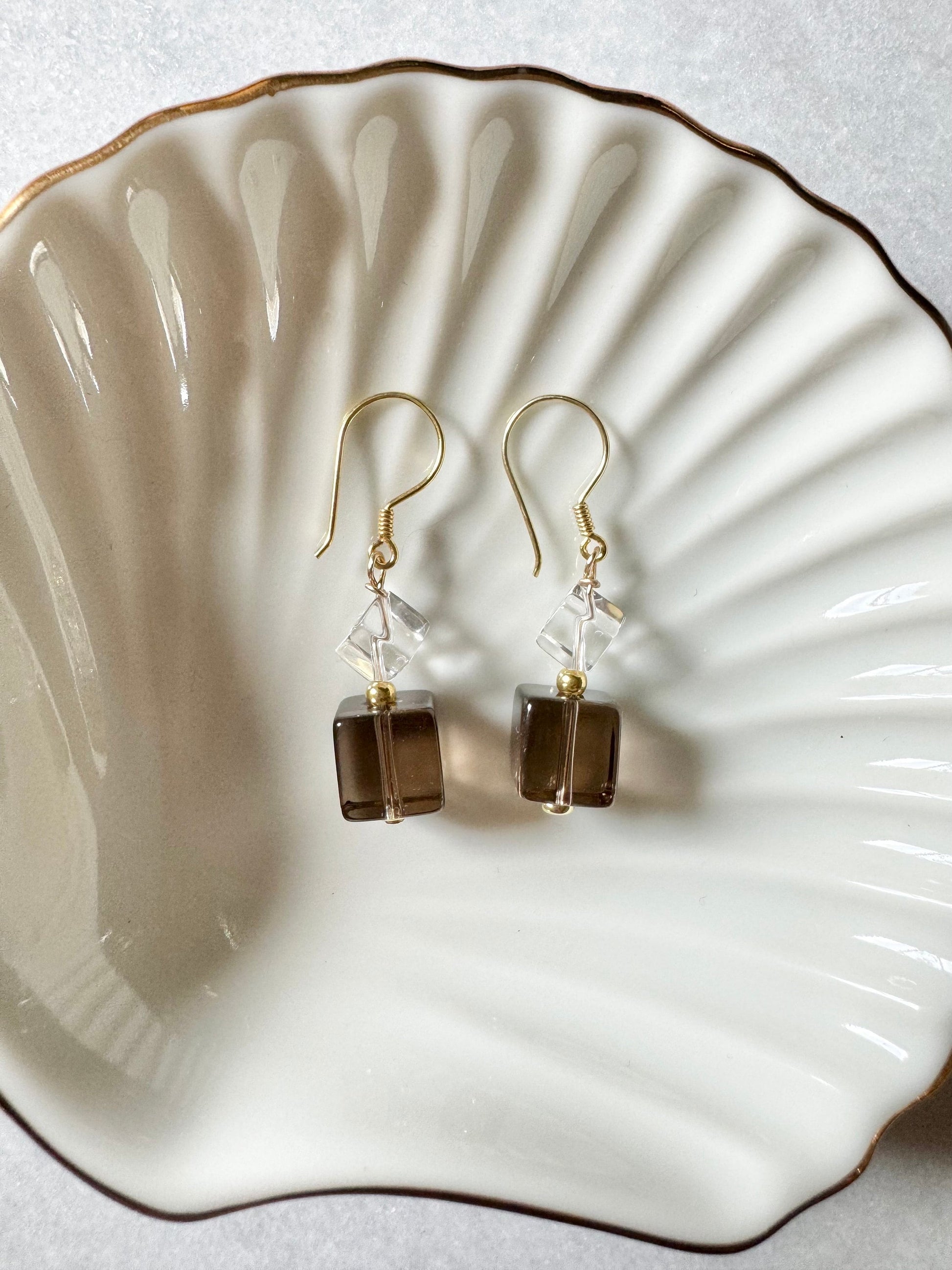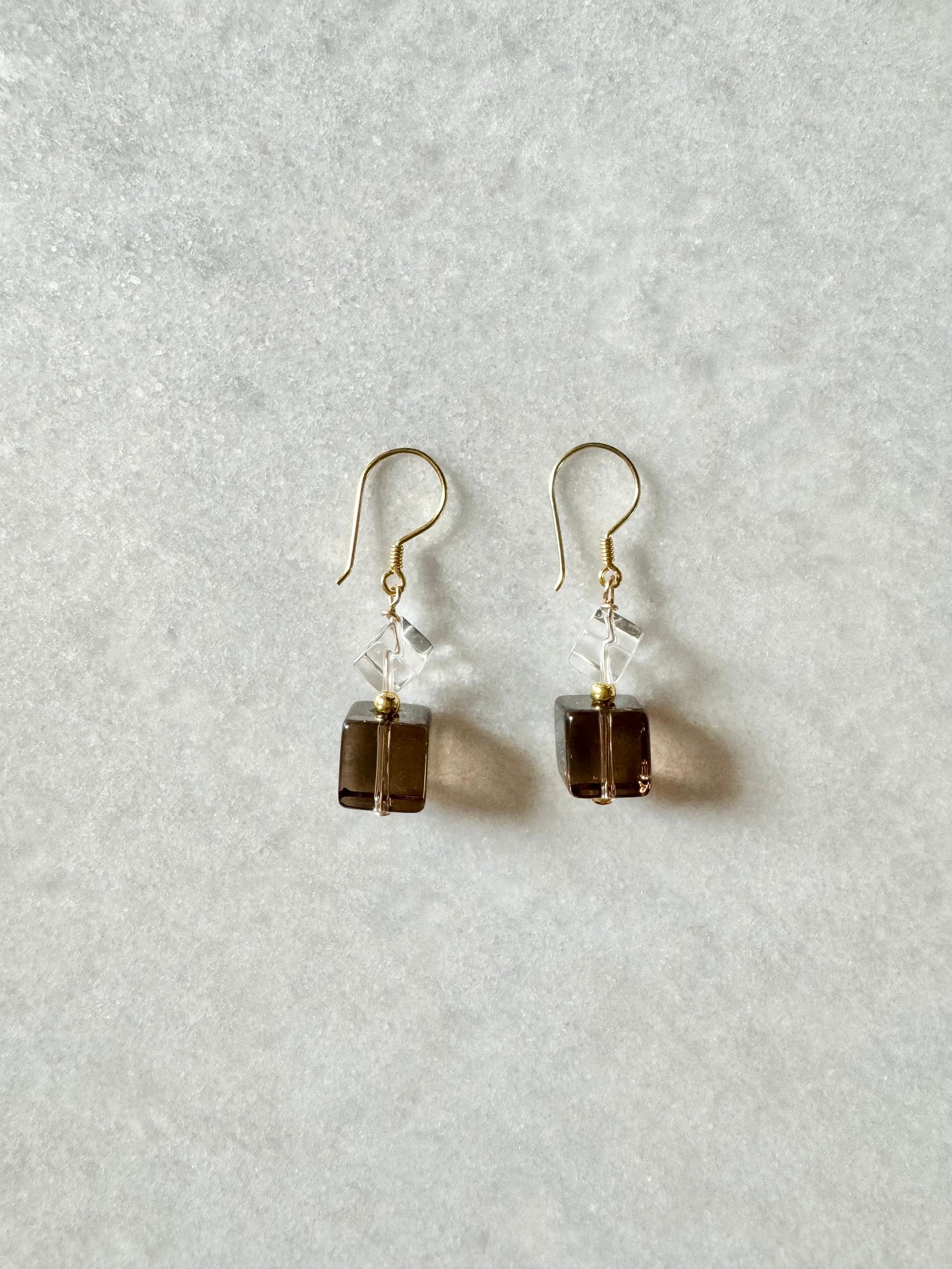 Smoky quartz & rock crystal cube drop earrings on gold vermeil hooks