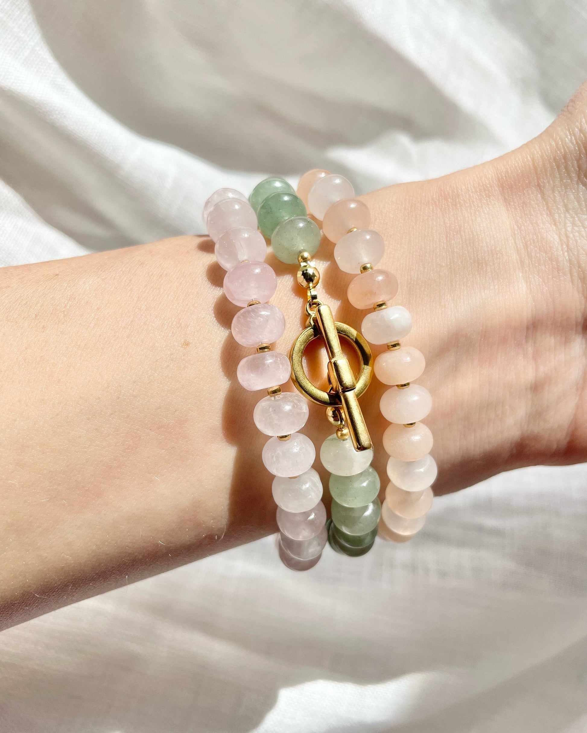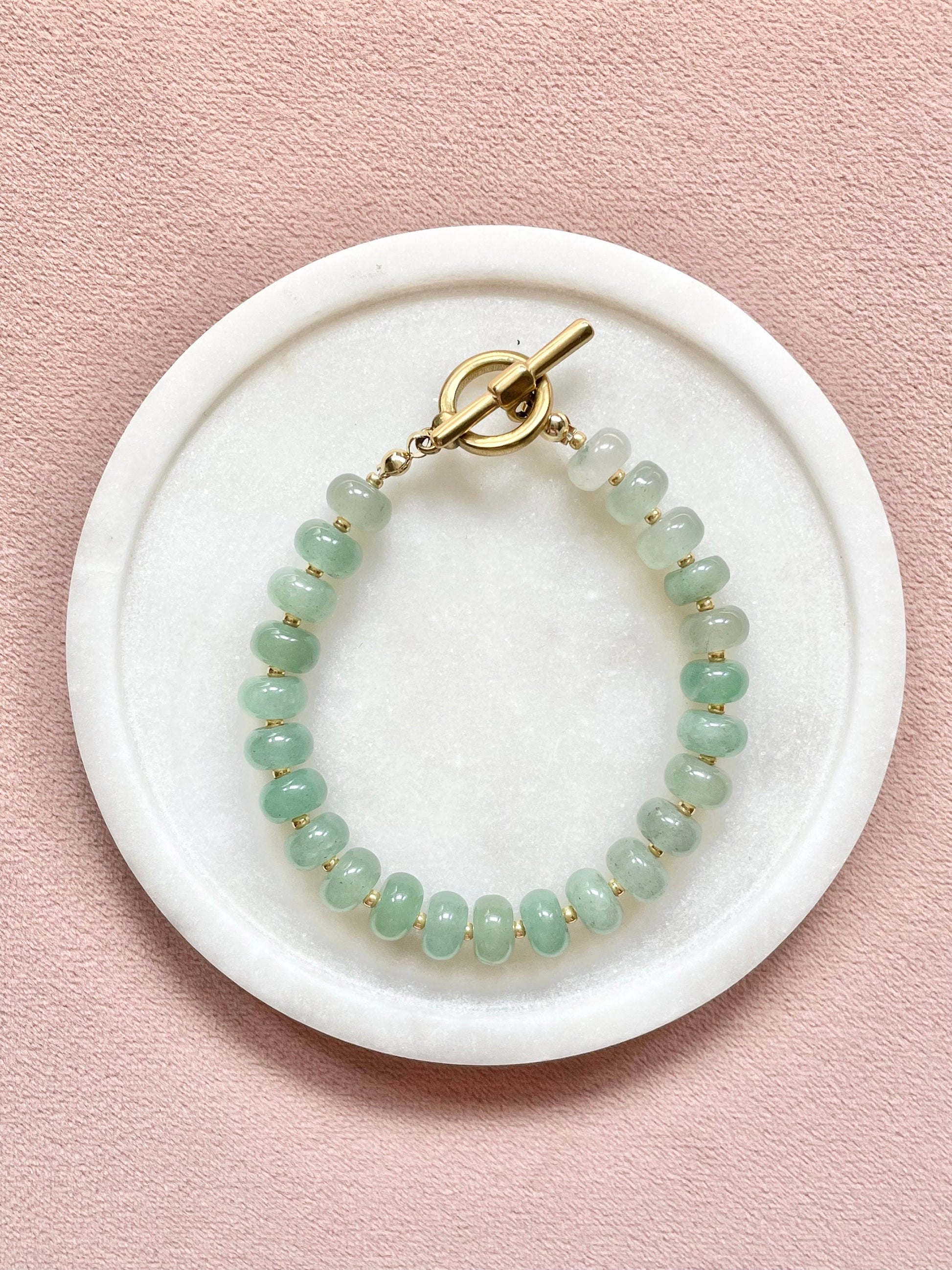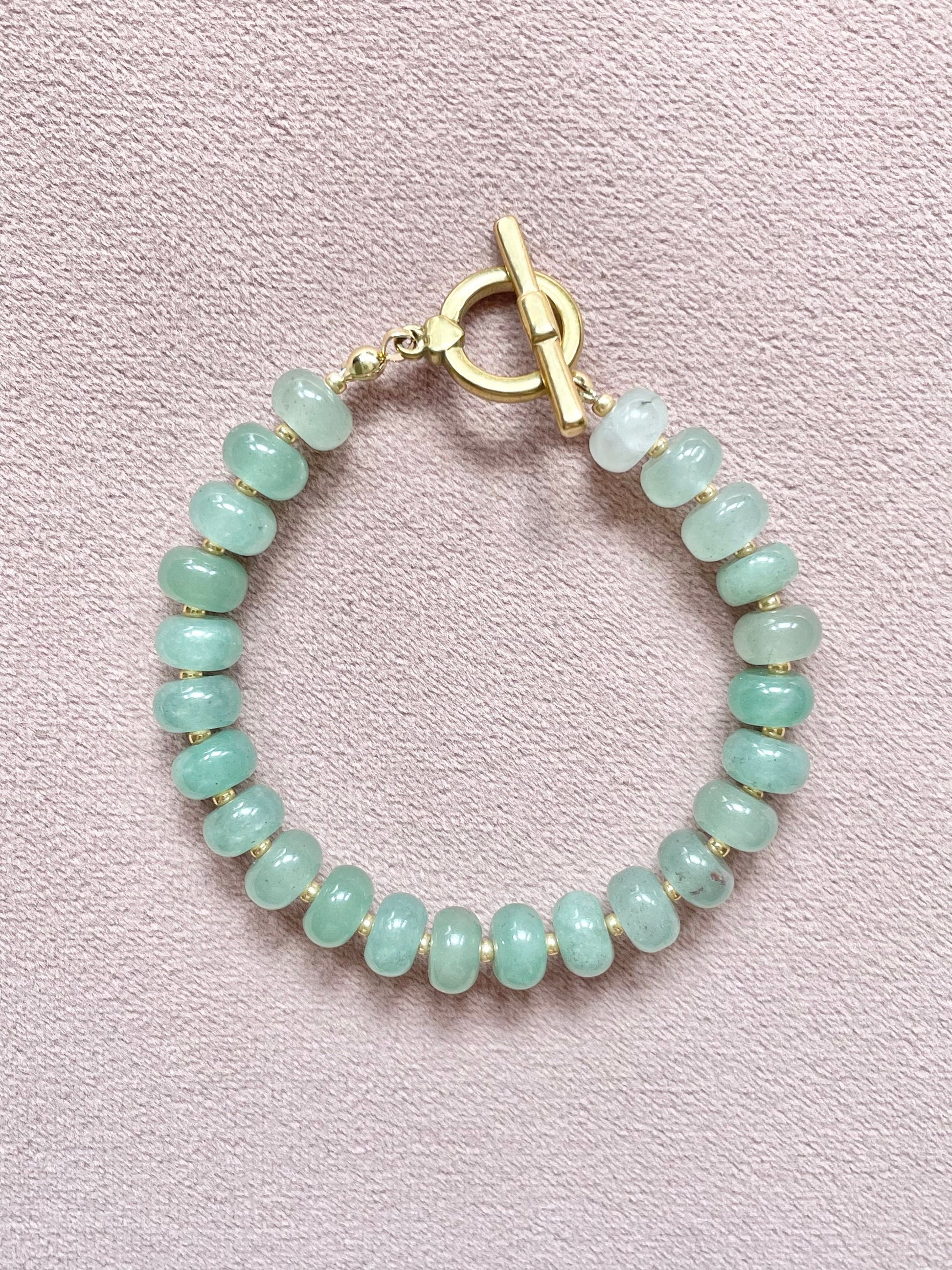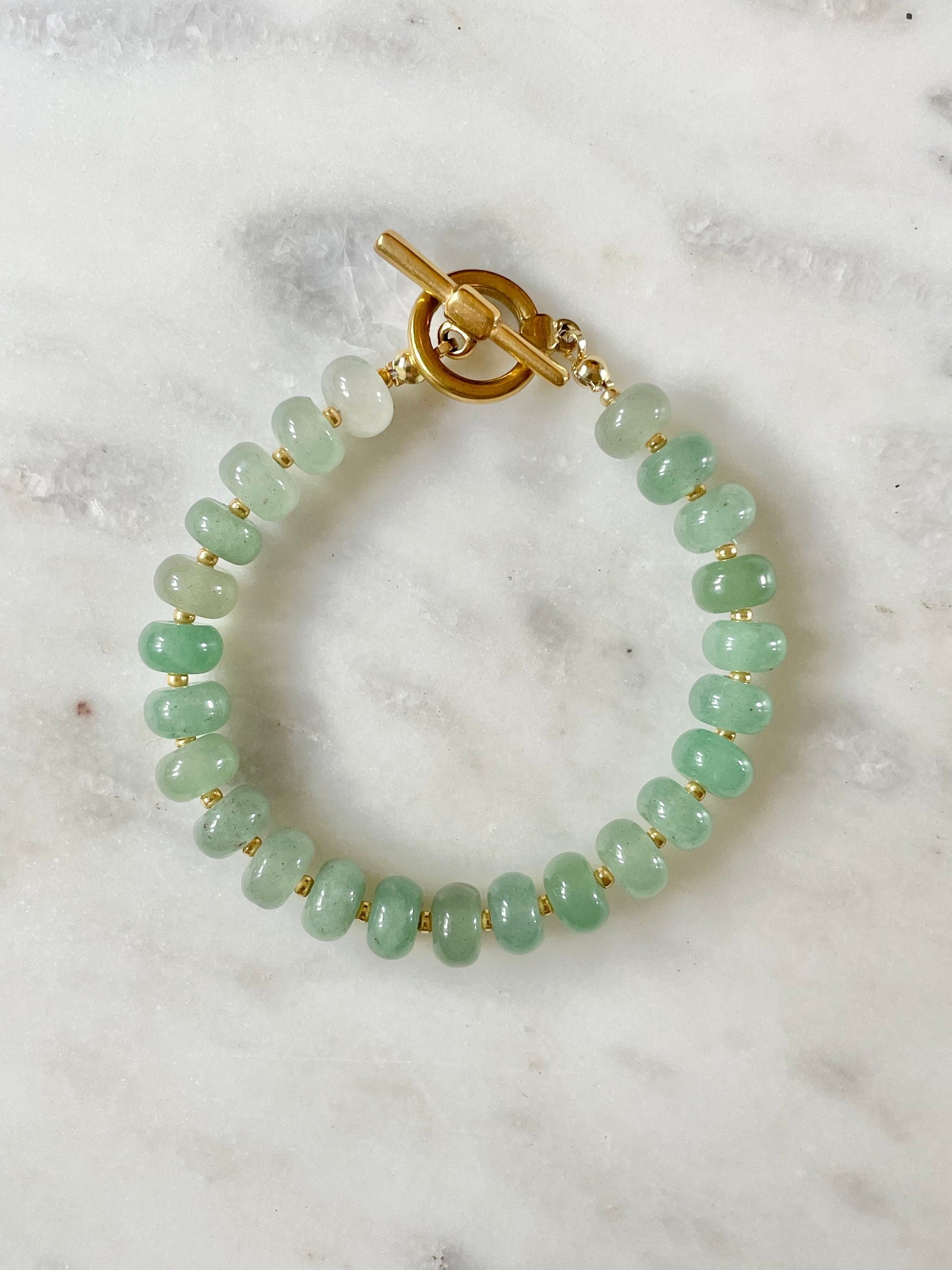 Green aventurine rondelle bracelet with gold miyuki spacer beads and gold plated / gold filled toggle clasp.