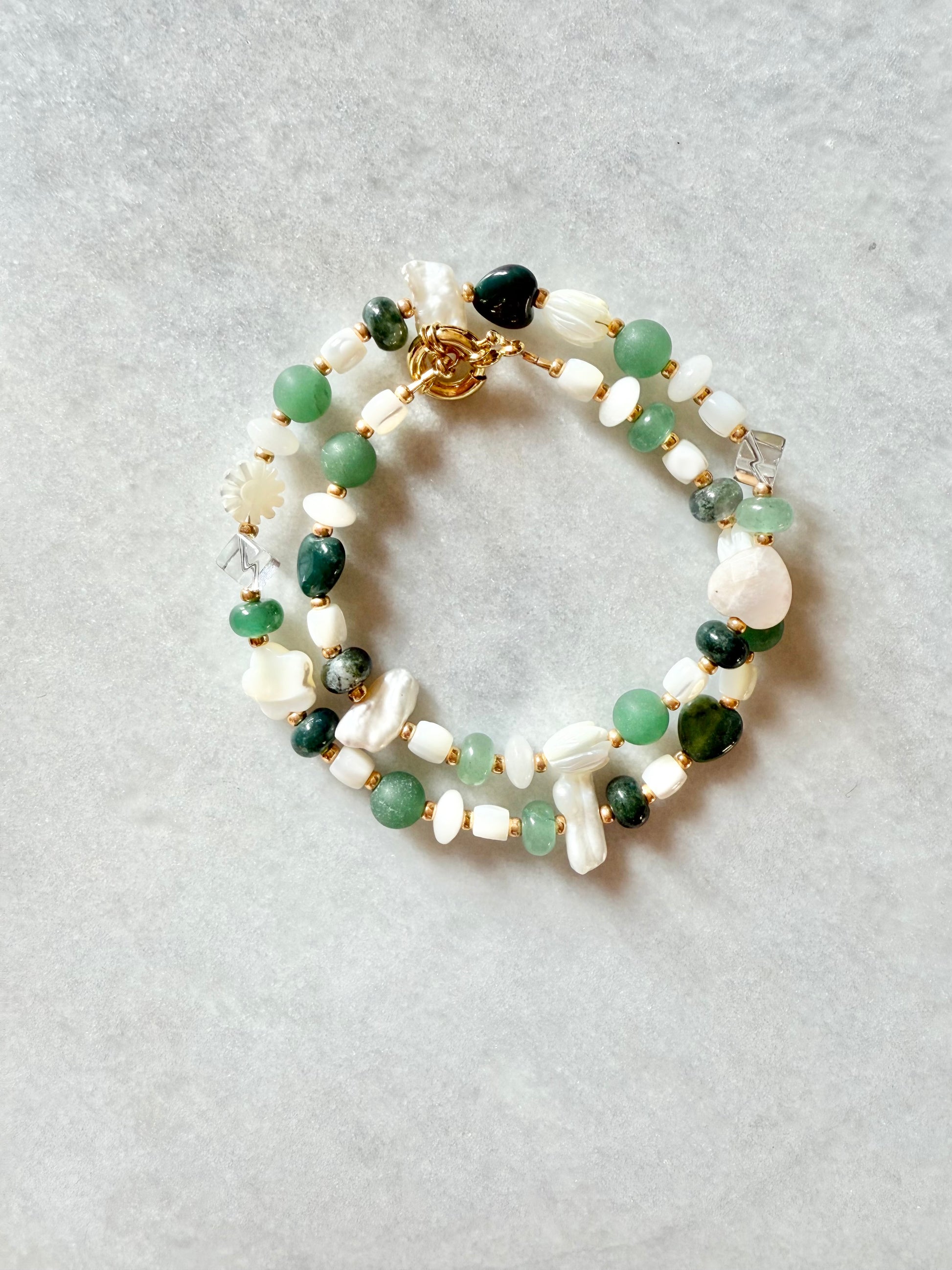 Agate, Aventurine, Moonstone, Clear Quartz, Jade, Biwa Pearl and Mother of Pearl.