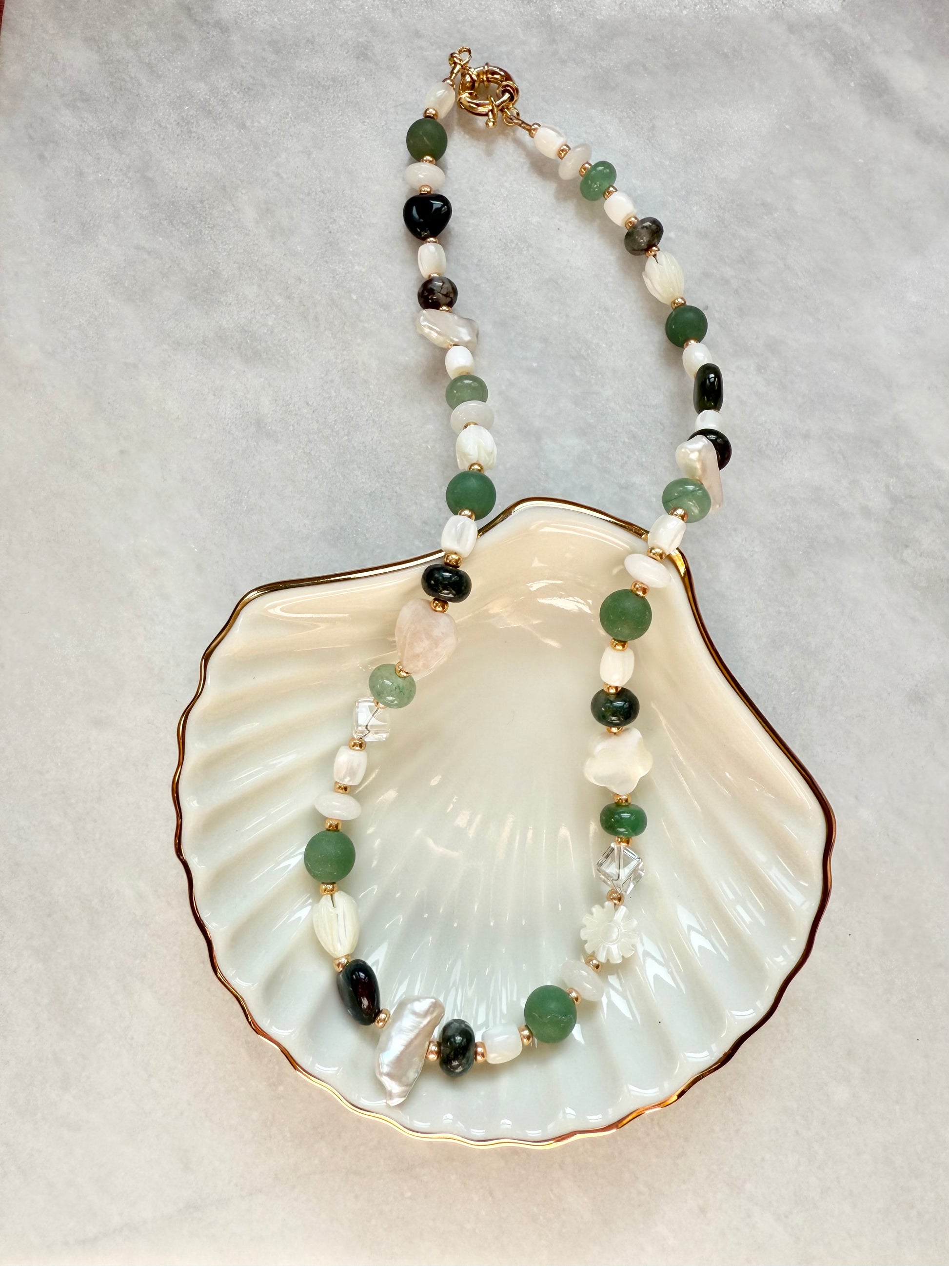 This necklace features a harmonious selection of semi-precious stones, such as: