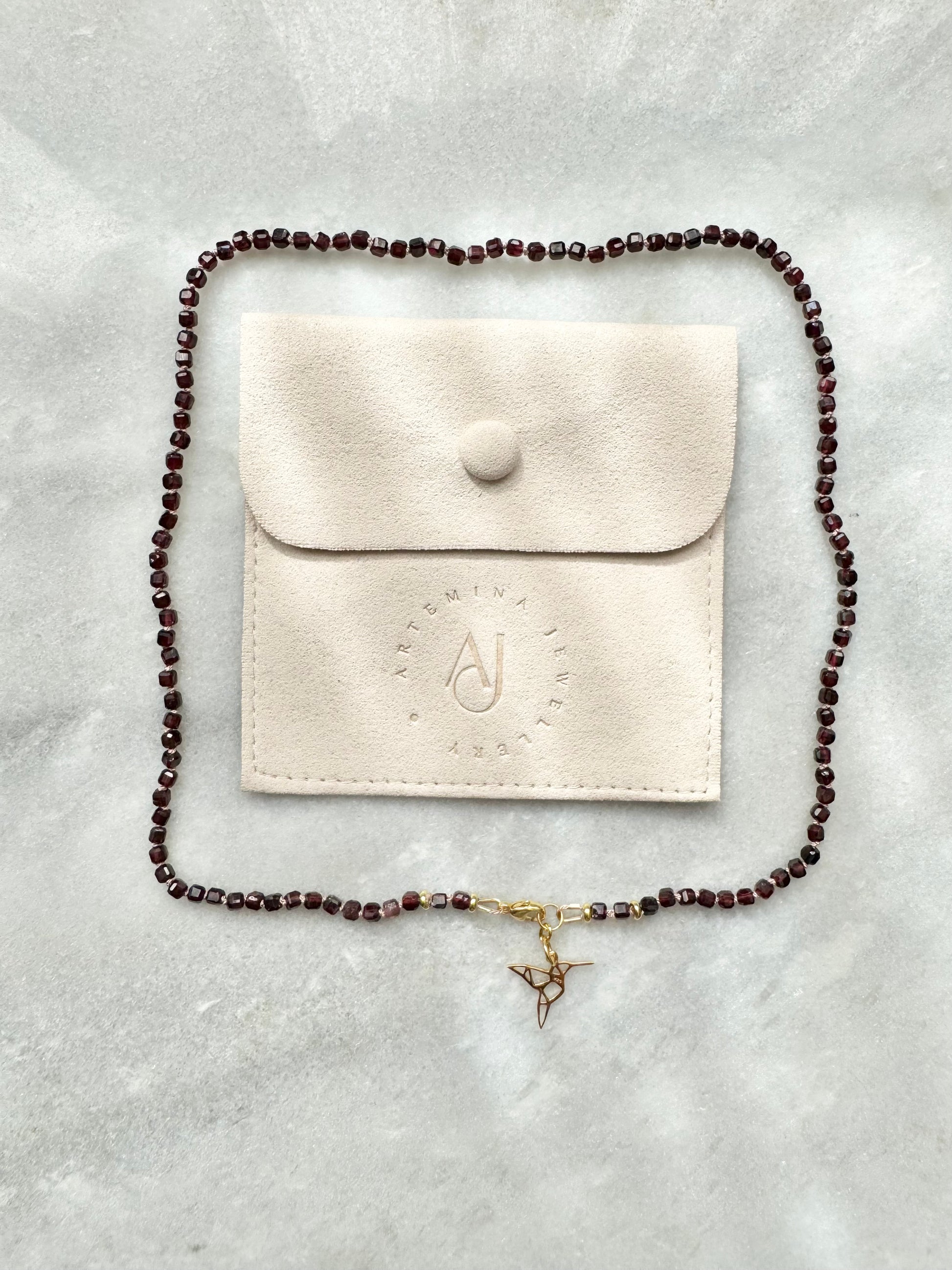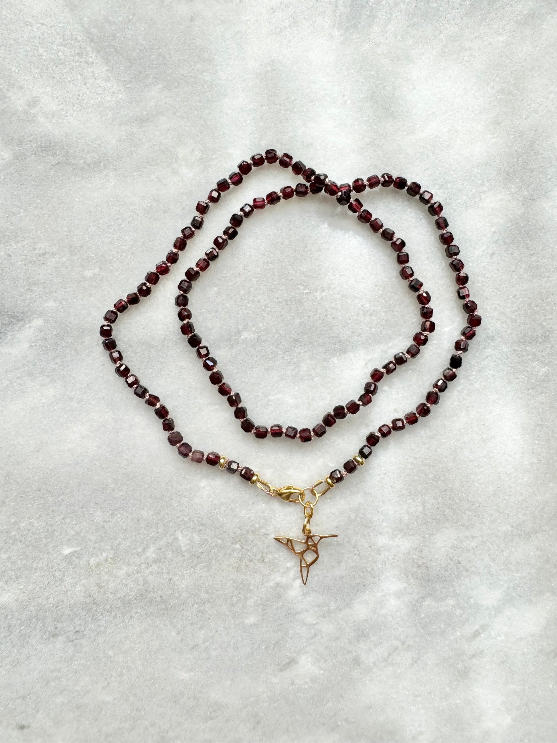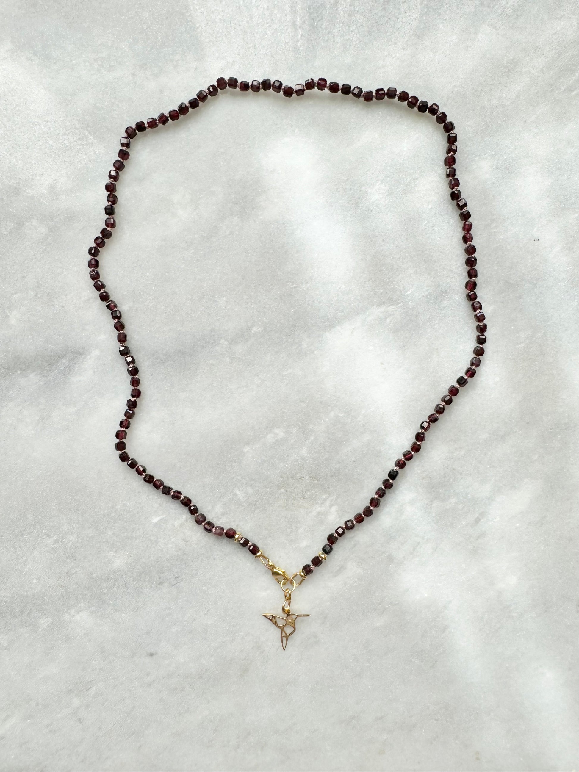 This necklace features garnet cubes, hand-knotted on a light pink silk thread, and finished with a gold vermeil clasp. A delicate gold vermeil hummingbird charm, symbolising joy and resilience, adds a beautiful accent.