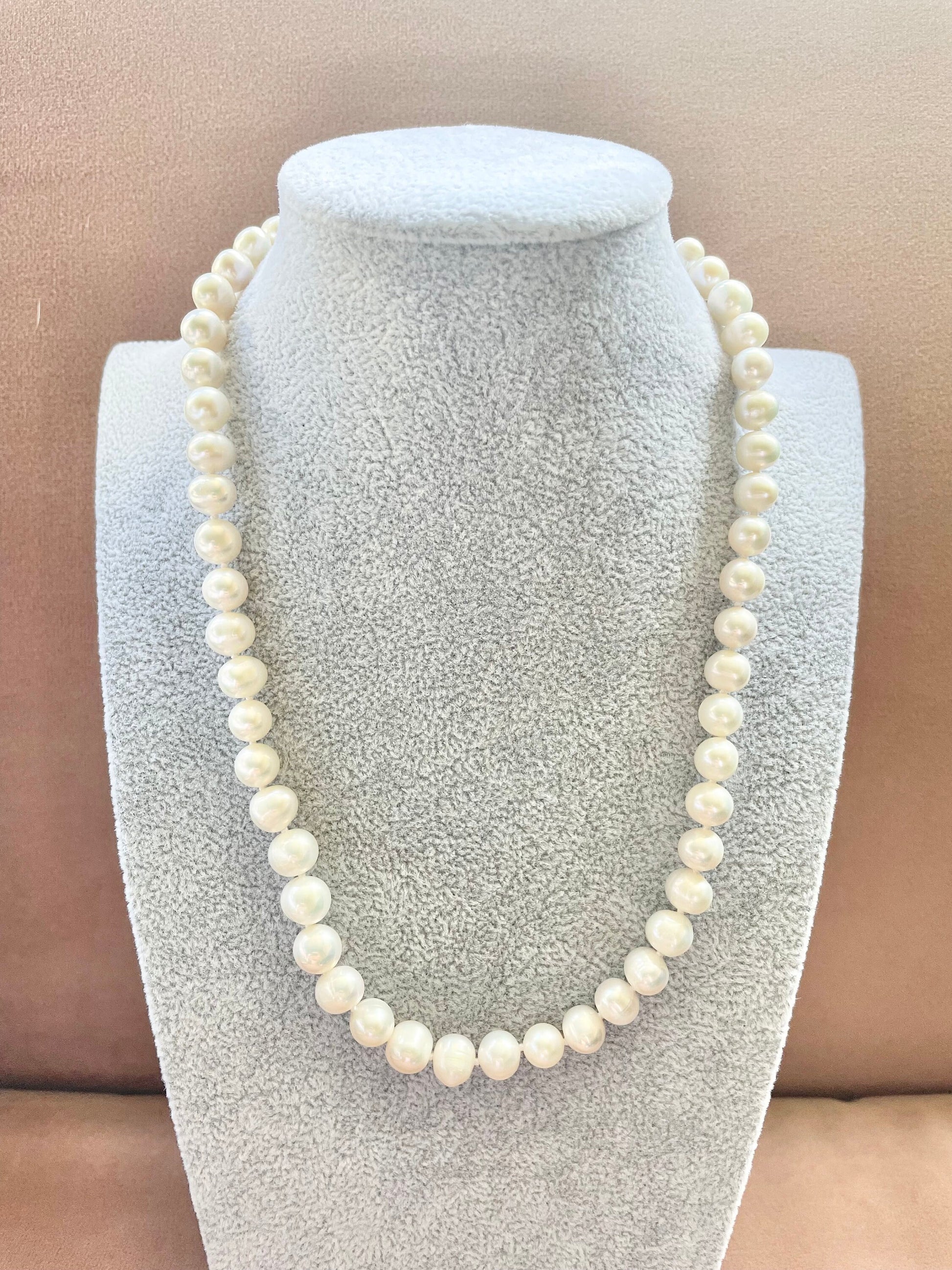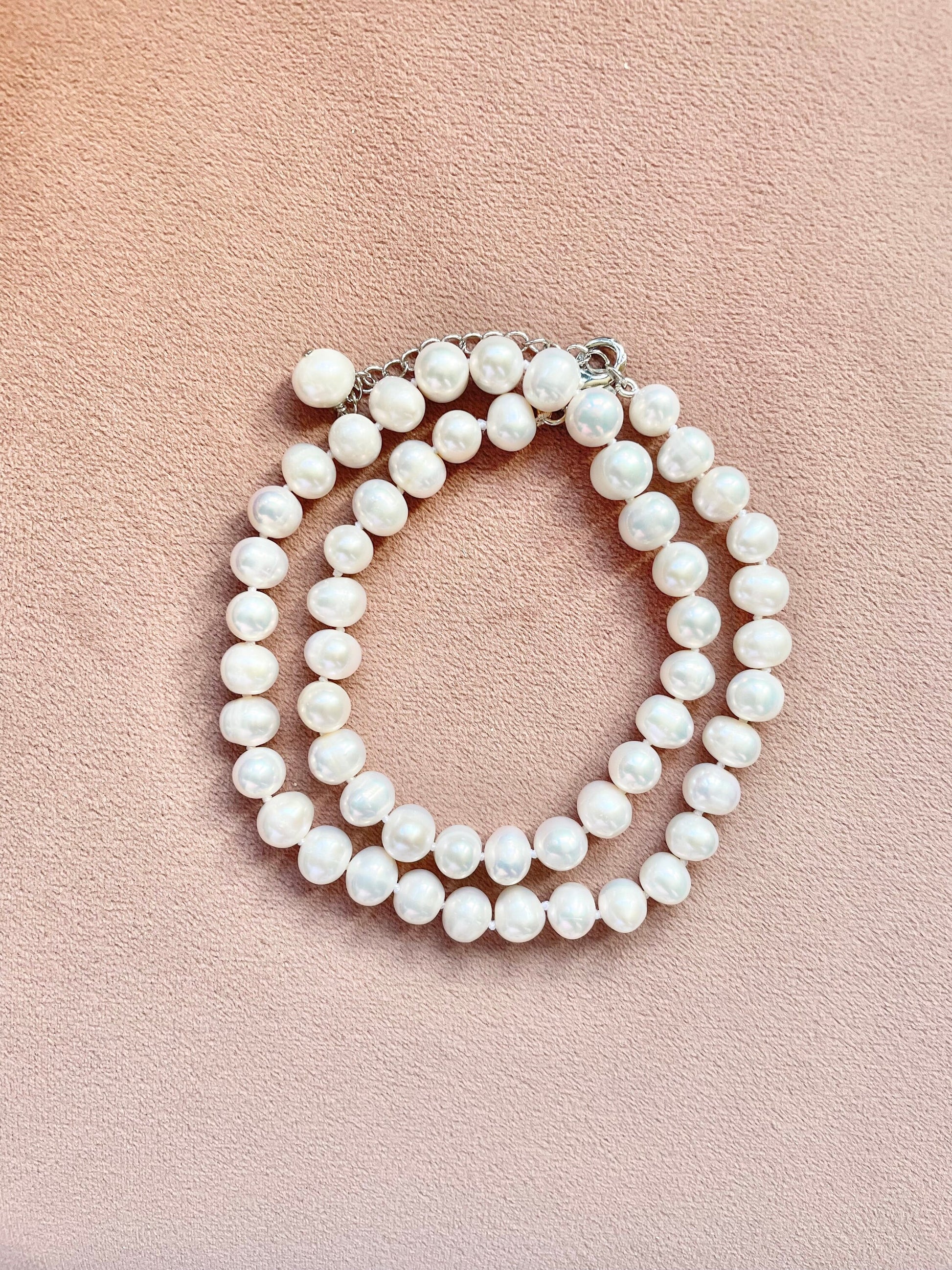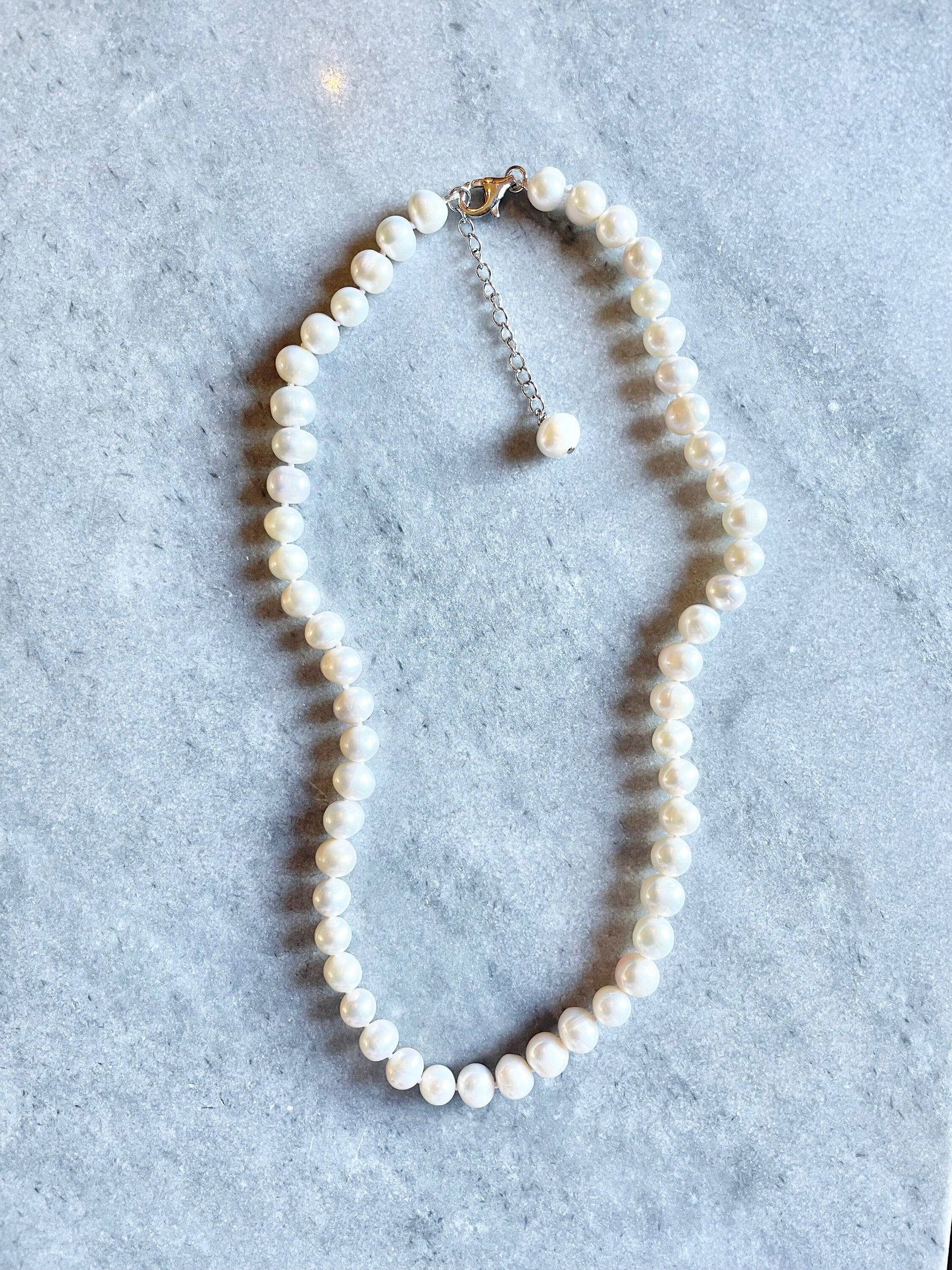 Semi-round freshwater pearls hand knotted on white silk thread, finished with a sterling silver lobster clasp and an extender chain.