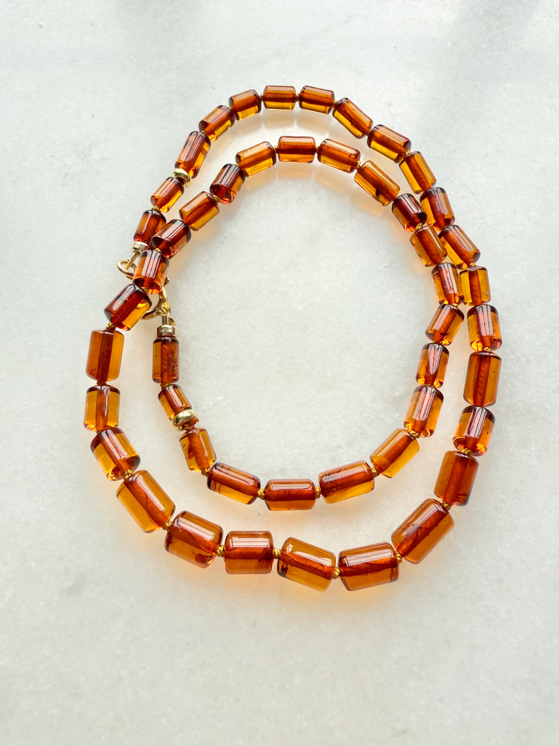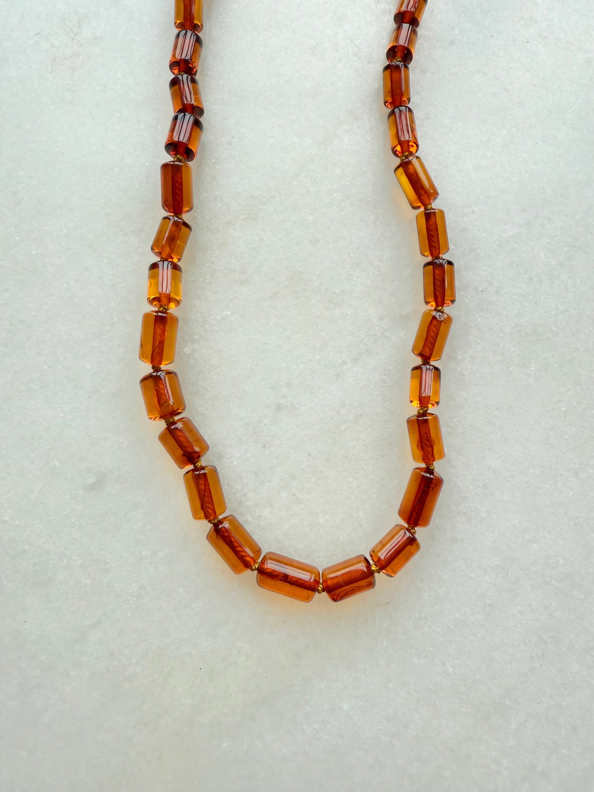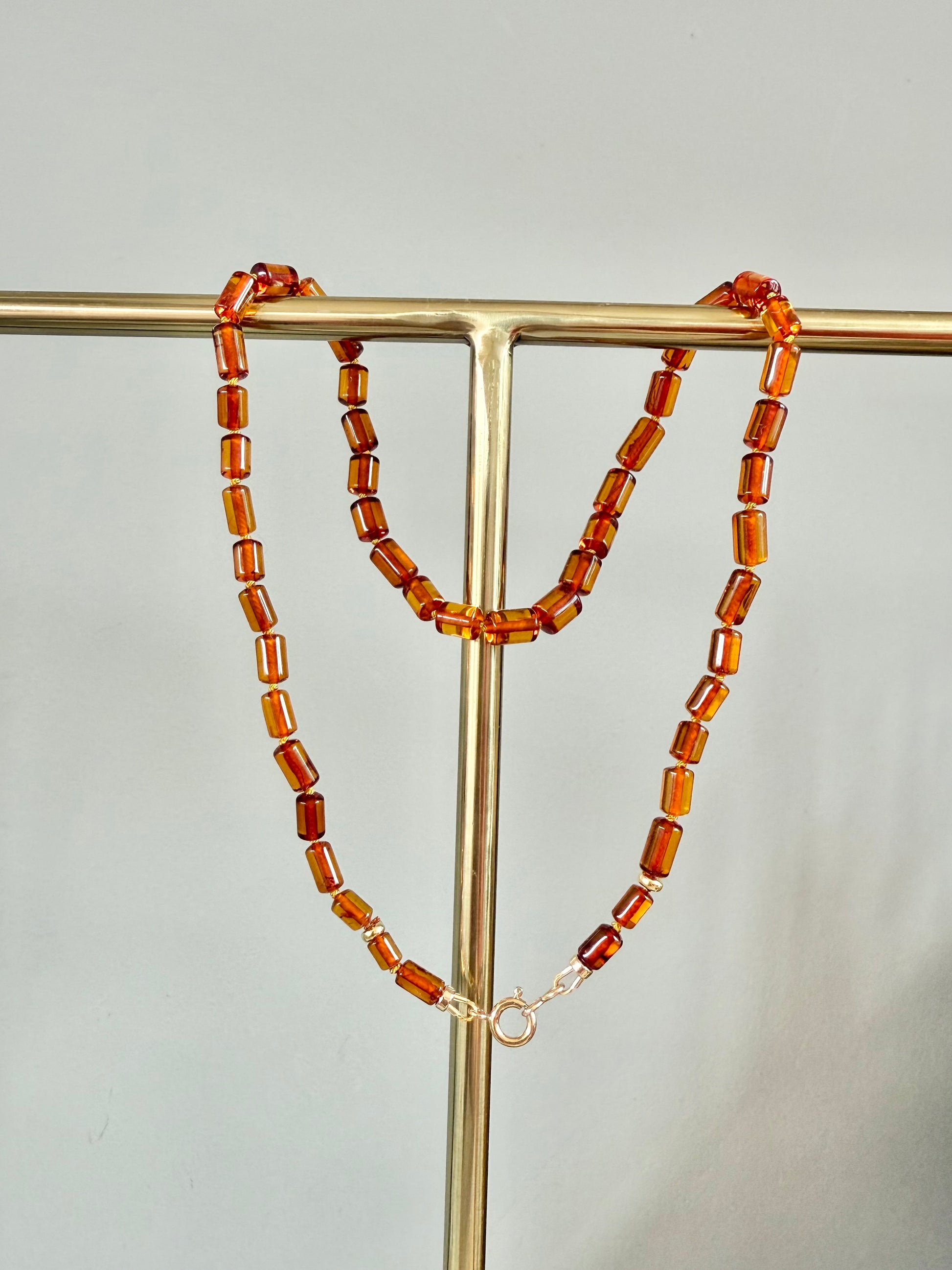 Warm and structured, this hand-knotted necklace features rich, cognac-toned Amber beads in a smooth barrel shape. Each bead glows with deep golden-brown hues, catching the light with subtle clarity.