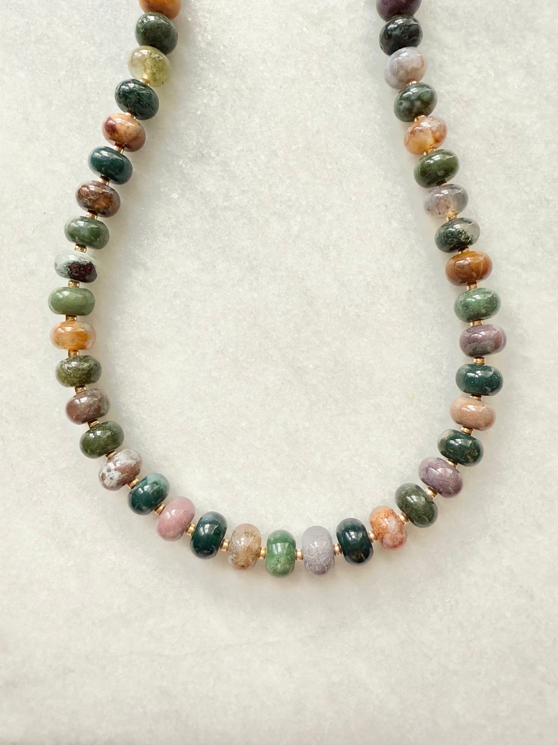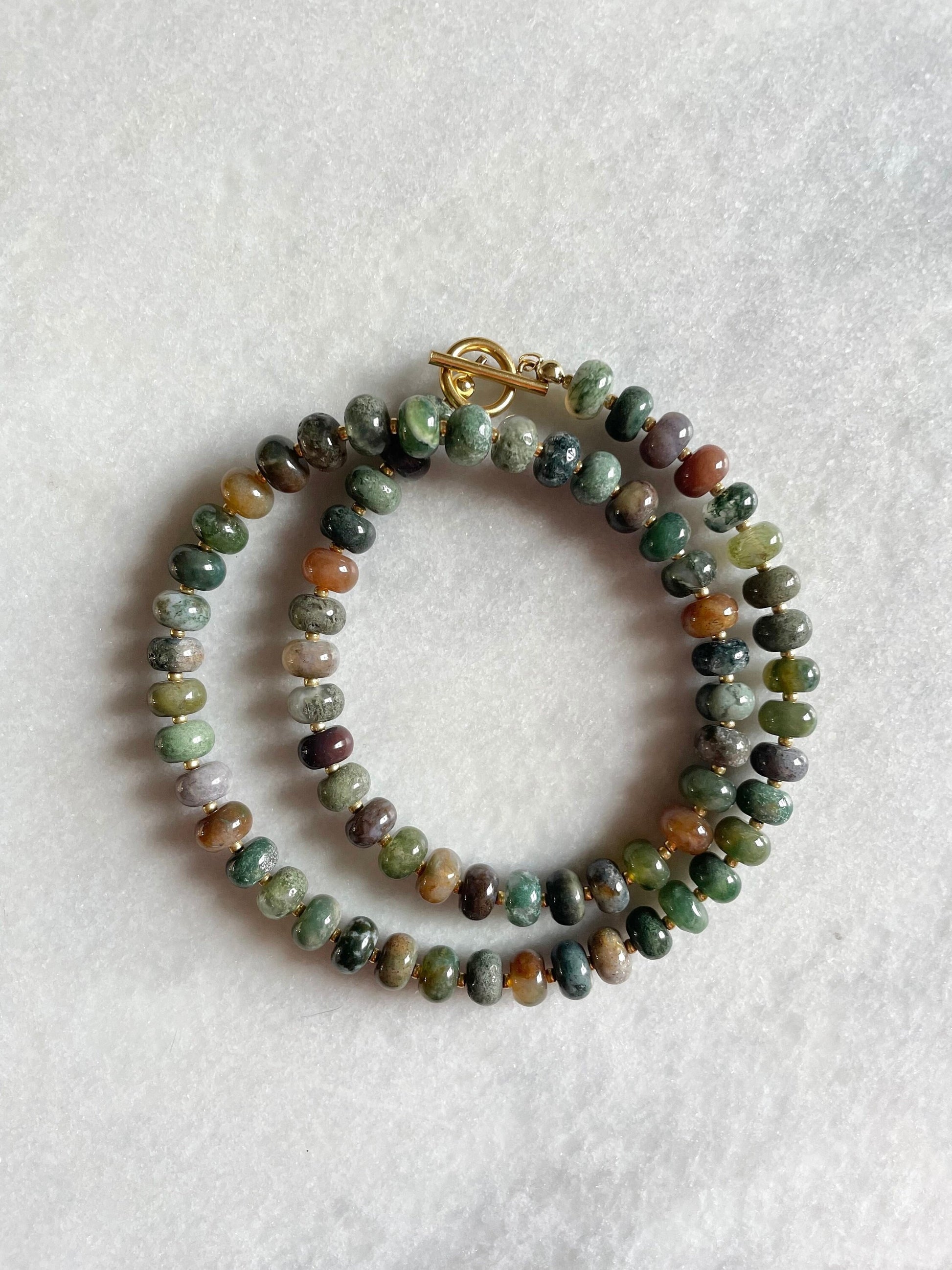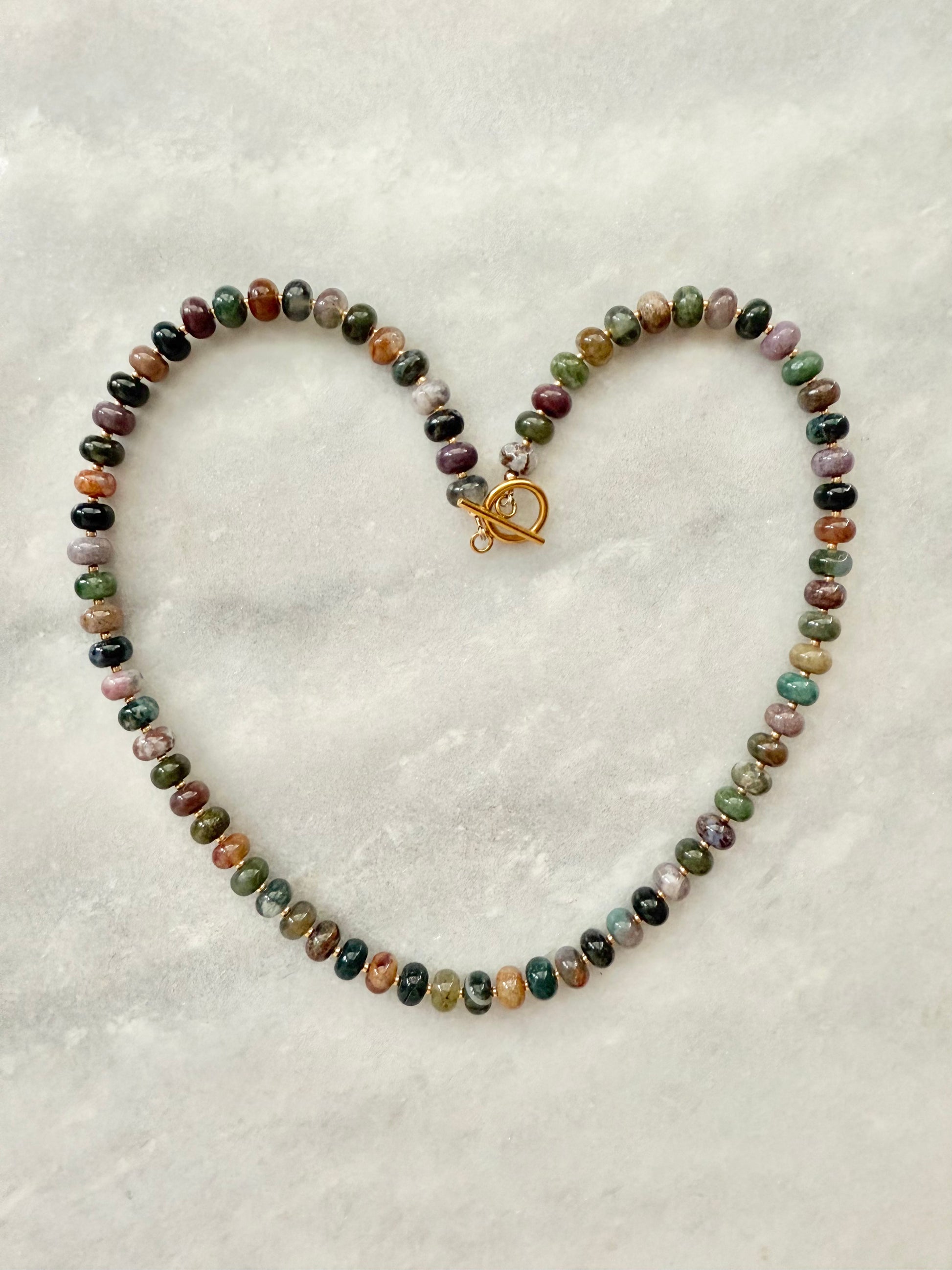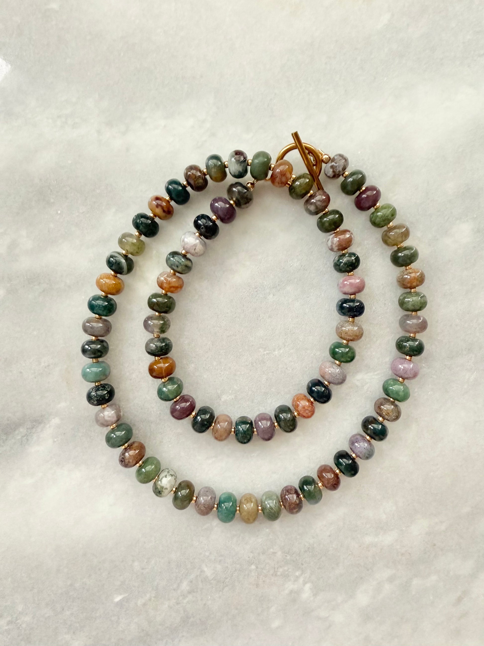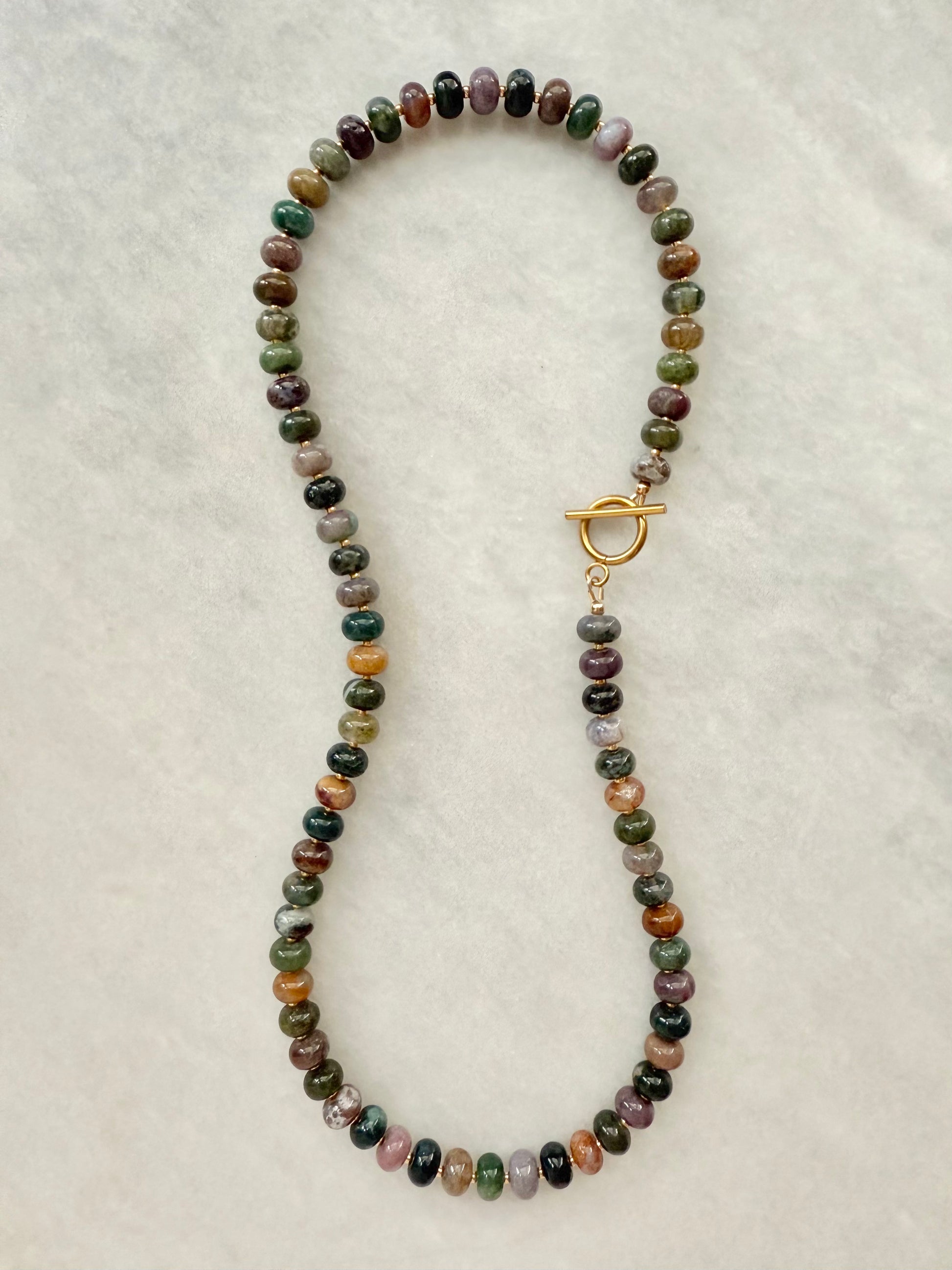 This necklace features Indian Agate gemstone rondelles, accented with delicate Japanese Miyuki seed beads for a subtle contrast in texture and tone. Finished with a gold-plated stainless steel toggle clasp, it’s both elegant and easy to wear.