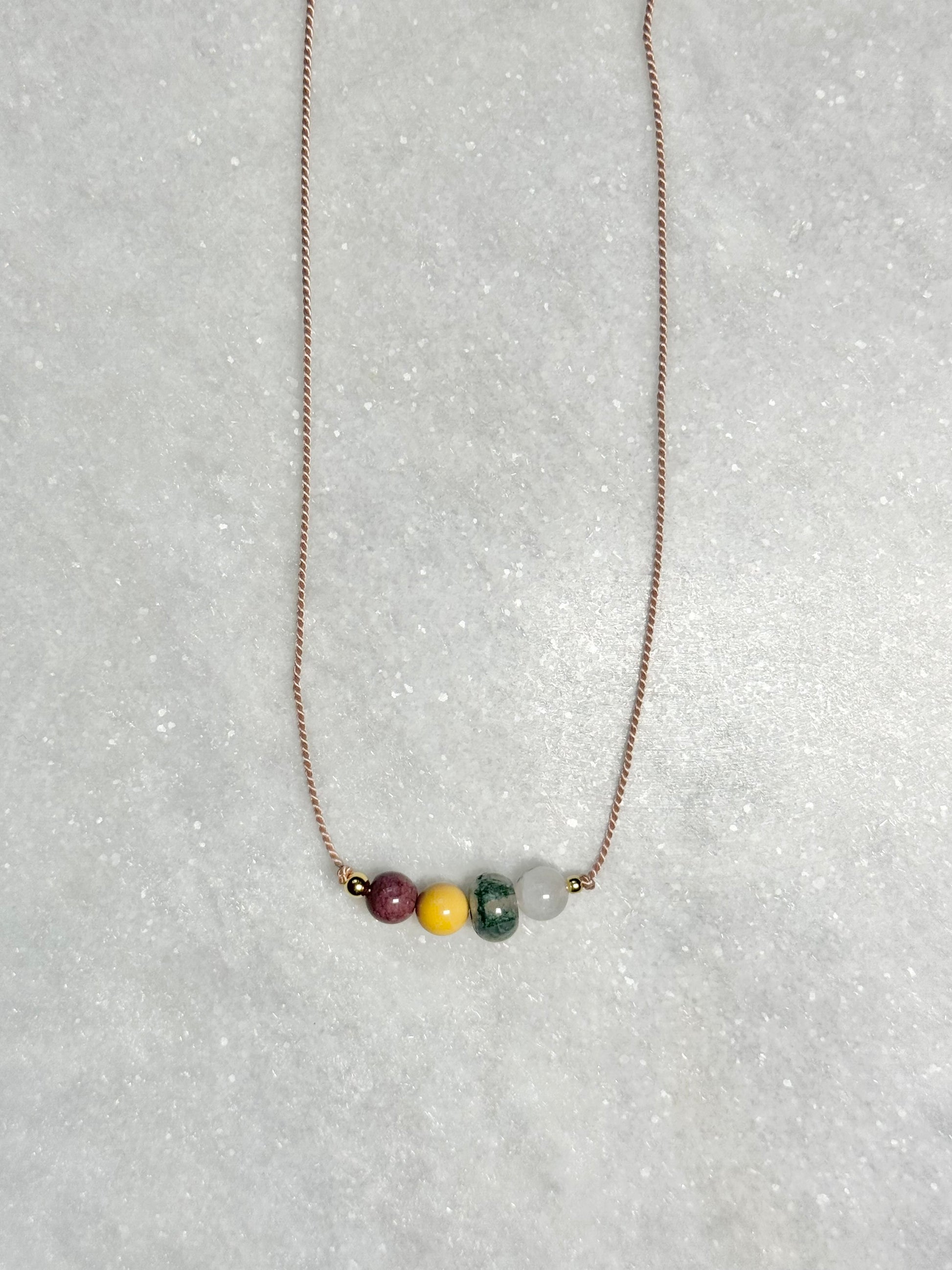 This pendant necklace showcases jasper, moonstone, and moss agate, symbolising grounding, intuition, and growth for September.
