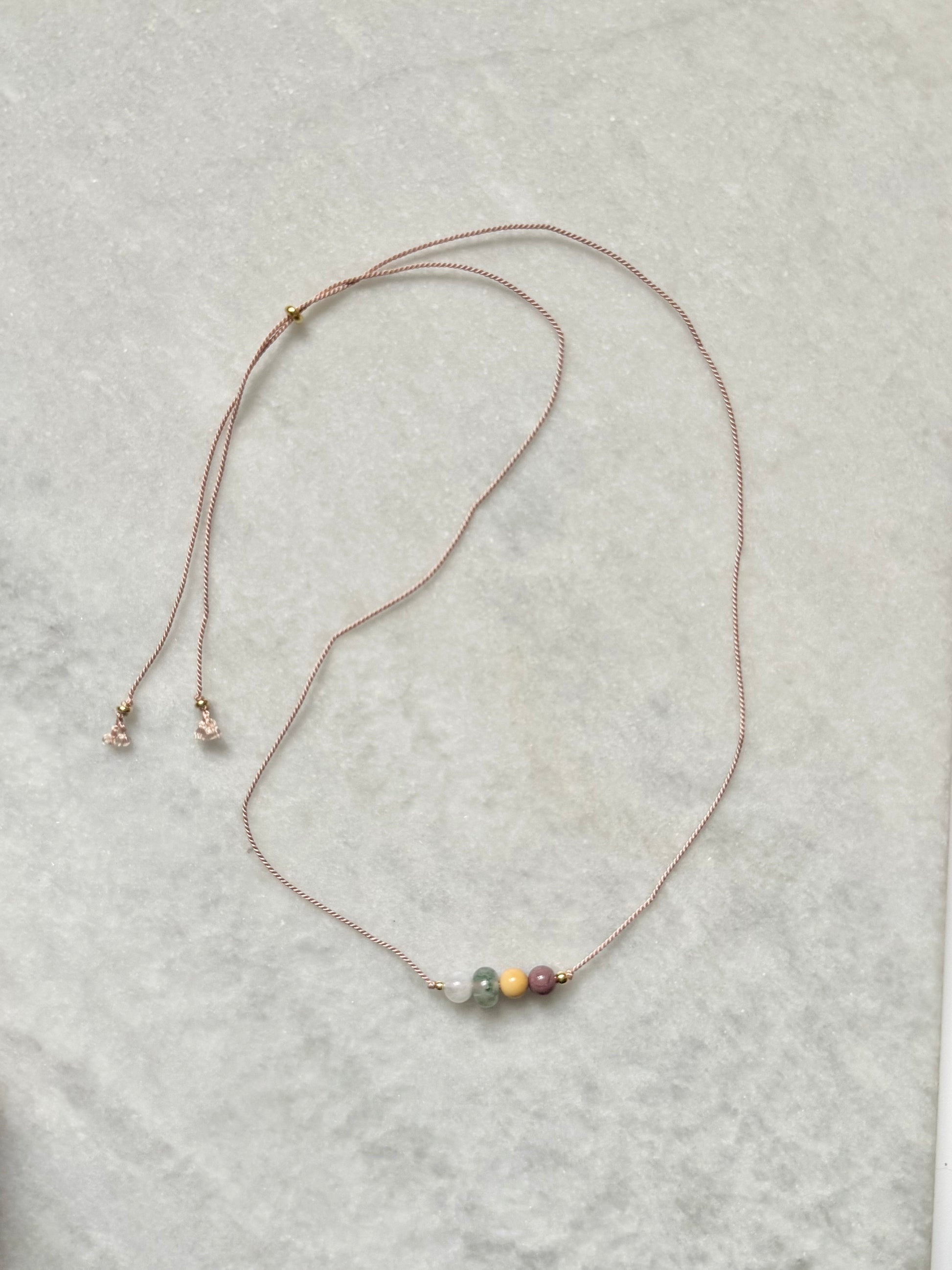 Each necklace is carefully accented with gold vermeil beads and threaded on a soft, adjustable silk cord for both comfort and style.