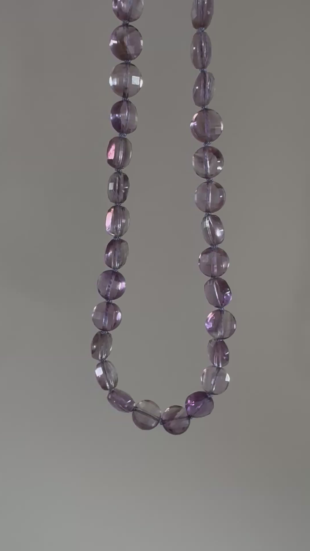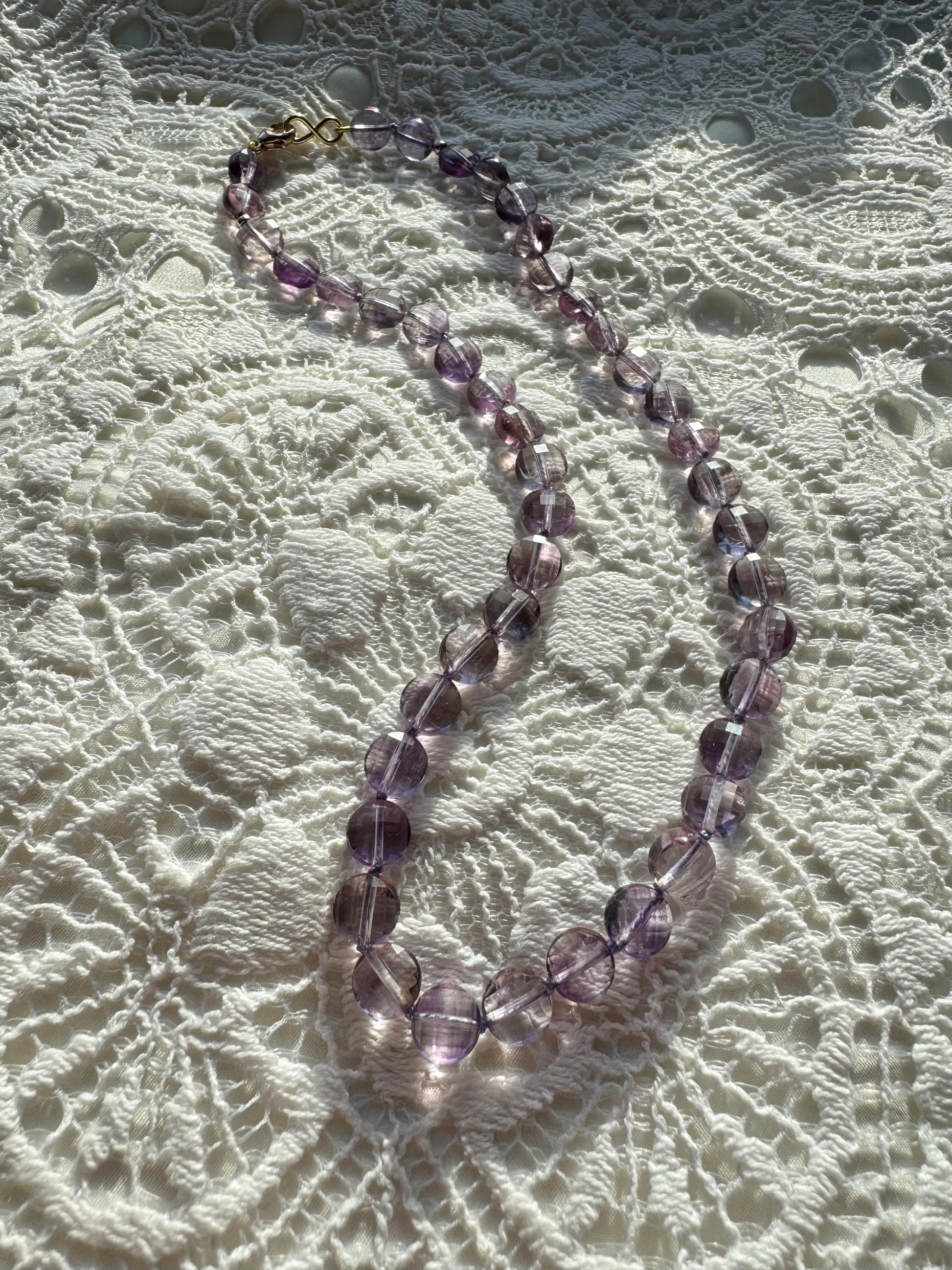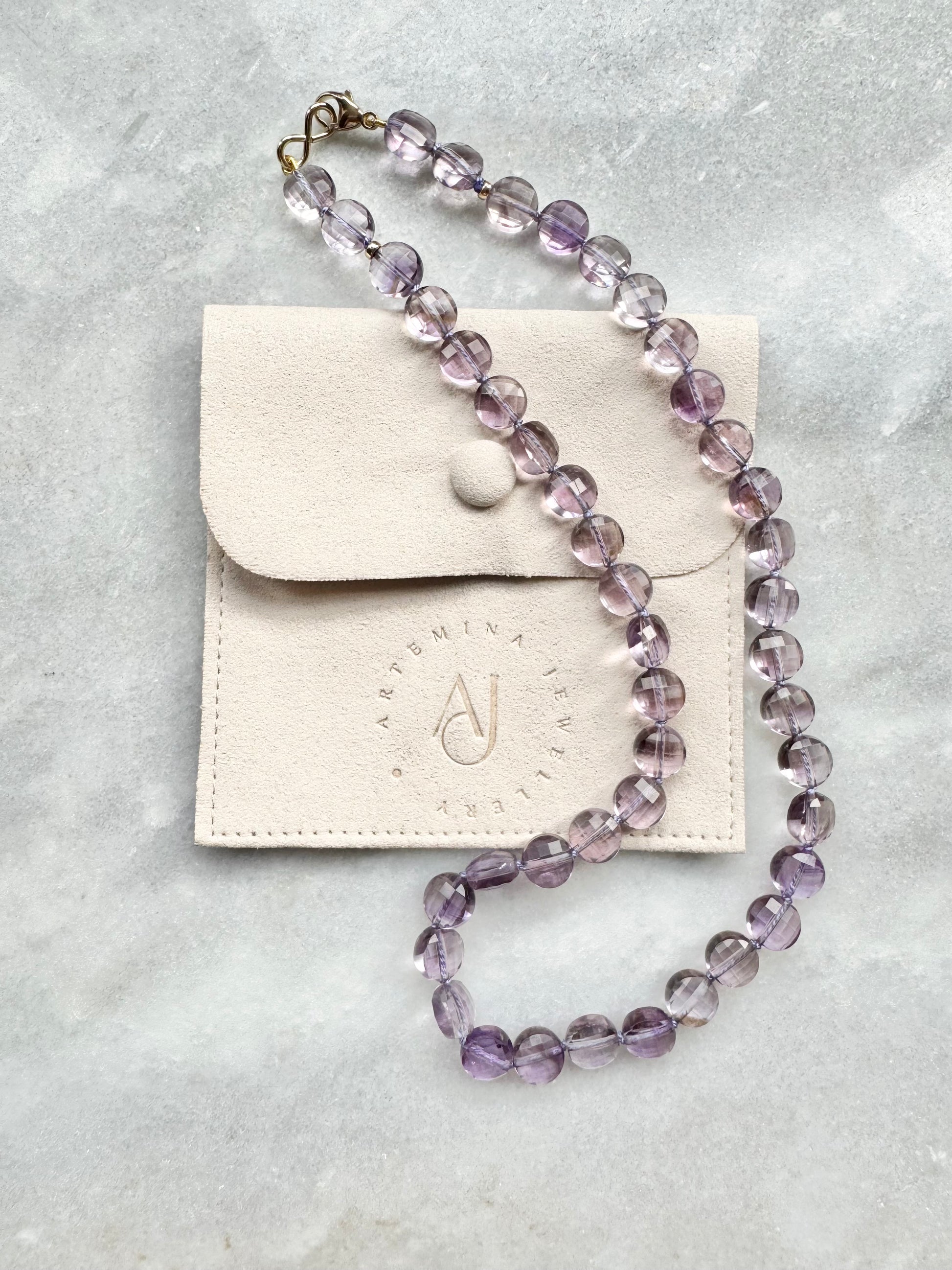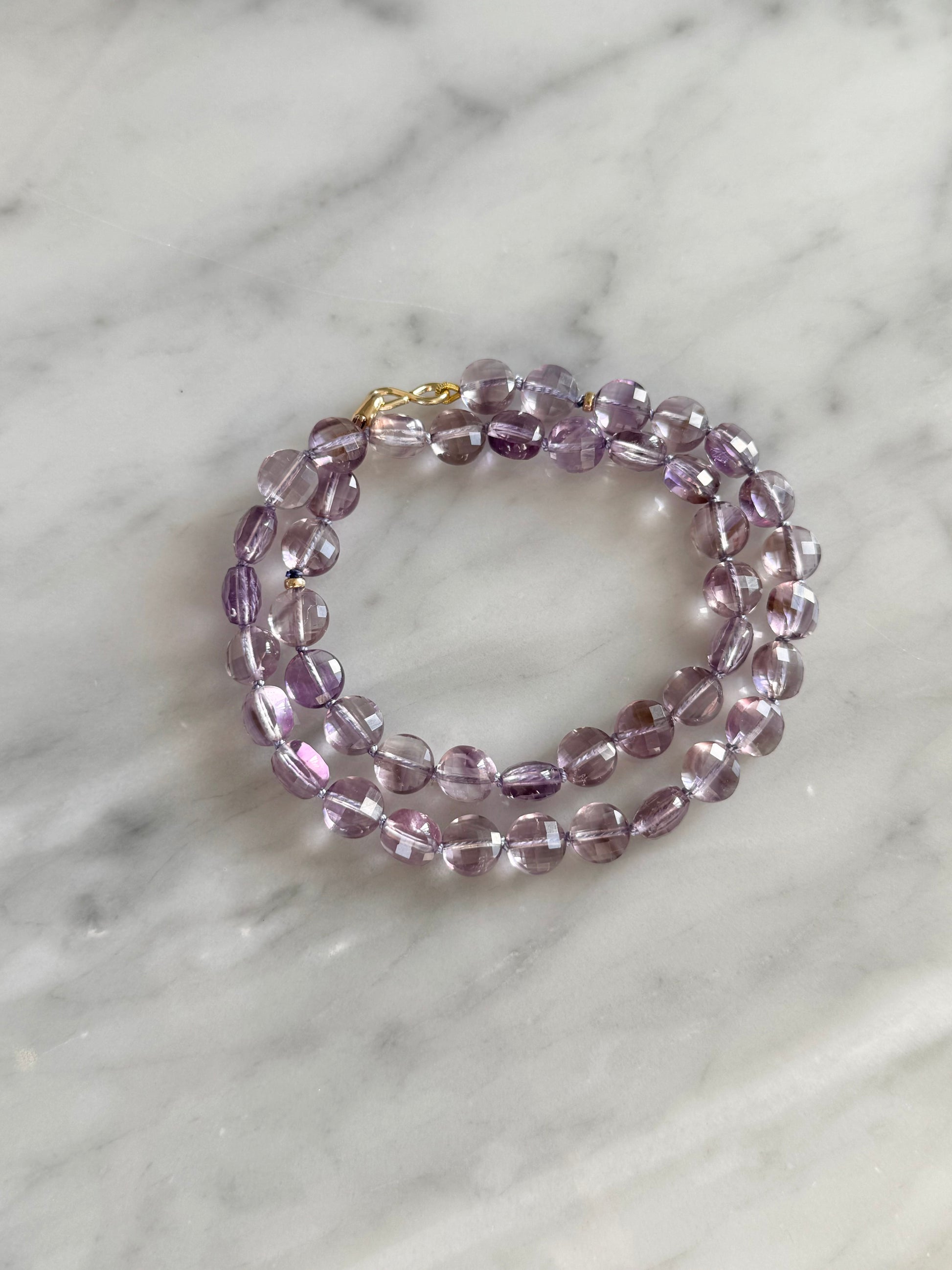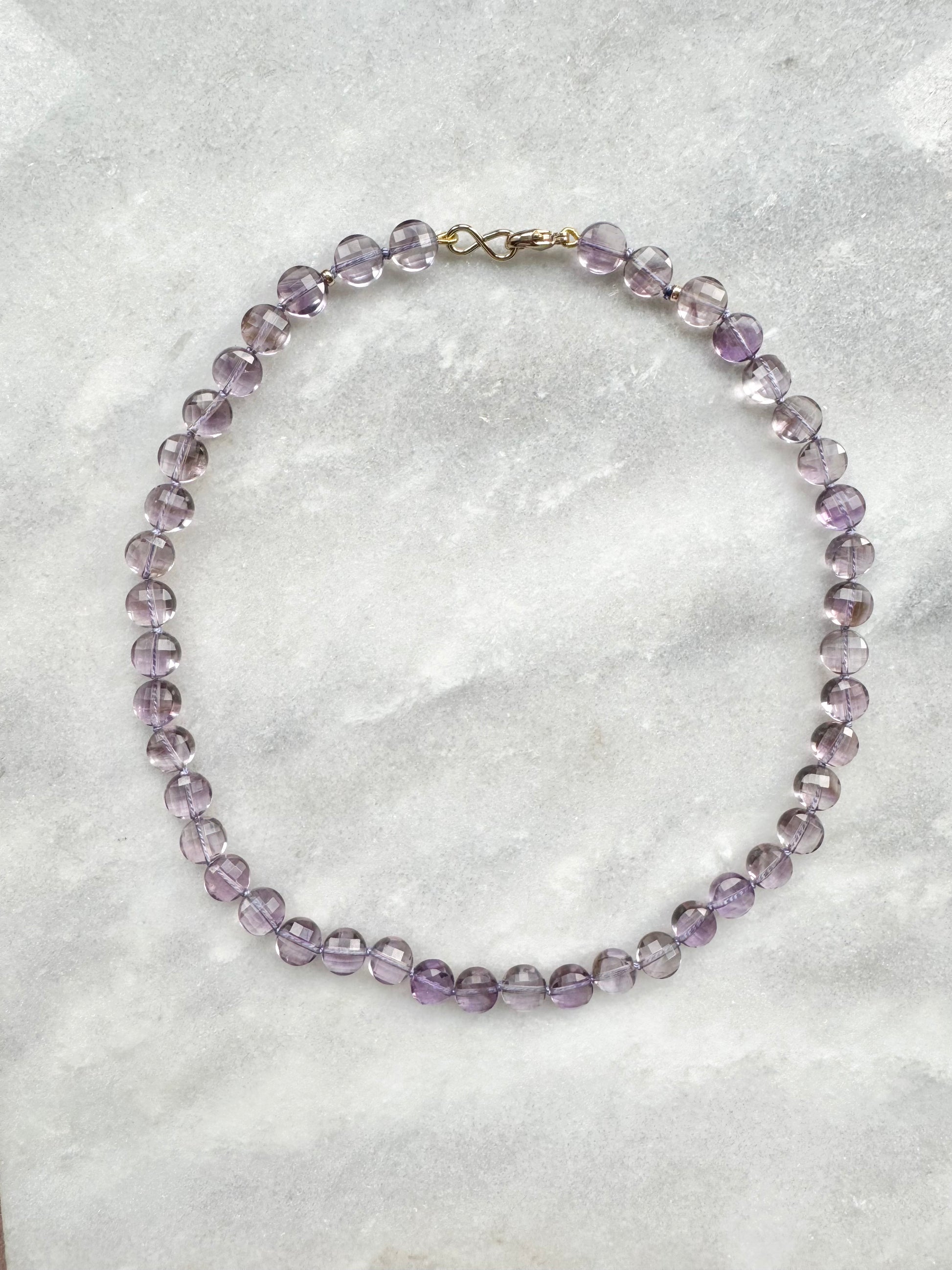 Discover the elegance of this hand-knotted amethyst necklace. The beautiful amethyst coins are strung on lilac silk thread, adding a soft, elegant touch to the design. Finished with a gold-filled clasp, this necklace is both sophisticated and versatile, perfect for day-to-night wear.