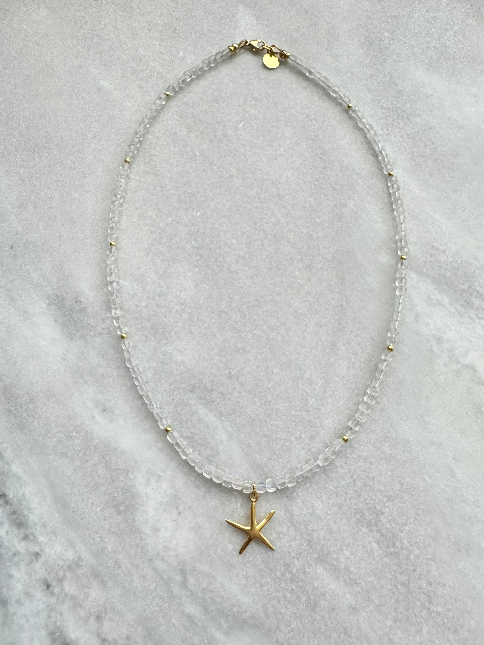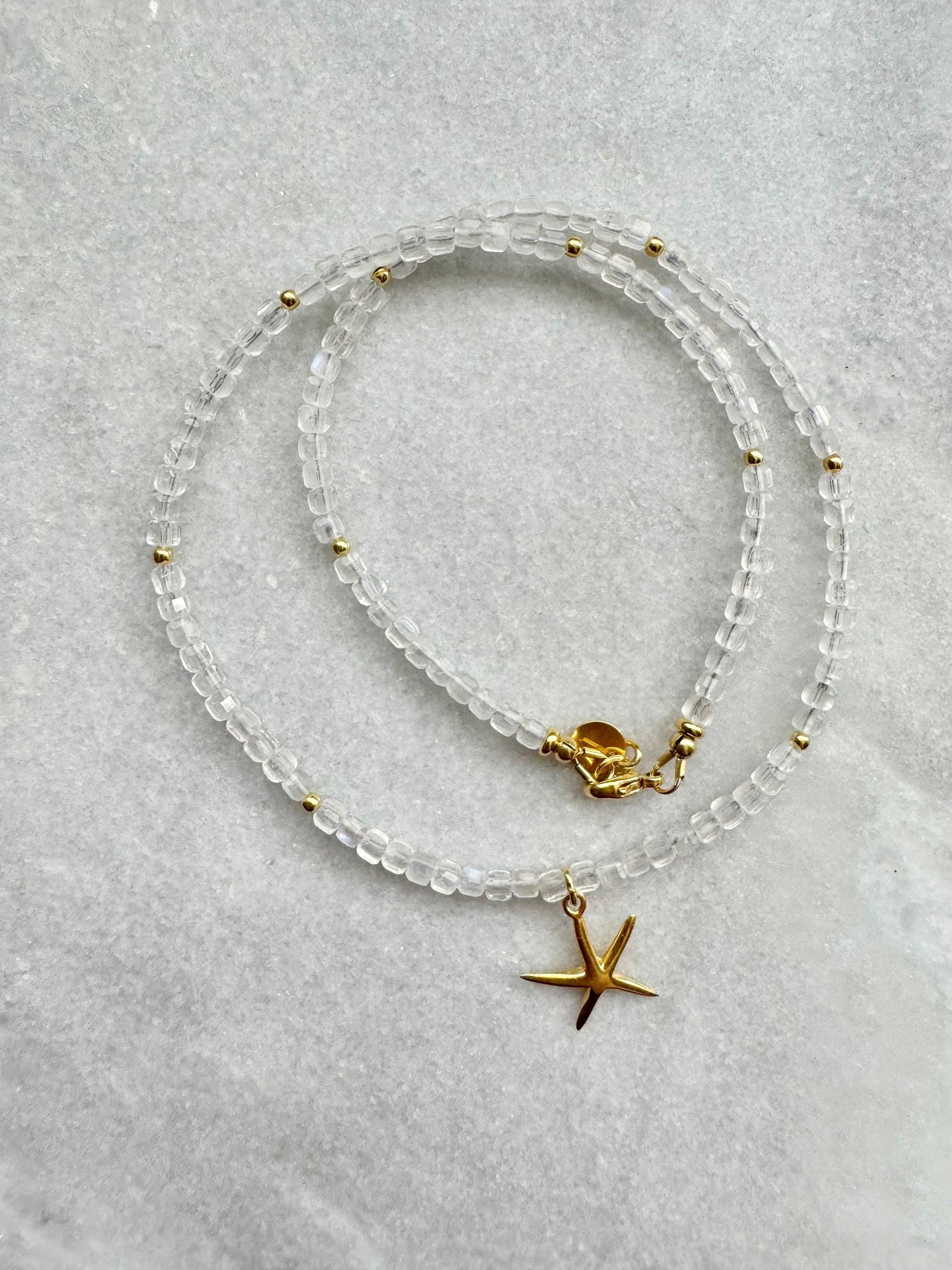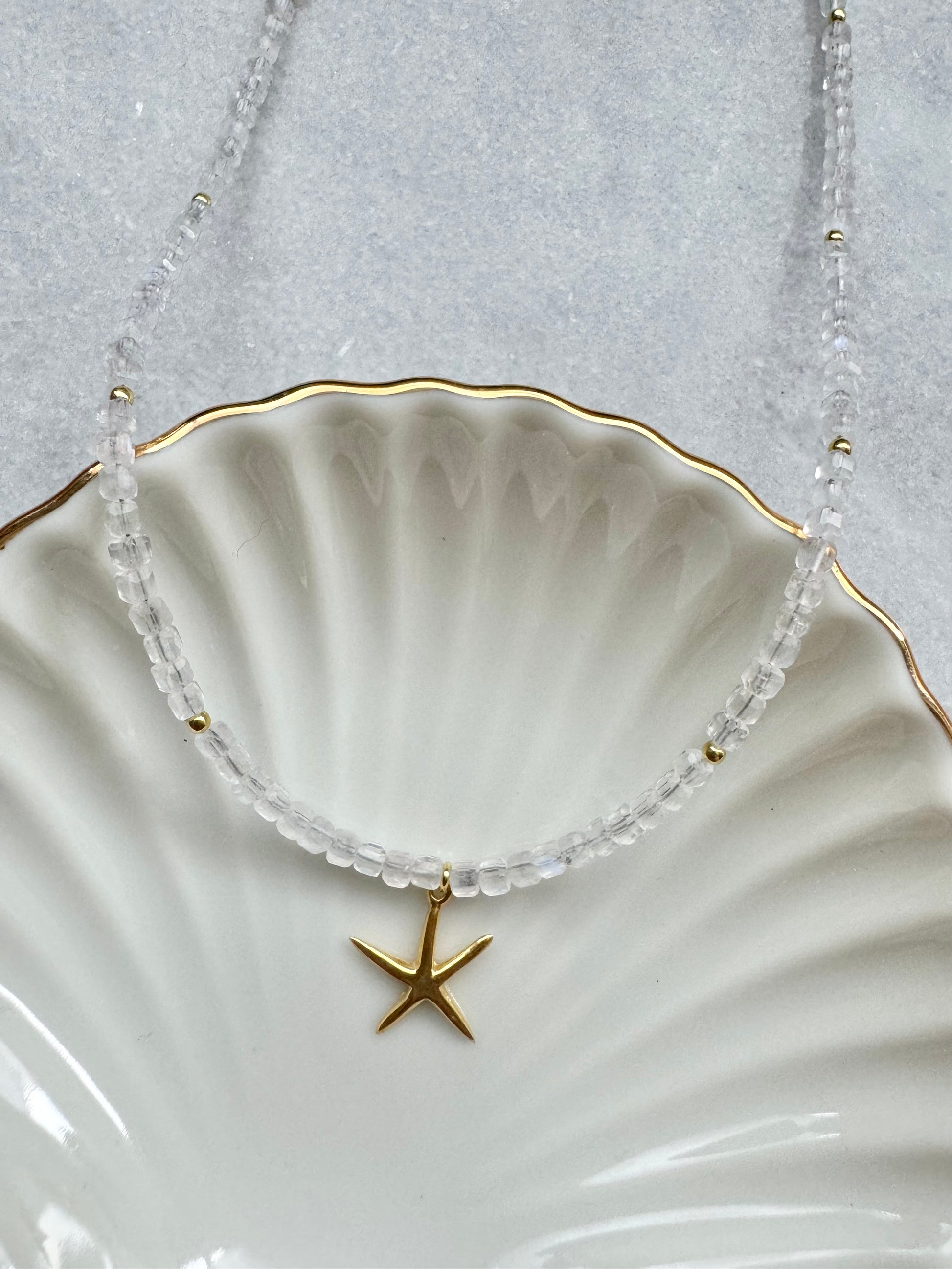 This necklace is made of Moonstone cubes and finished with gold vermeil details and a starfish charm.