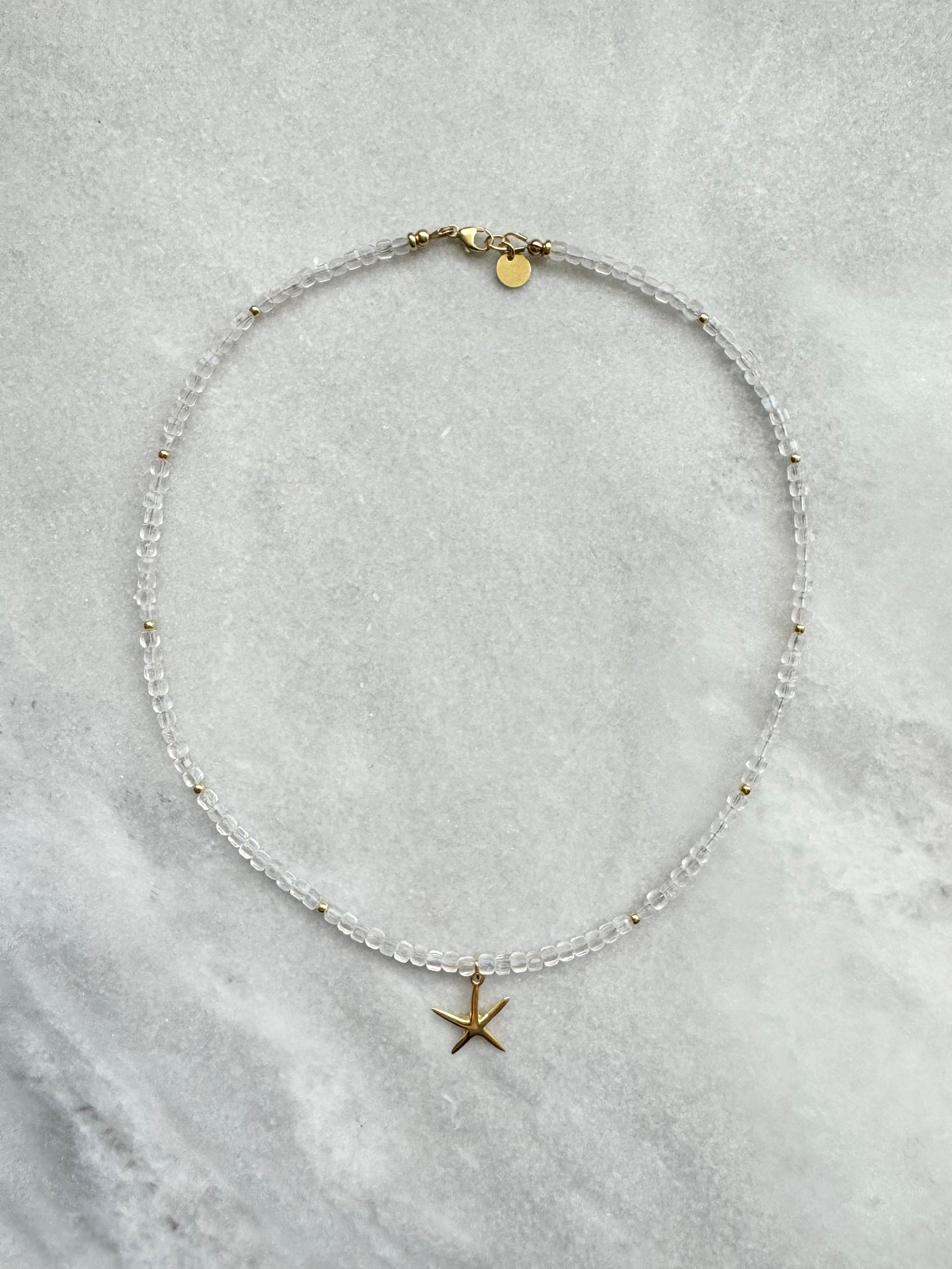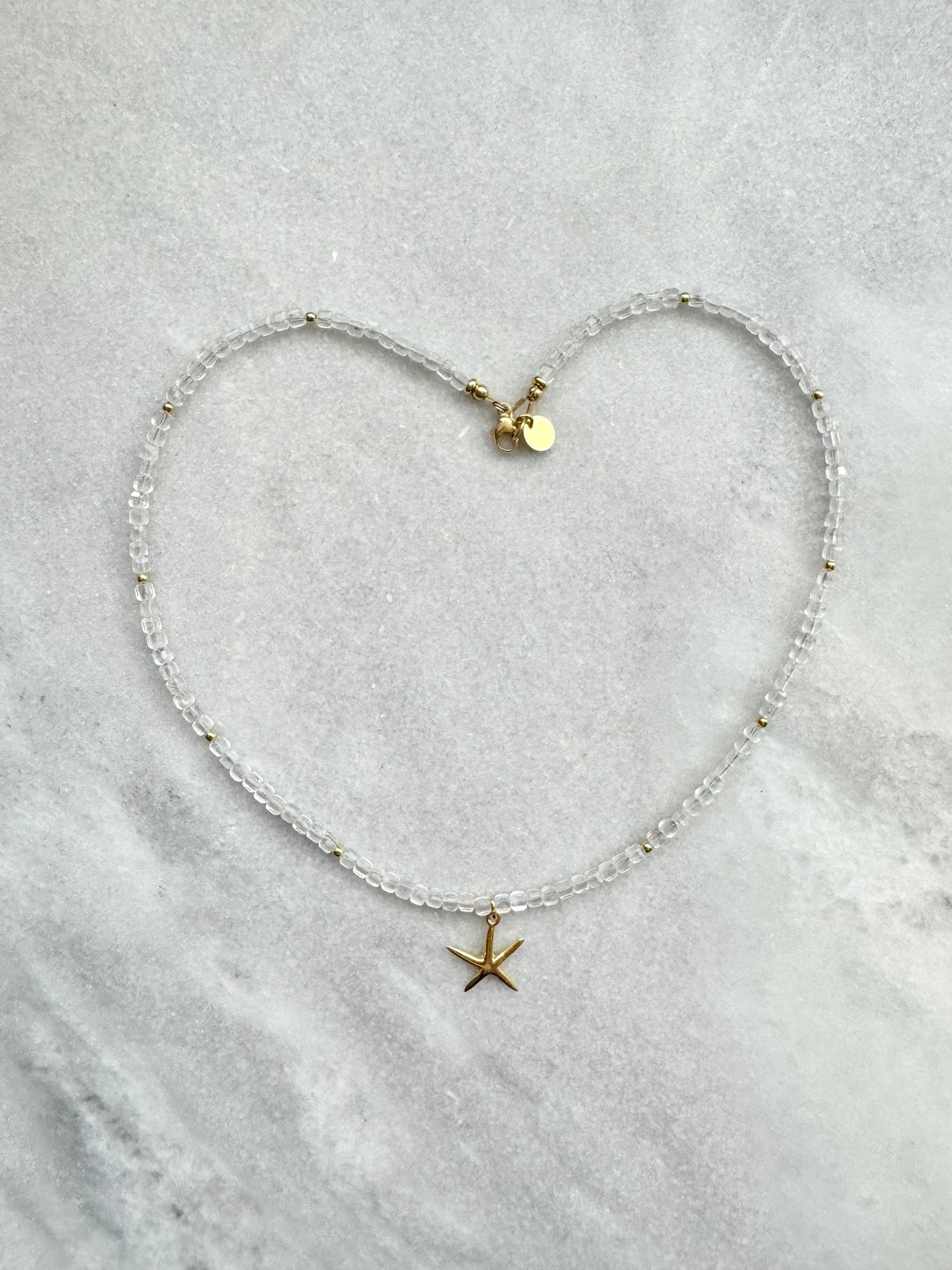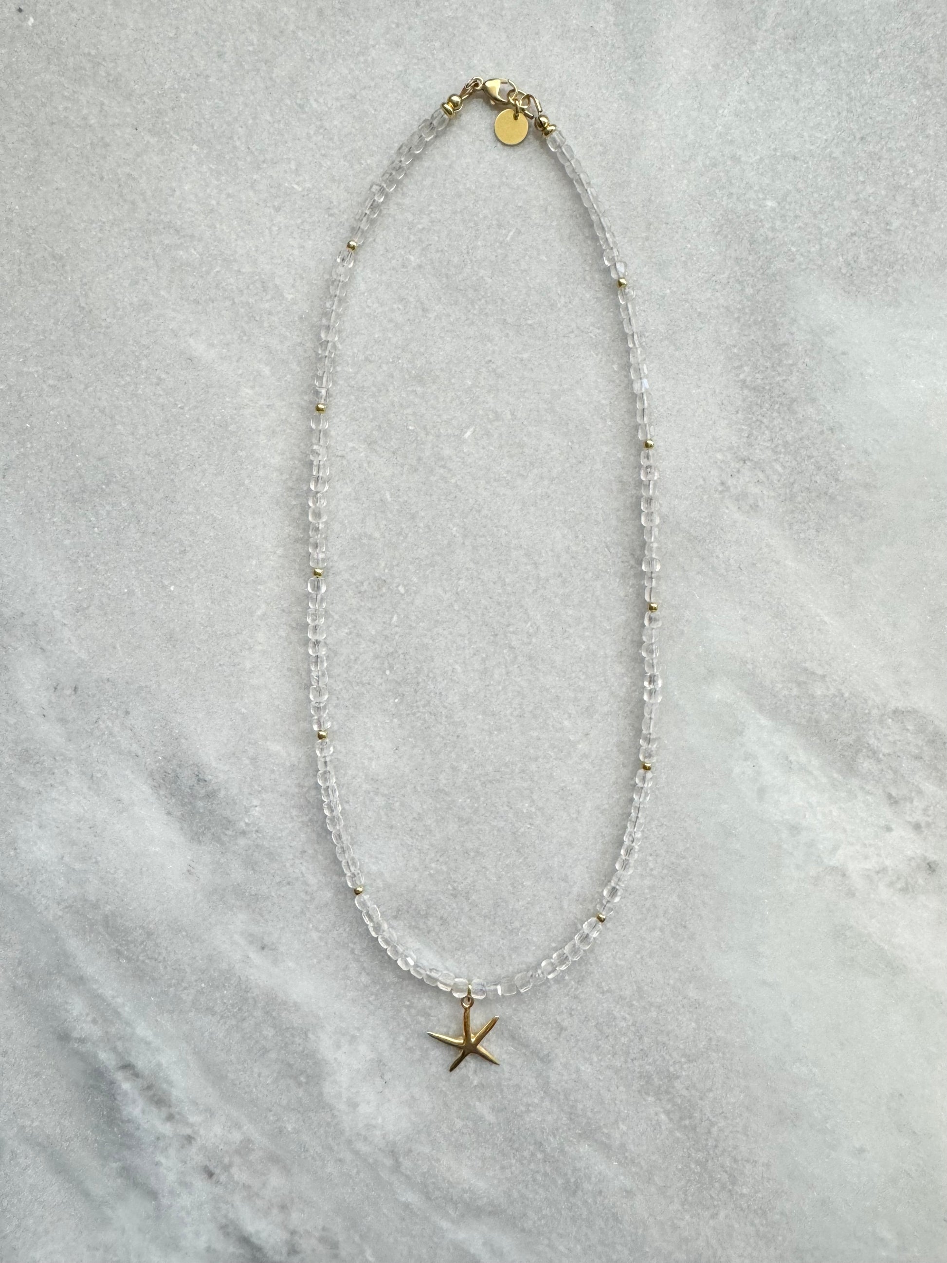 This necklace is made of Moonstone cubes and finished with gold vermeil details and a starfish charm.