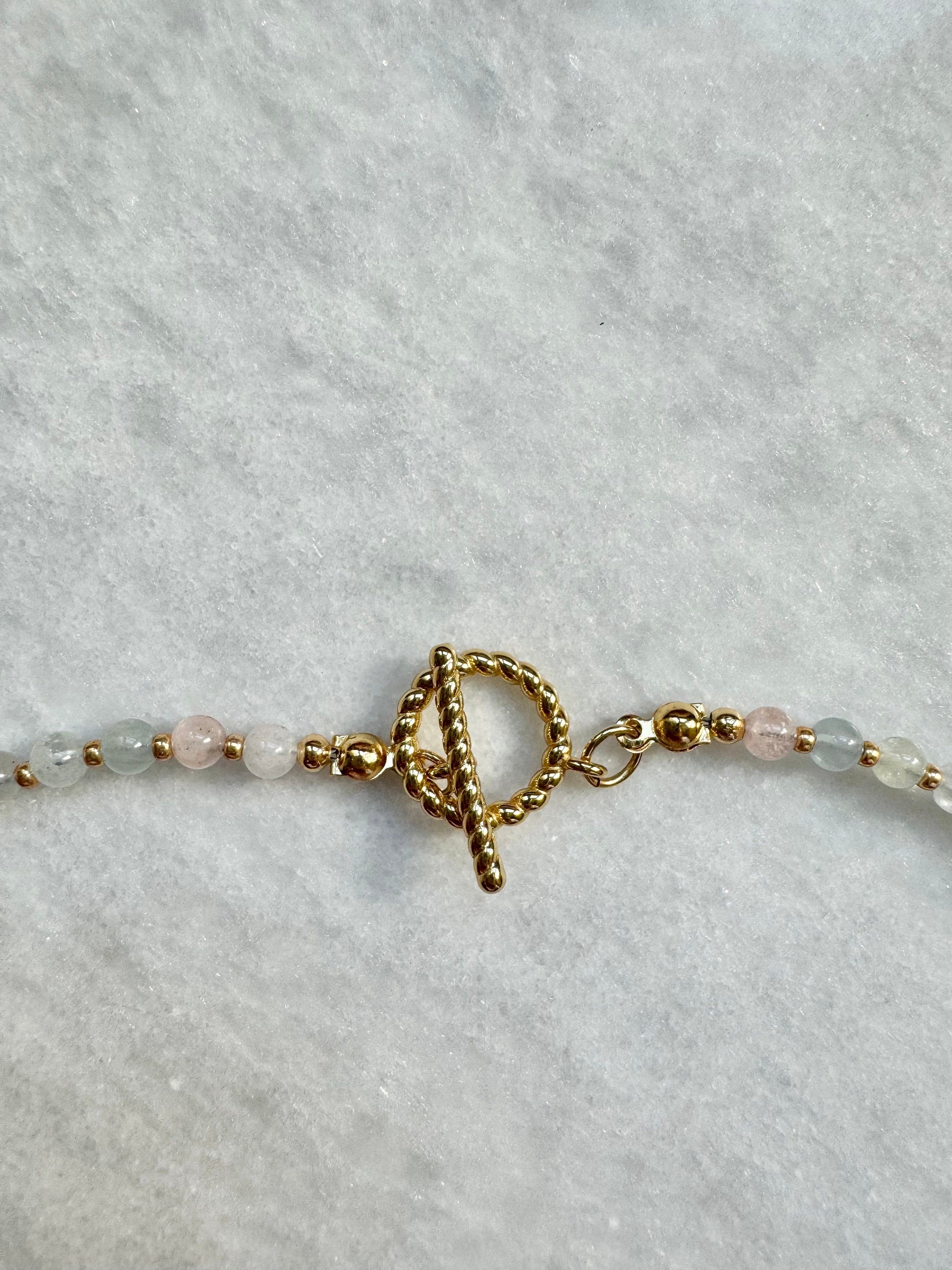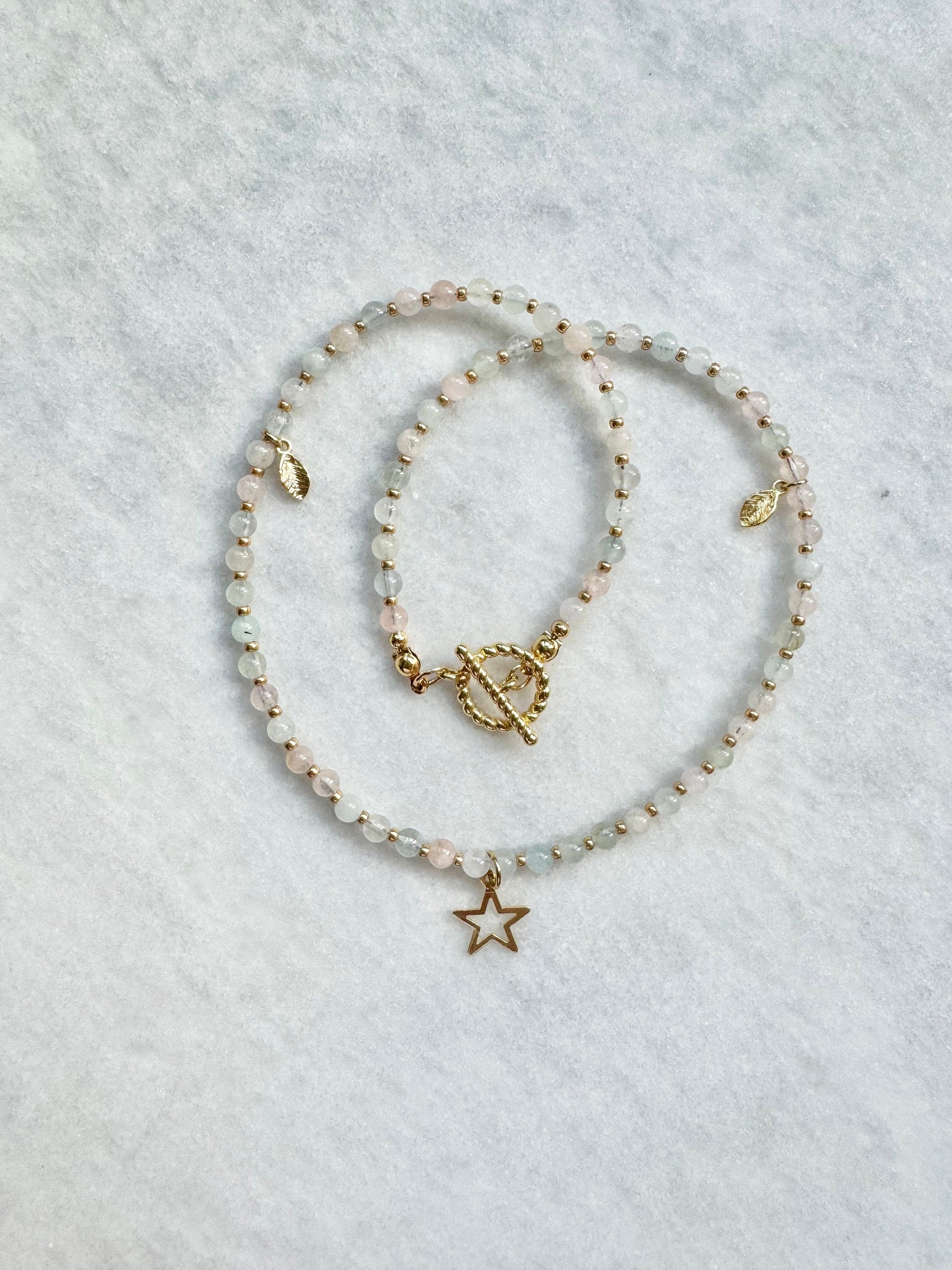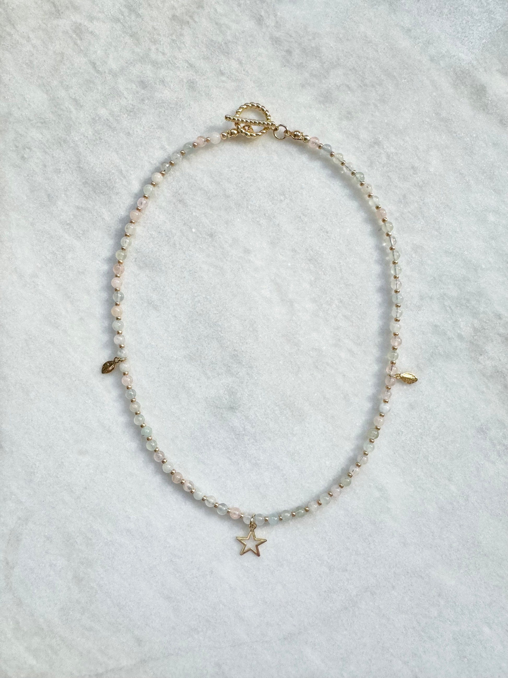 Morganite and aquamarine beaded necklace with gold miyuki beads, gold plated star and leaf charms and an 18k gold plated brass toggle clasp