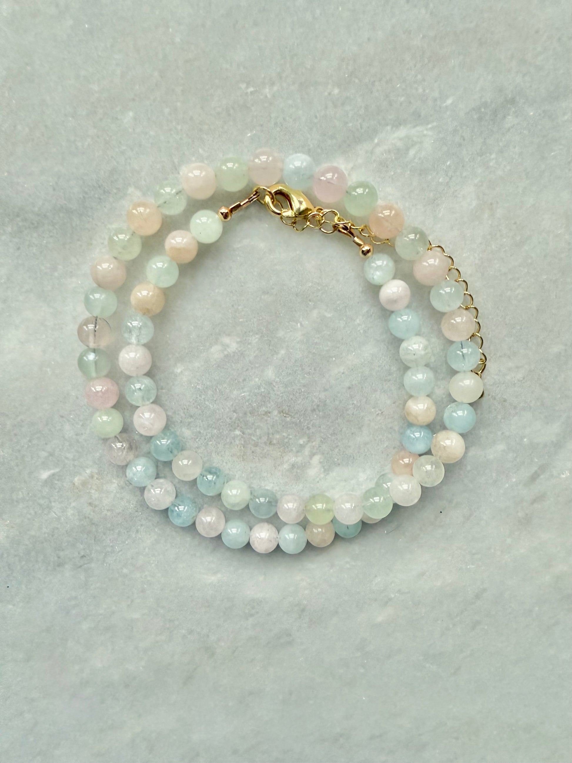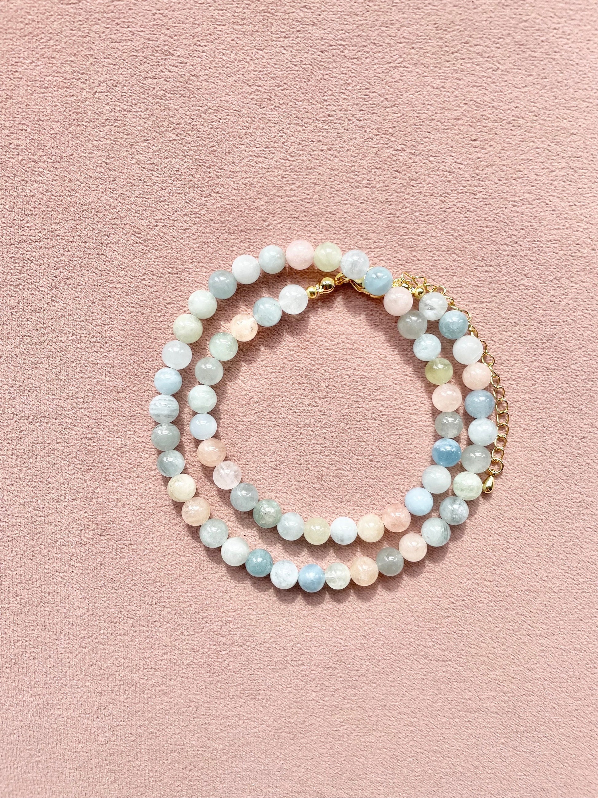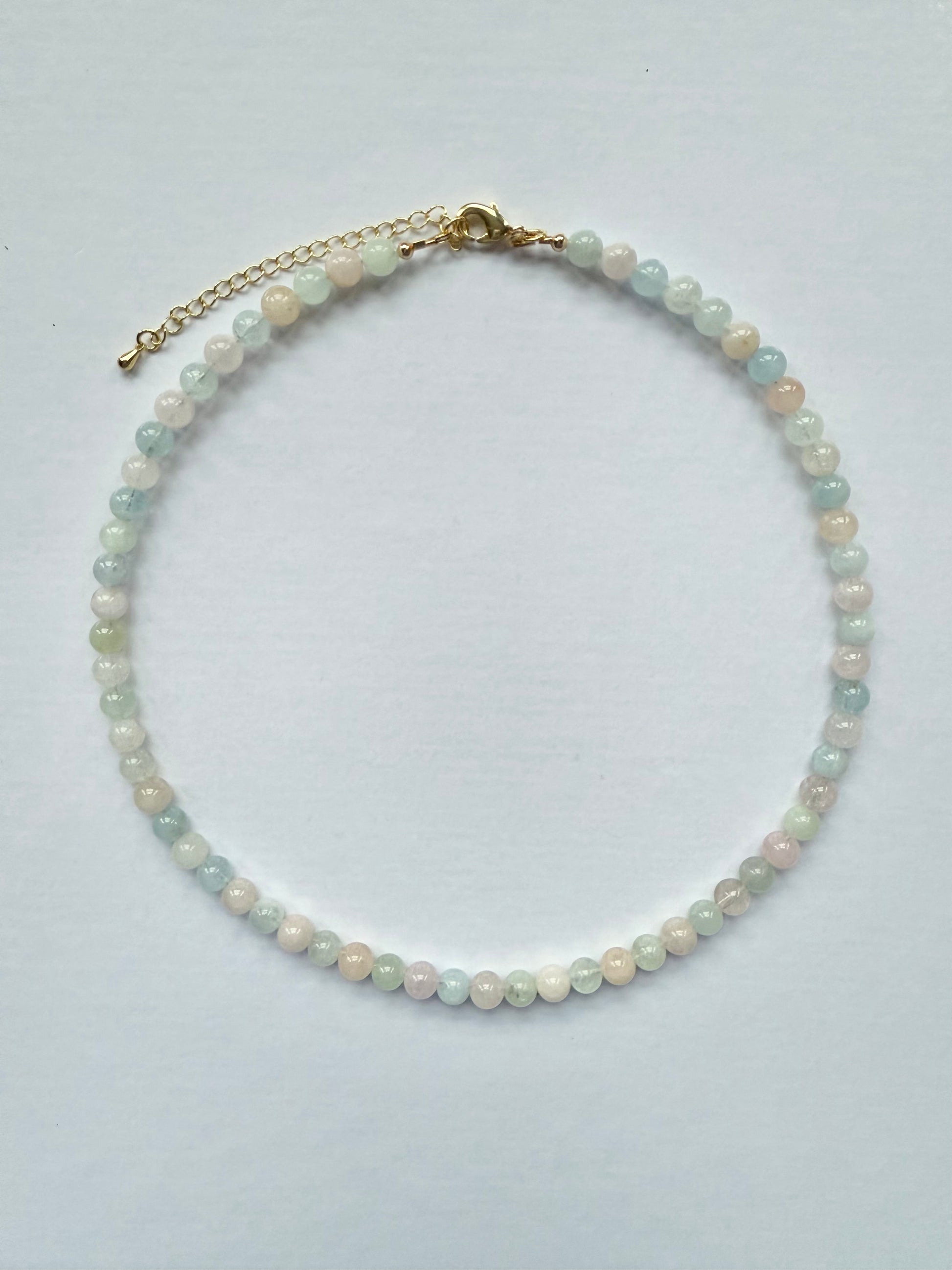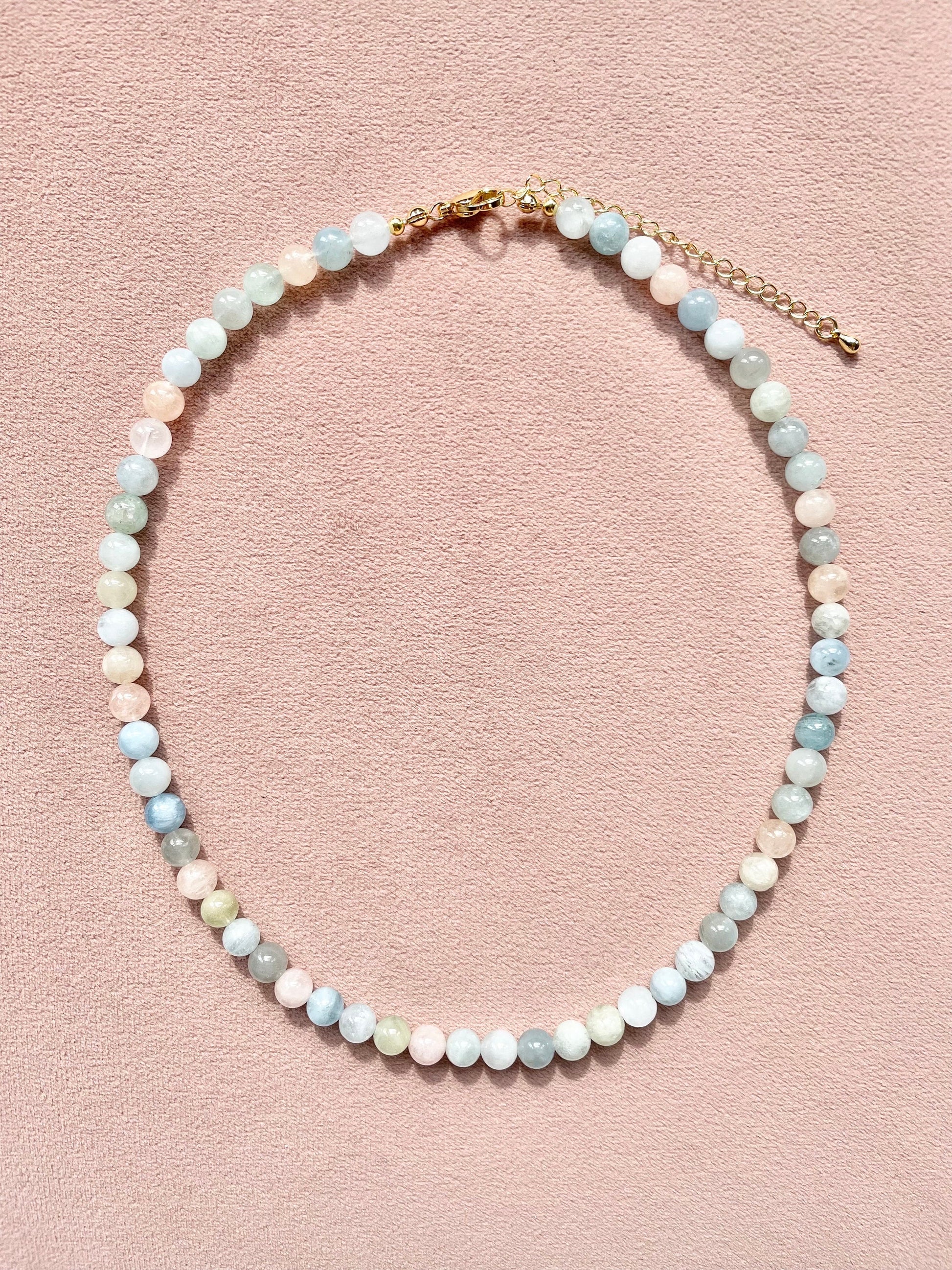 Morganite and aquamarine beaded necklace with a gold-filled lobster clasp.